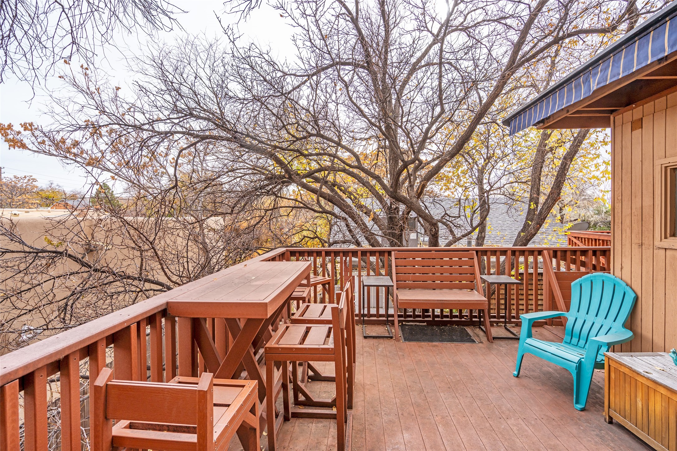 ALL FURNISHINGS, ART, LINENS, FLATWARE, GLASSWARE AND COOKWARE CONVEY AT NO ADDITIONAL COST. Move in ready! No fees and a great opportunity to live 5 blocks to the historic plaza and kitty corner to Kaune's neighborhood market. This tri-level condo is one of 3 units with NO monthly fees hidden amongst the trees. If you know Santa Fe, you know what a desirable and close in location this is. This home would make a great full time, 2nd home or rental. The split level floor plan has two bedrooms, one bedroom on lower level and one on top level for maximum privacy. Each bedroom has a 1/2 bath for convenience. On the middle level you will find the Kitchen/living area which is beautifully bright with an abundance of windows and natural light. In addition, there is a large balcony surrounded by mature trees giving a sense of being in the mountains but yet right in town! All this and a two car attached garage with interior access. There is a gate next to garage with access to front of home as well as access to the quaint Pino Road that runs along the Acequia Madre.