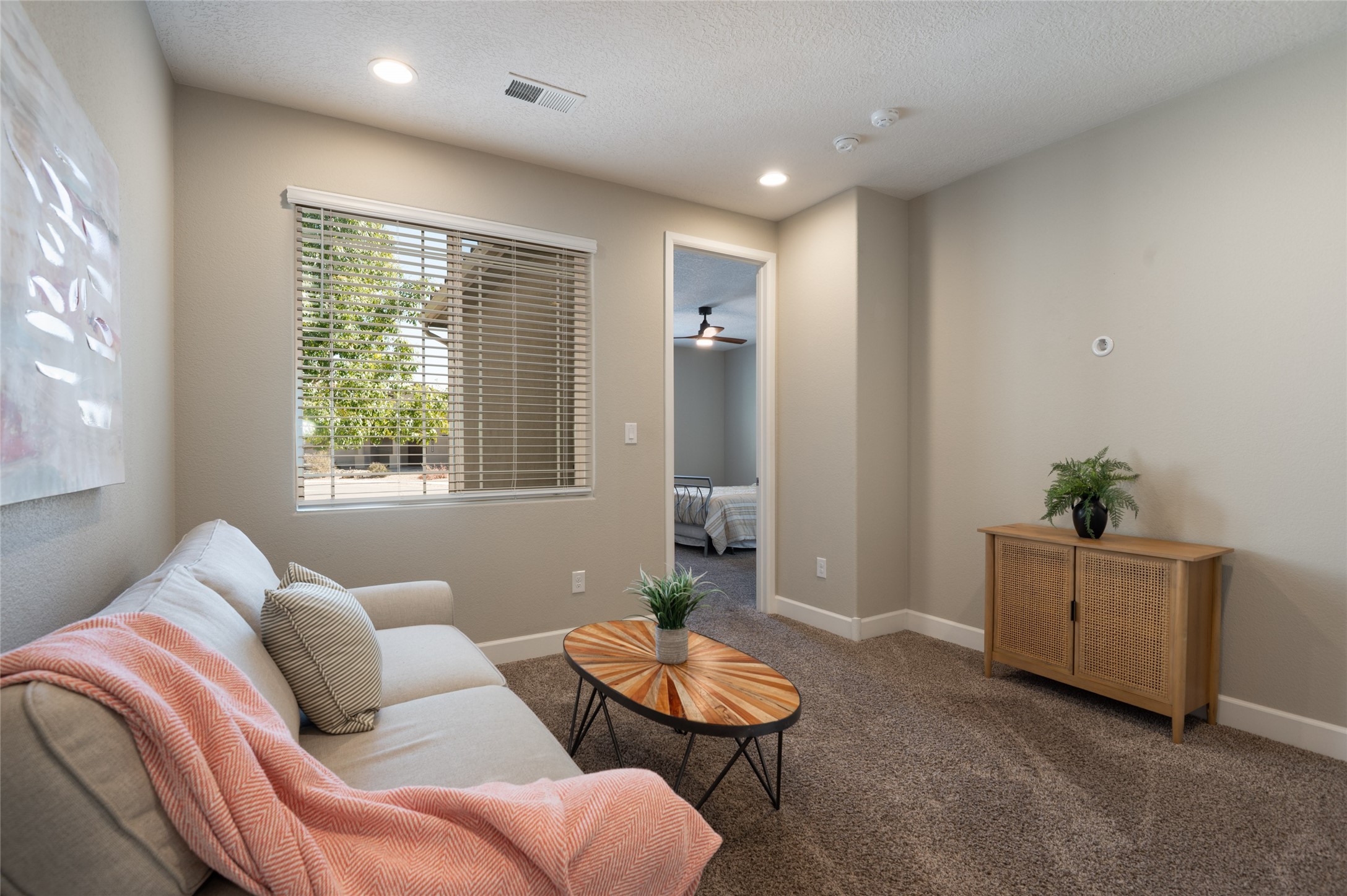 Warm, inviting home in beautiful Mariposa at the north end or Rio Rancho. Spectacular community surrounded by nature. Miles of trails, community pool and a gym. This home is located in a gated community at the end of a cul-de-sac beside open space. Secure and Serene. Spacious kitchen/dining/living area is a perfect gathering space, filled w/ natural light & offers generous counter space, gas stove, stainless appliances & walk-in pantry. The floor plan is open yet offers privacy in bedroom wings. Large primary suite w/ double sinks, separate tub, walk-in shower & large walk-in closet w/ access to laundry room. Three additional bedrooms are each connected to a bathroom, including one Jack-n-Jill & one en suite. Comfortable office space is perfect for those who work from home or can offer a second living space near bedrooms. Gorgeous custom landscaped back yard w/ pergola & putting green perfect for relaxing outdoors. Generous Three car garage.