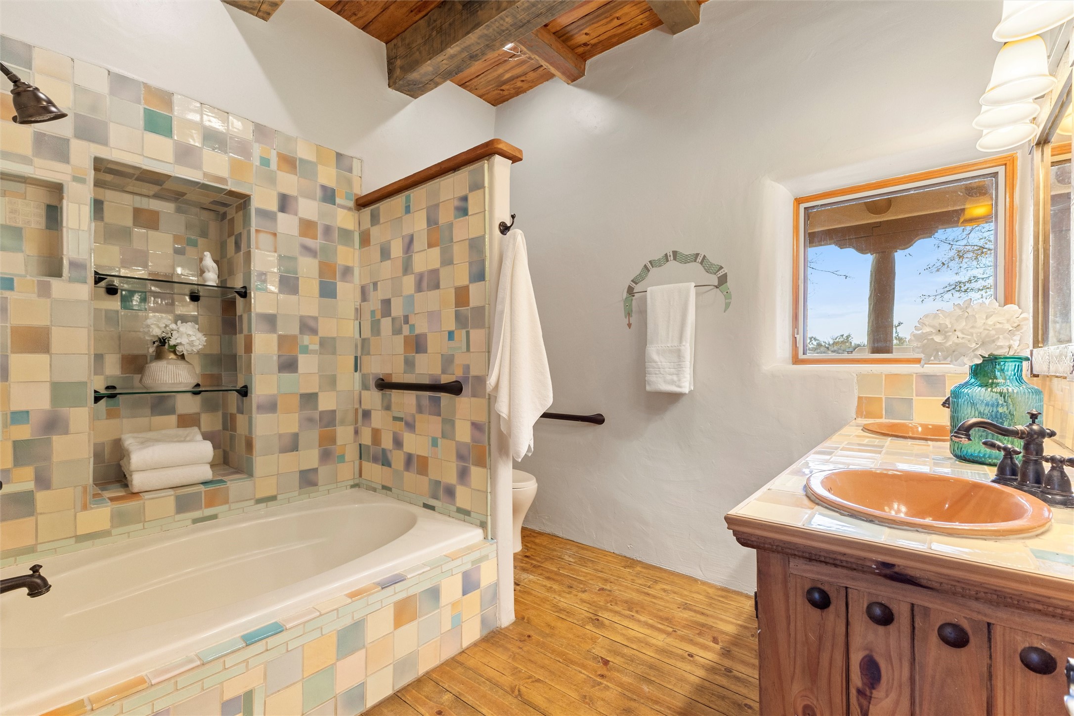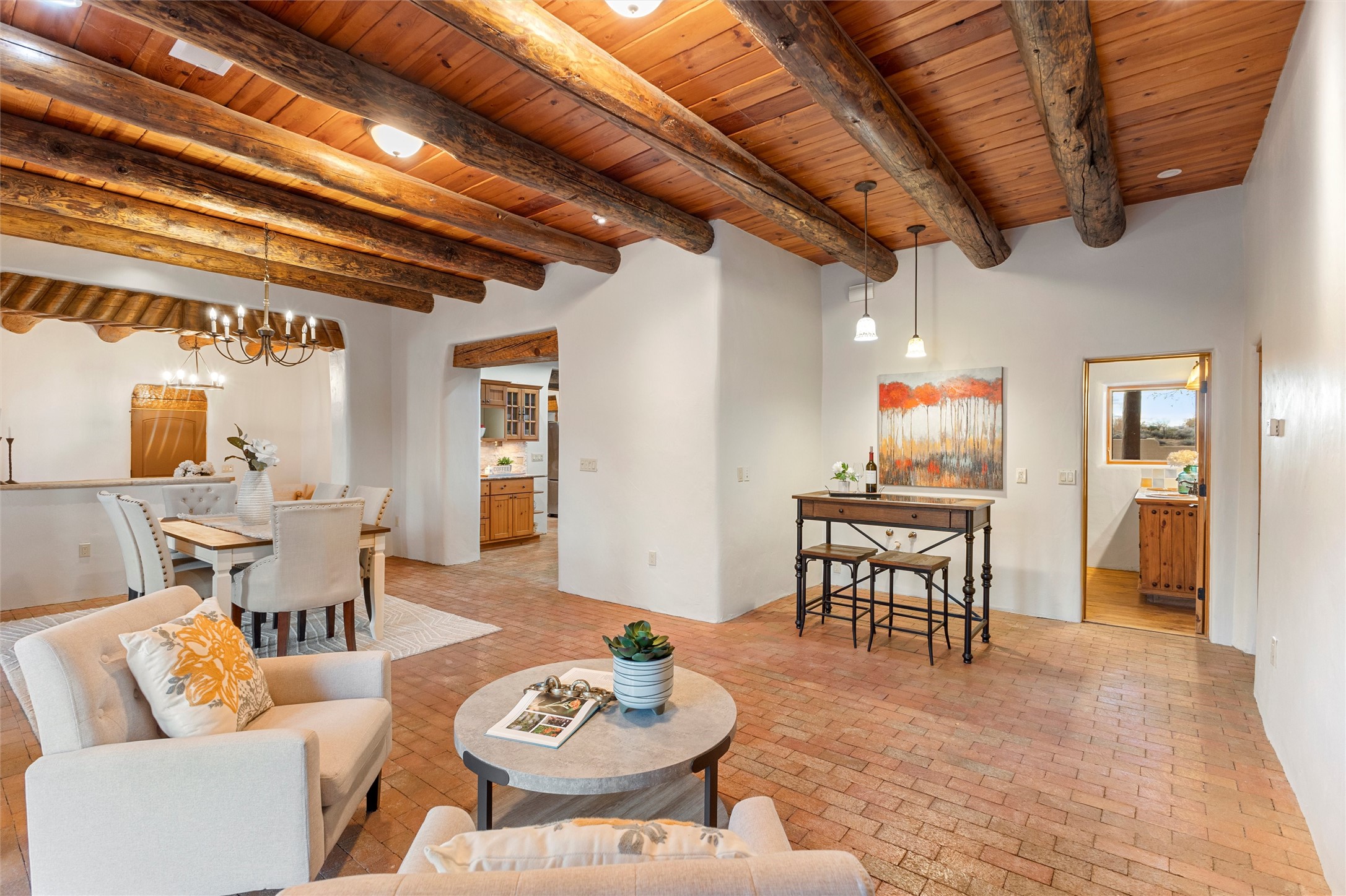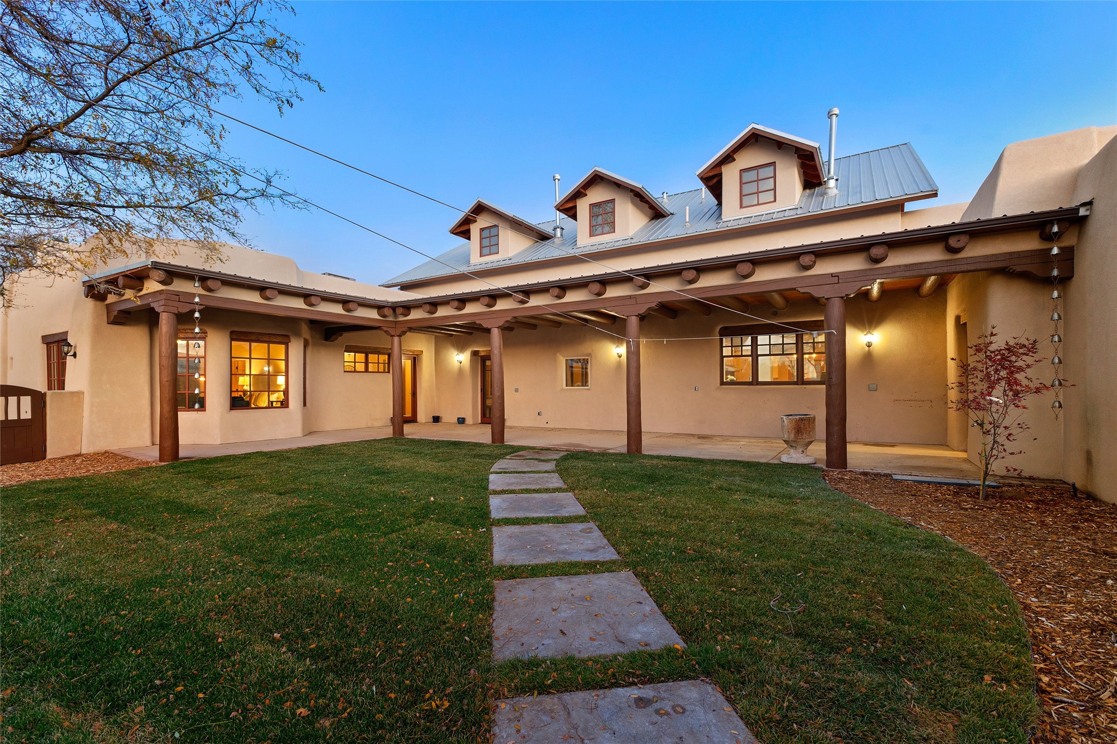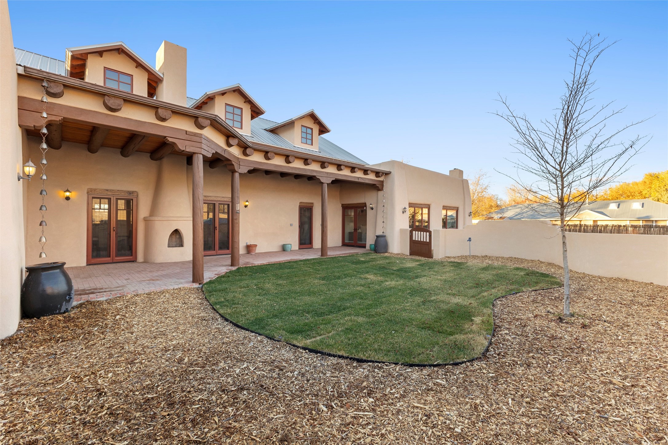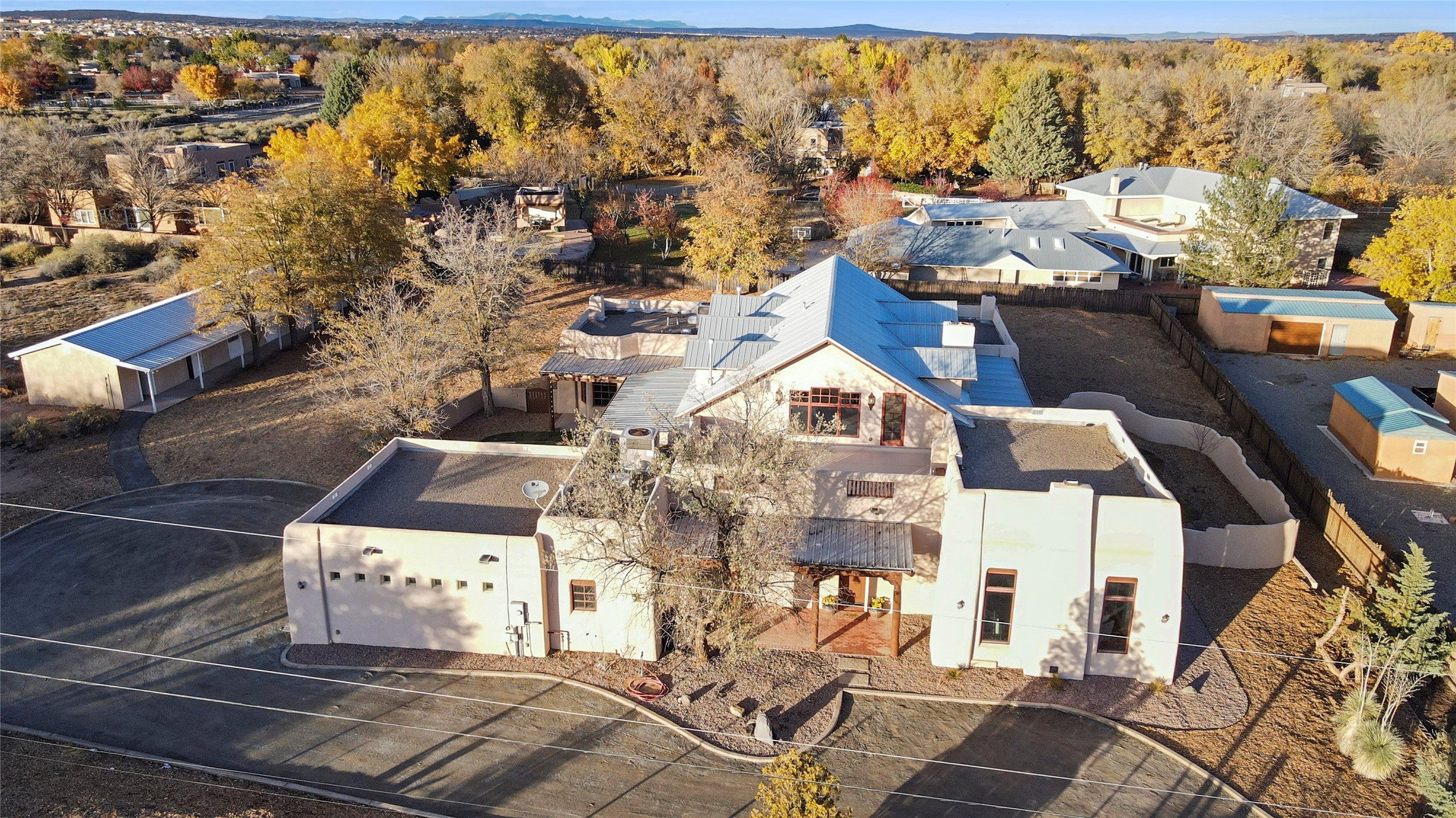 Timeless Corrales, New Mexico living with room to breathe. This expansive 6,491 sq ft, quintessential Santa Fe-style estate marries the soul of an original 150-year-old farmhouse--thick adobe walls, hand-hewn vigas, and soaring ceilings--with a thoughtful 2009 renovation that brings modern comfort and reliability. Tucked on a quiet lane, the home rests on 1.69 serene, level acres that frame lovely Sandia Mountain views and invite an easy rural lifestyle--plenty of usable space for horses, gardens, or future additions. Inside, light-washed halls and artful nichos create gallery-like display walls for sculpture and canvases. Multiple living and gathering areas open effortlessly to two lush, grassy courtyards--perfect for coffee at sunrise, al-fresco dinners at dusk, or relaxed weekend play. An updated kitchen and baths blend warm Southwestern finishes with contemporary function, while long, shaded portals extend everyday living outdoors. Generous bedrooms and flexible rooms accommodate quiet work, fitness, media, or guest needs; host a crowd or savor a private retreat with equal ease. With historic character preserved, modern conveniences in place, and a setting that feels both pastoral and connected, this is a rare convergence of history, scale, privacy, and natural beauty--right in the heart of Corrales.
