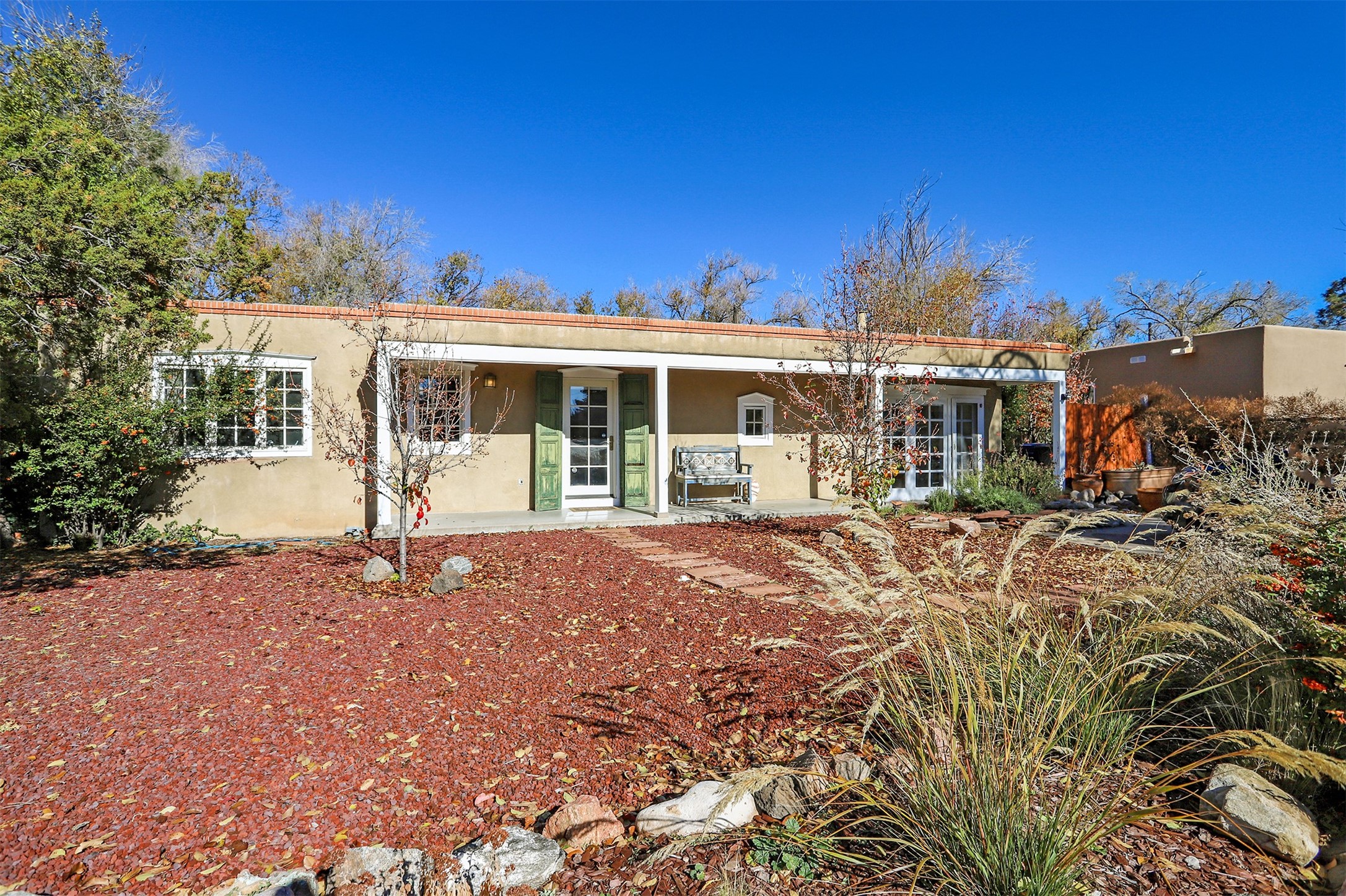 Charming, quintessential Stamm Territorial Style home located in the heart of Santa Fe. Perfect for the romantic artist, or family wanting to grow roots in a well-established neighborhood close to gorgeous city parks and recreation center. 2705 Camino Chueco is a light-filled beauty offering 3 Bedrooms and 2 Baths, generous sized dining and living areas, hardwood flooring, mud-room entry off the kitchen and a private studio perfect for any hobby or activity that fills you with joy. The primary bedroom has a large walk-in closet with built-ins and access to the large private backyard with new coyote fencing for added privacy. The sunny dining and third bedroom room also open onto the back patio via French doors, and speaking of doors, notice all the artistic touches including fun and fanciful doors and many details throughout the interior and exterior. New in February 2025 are the solar panels making your energy consumption footprint throughout the year near to zero! Tour today and feel for yourself the abundance of character and charm that is 2705 Camino Chueco.