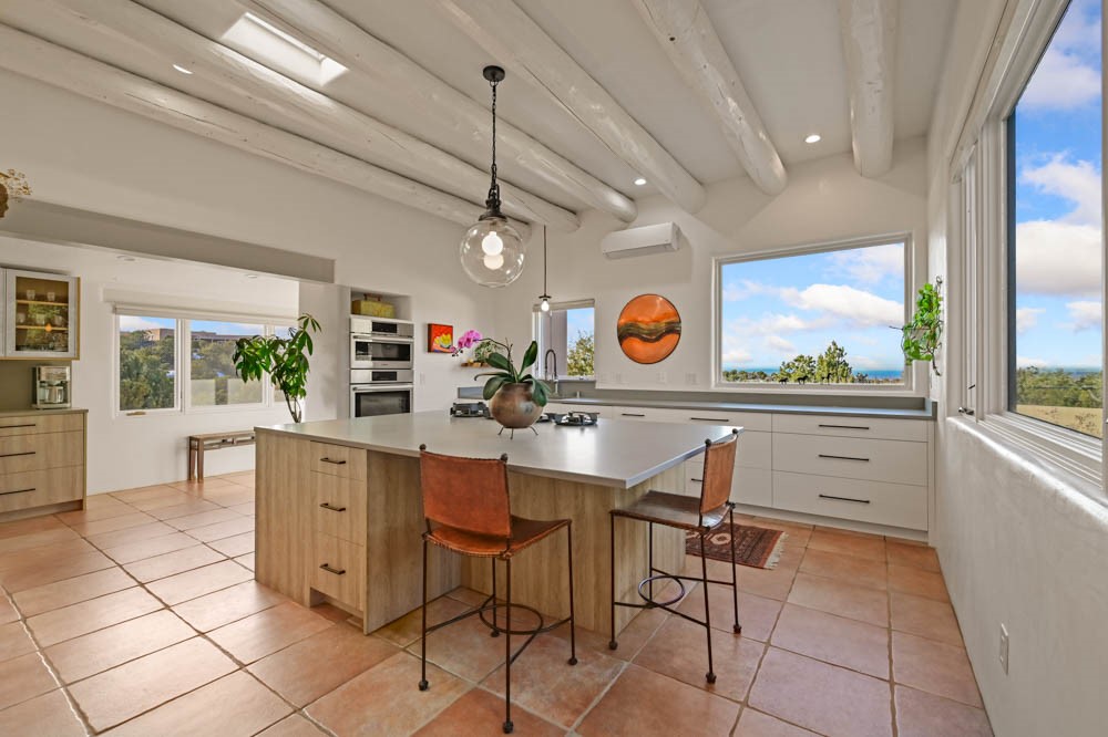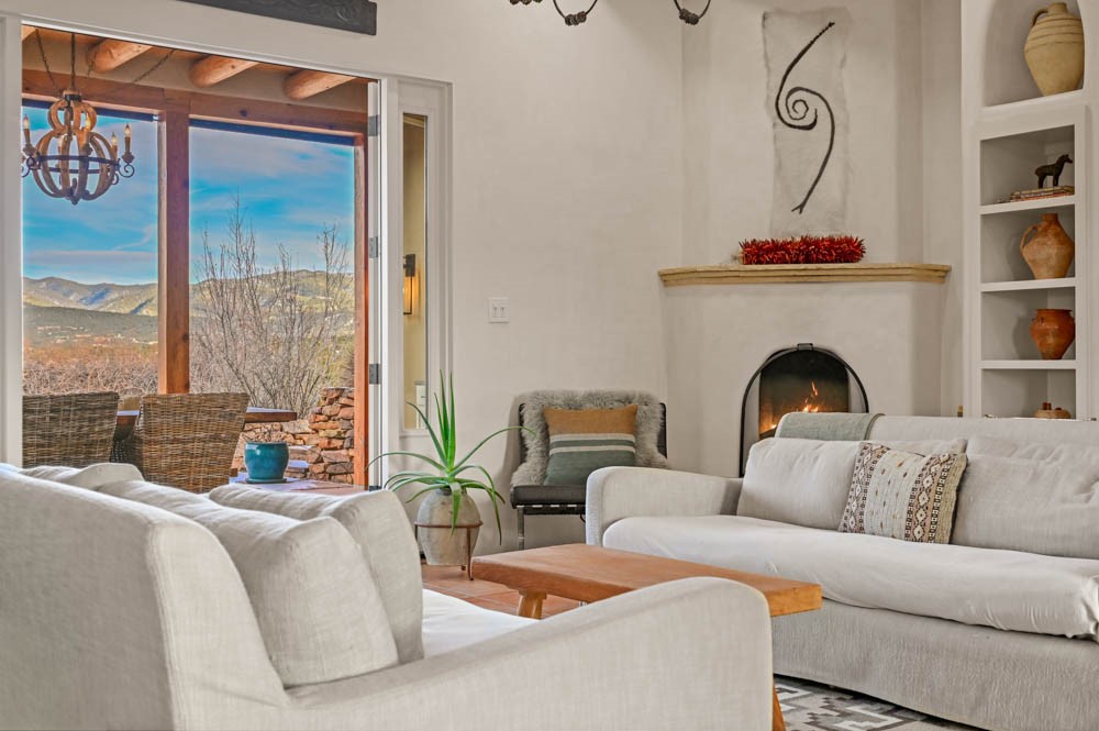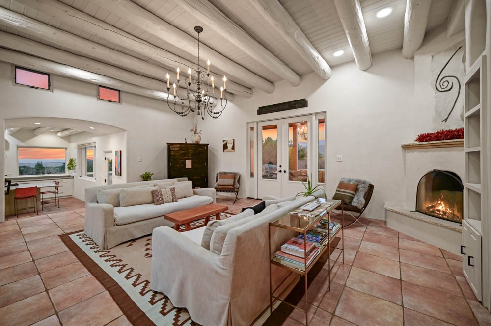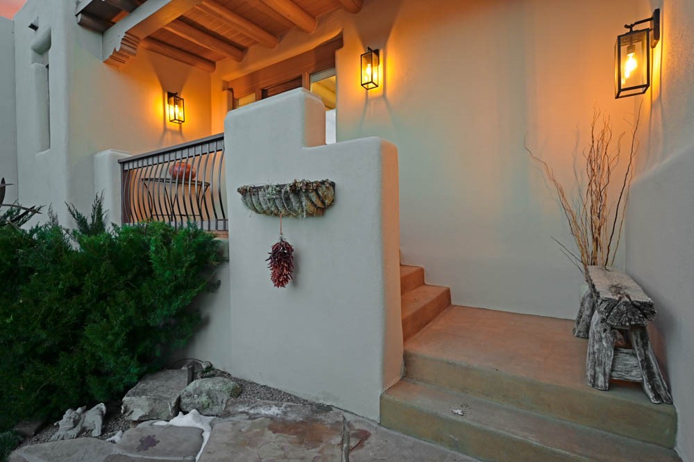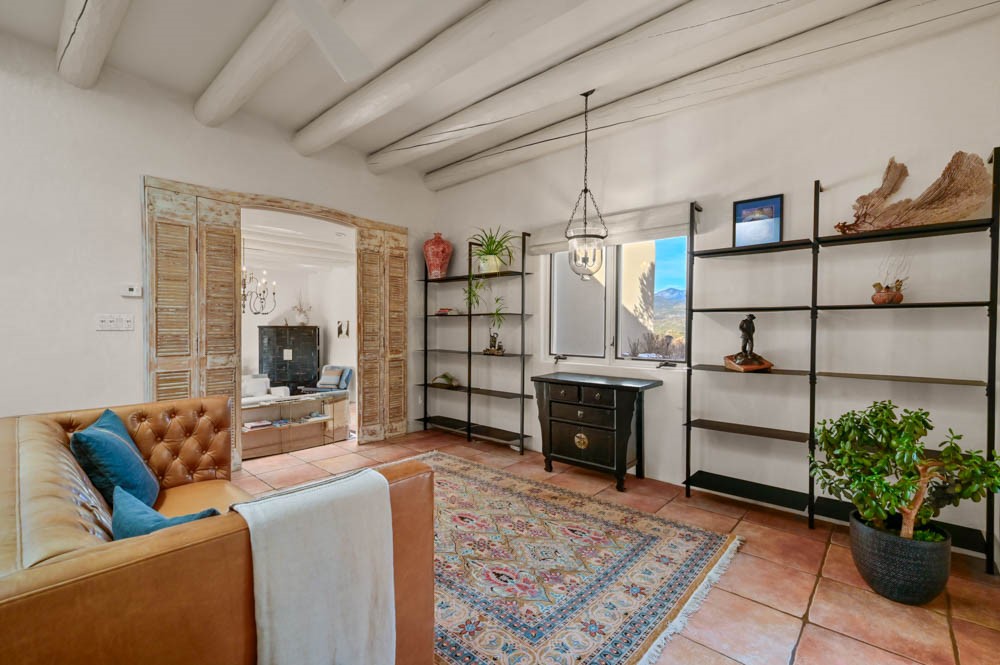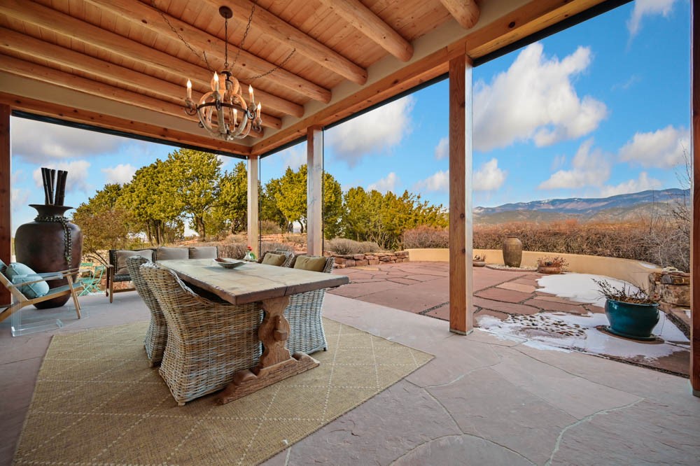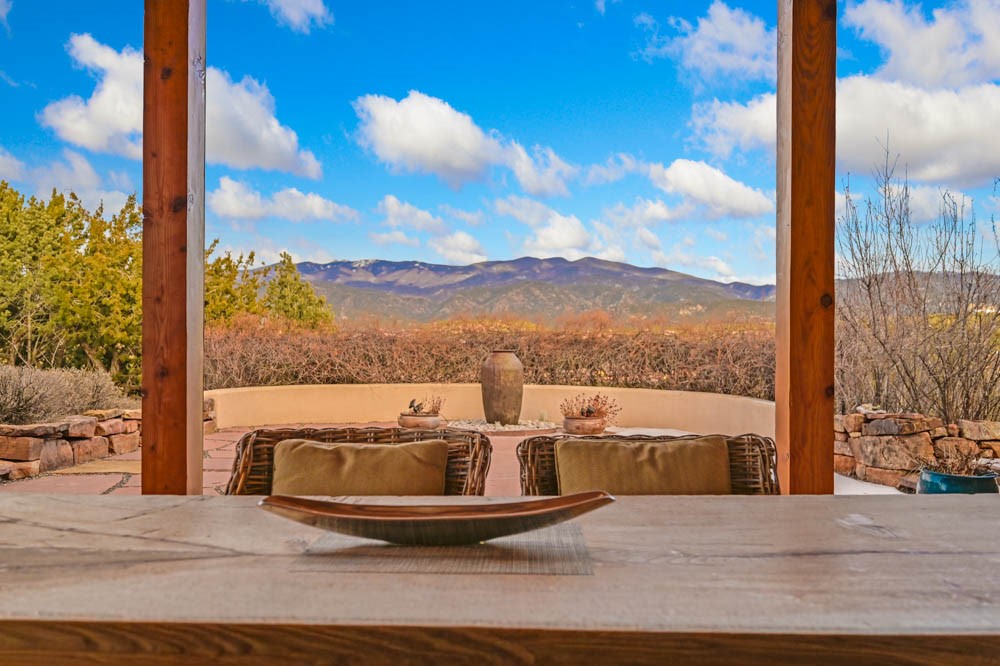 Exceptional mountain views! Beautifully updated Santa Fe home offering classic Southwestern charm and modern amenities. Features include a sun-filled remodeled chef's kitchen with walk-in pantry and an elevator from the oversized 2-car garage for easy access to the secondary refrigerator and multiple storage rooms.The primary suite offers an elegant soaking tub for two and private retreat deck. The two downstairs bedrooms have ensuite bathrooms and an adjoining steam shower, and individual French-door entries that open onto a patio framed by a blooming pollinator's haven.Expansive outdoor living with three distinct portals, the largest fully equipped with a built-in grill and cabinetry for seamless entertaining while enjoying sweeping views of the Sangre de Cristo Mountains, Santa Fe Ski Basin, and Badlands.Located in a private, secure, gated community surrounded by a mature pion and cedar forest. Approx. 2-acre lot provides peace and serenity, yet you're less than 10 minutes from exceptional culinary spots, the vibrant and historic Santa Fe Plaza, and the world-renowned Santa Fe Opera. Home is in the County and not subject to the Mansion Tax for buyers. Furniture package available.
