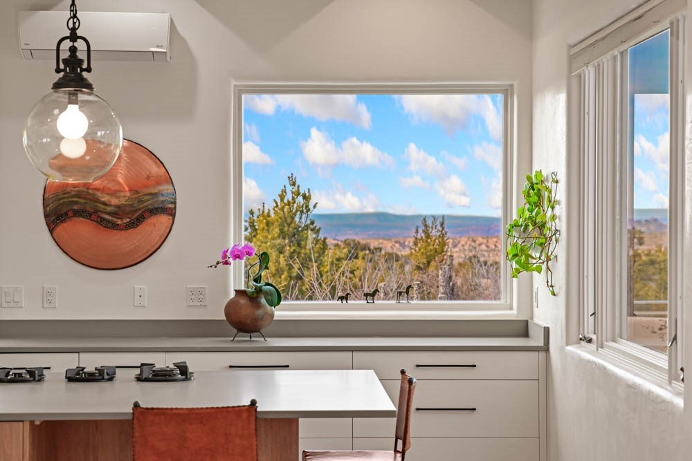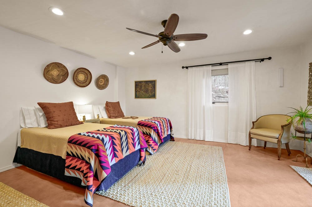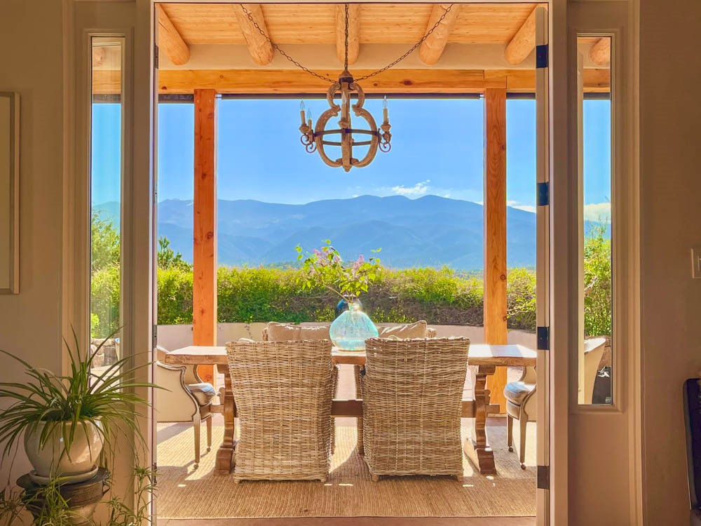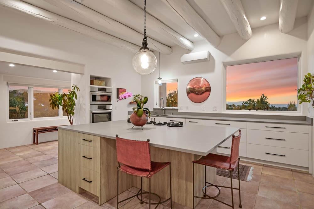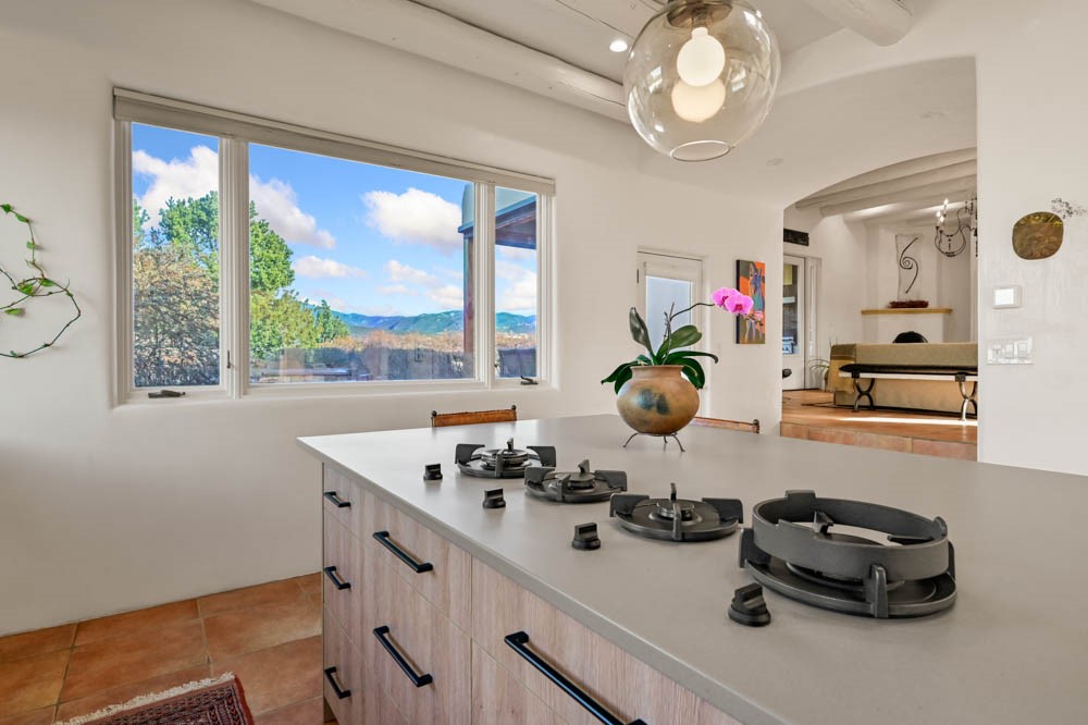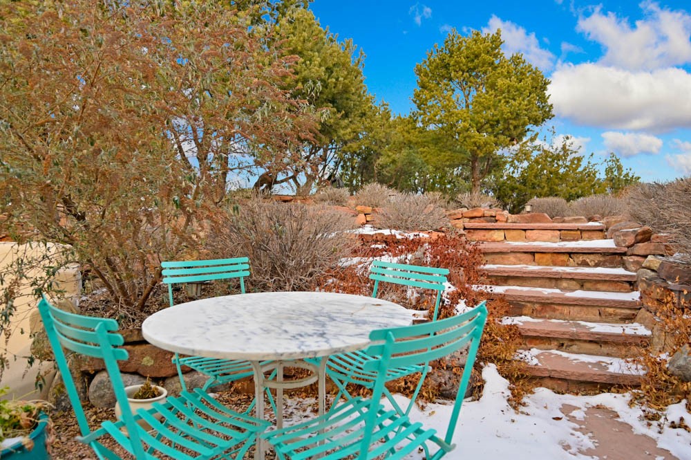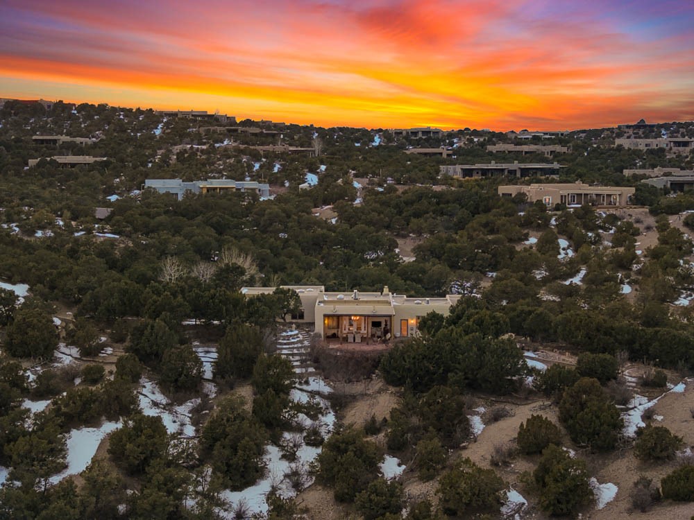 Exceptional mountain views! Beautifully updated Santa Fe home offering classic Southwestern charm and modern amenities. Features include a sun-filled remodeled chef's kitchen with walk-in pantry and an elevator from the oversized 2-car garage for easy access to the secondary refrigerator and multiple storage rooms.The primary suite offers an elegant soaking tub for two and private retreat deck. The two downstairs bedrooms have ensuite bathrooms and an adjoining steam shower, and individual French-door entries that open onto a patio framed by a blooming pollinator's haven.Expansive outdoor living with three distinct portals, the largest fully equipped with a built-in grill and cabinetry for seamless entertaining while enjoying sweeping views of the Sangre de Cristo Mountains, Santa Fe Ski Basin, and Badlands.Located in a private, secure, gated community surrounded by a mature pion and cedar forest. Approx. 2-acre lot provides peace and serenity, yet you're less than 10 minutes from exceptional culinary spots, the vibrant and historic Santa Fe Plaza, and the world-renowned Santa Fe Opera. Home is in the County and not subject to the Mansion Tax for buyers. Furniture package available.