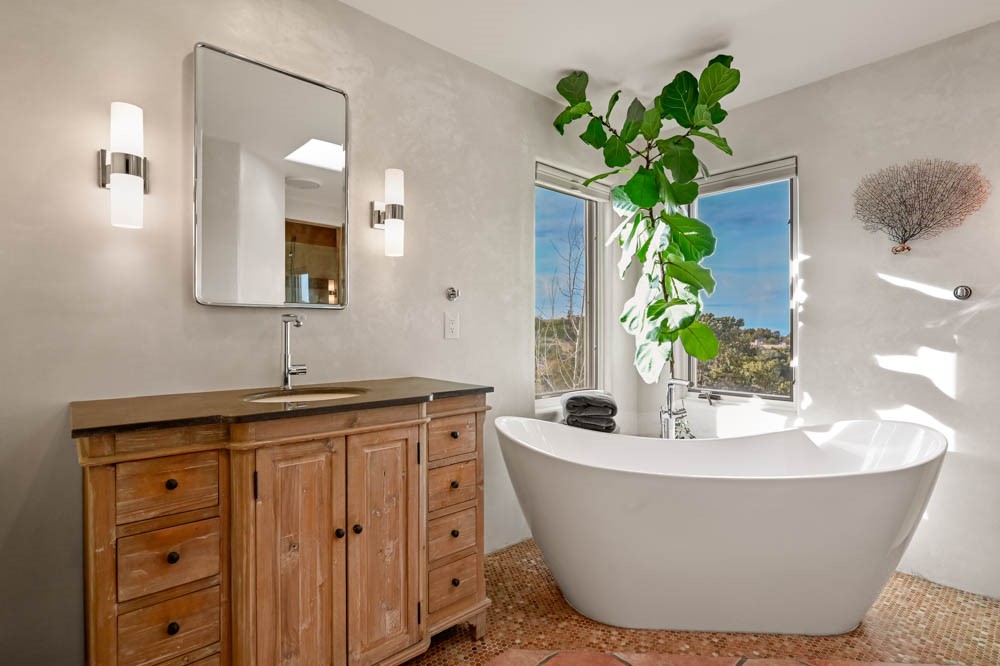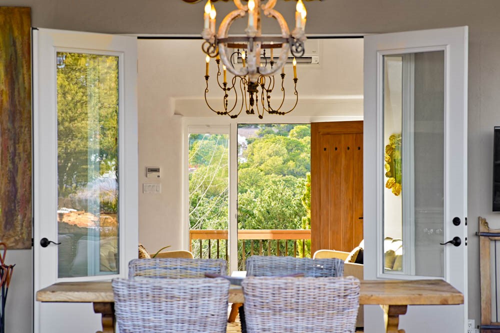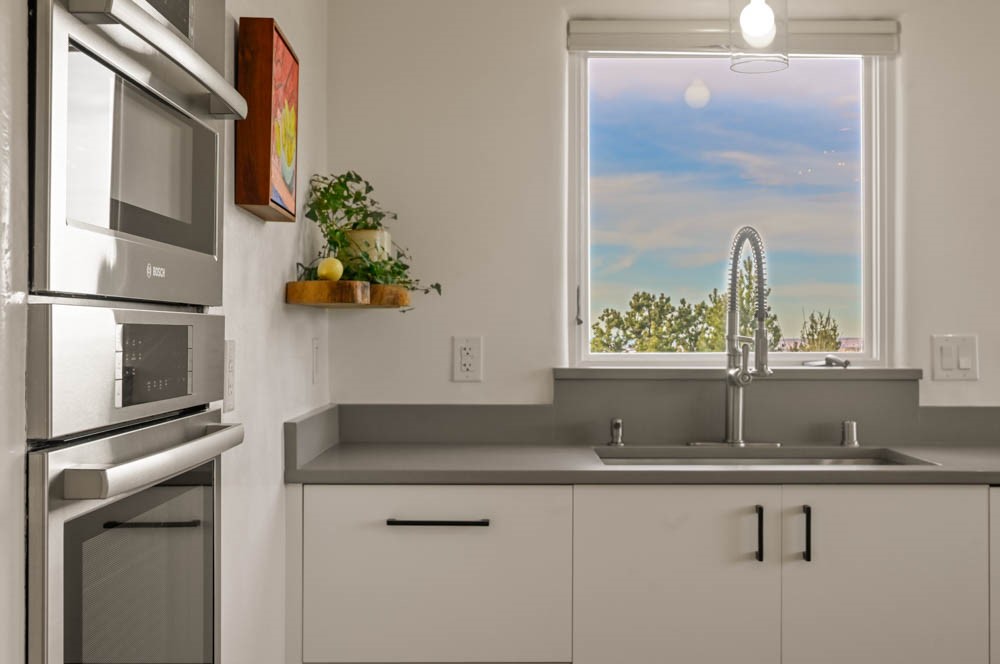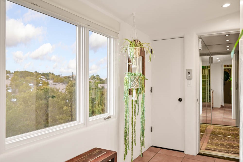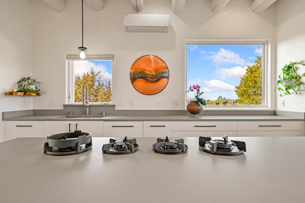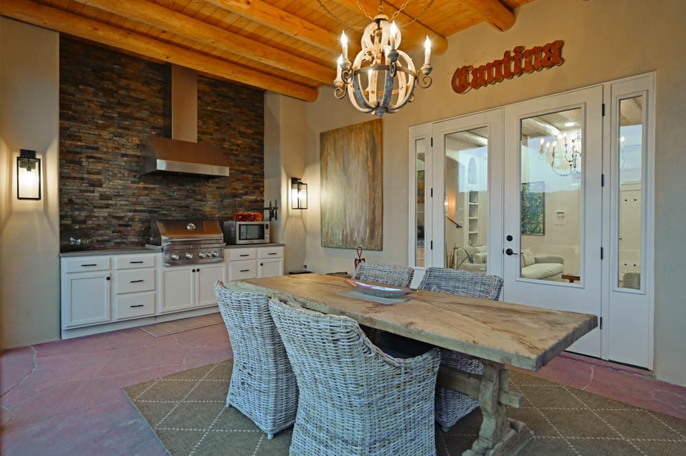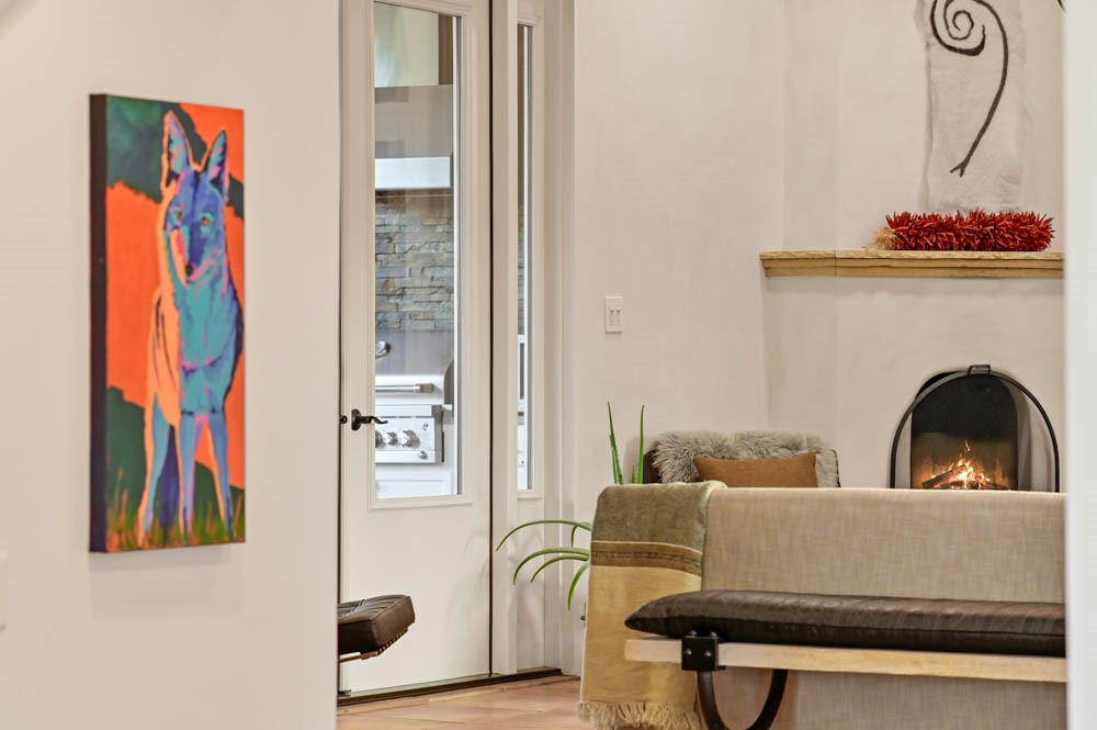 Exceptional mountain views! Beautifully updated Santa Fe home offering classic Southwestern charm and modern amenities. Features include a sun-filled remodeled chef's kitchen with walk-in pantry and an elevator from the oversized 2-car garage for easy access to the secondary refrigerator and multiple storage rooms.The primary suite offers an elegant soaking tub for two and private retreat deck. The two downstairs bedrooms have ensuite bathrooms and an adjoining steam shower, and individual French-door entries that open onto a patio framed by a blooming pollinator's haven.Expansive outdoor living with three distinct portals, the largest fully equipped with a built-in grill and cabinetry for seamless entertaining while enjoying sweeping views of the Sangre de Cristo Mountains, Santa Fe Ski Basin, and Badlands.Located in a private, secure, gated community surrounded by a mature pion and cedar forest. Approx. 2-acre lot provides peace and serenity, yet you're less than 10 minutes from exceptional culinary spots, the vibrant and historic Santa Fe Plaza, and the world-renowned Santa Fe Opera. Home is in the County and not subject to the Mansion Tax for buyers. Furniture package available.