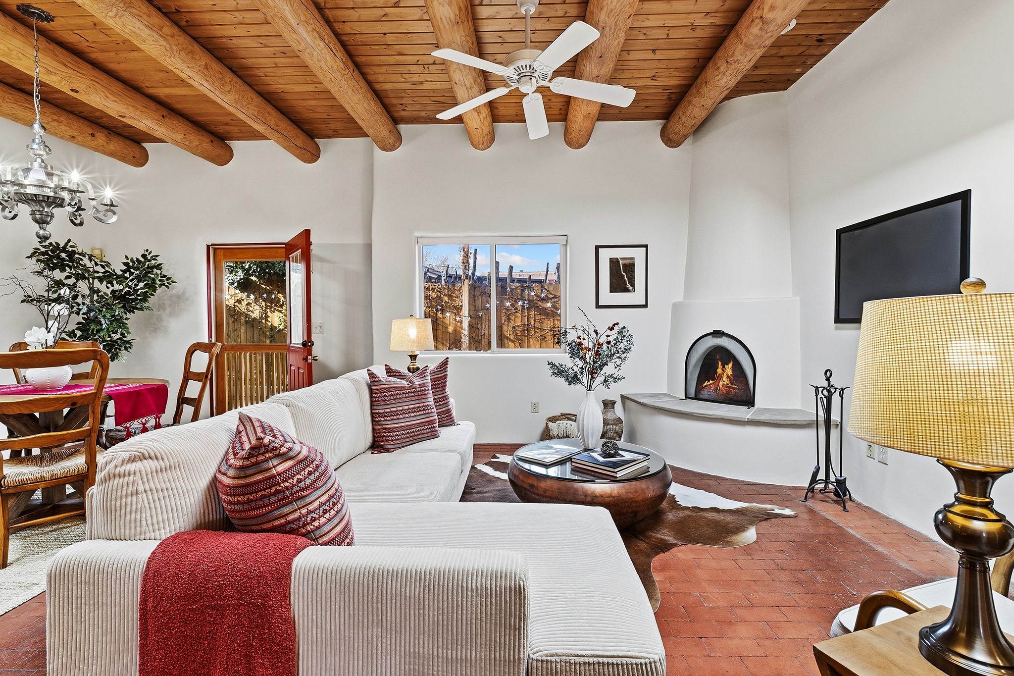 Rebuilt in 2006 on the foundation of an original 1940s adobe dwelling, this bright and open 2-bedroom, 2-bath home, with a 2013 office/studio addition, is a fine blend of traditional Santa Fe style and modern comforts. The kitchen features travertine countertops, hickory cabinetry, and all-new Samsung stainless-steel appliances (2025). Travertine tile graces both baths. There's in-floor radiant heat in all but the office, supported by a new high-efficiency boiler, plus a new, on demand water heater--both installed in 2025. Most of the home sports a new, TPO roof (2023). Fully enclosed behind walls and an electronic gate, this appealing property provides rare in-town privacy and secure parking just a half mile from the Coop, Leo's, and the Railyard's shops and galleries.