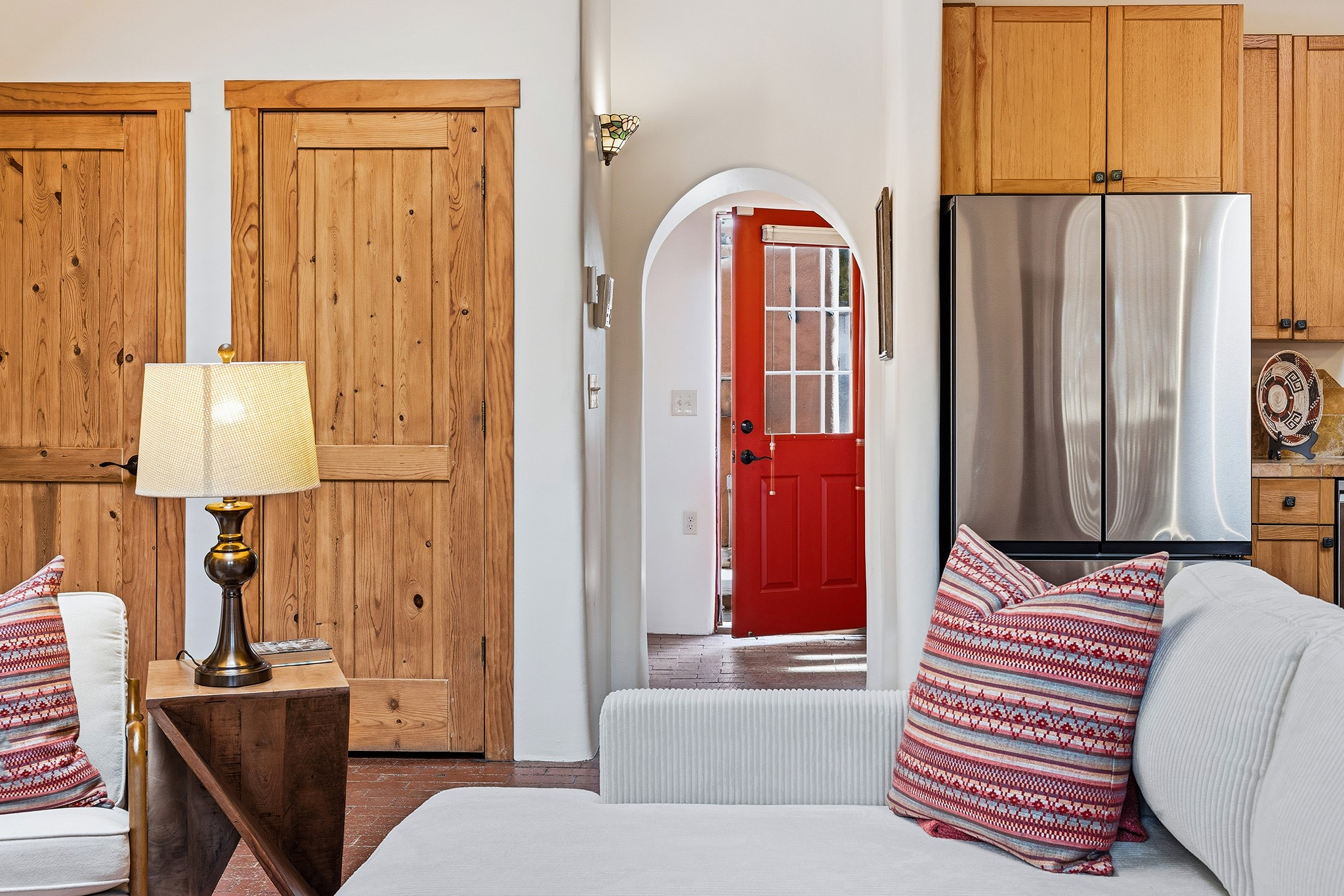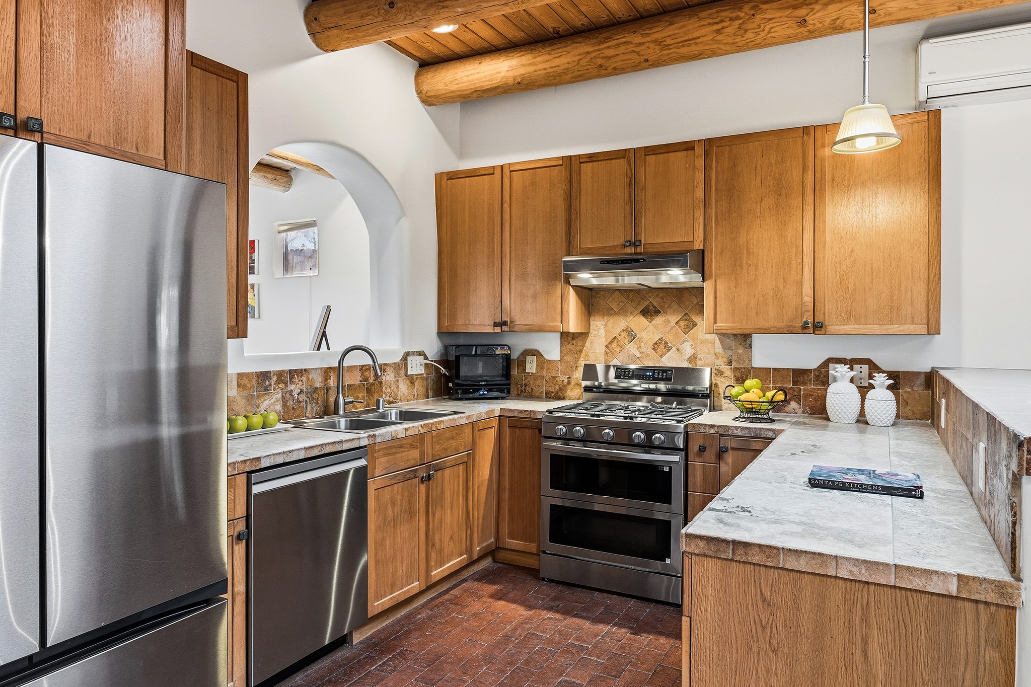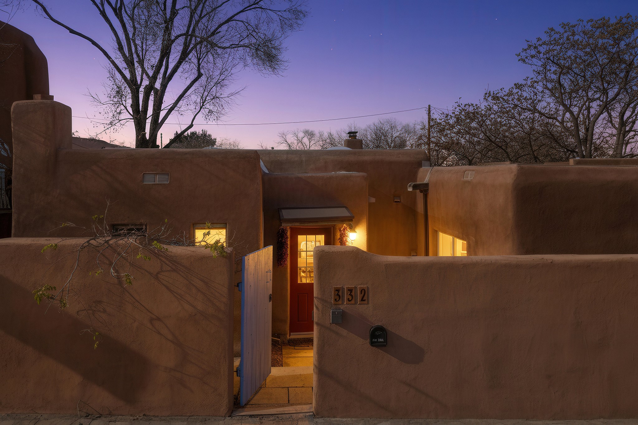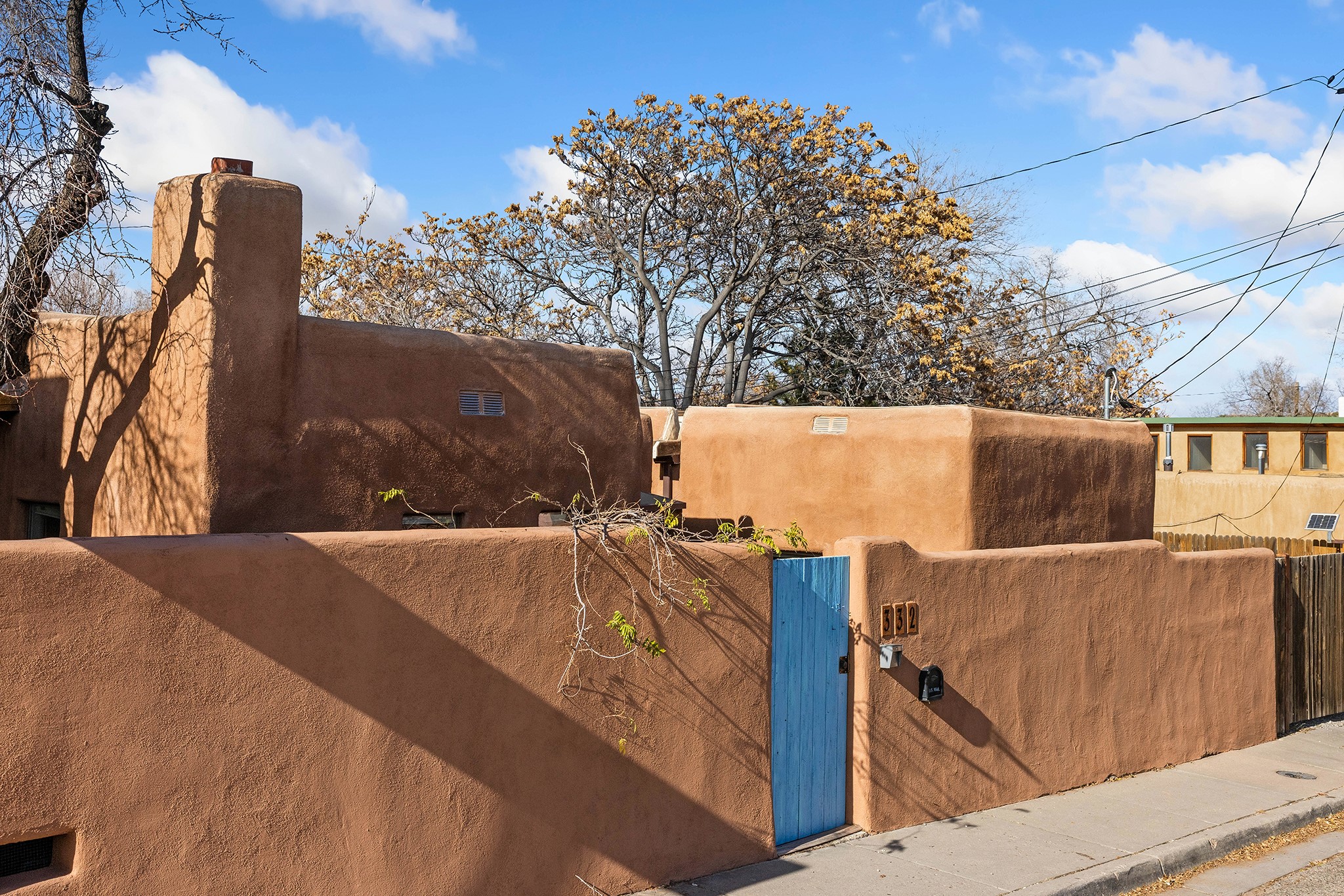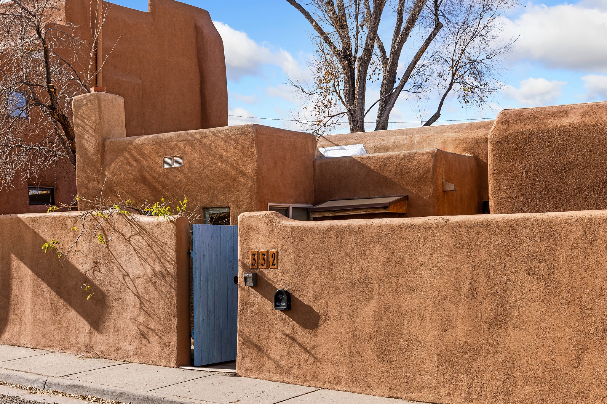 Rebuilt in 2006 on the foundation of an original 1940s adobe dwelling, this bright and open 2-bedroom, 2-bath home, with a 2013 office/studio addition, is a fine blend of traditional Santa Fe style and modern comforts. The kitchen features travertine countertops, hickory cabinetry, and all-new Samsung stainless-steel appliances (2025). Travertine tile graces both baths. There's in-floor radiant heat in all but the office, supported by a new high-efficiency boiler, plus a new, on demand water heater--both installed in 2025. Most of the home sports a new, TPO roof (2023). Fully enclosed behind walls and an electronic gate, this appealing property provides rare in-town privacy and secure parking just a half mile from the Coop, Leo's, and the Railyard's shops and galleries.