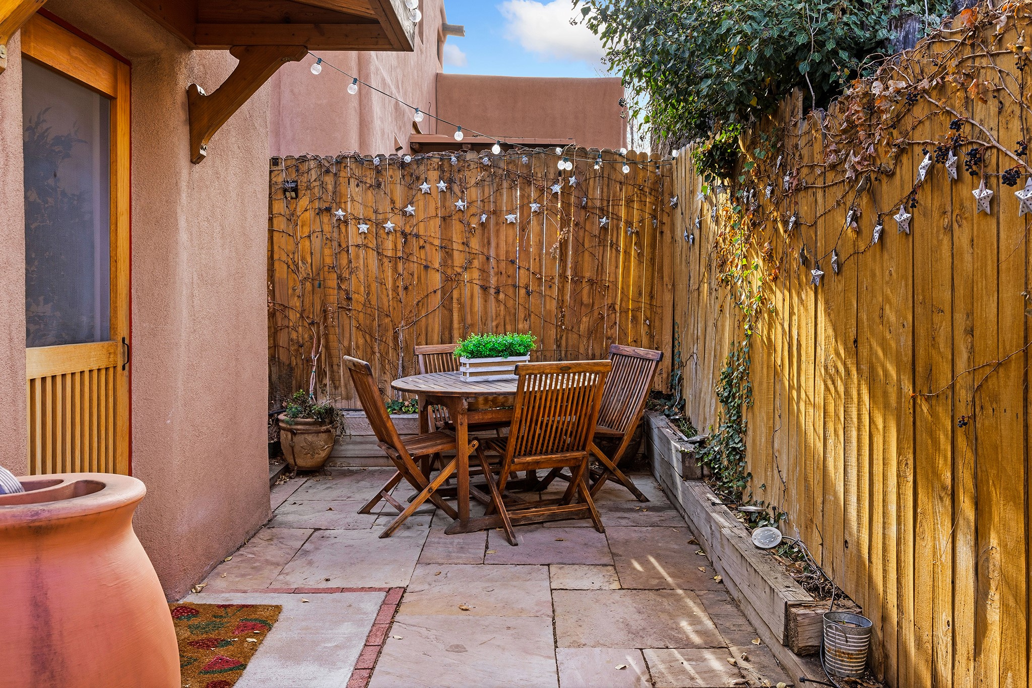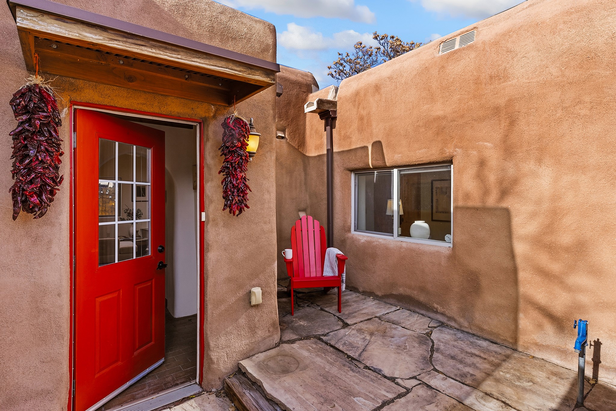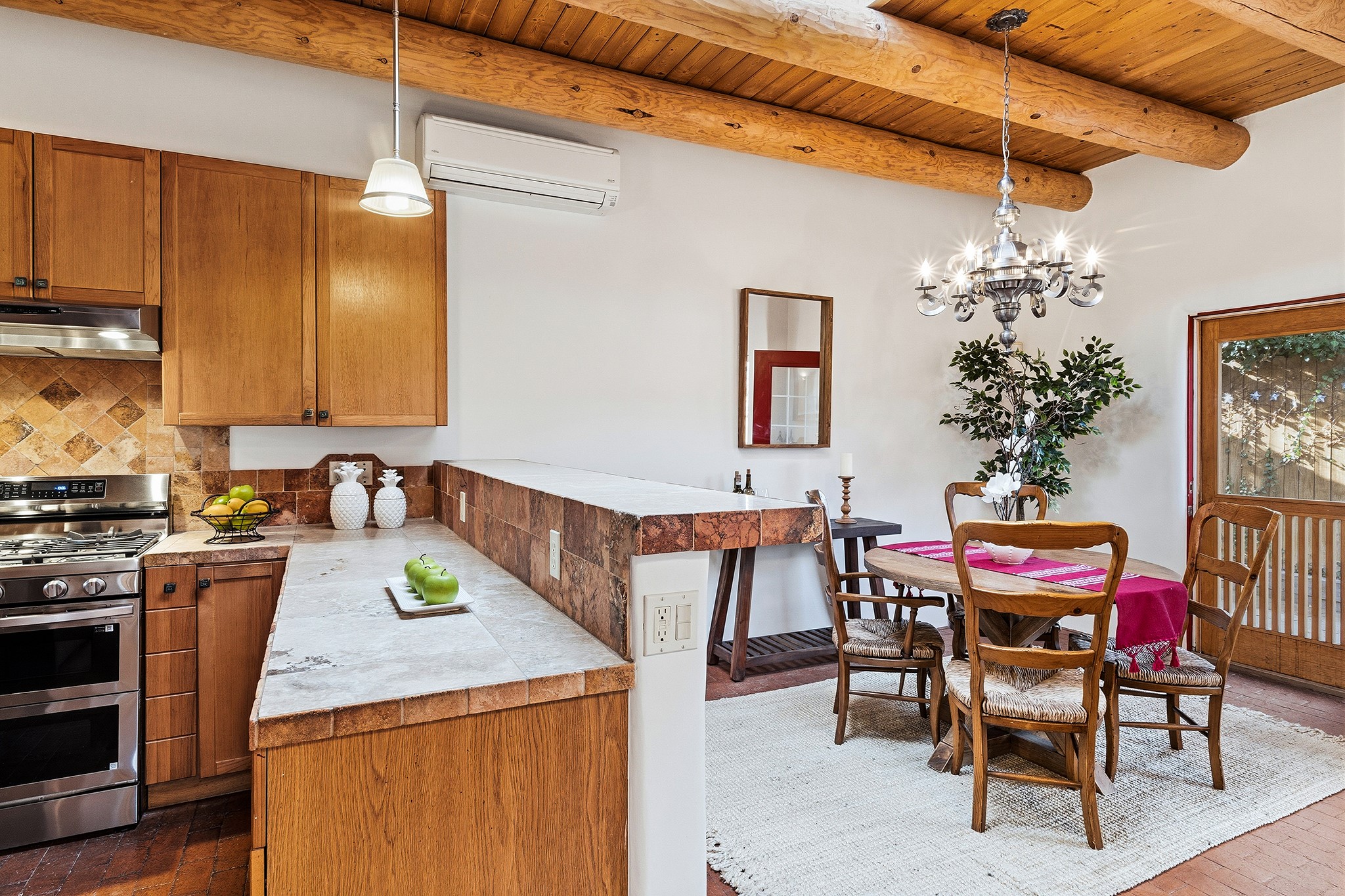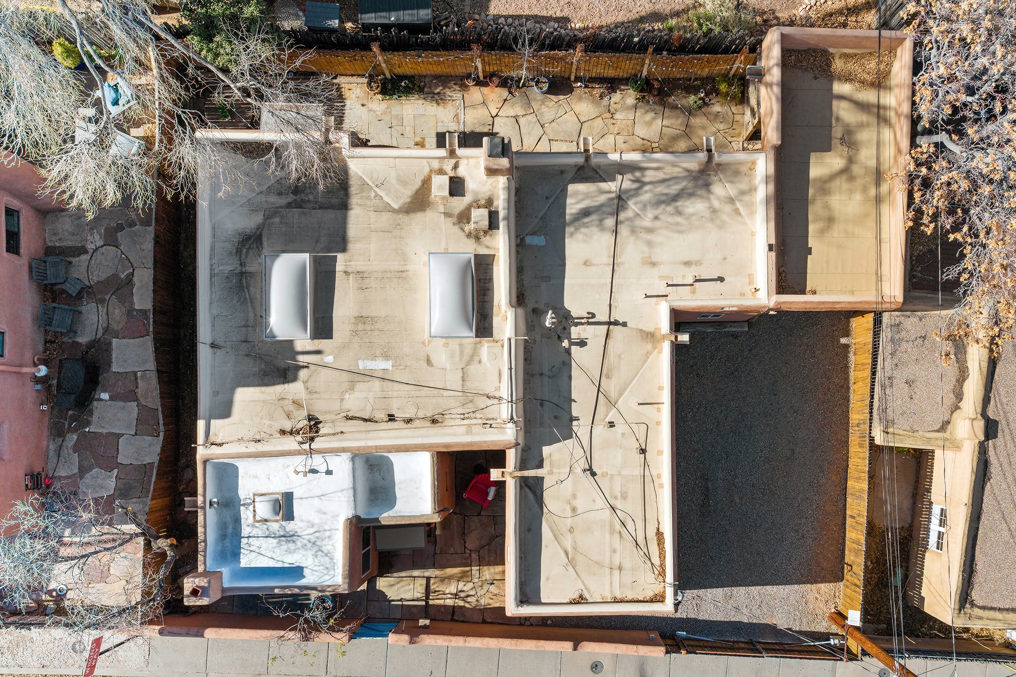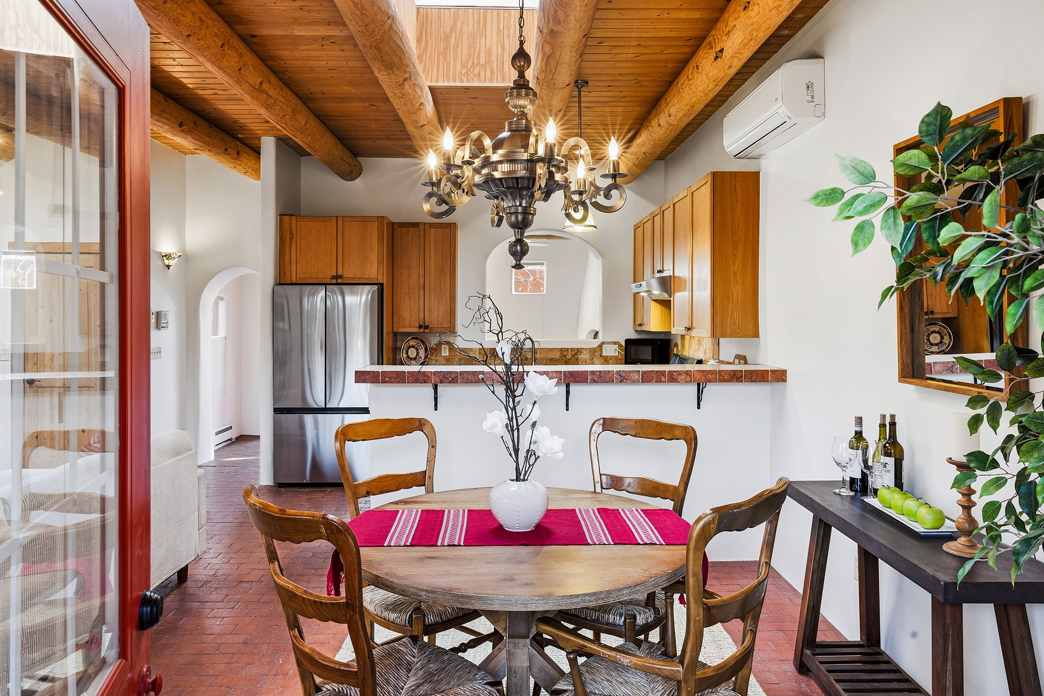 Rebuilt in 2006 on the foundation of an original 1940s adobe dwelling, this bright and open 2-bedroom, 2-bath home, with a 2013 office/studio addition, is a fine blend of traditional Santa Fe style and modern comforts. The kitchen features travertine countertops, hickory cabinetry, and all-new Samsung stainless-steel appliances (2025). Travertine tile graces both baths. There's in-floor radiant heat in all but the office, supported by a new high-efficiency boiler, plus a new, on demand water heater--both installed in 2025. Most of the home sports a new, TPO roof (2023). Fully enclosed behind walls and an electronic gate, this appealing property provides rare in-town privacy and secure parking just a half mile from the Coop, Leo's, and the Railyard's shops and galleries.