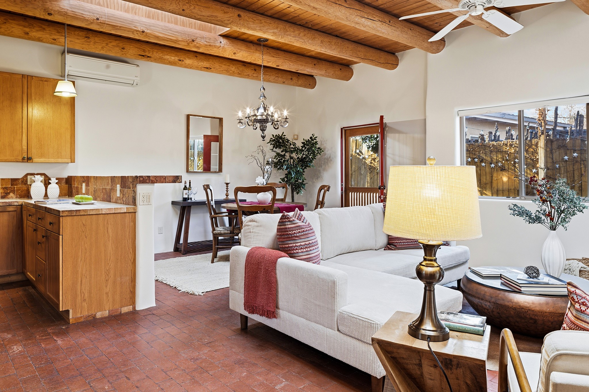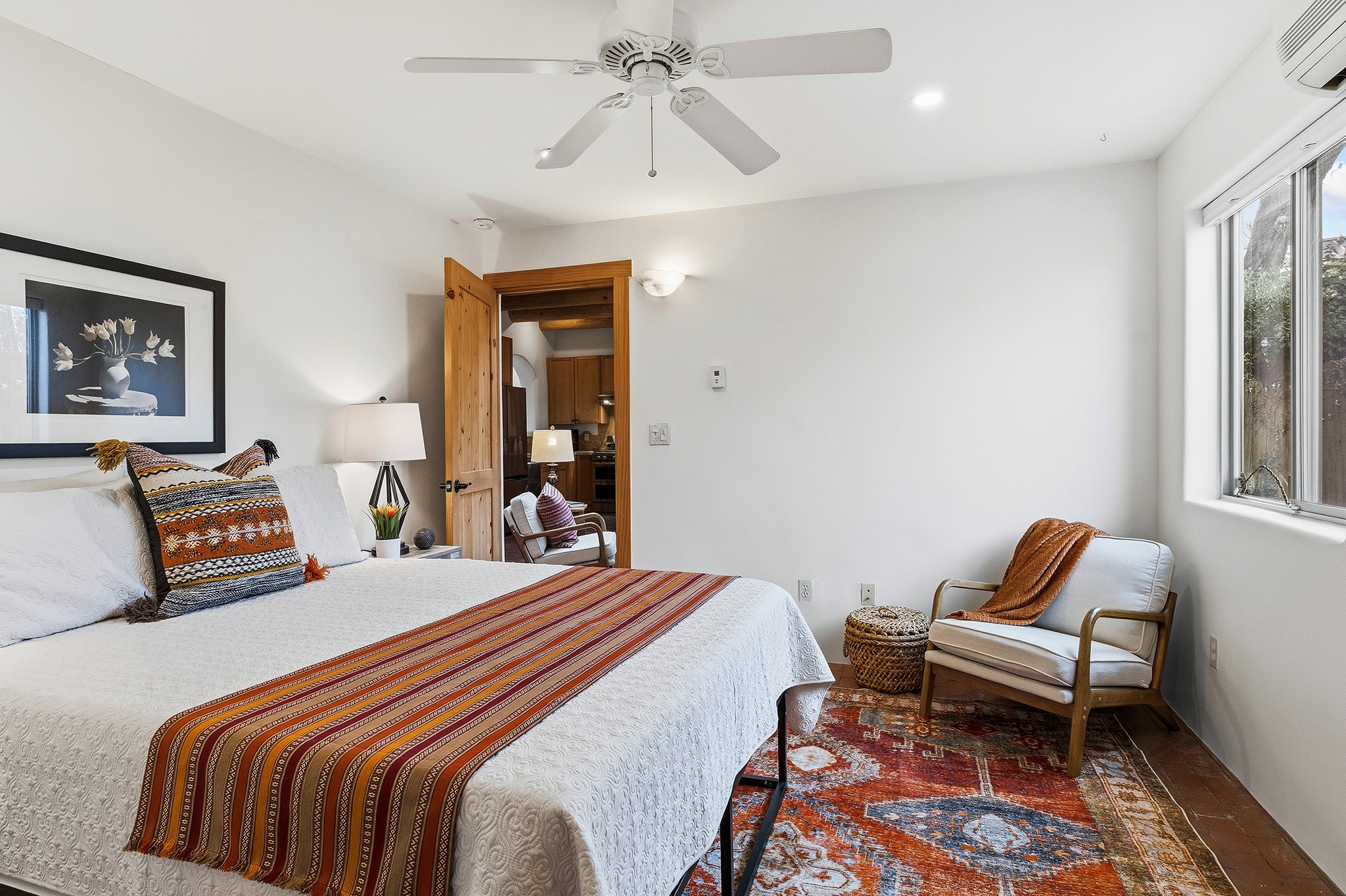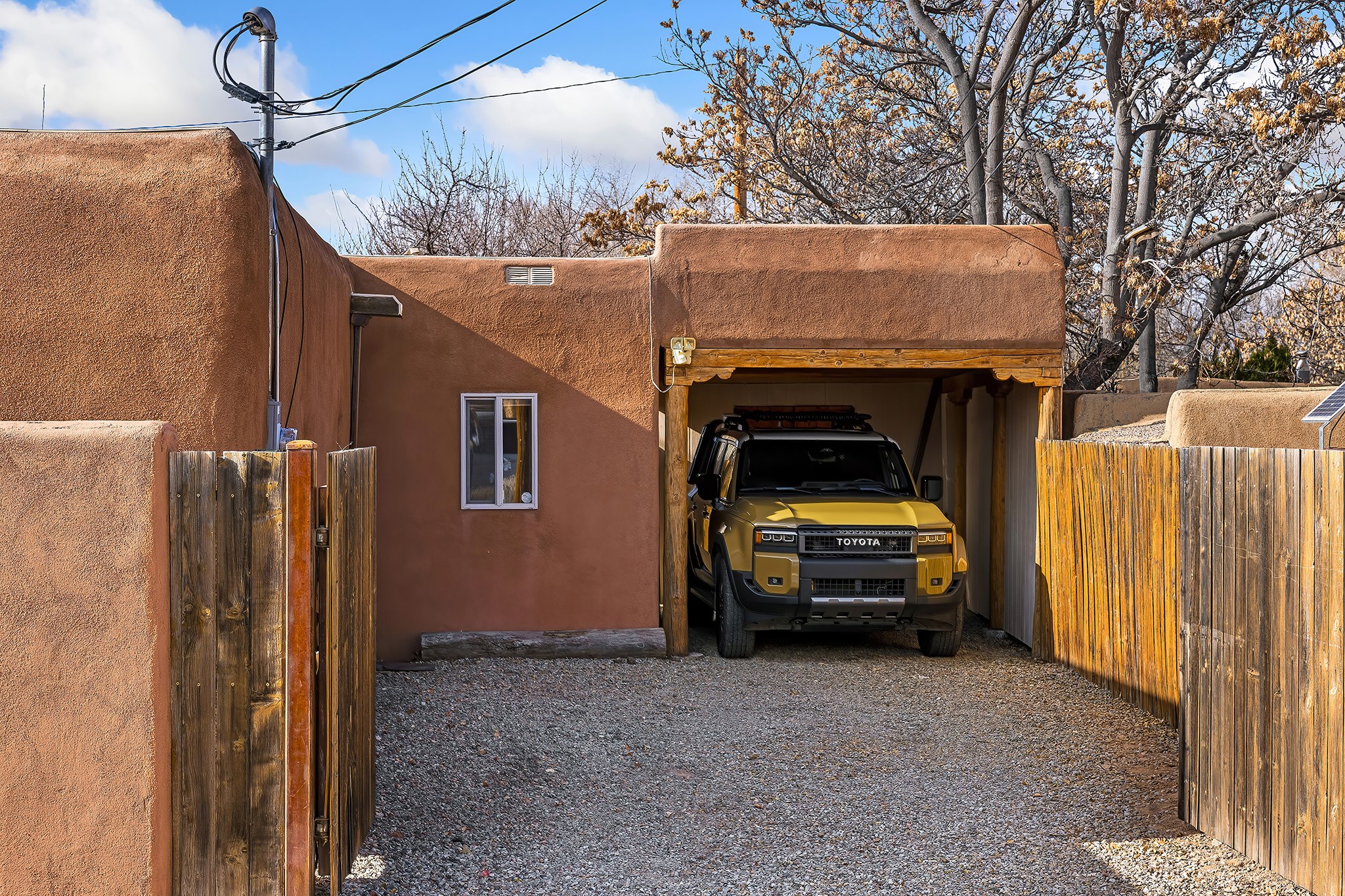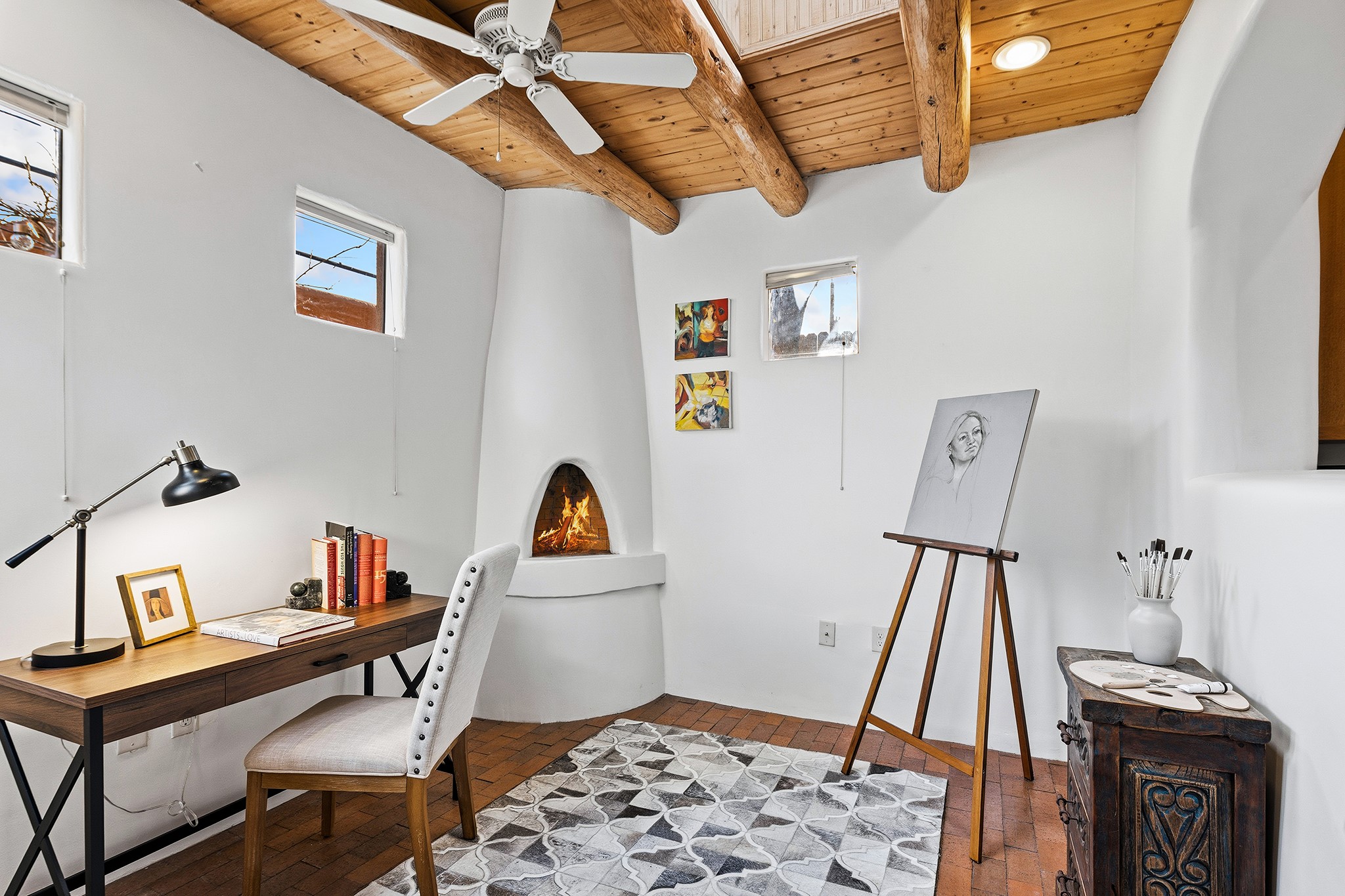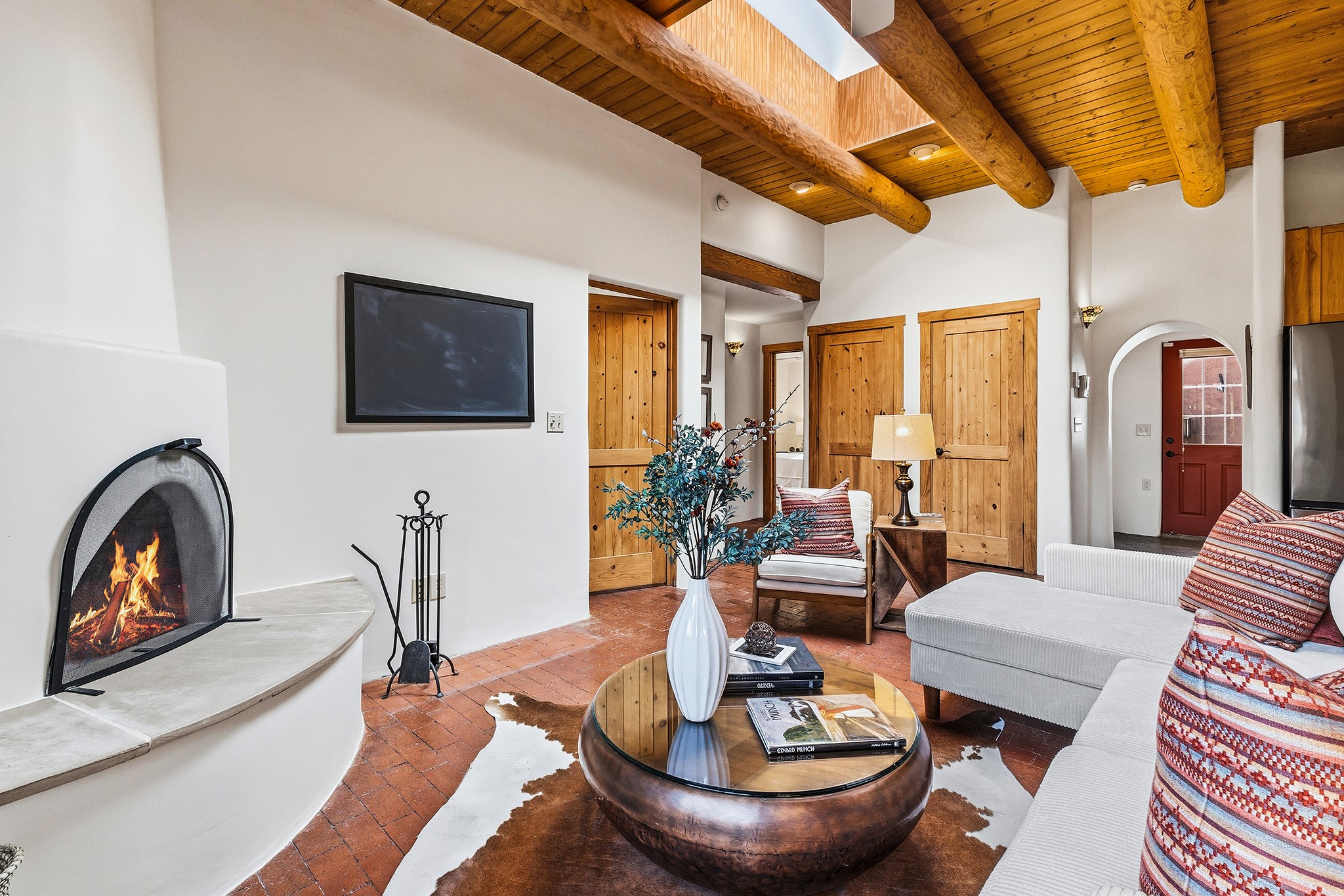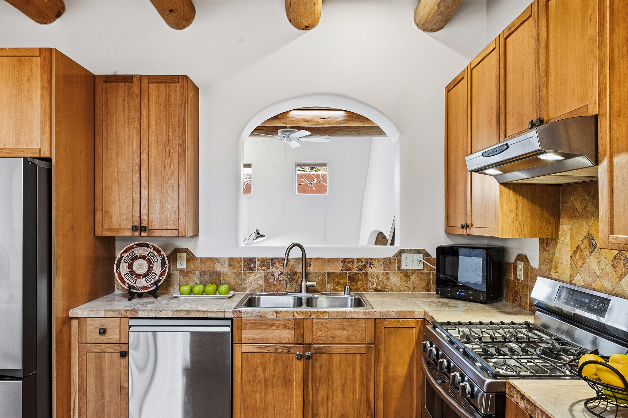 Rebuilt in 2006 on the foundation of an original 1940s adobe dwelling, this bright and open 2-bedroom, 2-bath home, with a 2013 office/studio addition, is a fine blend of traditional Santa Fe style and modern comforts. The kitchen features travertine countertops, hickory cabinetry, and all-new Samsung stainless-steel appliances (2025). Travertine tile graces both baths. There's in-floor radiant heat in all but the office, supported by a new high-efficiency boiler, plus a new, on demand water heater--both installed in 2025. Most of the home sports a new, TPO roof (2023). Fully enclosed behind walls and an electronic gate, this appealing property provides rare in-town privacy and secure parking just a half mile from the Coop, Leo's, and the Railyard's shops and galleries.