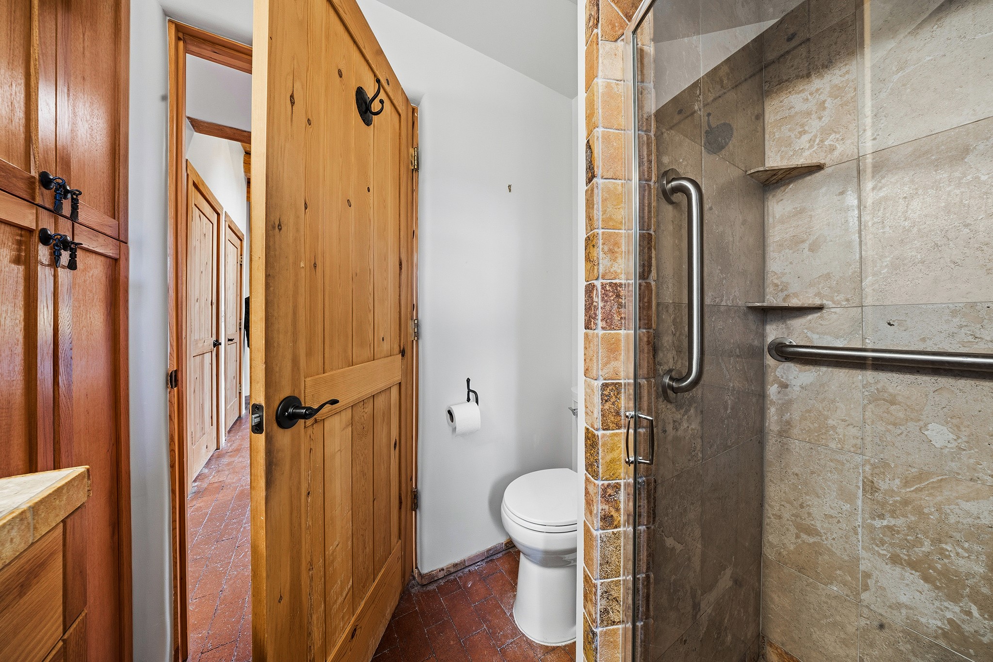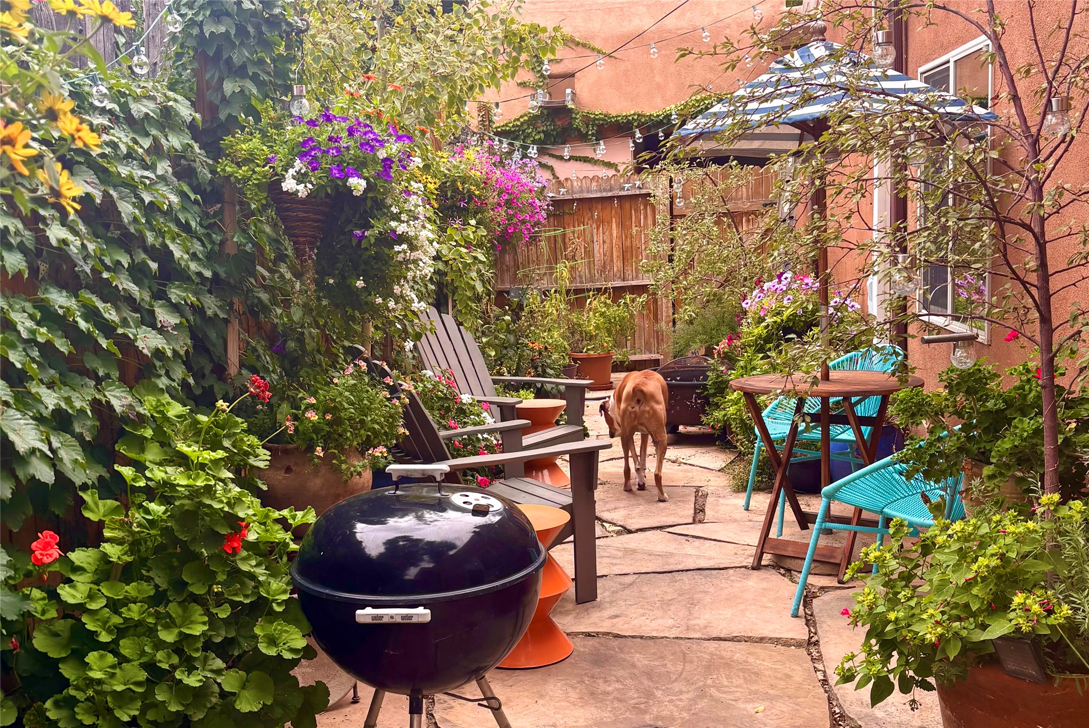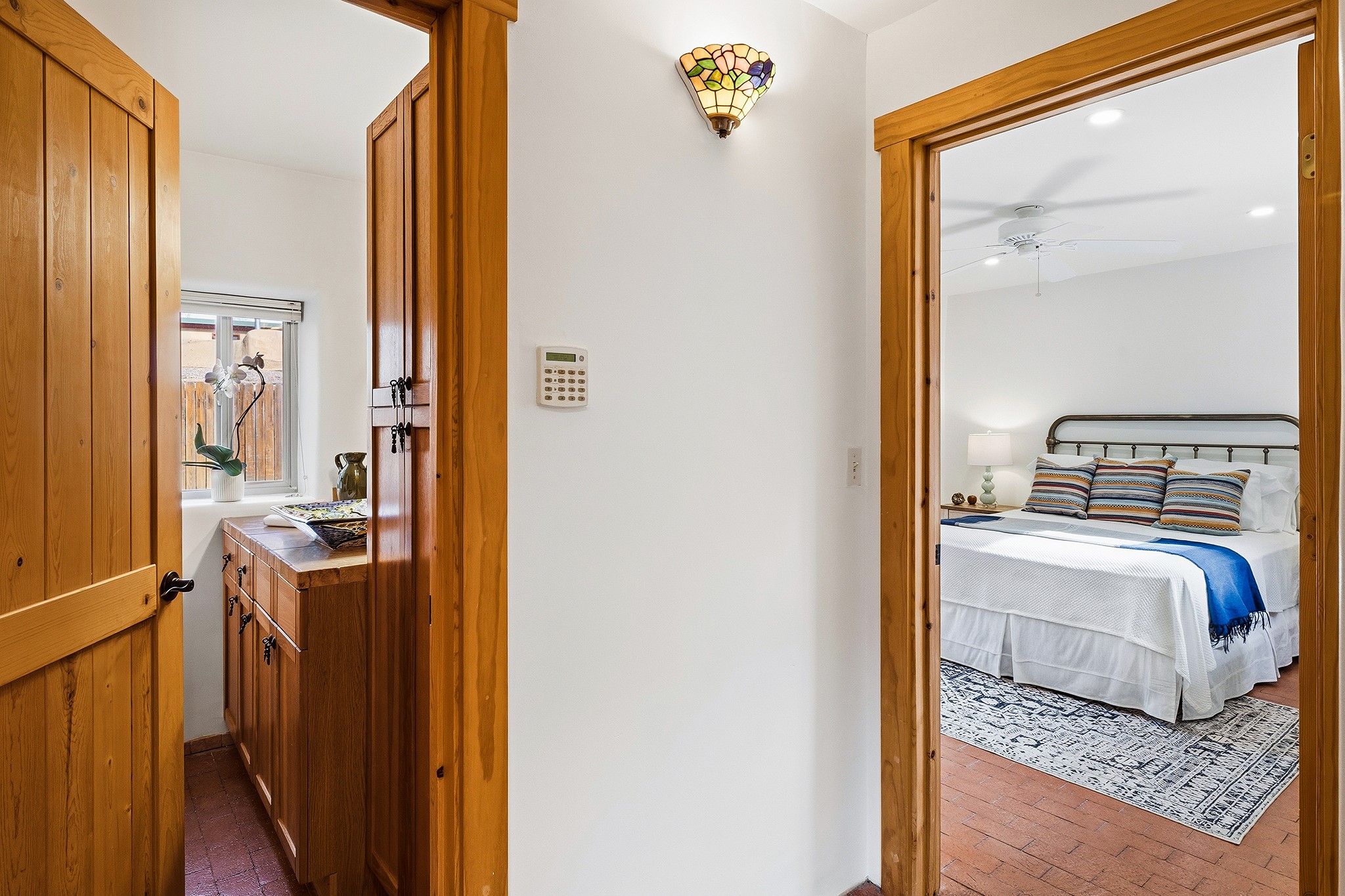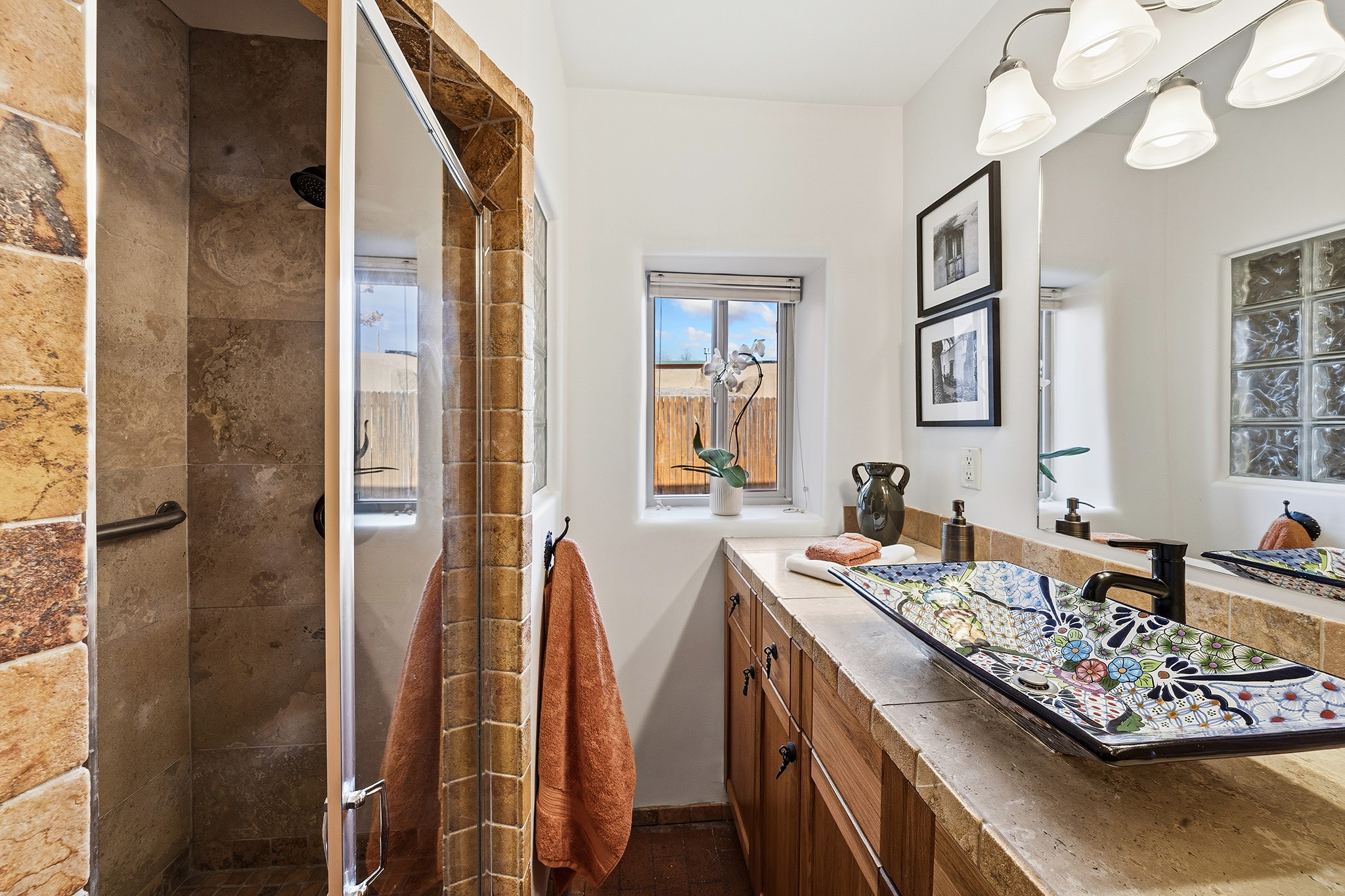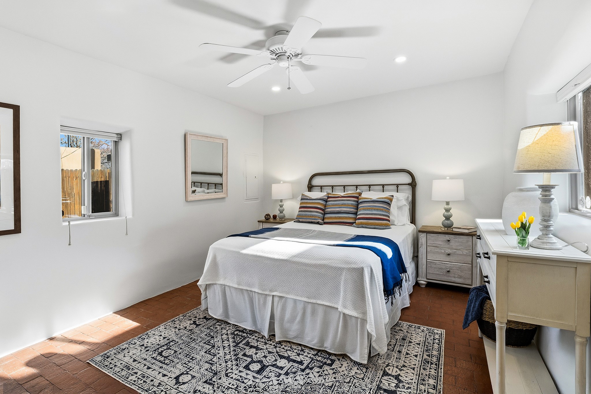 Rebuilt in 2006 on the foundation of an original 1940s adobe dwelling, this bright and open 2-bedroom, 2-bath home, with a 2013 office/studio addition, is a fine blend of traditional Santa Fe style and modern comforts. The kitchen features travertine countertops, hickory cabinetry, and all-new Samsung stainless-steel appliances (2025). Travertine tile graces both baths. There's in-floor radiant heat in all but the office, supported by a new high-efficiency boiler, plus a new, on demand water heater--both installed in 2025. Most of the home sports a new, TPO roof (2023). Fully enclosed behind walls and an electronic gate, this appealing property provides rare in-town privacy and secure parking just a half mile from the Coop, Leo's, and the Railyard's shops and galleries.