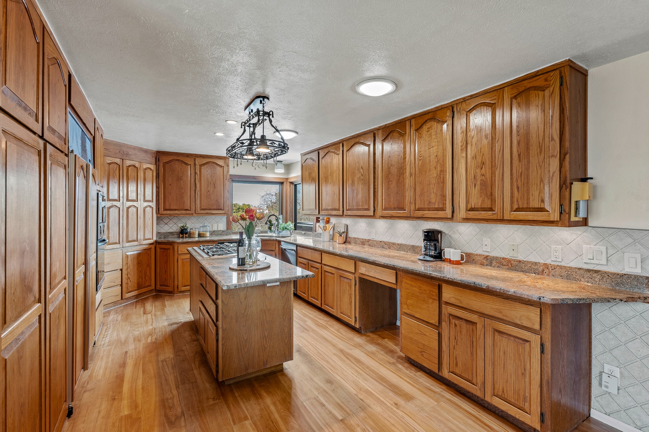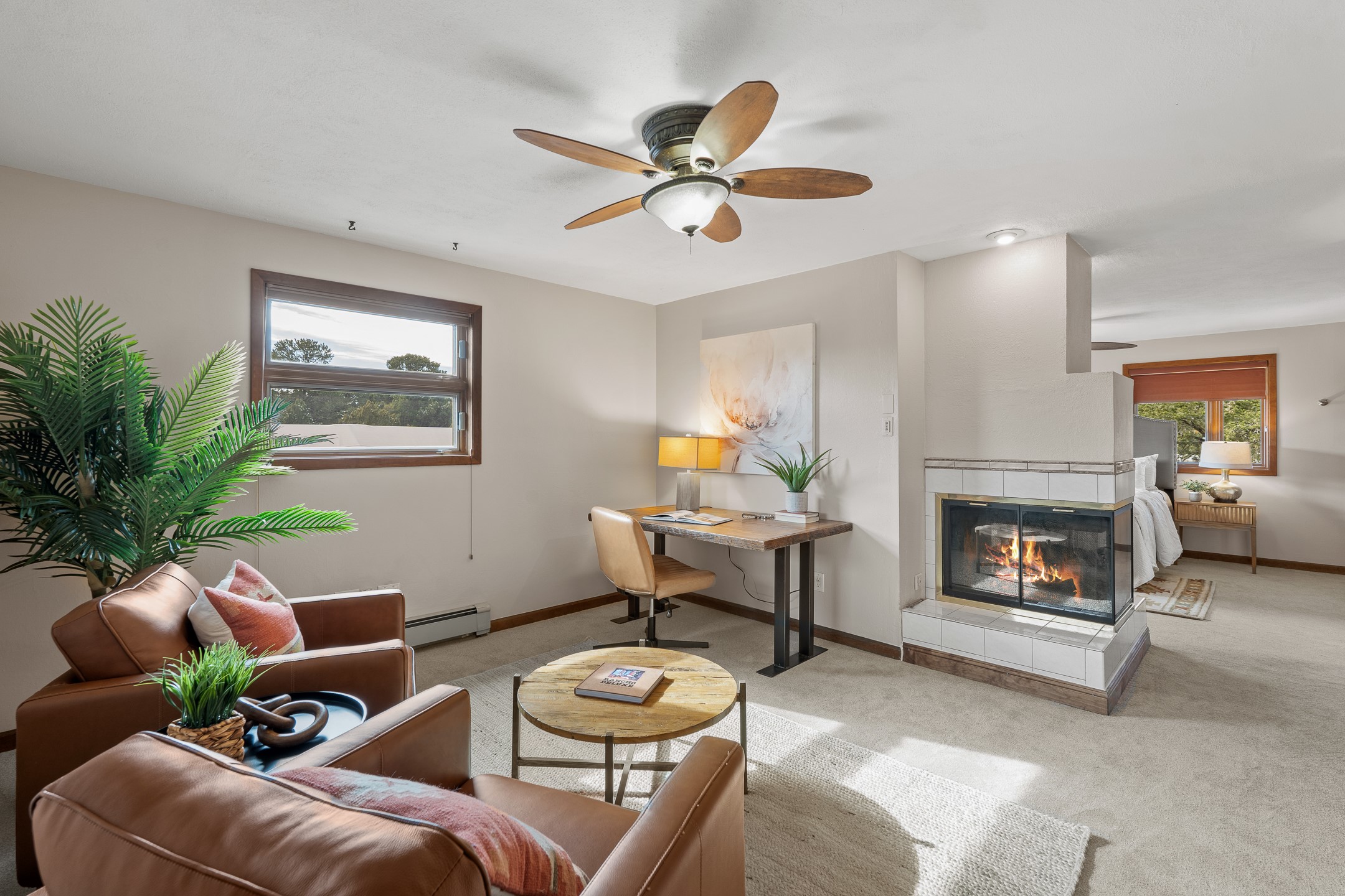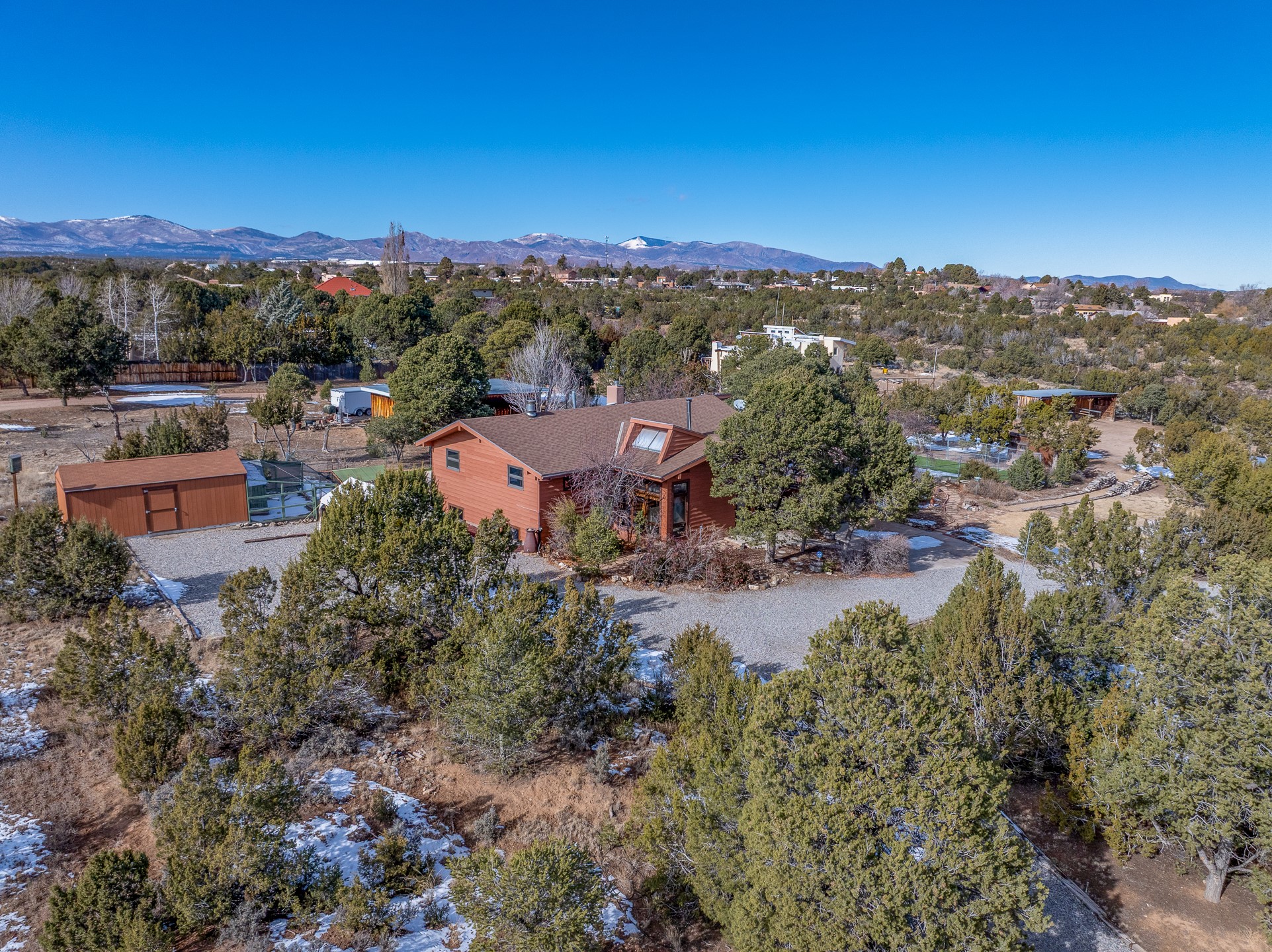 Beautifully upgraded 3,280-sq-ft home with a floor plan that provides two homes in one, set on 2+ acres, and showcasing breathtaking views of the Sangres. Welcome to 129 Piedra Loop!As you open the front door, you're immediately immersed in natural light pouring through overhead skylights, and greeted by a cheerful atrium/solarium just off the foyer. Upstairs, a loft with stunning interior views offers the perfect cozy reading retreat or flex space. Rich hardwood floors flow into the upper living area, where an ornate wood-burning fireplace anchors the open-concept layout. Adjacent to the living room is a spacious formal dining area that opens to a large Trex deck with hot tub--ideal for both summer entertaining and dark-sky stargazing.The chef's kitchen is both warm and functional, featuring a breakfast nook, custom oak cabinetry, granite countertops, a Wolf gas range, Sub-Zero refrigerator, and a corner sink positioned to take in the incredible view while preparing your gourmet meals.The south wing of the upper level is devoted to a generously-sized primary suite, thoughtfully divided by a partial wall and a stunning inset double fireplace encased in glass on three sides. The bedroom offers west- and south-facing windows to capture sunsets and mountain light, while the adjoining space--with east- and south-facing windows--makes an ideal office, gym, or private retreat. The updated ensuite bath includes a modern walk-in shower. A full guest bathroom on the main level provides added convenience for everyday living and entertaining.The lower level contains a kitchenette, laundry room, two bedrooms, and a full bathroom, providing you with multi-generational living options. Recessed lighting, stone tile, and radiant in-floor heating for quiet comfort extend throughout the lower level. A large open-concept living area features a stacked-stone hearth with wood-burning fireplace and the kitchenette, and a wine cellar is adjacent to the kitchenette. The south wing houses two generously sized bedrooms and a full bathroom with dual vanities. An extra-wide garage rounds out the lower level.Outside, enjoy privacy among mature trees and juniper, complemented by low-maintenance zero-scape landscaping. Two dog runs with synthetic turf keep pets comfortable and clean. The back of the property includes a spacious barn plus multiple outbuildings, parking areas for RVs and large trailers, and storage sheds--rounding out an exceptional package for those seeking space, views, and versatility. A carport with a Tesla charger is also available for your electric vehicles. Schedule your showing today before this one is gone!