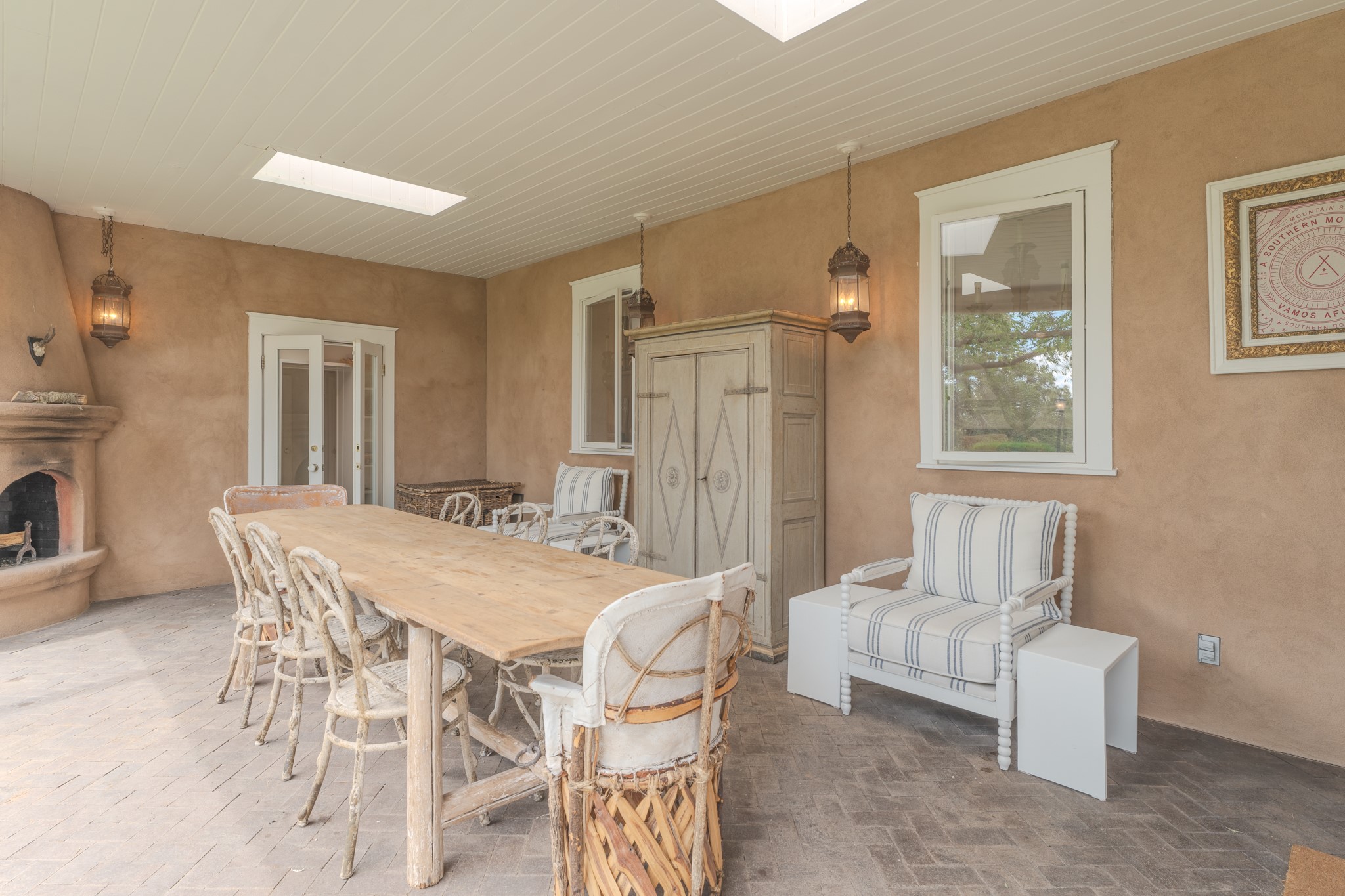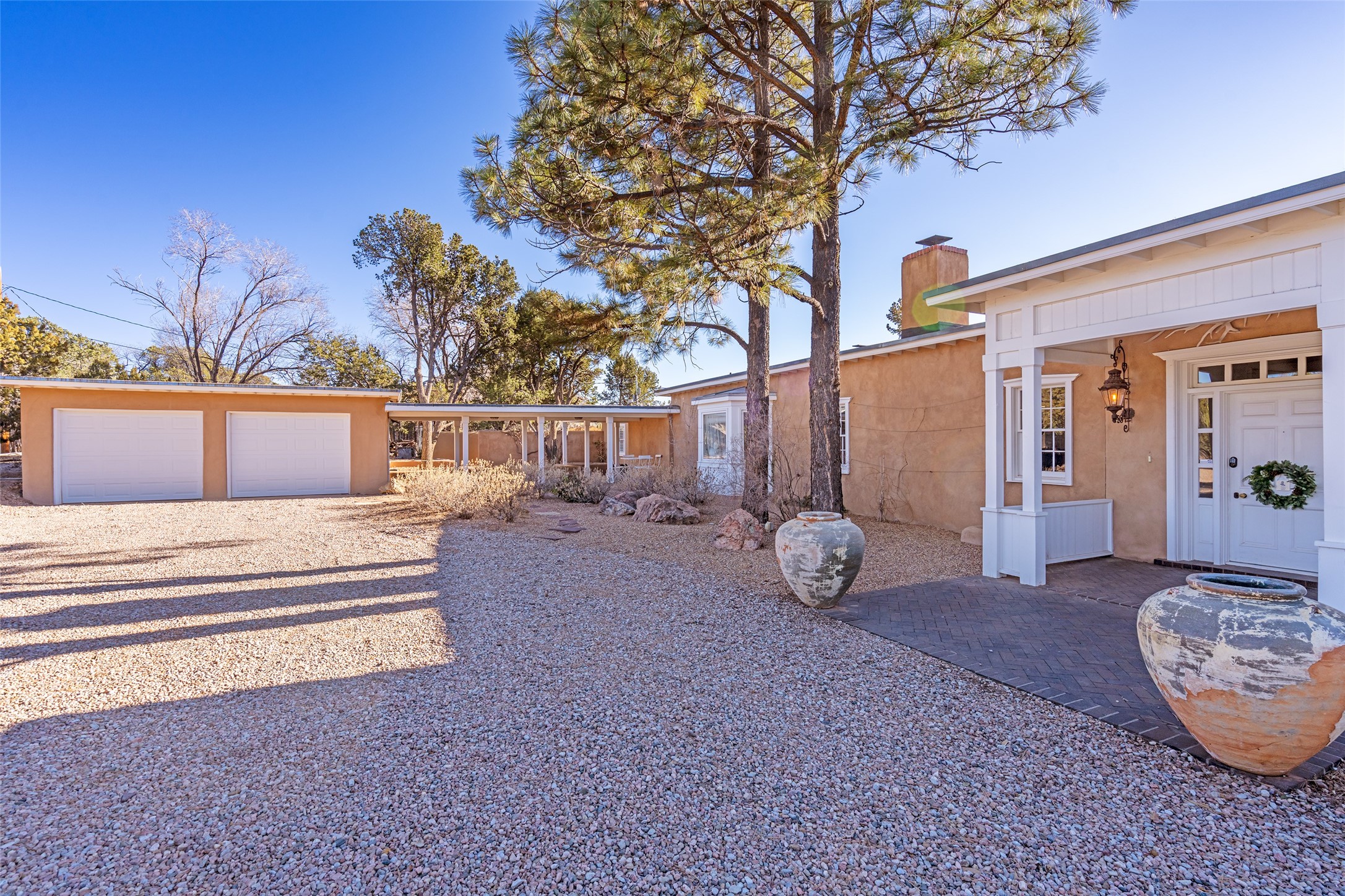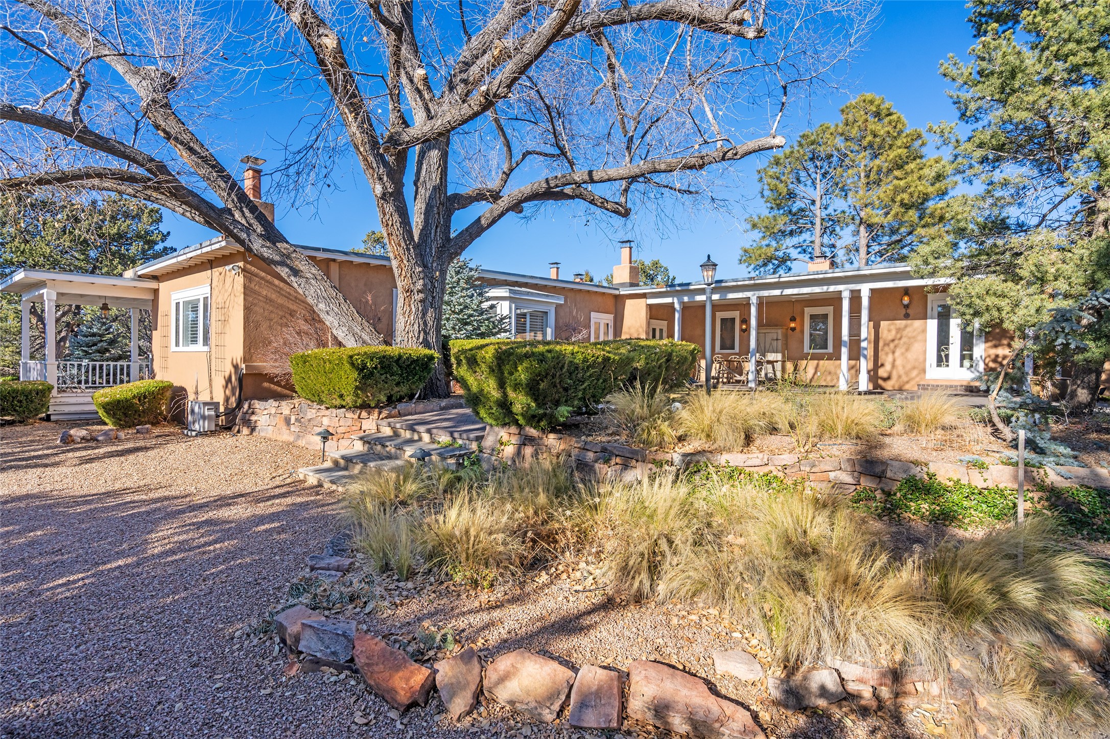 Privately nestled among mature trees on nearly three acres, this distinguished New Mexico Territorial-style estate captures sweeping views of the Sangre de Cristo, Sandia, and Ortiz Mountains. Timeless architecture and thoughtful craftsmanship define the 3,600-square-foot main residence, where a gracious brick-floored entry hall creates an immediate sense of arrival and seamlessly connects the home's refined living spaces. A separate one bedroom, one bath guest house offers a welcoming retreat for visitors, complete with a living and dining area, full kitchen, and private patio. The property also offers a substantial heated, detached garage/studio that presents endless possibilities as an artist's studio, workshop, or collector's showroom. Designed for both elegant entertaining and everyday comfort, the residence offers four bedrooms, four bathrooms, formal dining room, and a generous eat-in kitchen. The serene primary suite is a private sanctuary, featuring its own media room, walk-in closet, and secluded portal--perfect for quiet mornings or sunset views. Eight fireplaces throughout the home, including one on the expansive backyard portal, provide warmth, ambiance, and year-round livability. Multiple portals invite effortless indoor-outdoor living, ideal for enjoying Santa Fe's celebrated climate and breathtaking mountain vistas. Located in Santa Fe's coveted Historic Eastside, this exceptional property offers rare privacy just minutes from renowned hiking trails, Museum Hill, Canyon Road, and the Downtown Plaza--an extraordinary opportunity to experience refined living at the heart of Northern New Mexico's cultural landscape.