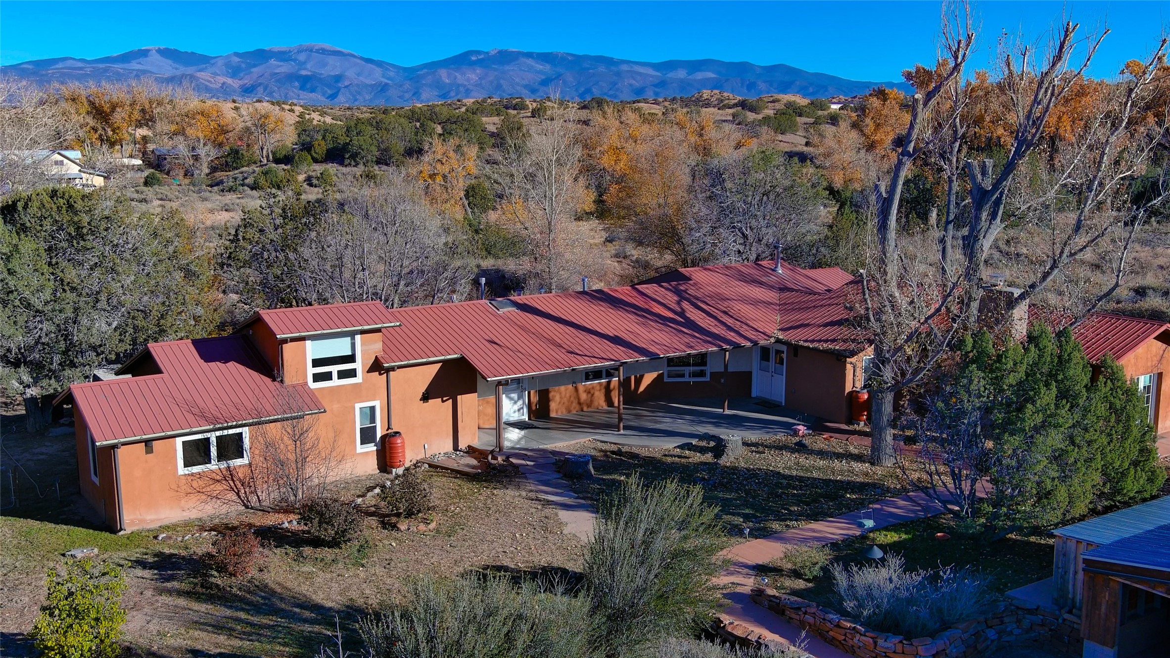 Experience the best of both worlds in this classic Northern New Mexico adobe, where timeless architecture meets a contemporary, light-filled interior. Spanning 3,237 sq. ft., the home offers 3 bedrooms, 2 baths, and an inviting upstairs loft with generous storage. The residence features a chef's kitchen, soaring ceilings, and a dining/family room warmed by a wood-burning stove. The large primary en-suite includes a spacious walk-in closet system, a luxurious soaking tub, and a separate shower. The bedroom's high ceilings and walk-out access to the garden create a private retreat. The expansive living room--anchored by a wood-burning fireplace--can be configured as both a living space and formal dining area. A 231 sq. ft. front patio provides an exceptional setting for entertaining or simply enjoying the outdoors. Several versatile outbuildings complement the main home: a 2-car carport, a 1,259 sq. ft. garage/workshop with an attached studio and office, and a 720 sq. ft. adobe garage with warehouse-style roll-up doors--ideal for artists, craftsmen, hobbyists, or a home-based business. Set on a sprawling 3.17-acre lot, the offering also includes an additional 2.52-acre parcel with its own water rights and an 840 sq. ft. garage/storage building--for a combined 5.69 acres. The property is a gardener's or farmer's dream, boasting 13.26 acre-feet of irrigation water rights across the two parcels, plus a private well with water rights. With boundless potential for future development--and room for horses--this unique property is located just 20 minutes from Los Alamos or Santa Fe. Don't miss the aerial video and 3D virtual tour!