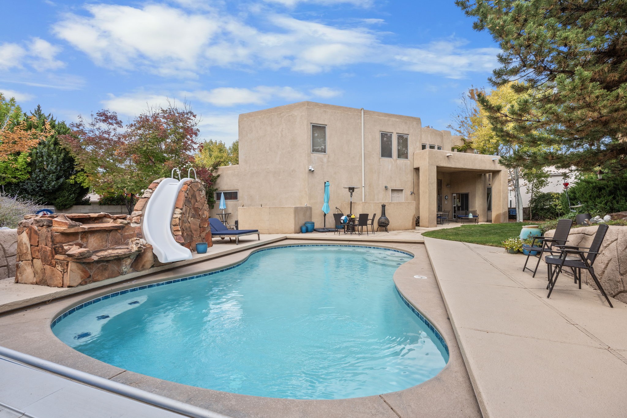 A rare offering of timeless architecture and elevated comfort, this beautifully updated residence showcases the signature design of Eric Spurlock and the craftsmanship of Tiara Homes, set within Albuquerque's only 24-hour guard-gated community Thoughtfully designed, the home offers three bedrooms plus a study or optional fourth bedroom, three baths, and an oversized three-car garage with ample space for a golf cart--perfectly suited for both daily living and resort-style enjoyment. Refrigerated air ensures year-round comfort. At the heart of the home, a dramatic circular staircase creates a striking focal point, anchoring the elegant layout. The expansive great room is an entertainer's dream, featuring a wet bar, soaring tongue-and-groove ceilings accented by handcrafted vigas, anda stunning fireplace that adds warmth and architectural presence. A cozy formal living room and a refined formal dining space provide inviting areas for intimate gatherings and special occasions.Updated kitchen is both functional and inviting, complemented by a charming breakfast room ideal for casual mornings. The luxurious owner's suite is a private retreat, featuring its own fireplace, a private balcony, and a spa-inspired ensuite bath with a large soaking tub, separate shower, and dual walk-in closets.Outdoors, the just-over-a-quarter-acre cul-de-sac lot offers privacy and space, highlighted by a sparkling, heated gunite pool with waterfall and slide, creating a true backyard oasis. The pool is 16 feet by 28 feet, with a depth going from 3 feet to 7, heated with a salt chlorination system and a new deck on deck automatic cover.Distinctive, refined, and truly one of a kind, this exceptional home blends luxury, comfort, and architectural artistry, a masterpiece not to be missed.