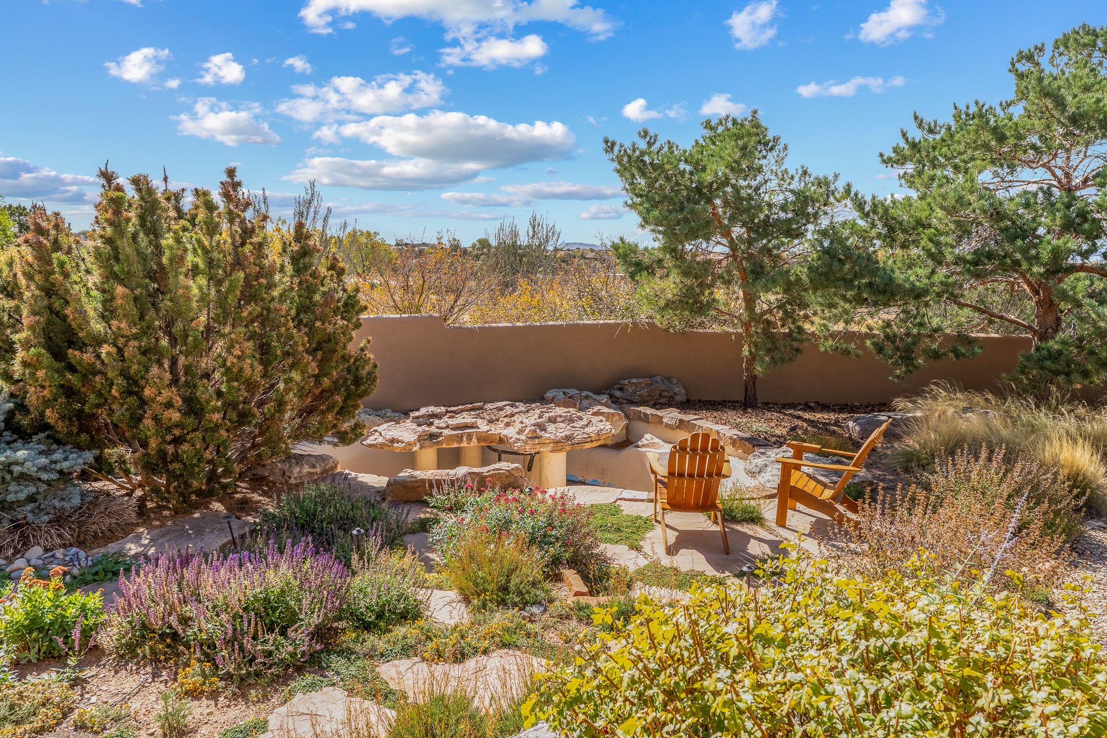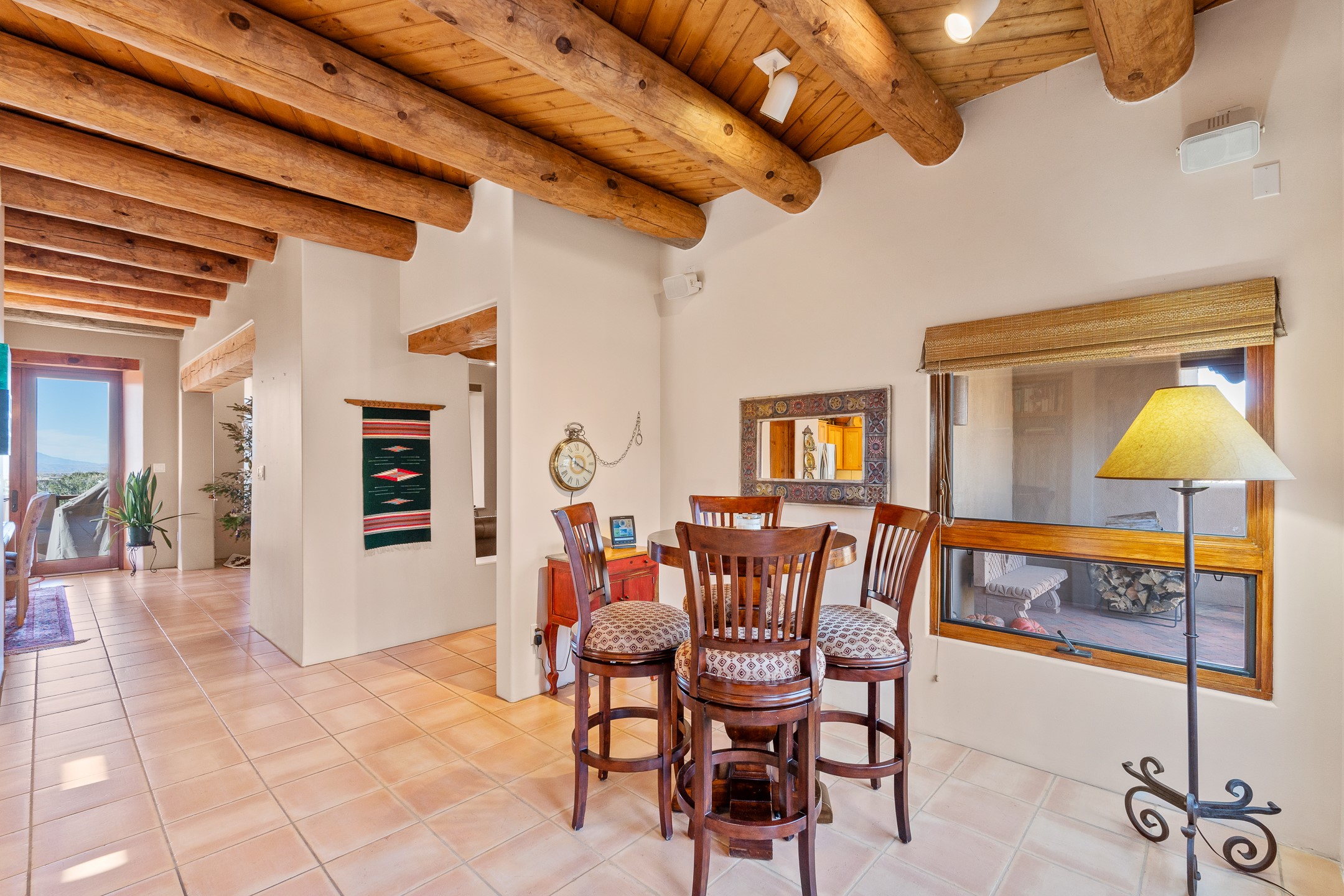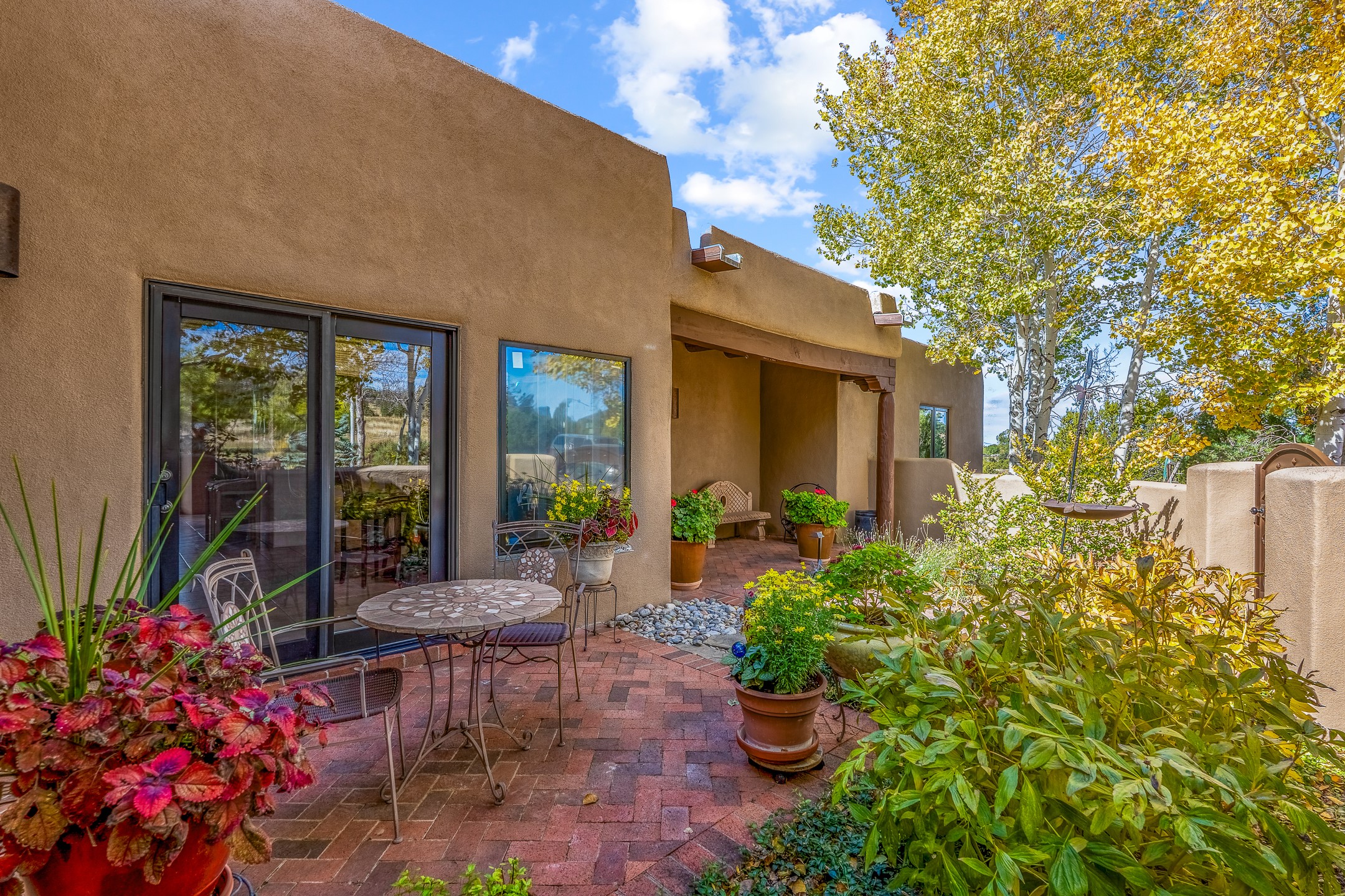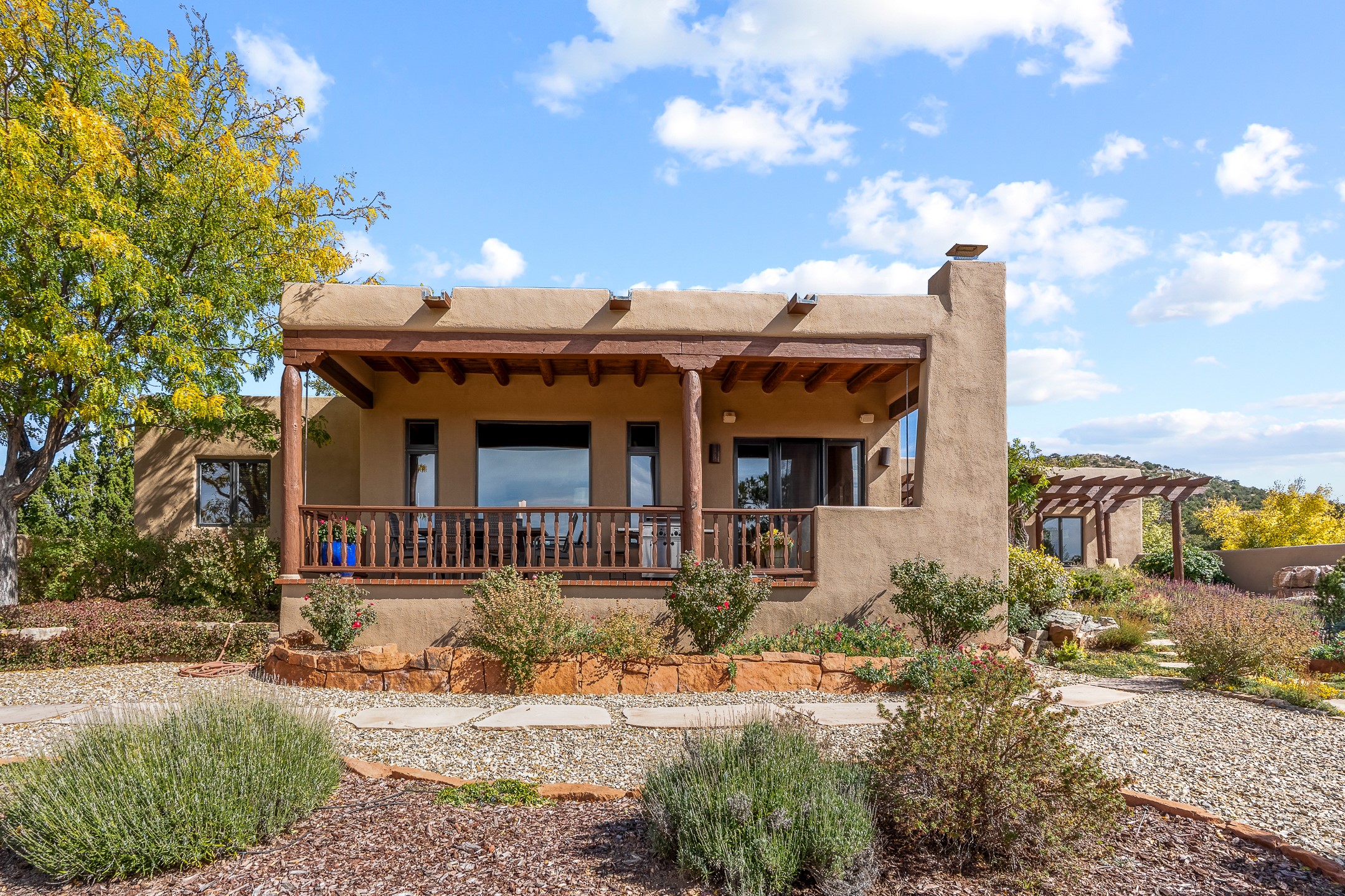 Move-in-ready, single-level home offering 3 bedrooms, 2 full bathrooms, and 1 half bathroom, plus an attached studio, located in the desirable Dos Griegos subdivision, approximately 20 minutes from Santa Fe. The main residence spans 2,995 square feet and features a thoughtfully designed floor plan with the primary suite and guest bedrooms situated in separate wings for optimal privacy. The living area showcases tall ceilings with vigas and tongue-and-groove planks, complemented by large windows that fill the home with abundant natural light. A formal dining room and a sunny breakfast nook provide flexible dining and entertaining options. The primary bedroom includes an extended office or flex space, while a full guest bath is conveniently located between the guest bedrooms, and a half bath sits just off the breakfast nook. Outdoor living is a highlight, with a fully enclosed, landscaped backyard on a drip irrigation system, a rear portal for enjoying the views, and a trellis off the primary bedroom. Two tranquil water features enhance the backyard setting, and an outdoor jacuzzi is ideally positioned between the attached studio and flex space. Additional features include three wood-burning kiva fireplaces, a side flagstone trellis, mature trees, and a welcoming front courtyard. Quality windows, new appliances, and exceptional craftsmanship throughout complete this offering. The home was awarded Best Craftsmanship in the Parade of Homes, reflecting its timeless design and attention to detail.