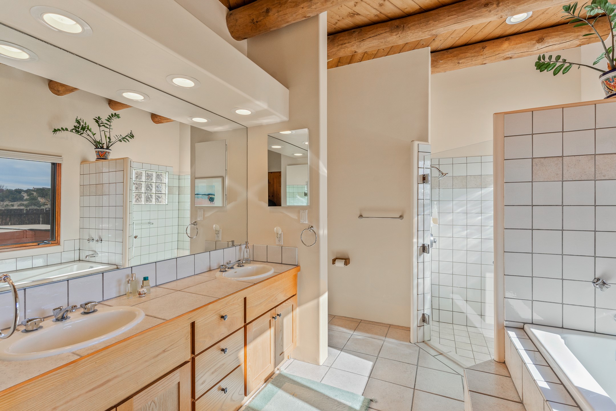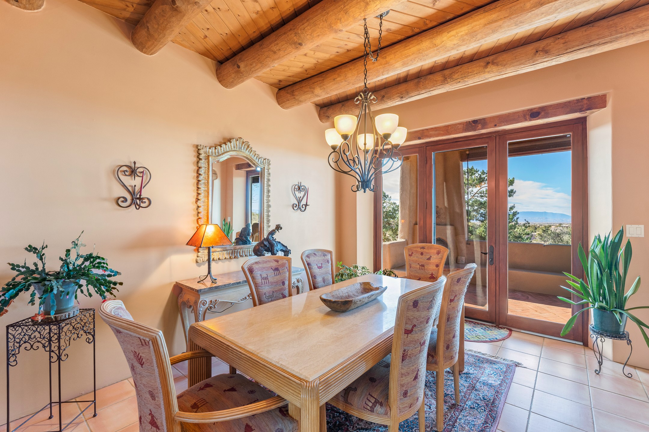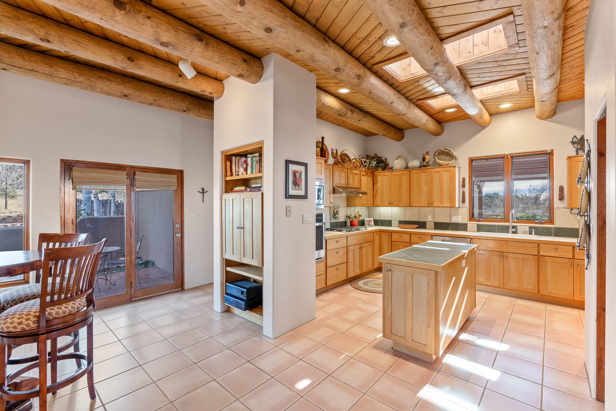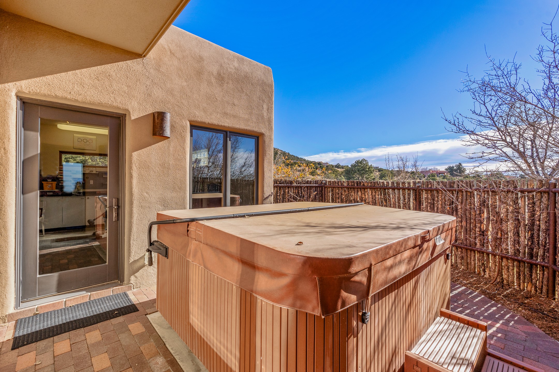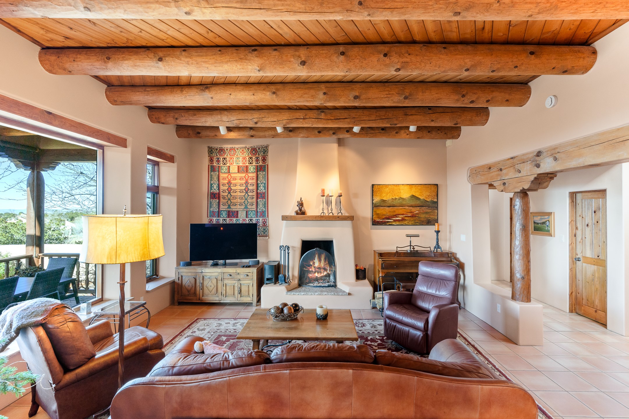 Move-in-ready, single-level home offering 3 bedrooms, 2 full bathrooms, and 1 half bathroom, plus an attached studio, located in the desirable Dos Griegos subdivision, approximately 20 minutes from Santa Fe. The main residence spans 2,995 square feet and features a thoughtfully designed floor plan with the primary suite and guest bedrooms situated in separate wings for optimal privacy. The living area showcases tall ceilings with vigas and tongue-and-groove planks, complemented by large windows that fill the home with abundant natural light. A formal dining room and a sunny breakfast nook provide flexible dining and entertaining options. The primary bedroom includes an extended office or flex space, while a full guest bath is conveniently located between the guest bedrooms, and a half bath sits just off the breakfast nook. Outdoor living is a highlight, with a fully enclosed, landscaped backyard on a drip irrigation system, a rear portal for enjoying the views, and a trellis off the primary bedroom. Two tranquil water features enhance the backyard setting, and an outdoor jacuzzi is ideally positioned between the attached studio and flex space. Additional features include three wood-burning kiva fireplaces, a side flagstone trellis, mature trees, and a welcoming front courtyard. Quality windows, new appliances, and exceptional craftsmanship throughout complete this offering. The home was awarded Best Craftsmanship in the Parade of Homes, reflecting its timeless design and attention to detail.