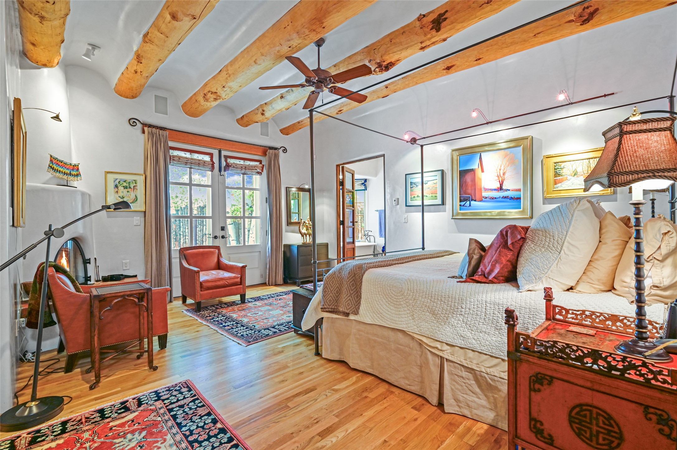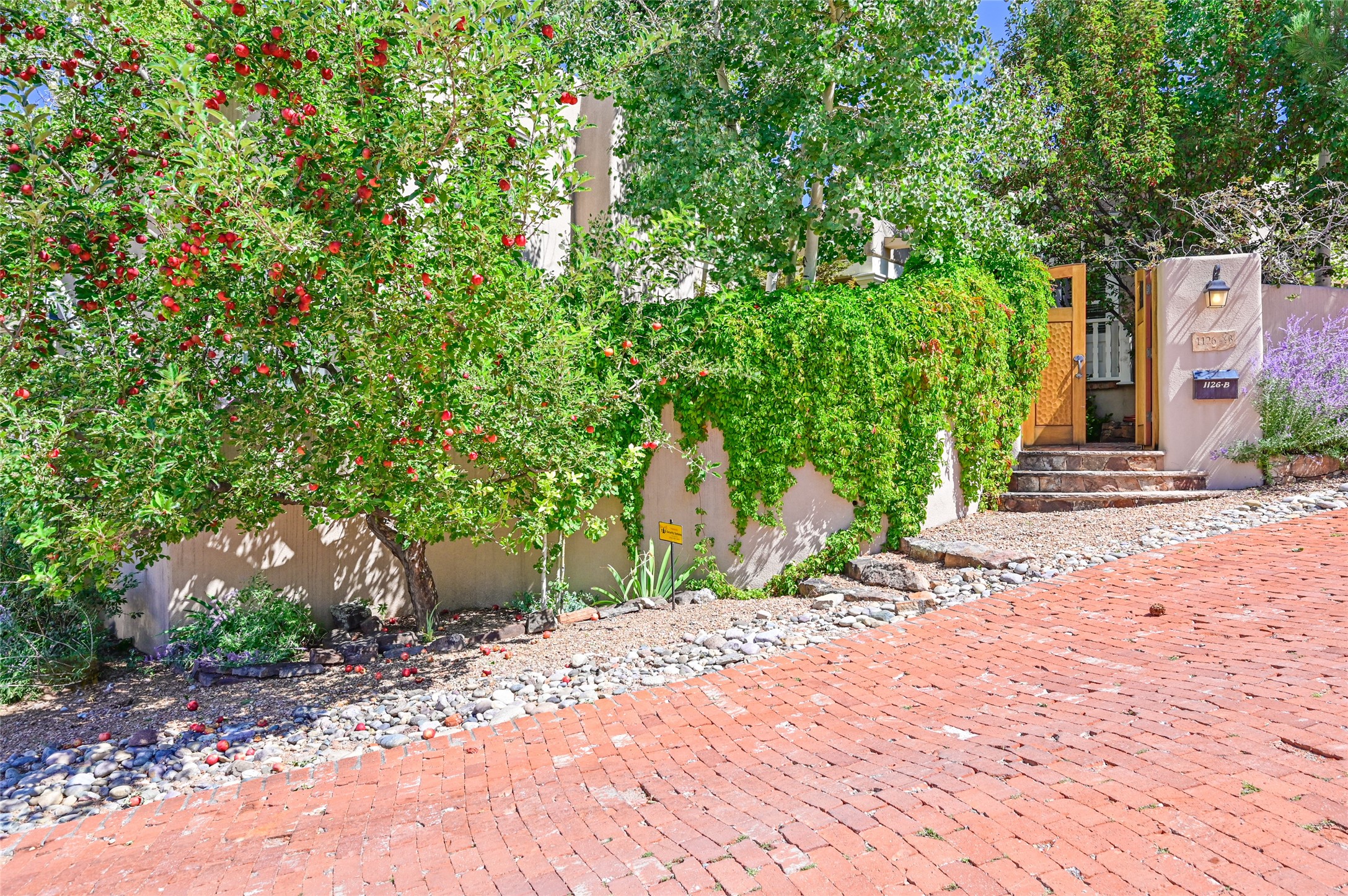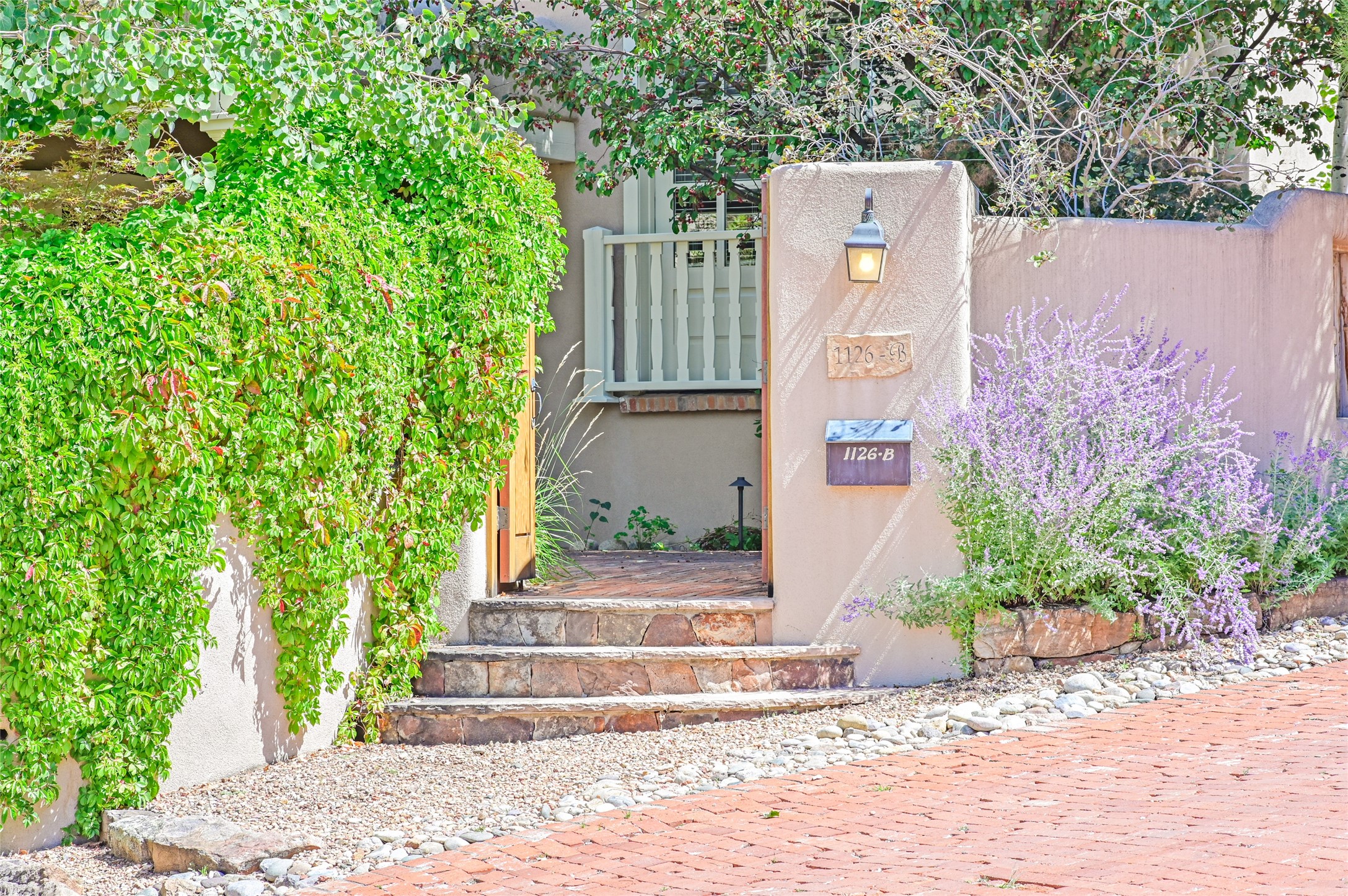 Amazing Eastside, mostly adobe home on a private brick lane. Well-known Builder Jay Park construction.Beautifully designed with all wood flooring, tall beamed ceilings, and a fabulous kitchen space. Sangre De Christo mountain views from the landscaped back patio/garden area. Central heat and air, and a workout room. 3 bedrooms, 3 baths with a direct-access 2-car garage. 2nd home that has been immaculately maintained. Some interior steps. Sangre views off the back patio.