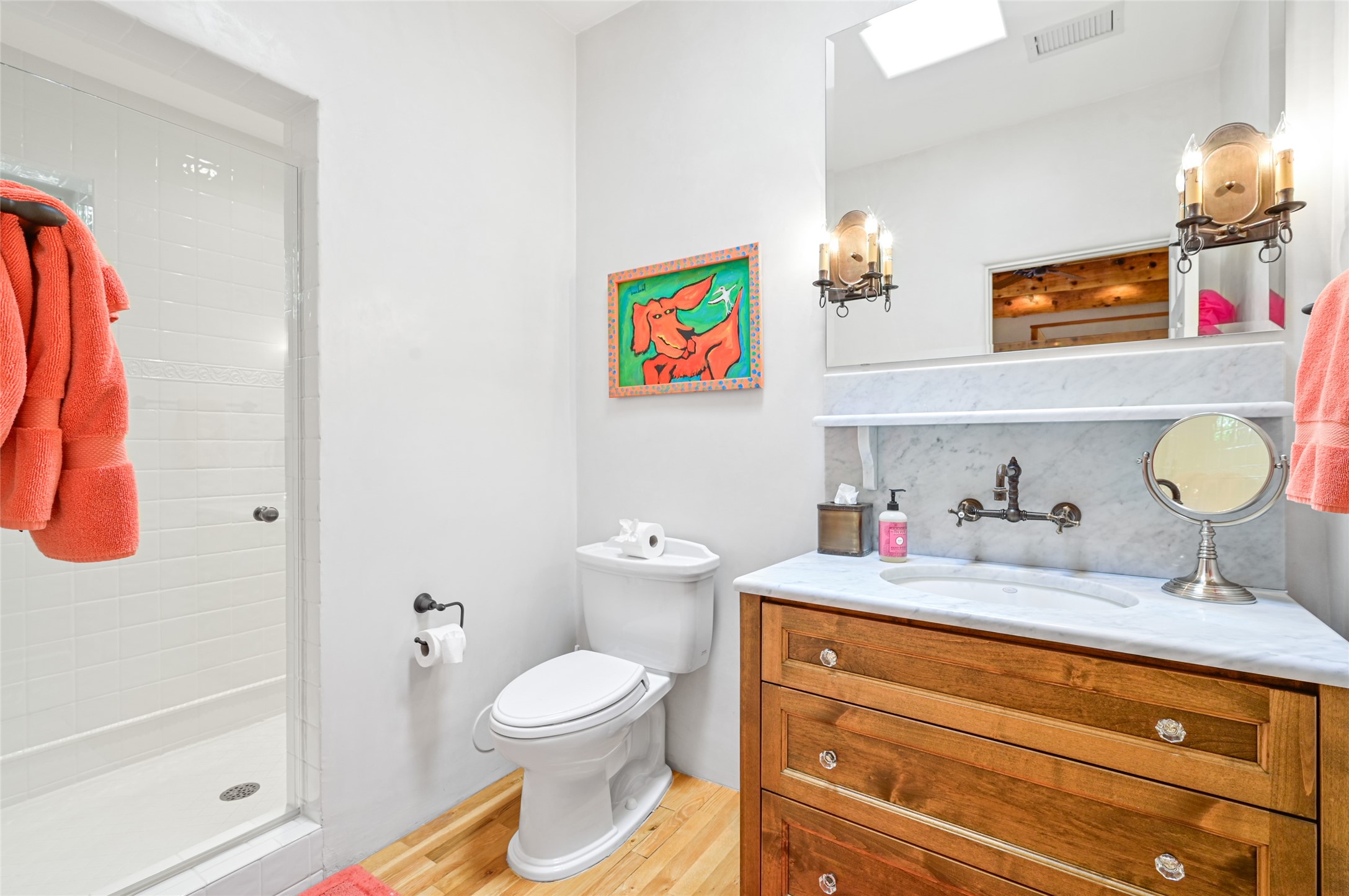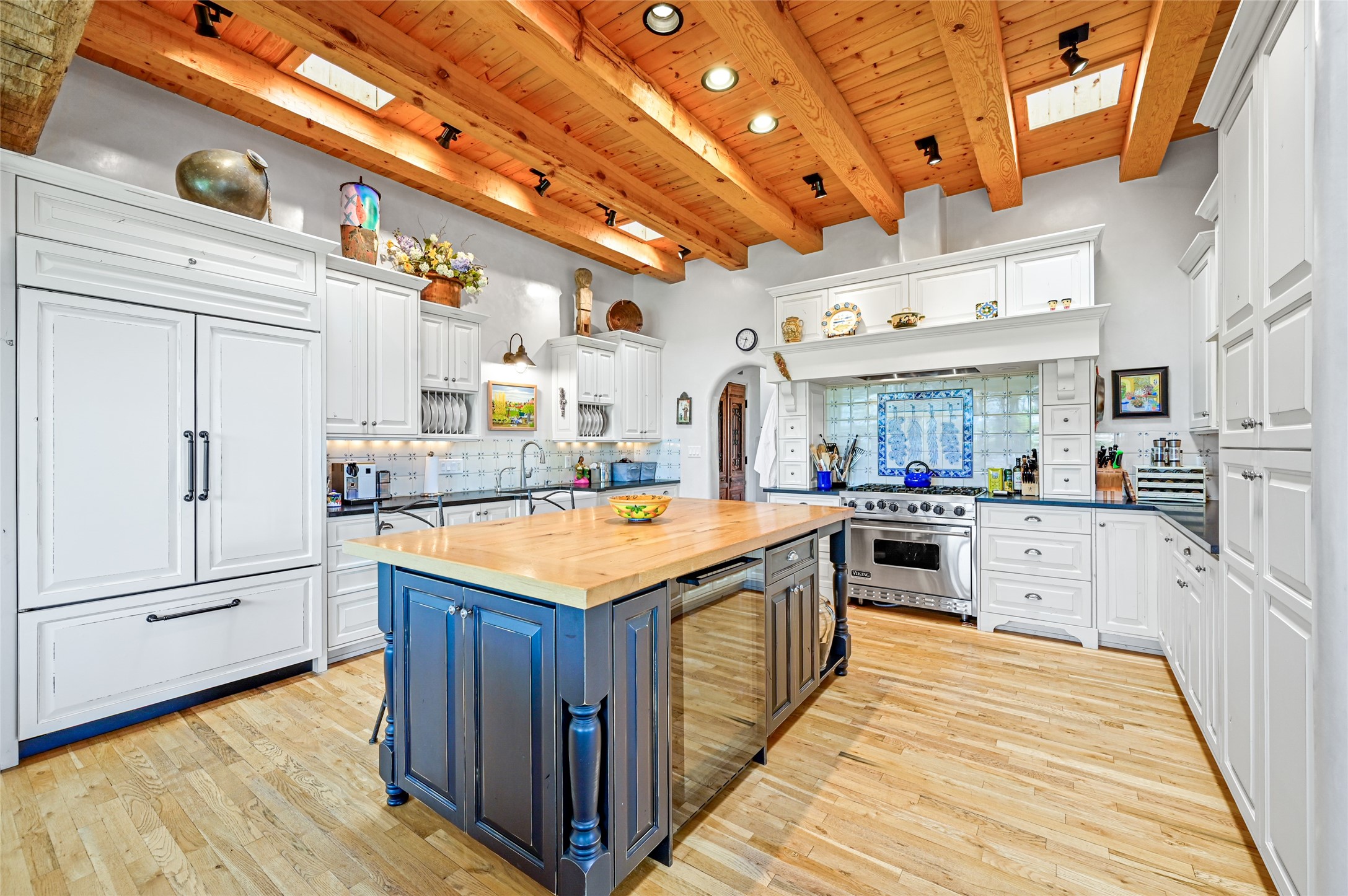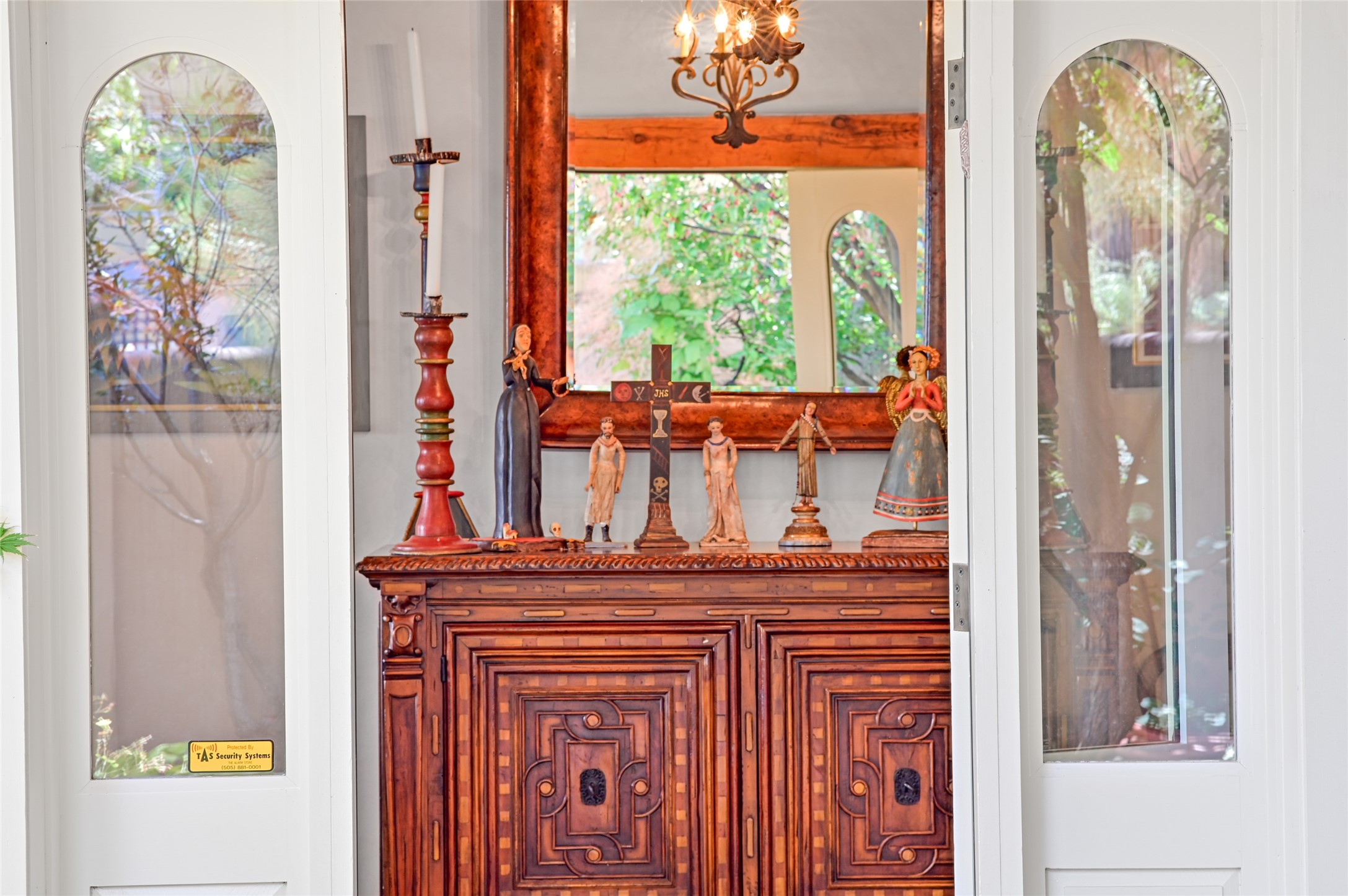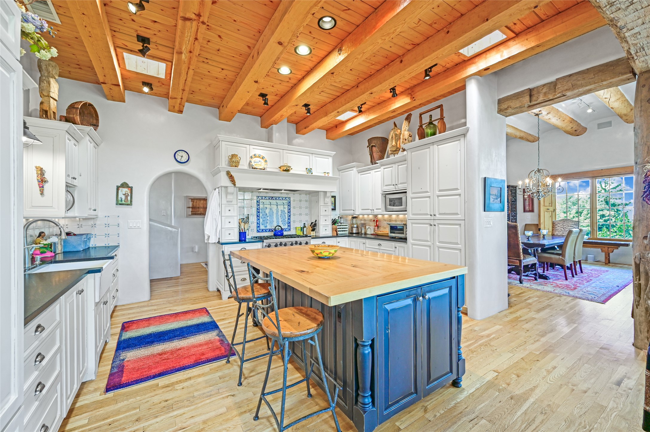 Amazing Eastside, mostly adobe home on a private brick lane. Well-known Builder Jay Park construction.Beautifully designed with all wood flooring, tall beamed ceilings, and a fabulous kitchen space. Sangre De Christo mountain views from the landscaped back patio/garden area. Central heat and air, and a workout room. 3 bedrooms, 3 baths with a direct-access 2-car garage. 2nd home that has been immaculately maintained. Some interior steps. Sangre views off the back patio.