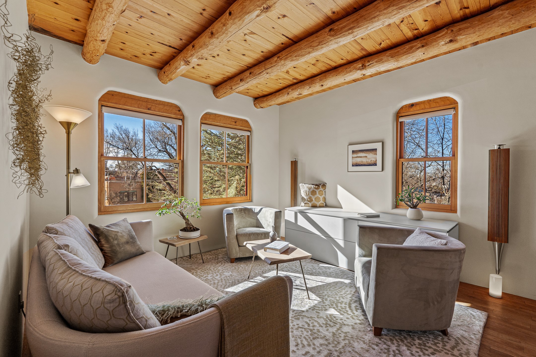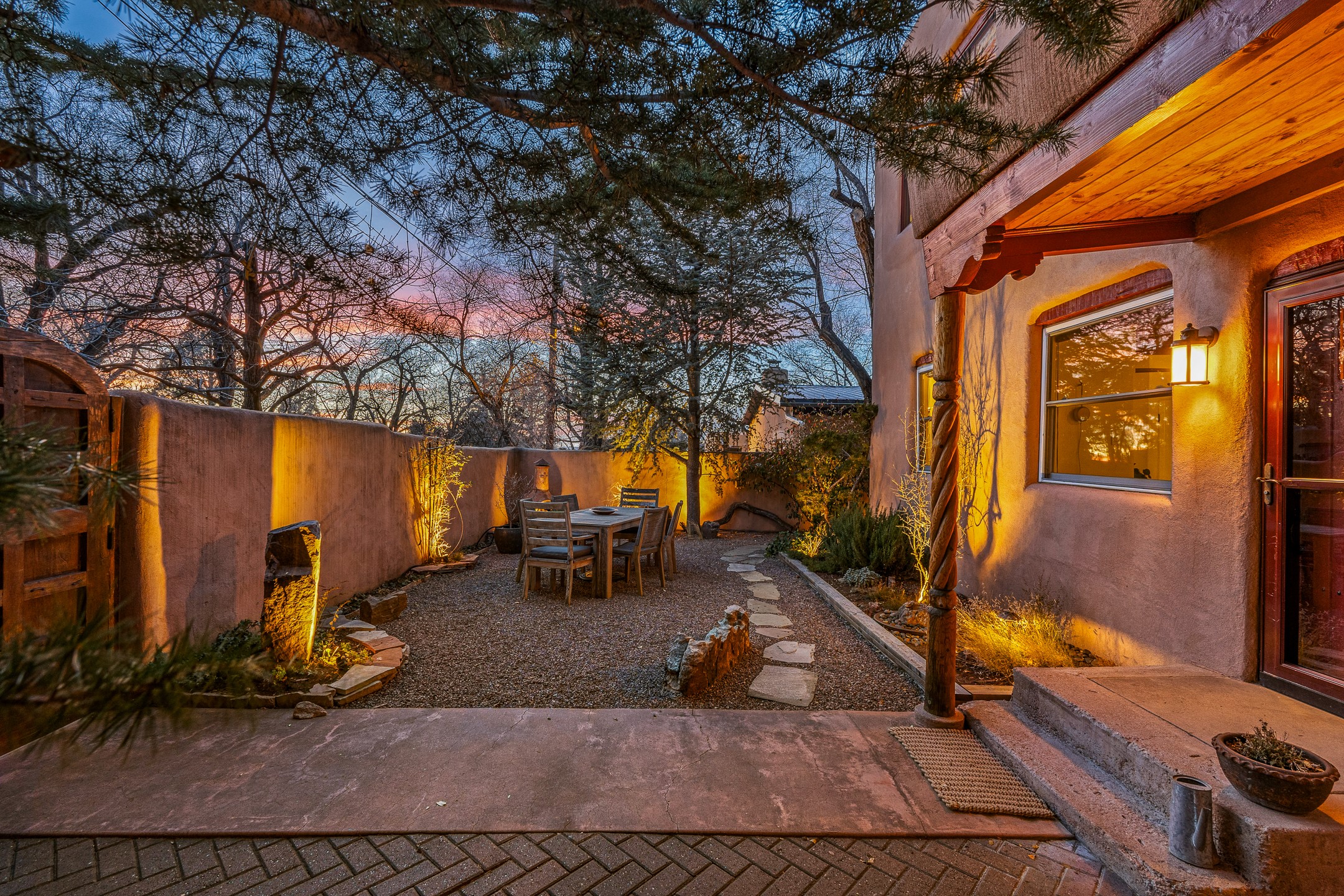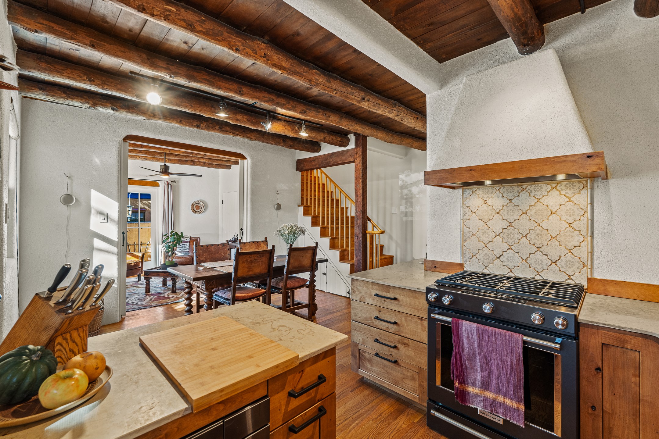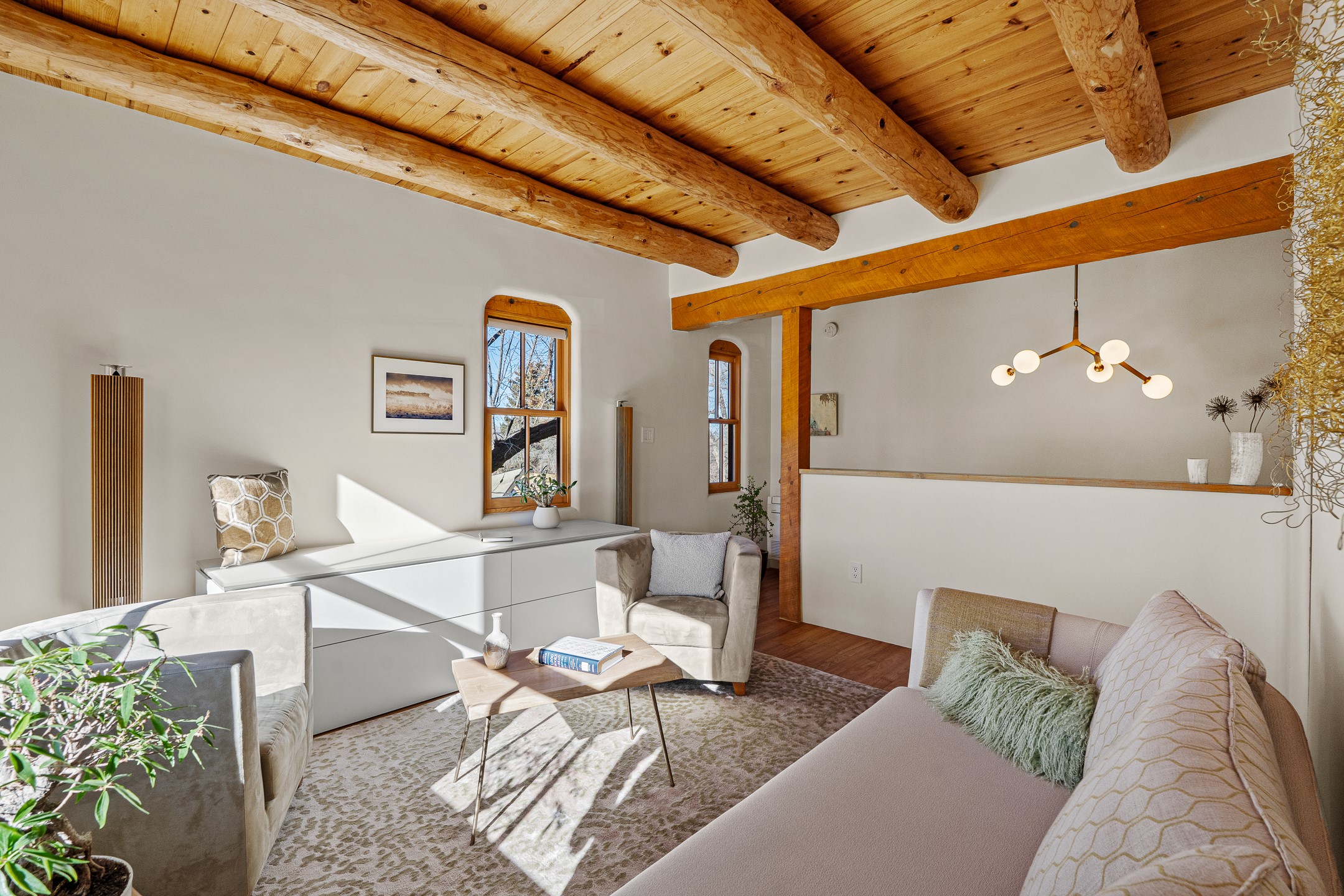 Tucked away on a quiet street in South Capitol, this charming 2-bedroom, 2-bathroom condo has been thoughtfully transformed by Santa Fe Kitchen Design. Every detail of the home reflects quality and craftsmanship with high-end finishes and an integrated design that maximizes style as well as space. The ground level includes the designer kitchen, dining area, a bath with laundry, and a flexible guest bedroom with a walk-in closet which is currently used as an office/sitting room--easily closed off with sliding barn doors. Beautiful hardwood floors run throughout and comfort is ensured year-round with mini-split heating and cooling. Upstairs, the sunny living room offers a warm and inviting retreat, perfect for relaxing or entertaining. The primary suite features a stylish built-in desk, a custom walk-in closet, and a beautifully renovated (2025) bathroom complete with a wall-mounted vanity, an onyx vessel sink, Toto wall-mounted toilet, floor-to-ceiling tiled walk-in shower, and radiant heat flooring. Solar panels, installed in 2023 and backed by a 20-year warranty, enhance energy efficiency and sustainability, while a curbside EV outlet is pre-wired for convenient electric vehicle charging. Located just minutes from downtown Santa Fe, this home is a rare opportunity to own a turnkey, design-forward residence in one of the city's most beloved neighborhoods.