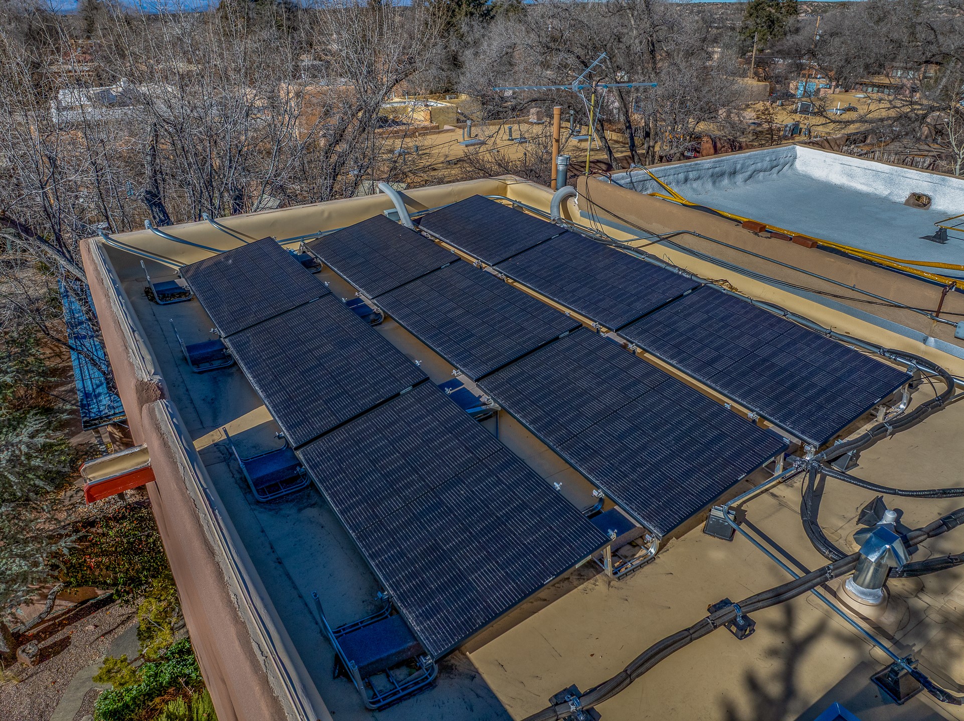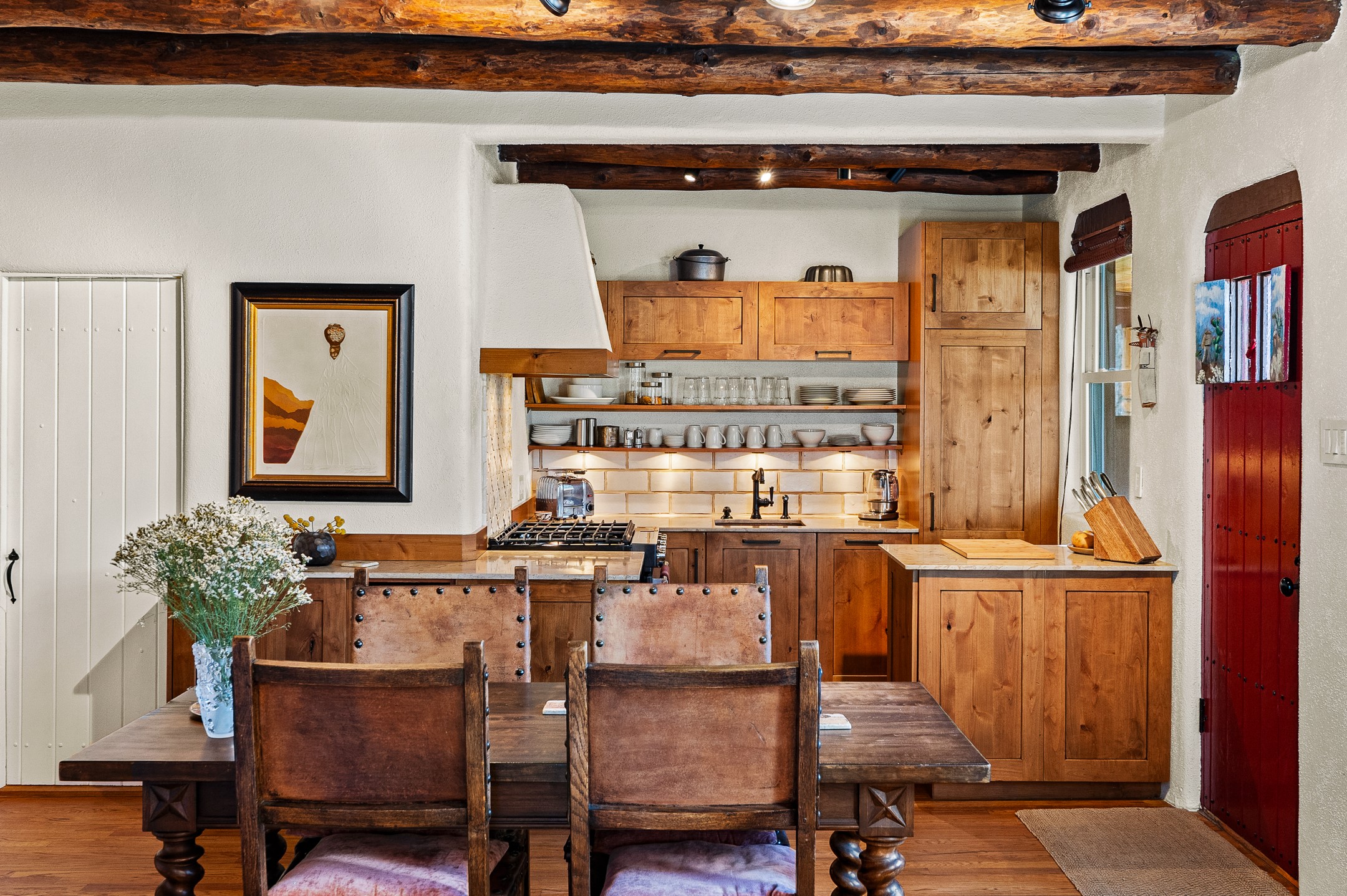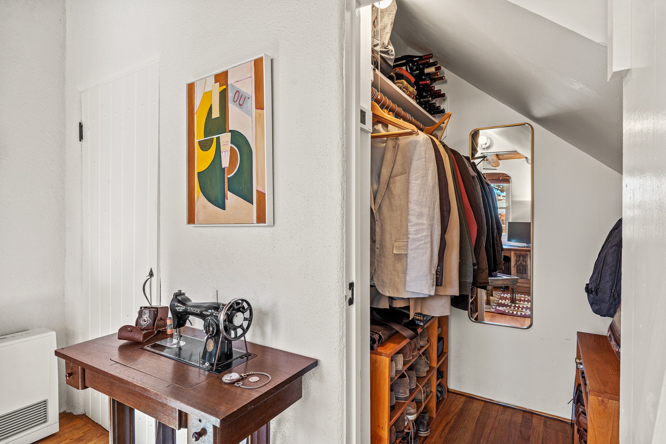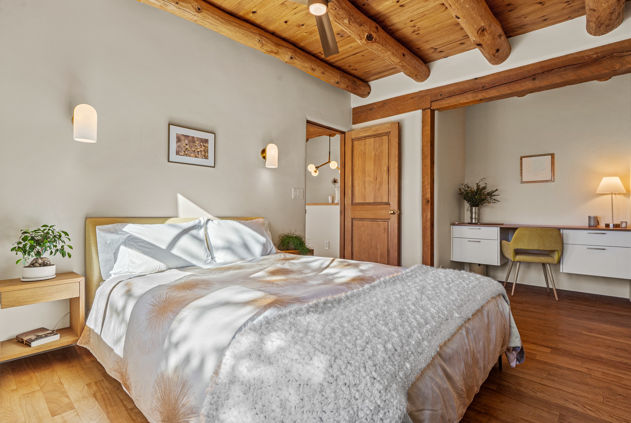 Tucked away on a quiet street in South Capitol, this charming 2-bedroom, 2-bathroom condo has been thoughtfully transformed by Santa Fe Kitchen Design. Every detail of the home reflects quality and craftsmanship with high-end finishes and an integrated design that maximizes style as well as space. The ground level includes the designer kitchen, dining area, a bath with laundry, and a flexible guest bedroom with a walk-in closet which is currently used as an office/sitting room--easily closed off with sliding barn doors. Beautiful hardwood floors run throughout and comfort is ensured year-round with mini-split heating and cooling. Upstairs, the sunny living room offers a warm and inviting retreat, perfect for relaxing or entertaining. The primary suite features a stylish built-in desk, a custom walk-in closet, and a beautifully renovated (2025) bathroom complete with a wall-mounted vanity, an onyx vessel sink, Toto wall-mounted toilet, floor-to-ceiling tiled walk-in shower, and radiant heat flooring. Solar panels, installed in 2023 and backed by a 20-year warranty, enhance energy efficiency and sustainability, while a curbside EV outlet is pre-wired for convenient electric vehicle charging. Located just minutes from downtown Santa Fe, this home is a rare opportunity to own a turnkey, design-forward residence in one of the city's most beloved neighborhoods.
