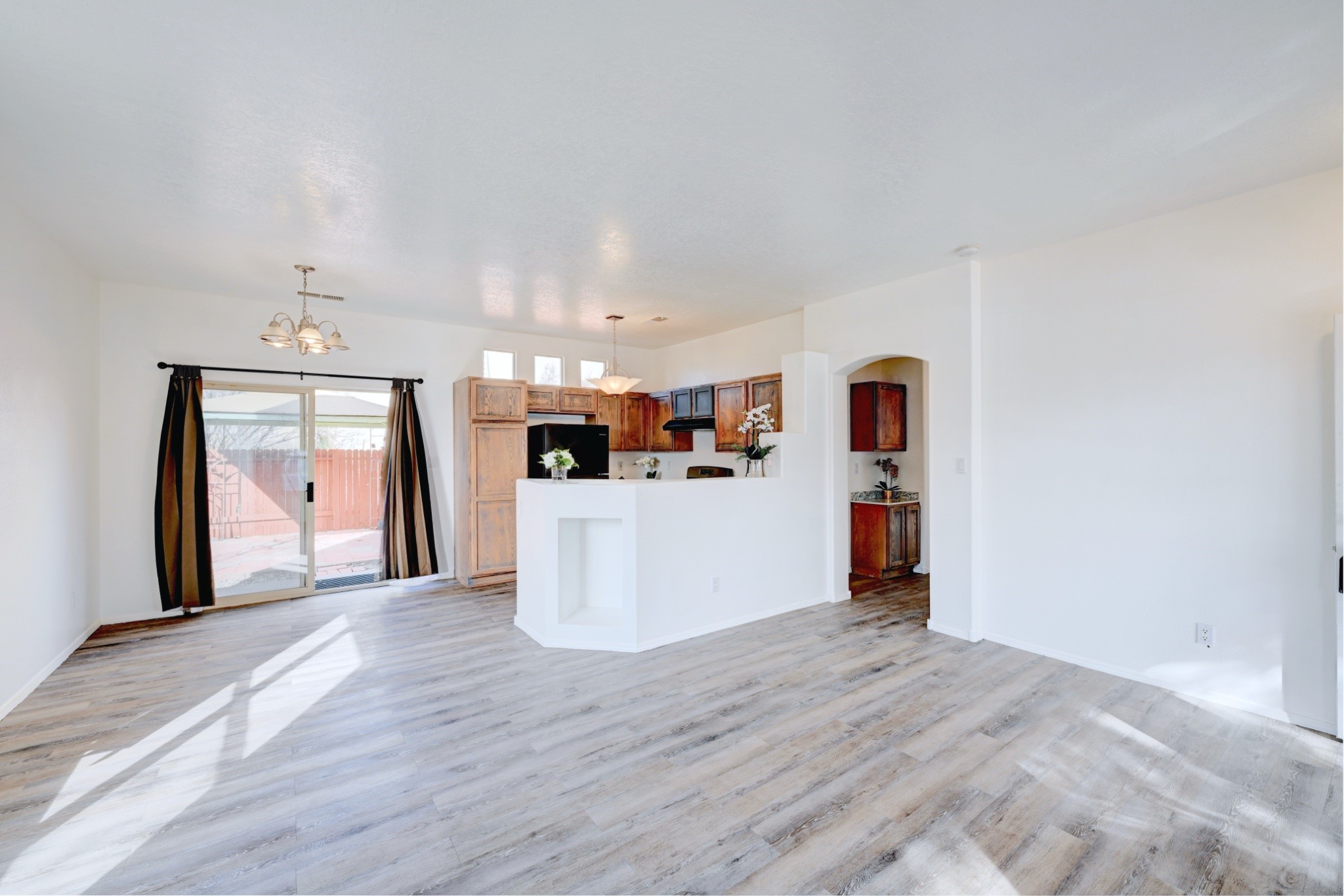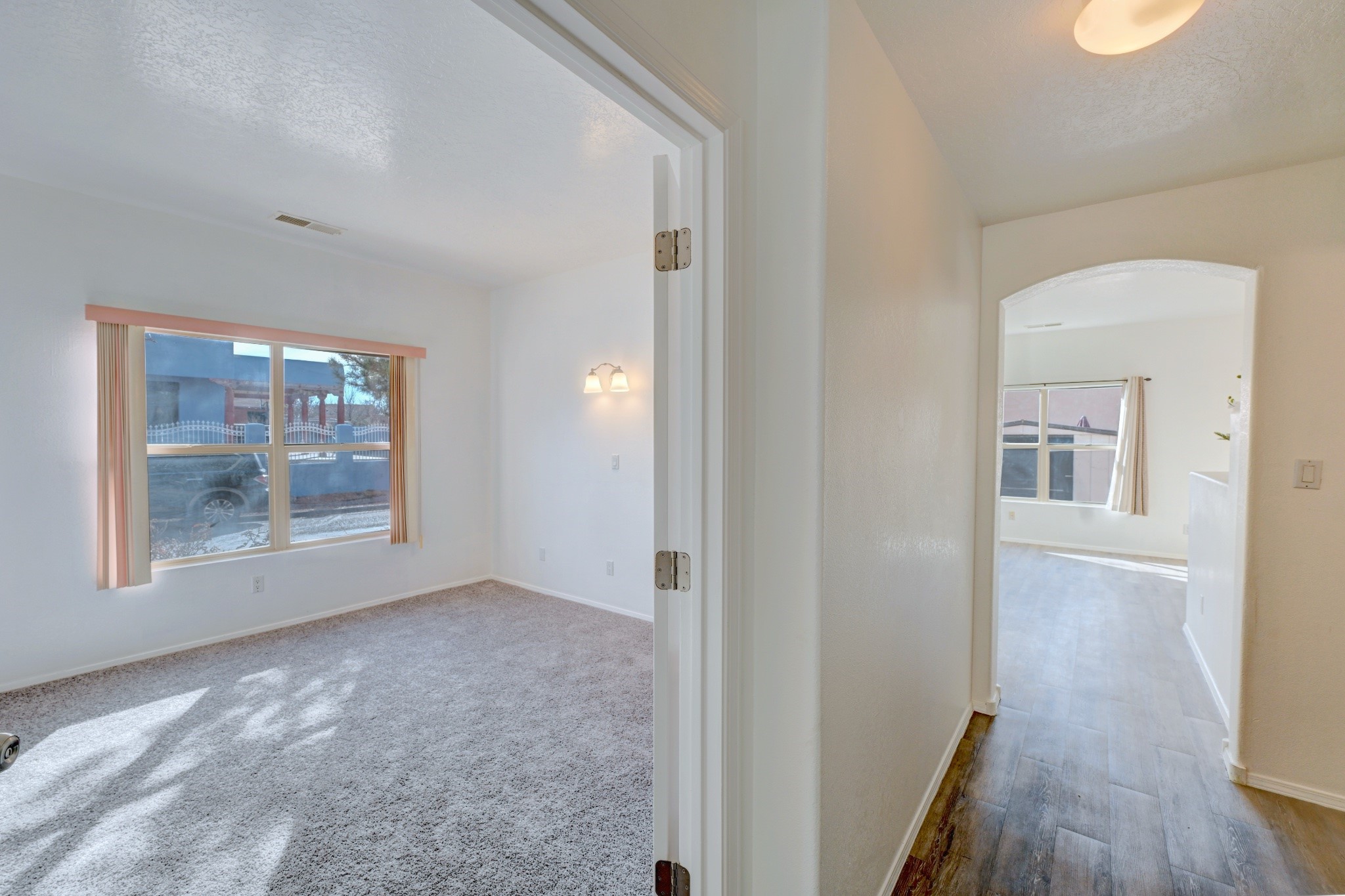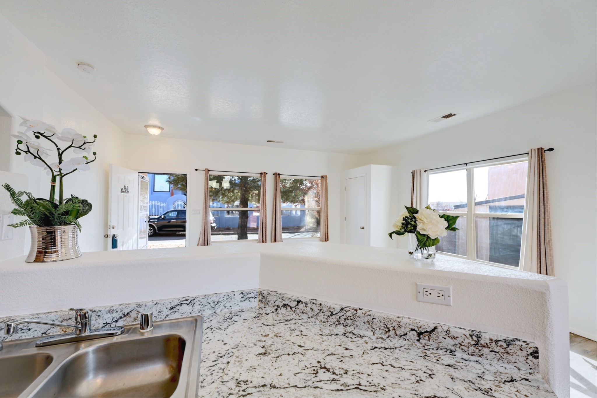 Welcome to this thoughtfully updated two-bedroom, two-bathroom home nestled on a desirable corner lot in Santa Fe's welcoming neighborhood. This single-level residence offers comfortable living with 946 square feet of well-designed space, perfect for those seeking a single level home with comfortable open floor plan. The heart of this home features a completely refreshed kitchen equipped with new appliances including a range, dishwasher, and refrigerator, complemented by new countertops. Throughout the home, you'll discover fresh interior paint, updated flooring, and modern light fixtures that create a bright atmosphere. Both bathrooms have been enhanced with new sinks and fixtures, while the recent installation of a new water heater and door hardware demonstrates the attention to detail invested in this property. The thoughtful updates extend beyond aesthetics to ensure long-term comfort and functionality. Outside, the fenced backyard provides privacy, while the spacious layout offers plenty of room for gardening or simply enjoying New Mexico's beautiful weather. The covered patio creates an ideal outdoor living space and the convenient shed provides storage. A one-car garage adds practical appeal for vehicle protection and additional storage. The location offers excellent convenience with Rancho del Sol park just steps away, providing recreational opportunities and green space. Best of all, there are no homeowners association fees, giving you the freedom to enjoy your property as you choose. This move-in ready home combines modern updates with comfortable living in a prime location. Please see the 3-D Matterport in the listing!