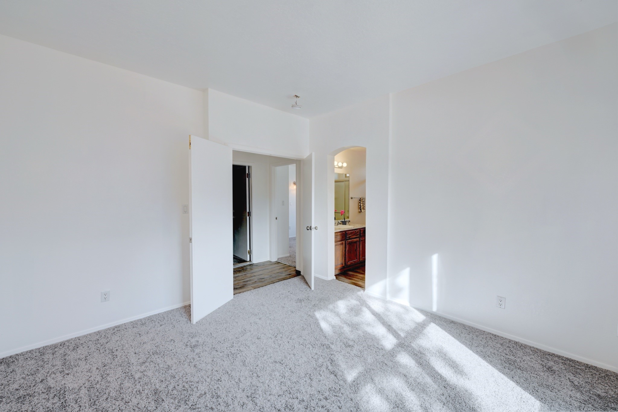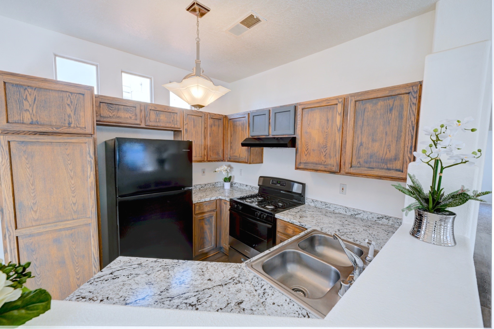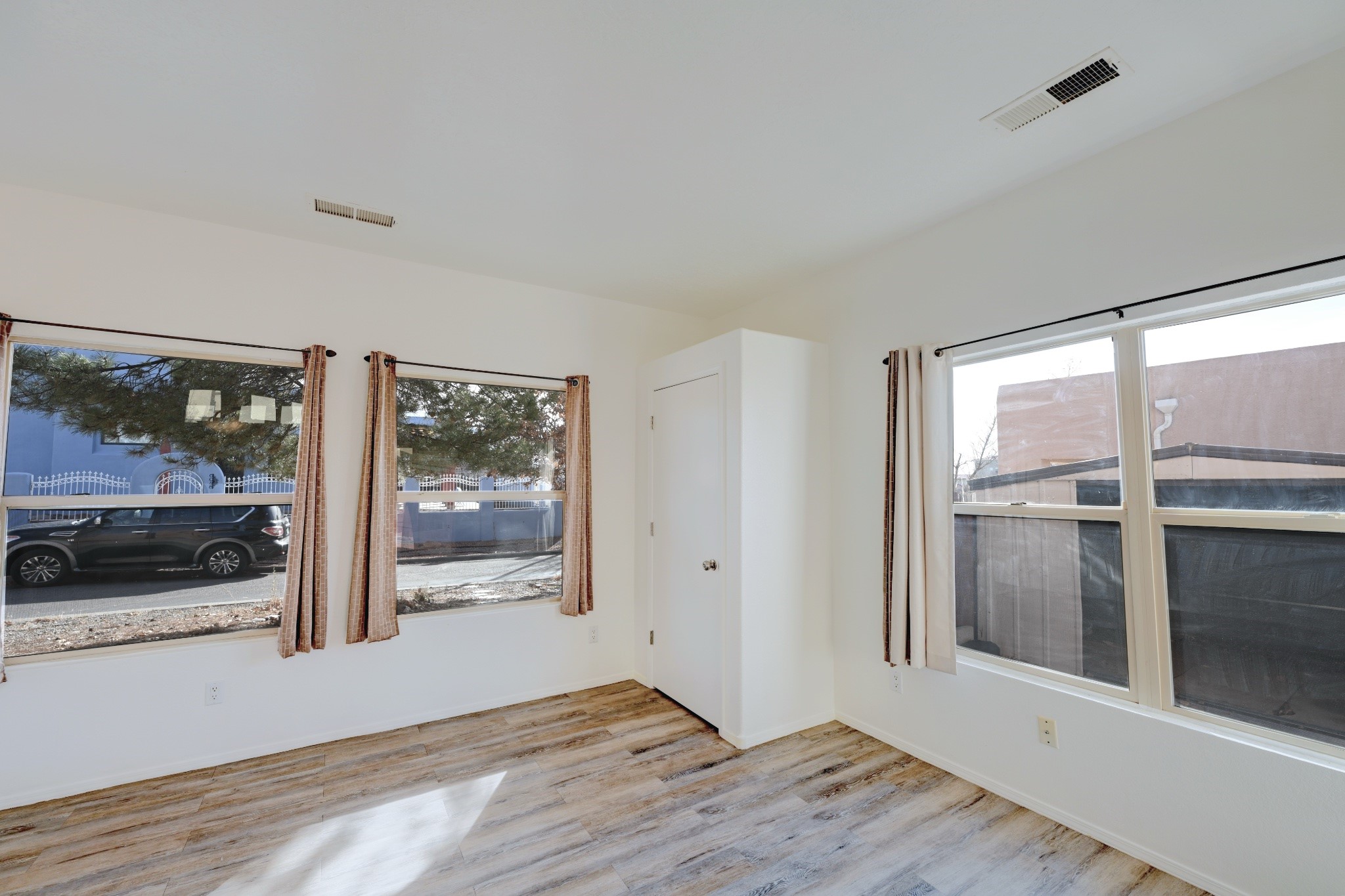 Welcome to this thoughtfully updated two-bedroom, two-bathroom home nestled on a desirable corner lot in Santa Fe's welcoming neighborhood. This single-level residence offers comfortable living with 946 square feet of well-designed space, perfect for those seeking a single level home with comfortable open floor plan. The heart of this home features a completely refreshed kitchen equipped with new appliances including a range, dishwasher, and refrigerator, complemented by new countertops. Throughout the home, you'll discover fresh interior paint, updated flooring, and modern light fixtures that create a bright atmosphere. Both bathrooms have been enhanced with new sinks and fixtures, while the recent installation of a new water heater and door hardware demonstrates the attention to detail invested in this property. The thoughtful updates extend beyond aesthetics to ensure long-term comfort and functionality. Outside, the fenced backyard provides privacy, while the spacious layout offers plenty of room for gardening or simply enjoying New Mexico's beautiful weather. The covered patio creates an ideal outdoor living space and the convenient shed provides storage. A one-car garage adds practical appeal for vehicle protection and additional storage. The location offers excellent convenience with Rancho del Sol park just steps away, providing recreational opportunities and green space. Best of all, there are no homeowners association fees, giving you the freedom to enjoy your property as you choose. This move-in ready home combines modern updates with comfortable living in a prime location. Please see the 3-D Matterport in the listing!