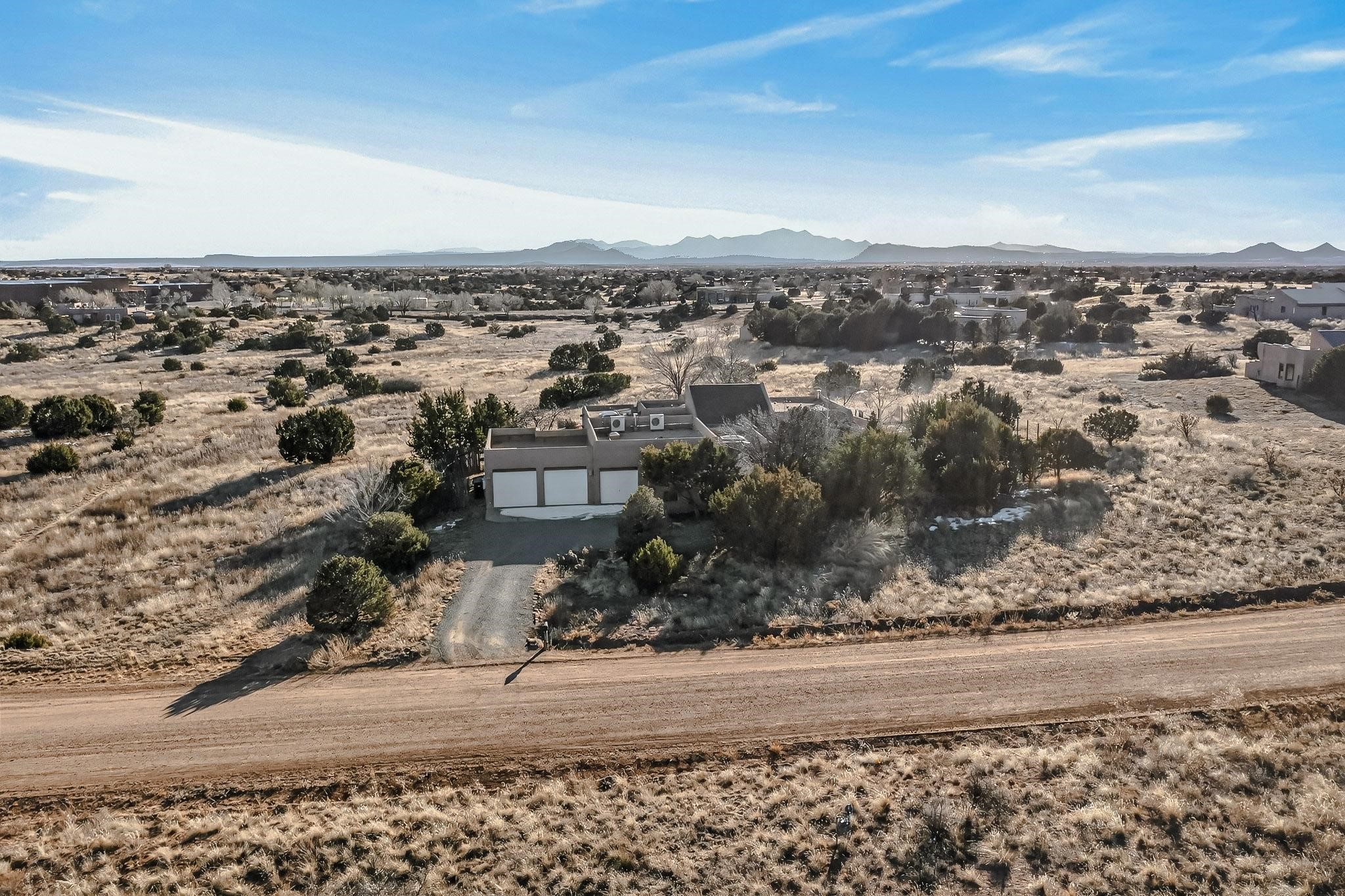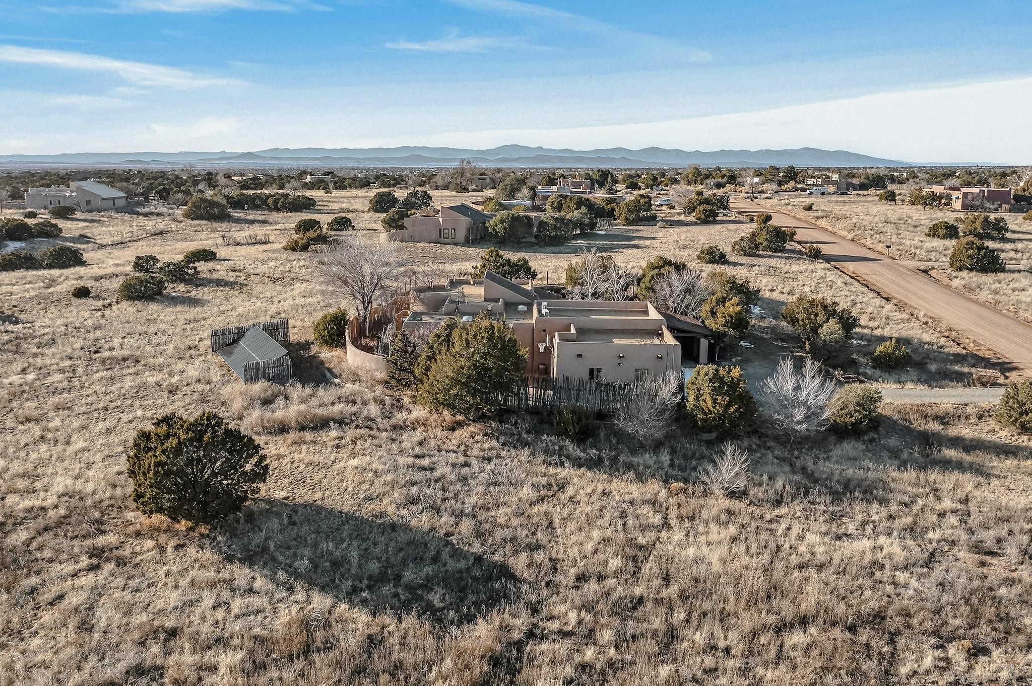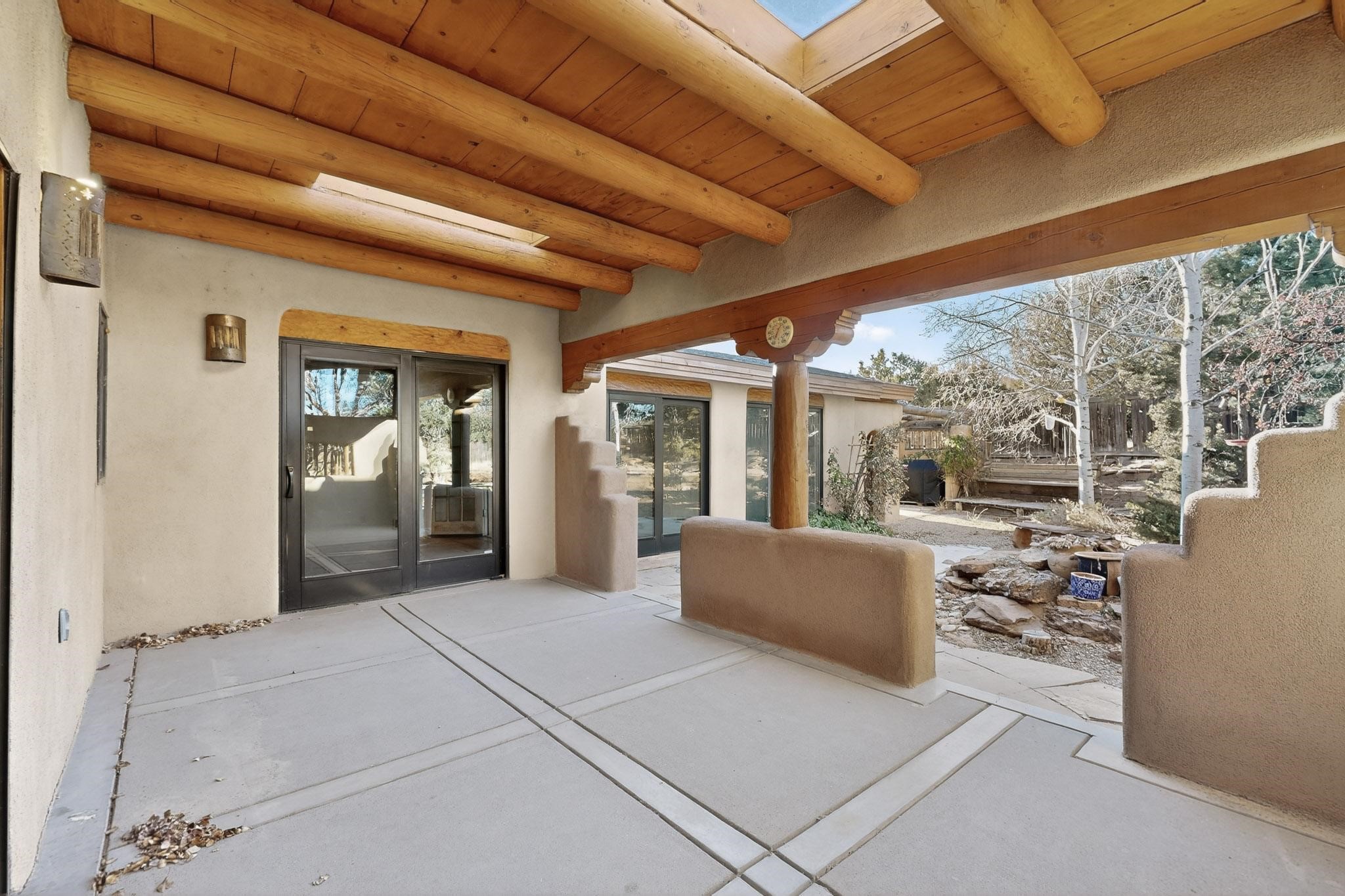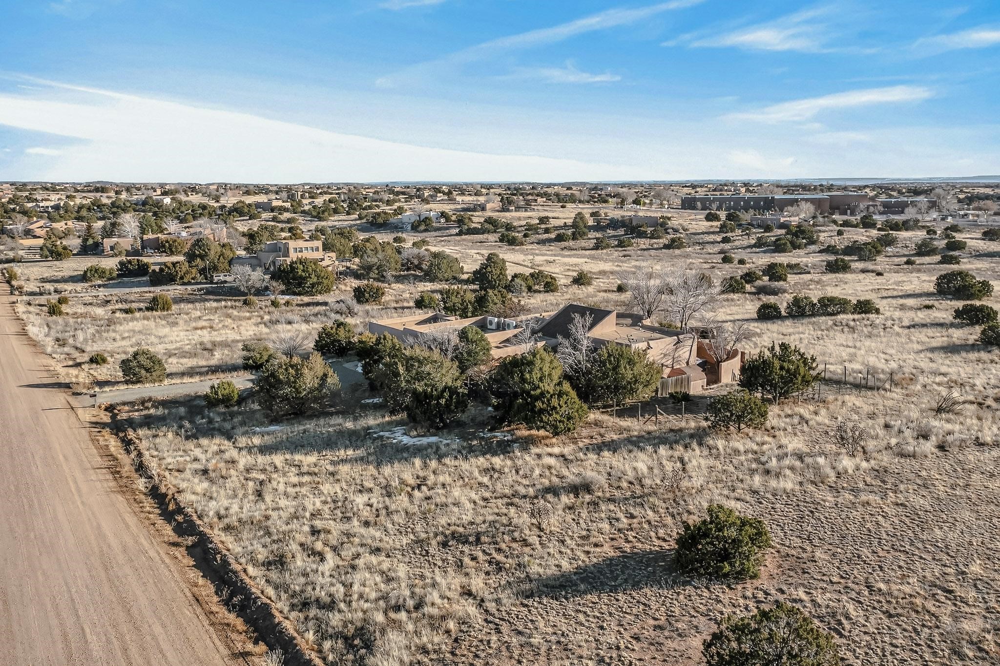 Custom designed and built for the first owner, this 4 bedroom 3 bath home is filled with eye catching hand carved details throughout. An excellent potential for multi family living with great separation of main bedroom and 2 guest wings. A sunny open plan concept with many extra rooms to expand your hobbies or private enjoyment areas. There is a new solar array, boiler, hot water heater and new above ground hot tub installed 2022/2023. New stucco, partial new roof and the 6 mini splits serviced in 2025. An oversized 2 car garage plus a studio bay with garage doors at both ends for easy access and plenty of guest parking. Two walled in private gardens for outside enjoyment accessed from north and south sides of the home. Ideally located bordering a large greenbelt, close to the community centre, hike bike trails, K-8 school, library, senior centre, 2 shopping plazas and only minutes into Santa Fe.