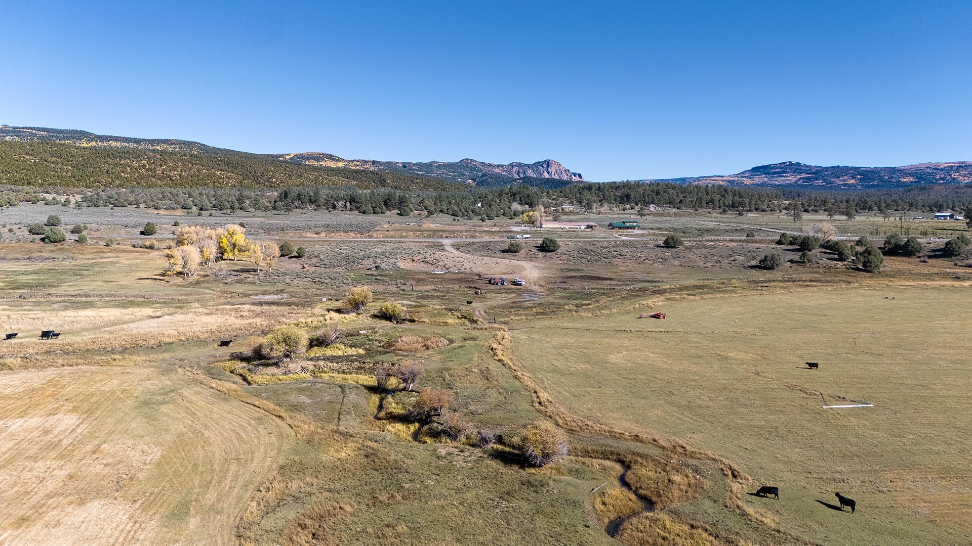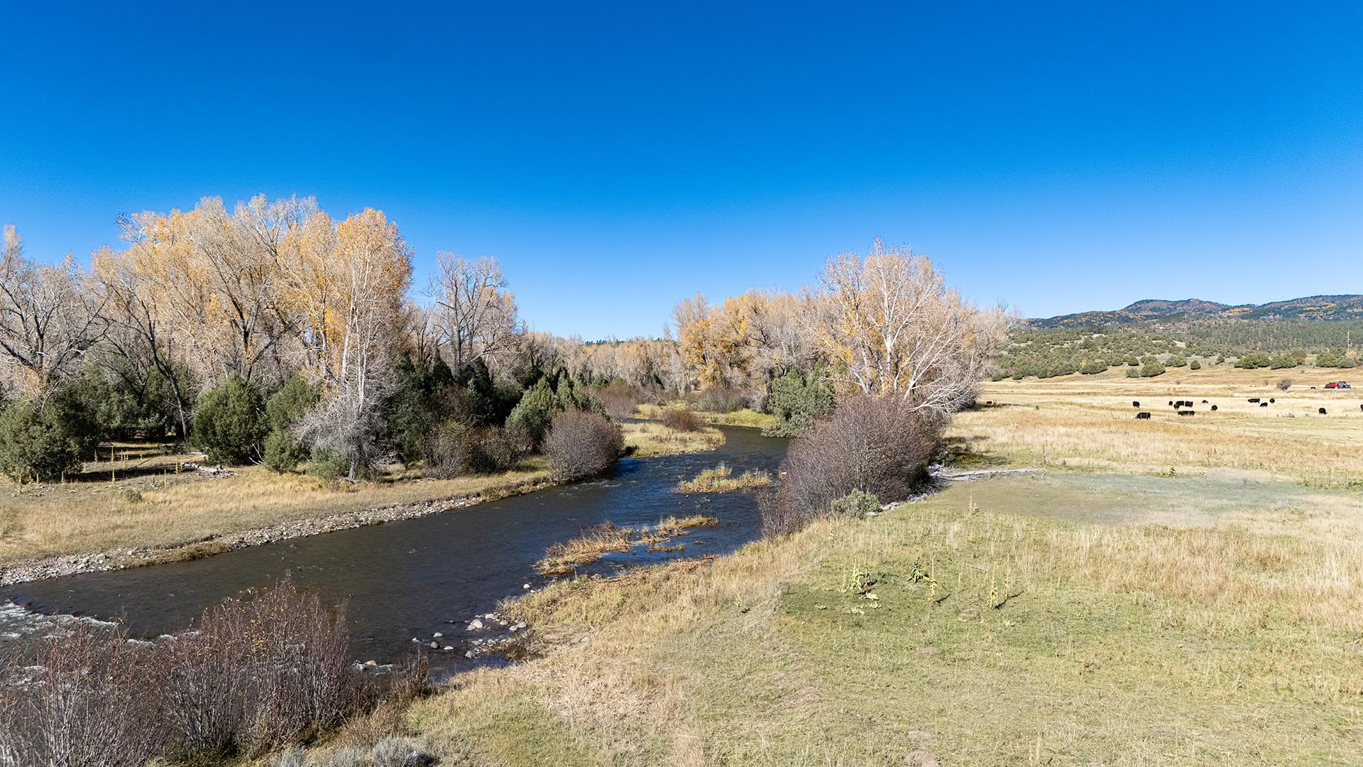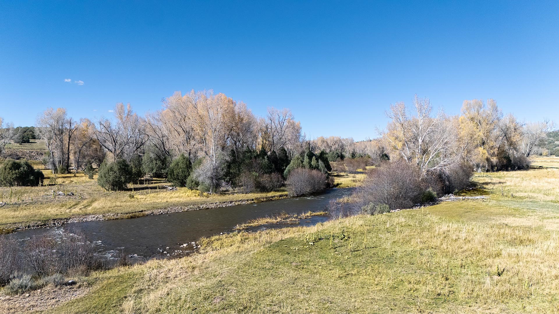El Barranco Ranch on the Chama River consists of 440 gorgeous acres, blessed with 1.5 miles of both sides of the Chama River in Northern New Mexico. The El Barranco trio of fly fishing, agriculture, and big game hunting is difficult to match on one property. The ranch offers excellent fly fishing on the trout-rich Chama River, which winds through a beautiful setting of cottonwoods. Fly fishing is a prominent feature, but the opportunity to hunt elk or mule deer cannot be overlooked. The ranch borders the vast, undeveloped acreage of the Jicarilla Apache Nation, as well as the renowned elk and mule deer habitat that exists on those lands. Elk and mule deer routinely visit El Barranco's hayfields and river bottom to feed and water. The ranch is eligible for and has received multiple hunting vouchers. It is not unusual at El Barranco in the early fall to hunt elk or mule deer in the morning, fish for large brown and rainbow trout in the middle of the day, and then enjoy another evening hunt. There is more value than just the first-class recreational aspects of the ranch. Substantial senior water rights lead to great hay production and cattle grazing, which has been the primary focus of the current owners. Farm work can be done hands-on or by retaining existing hay and grazing leases. At a time when live water fishing properties and senior water rights are hard to find, a rare recreational and agricultural opportunity awaits the buyer of this gold medal property. Buyers seeking additional acreage should consider the 270 acre El Barranco East property, located across the highway.
