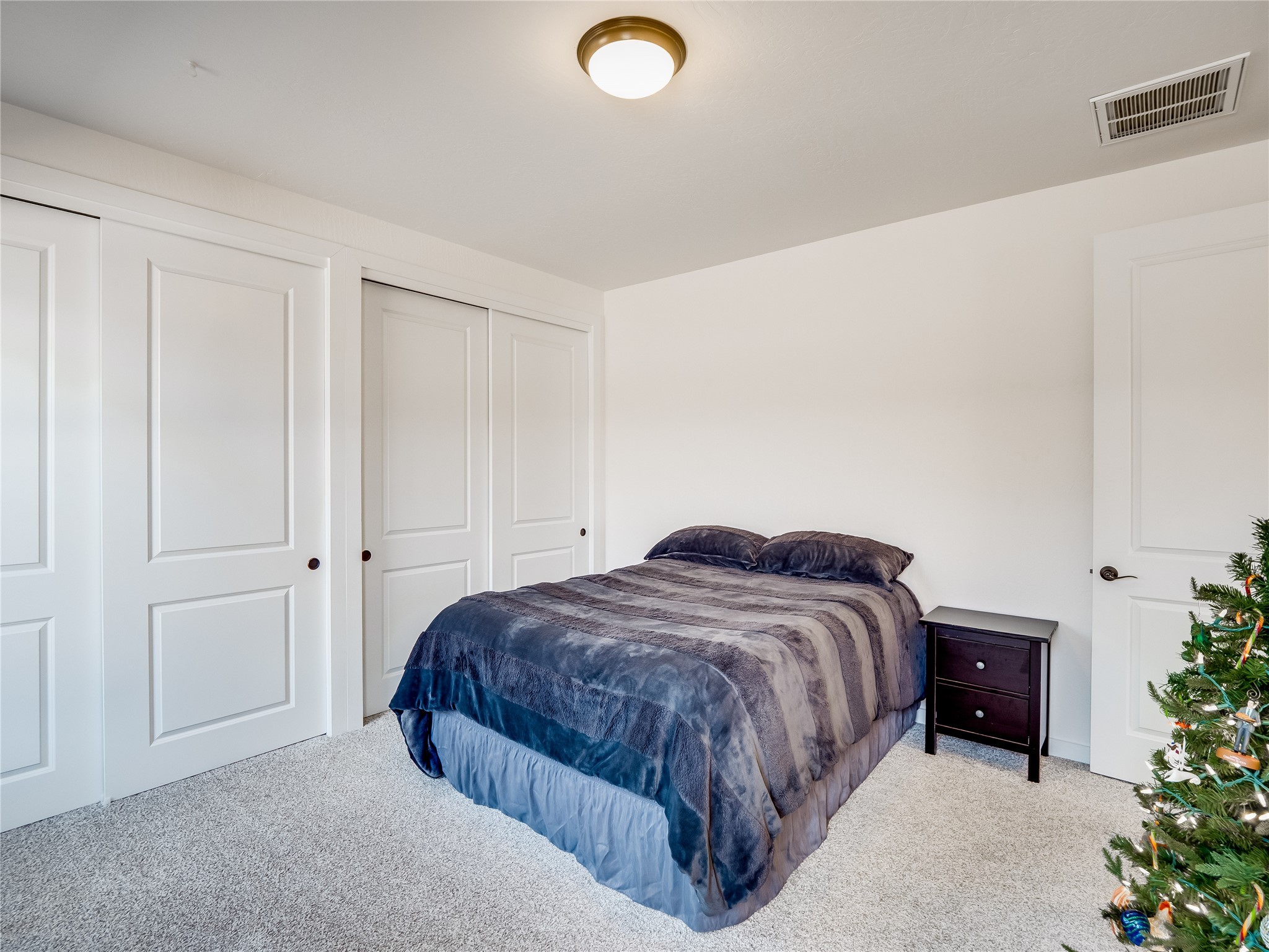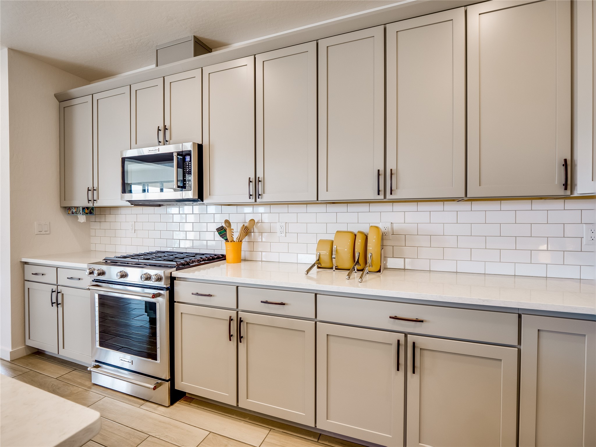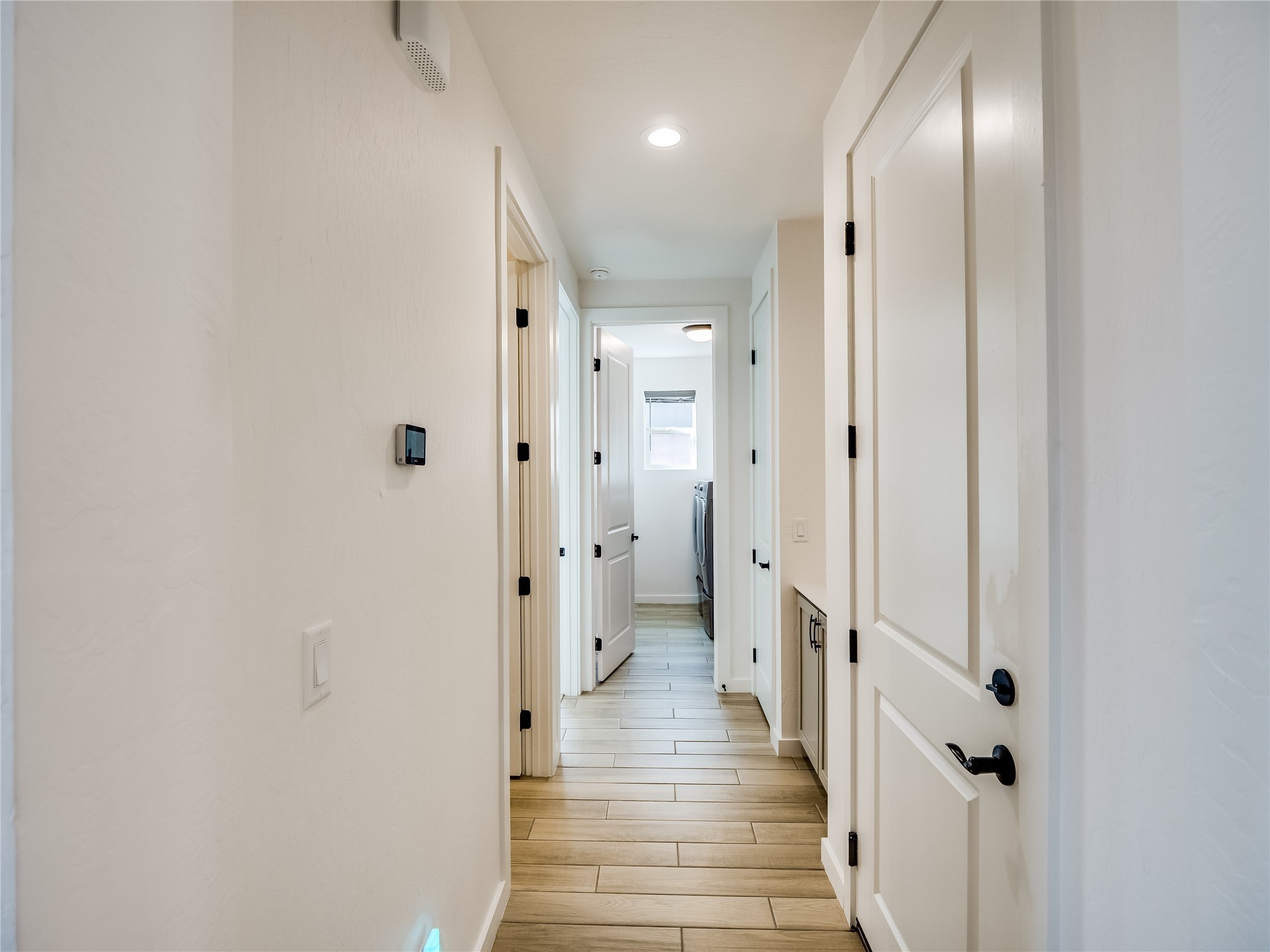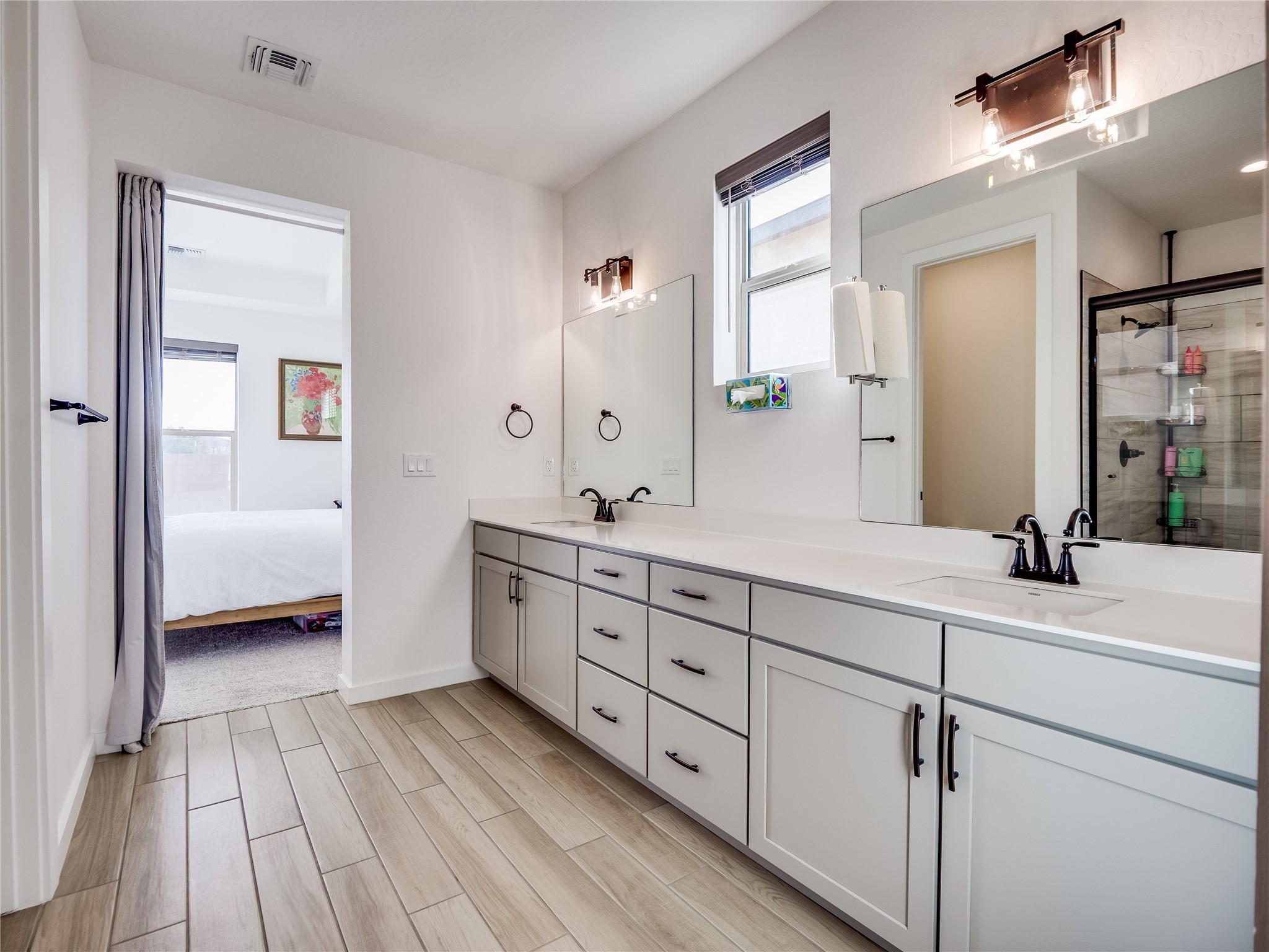 Gorgeous single level modern home blends clean design, natural light, and effortless livability in the desirable White Rock community. A low maintenance front yard invites you to a covered porch, creating welcoming curb appeal without the burden of upkeep. Step inside to a long, skylit foyer with durable tile flooring that flows through the main living areas. Natural light leads you into a bright, great room layout. The spacious living room easily accommodates a large sectional, perfect for movie nights and everyday comfort. Centered is a gas fireplace with decorative tile surround, framed by built-in cabinets for style and storage. The adjacent kitchen offers modern sophistication with warm, cohesive finishes. A large center island provides seating and workspace, highlighted by gold pendant lighting. Taupe cabinets with bronze hardware pair beautifully with a white tile backsplash, quartz counters, and stainless steel appliances. A sizable pantry enhances organization and convenience. The dining area features sliding doors that open to a covered patio and a fully fenced backyard designed for low-maintenance enjoyment. Complete with turf, trees, and mountain views, the space offers room for creativity, ideal for, planters, or personal design. Near the entry, two guest bedrooms with carpet share a Jack-and-Jill full bathroom for a smart, efficient layout. A secondary hallway hosts an additional guest bedroom and bathroom with single sink vanity and tiled walk-in shower with glass enclosure. This hall also includes a laundry room with sink and direct access to the two-car garage for added practicality. Tucked toward the back, the primary suite serves as a peaceful retreat with carpet flooring, expansive windows, and mountain views. The spa like ensuite features tile flooring, double-sink vanity, and a walk-in tiled shower with built-in bench. A custom-organized walk-in closet maximizes storage. Move-in ready and waiting for you to schedule your tour today!