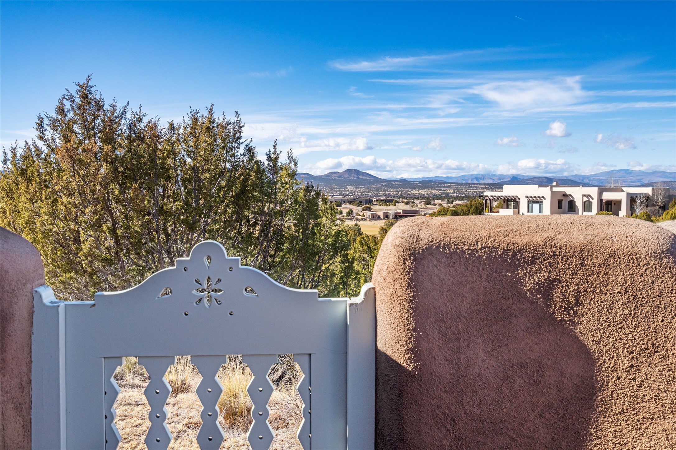 DESIGNED BY THE AWARD-WINNING ARCHITECTURAL FIRM OF CURTIS & WINDHAM ARCHITECTS, THIS SUPERB LAS CAMPANAS RESIDENCE ENJOYS THE TIMELESS HALLMARKS OF A TRADITIONAL FIRST-CLASS CUSTOM BUILD WITH EXQUISITELY LANDSCAPED GARDENS AND A WINDING PATH TO THE GUEST CASITA. Approach the home through tall natural grasses and glimpse the unique design element of wooden shutters on the windows, giving the home a European feel. Warm, rich woods throughout - most notably hand-crafted coffered ceilings, beautiful custom doors, and wooden floors as well as hand crafted tiles added by the current owners make for a sumptuous yet relaxed living space. The living room is expansive with tall windows, flanked by a handsome wall of built-in showcases, also added by the present owners, making several seating areas possible. The chef's kitchen offers a large island, top-of-the-line appliances and amenities plus a true walk-in pantry. While the property has sensational entertaining areas inside and out - the focus of this home is intimacy. High efficiency rastra type construction lends a solid, sturdy, quiet feel to the home and the enclosed rear garden is reminiscent of Provence - enjoy the sound of water from the fountain as you dine alfresco among a grove of Hawthorne trees. Rooftop deck. Excellent privacy on a large lot that spans two golf courses. Very special. Unique, one-of-a-kind property.