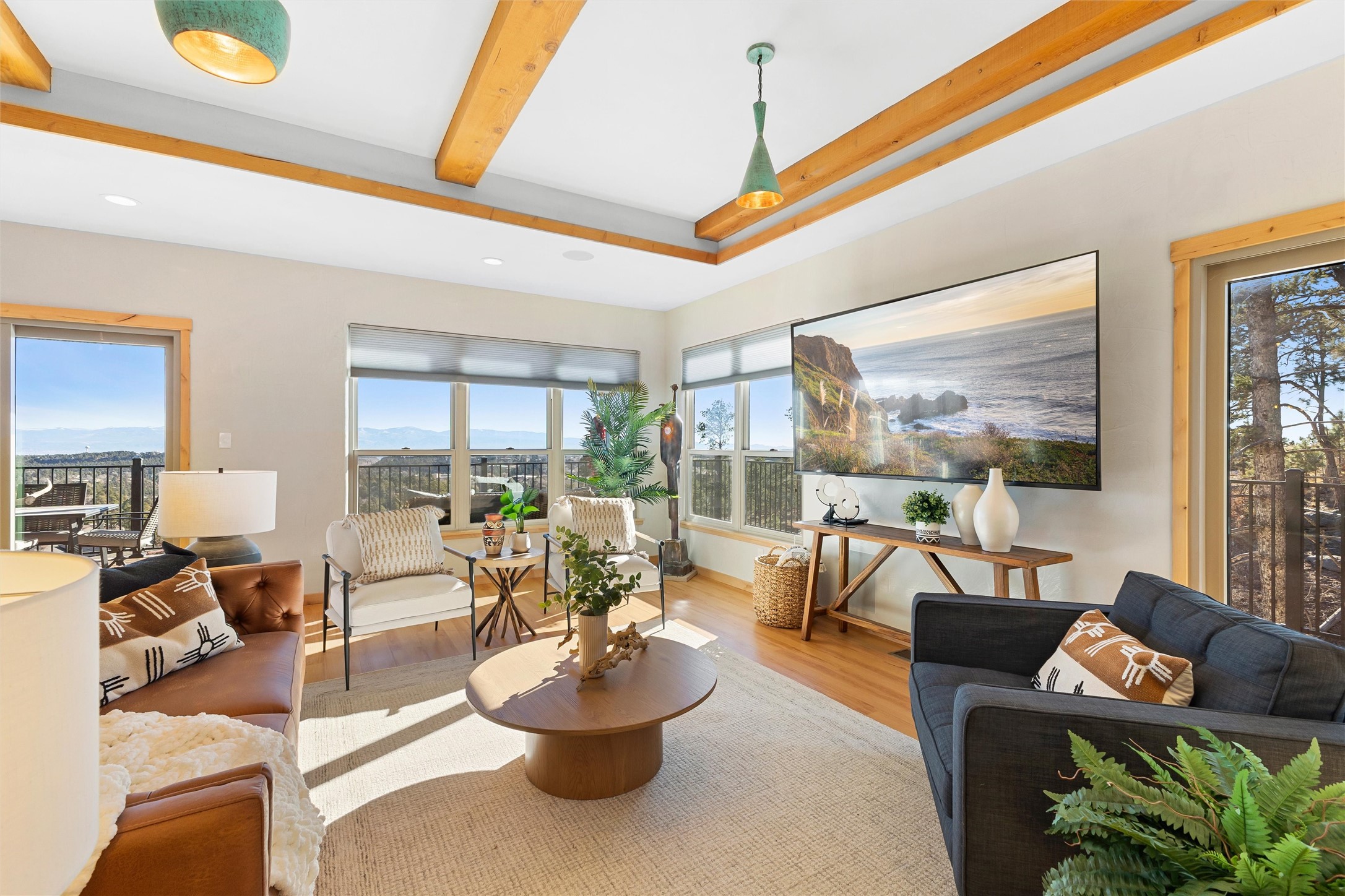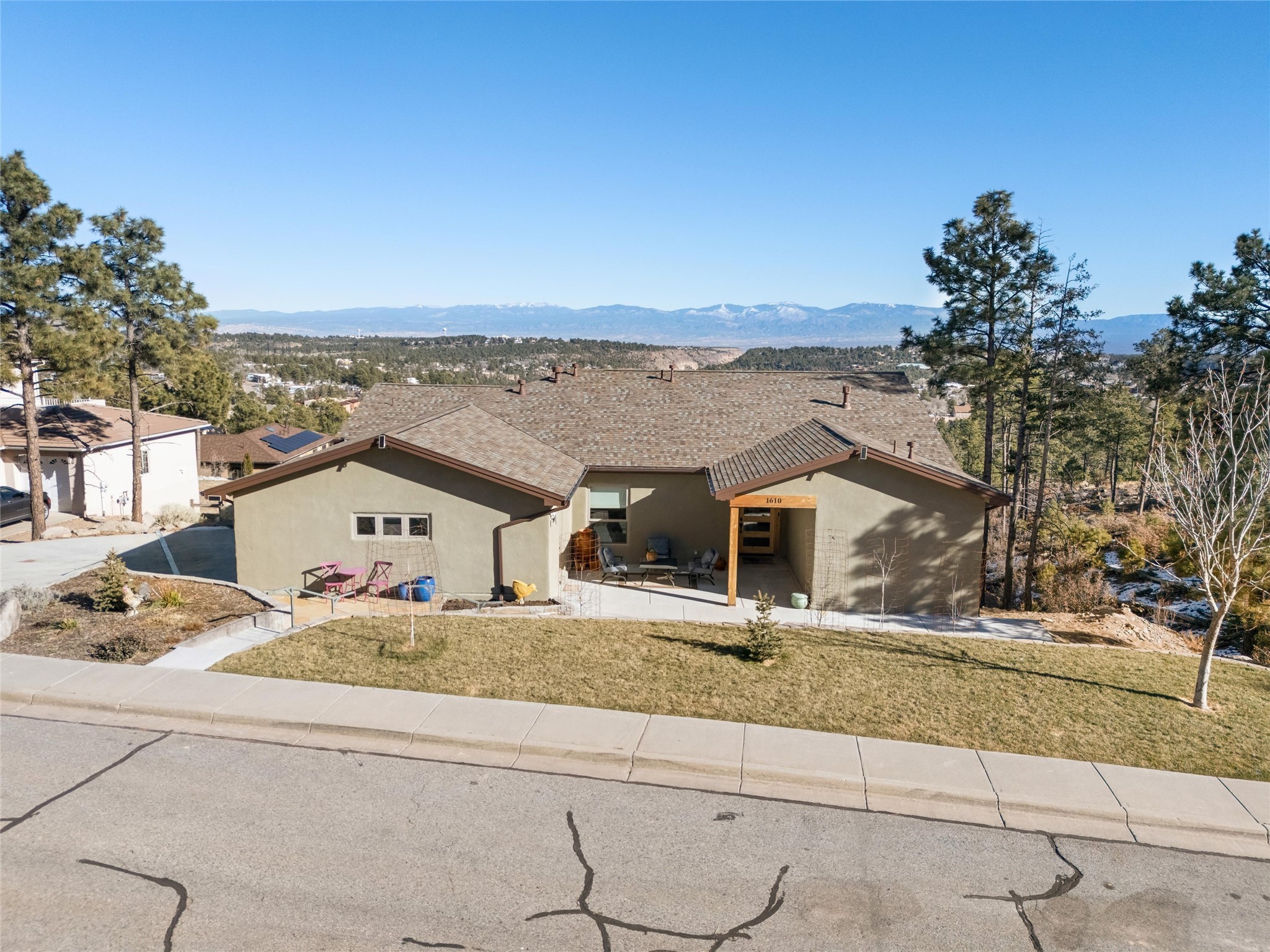 Tucked at the end of a quiet cul-de-sac in one of Los Alamos' most desirable neighborhoods, 1610 Solana is a truly rare offering. Set on over one acre (the largest lot in the neighborhood) and backing to National Forest and County land for unmatched privacy and a breathtaking natural backdrop. With arguably the best views in town, you'll enjoy sweeping vistas of the townsite, the Sangre de Cristo range, and more from multiple spaces throughout the home.Finished in 2022, this stunning residence offers over 3,500 square feet of modern, beautifully crafted living space and all of the contemporary amenities today's buyers expect. The primary suite is a showstopper with a private deck walkout, an enviable walk-in closet, and a spa-inspired ensuite highlighted by a copper soaking tub.Designed for comfortable main-floor living, the upper level includes two additional bedrooms, one with its own ensuite plus an additional full bath. Venetian plaster walls add softness and sophistication to the main living areas, while multiple gathering spaces provide room to relax or entertain with ease. Head outside to the wrap-around deck with a covered porch, the perfect place to take in the views in every season.The walkout basement expands your options with another spacious family room, a guest bedroom with attached bath, and a versatile bonus room ideal for an office or additional guest space, complete with a Murphy bed.An oversized two-car garage offers generous storage and flexible space for a home gym or workshop, and the large laundry room with attached mudroom just off the garage keeps daily life organized and effortless.New, modern, spacious, and surrounded by nature, 1610 Solana delivers the Los Alamos lifestyle at its finest.
