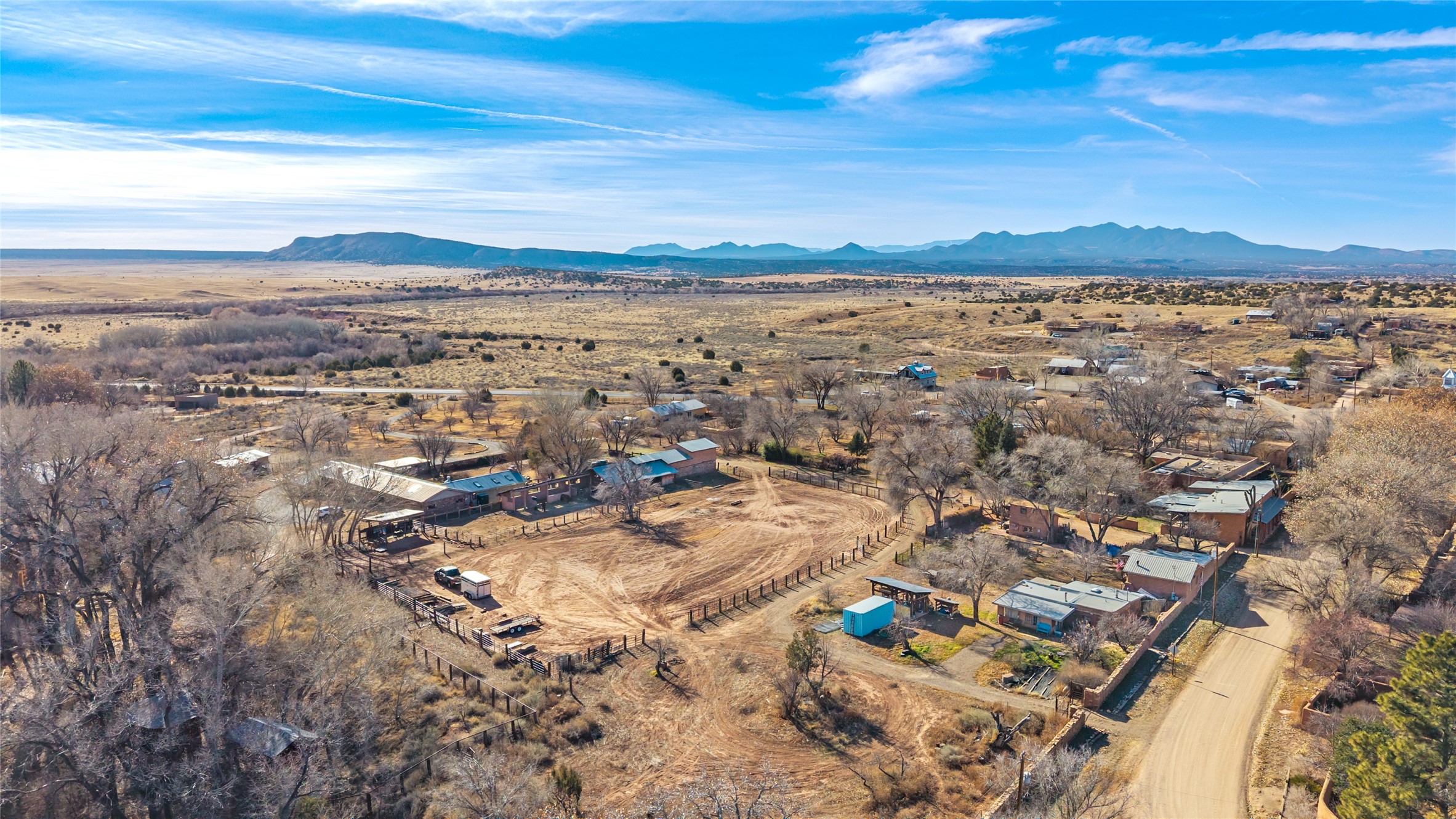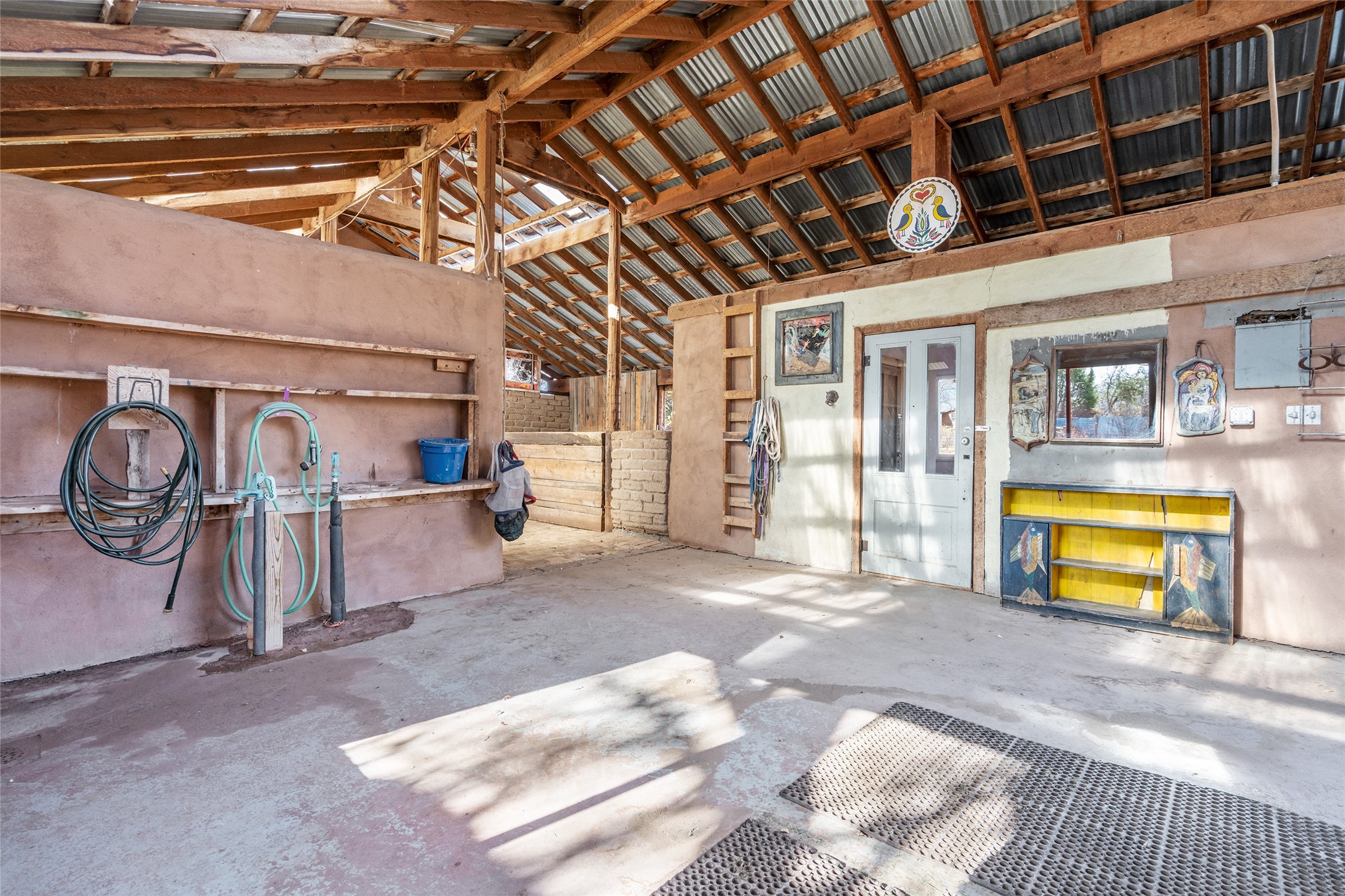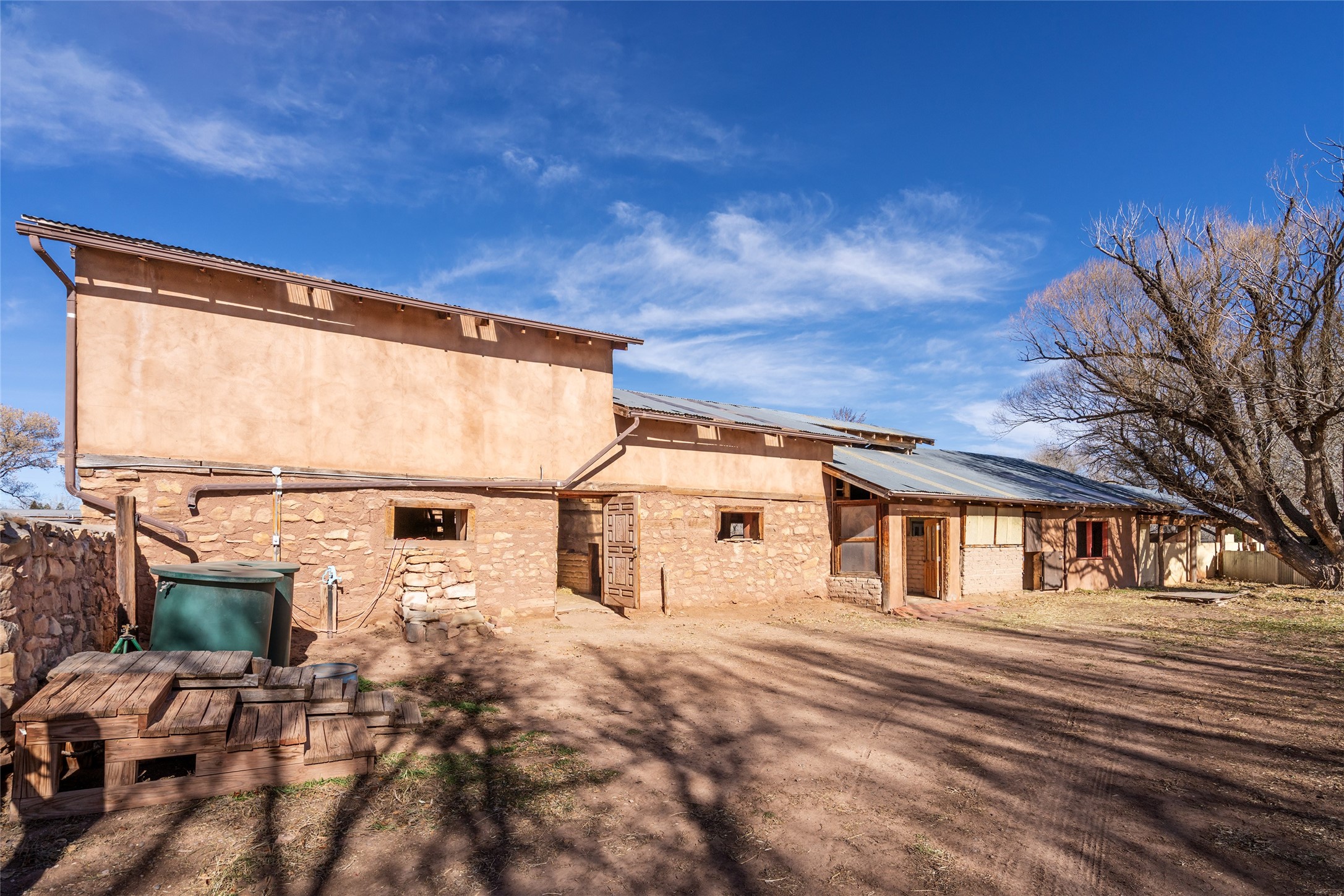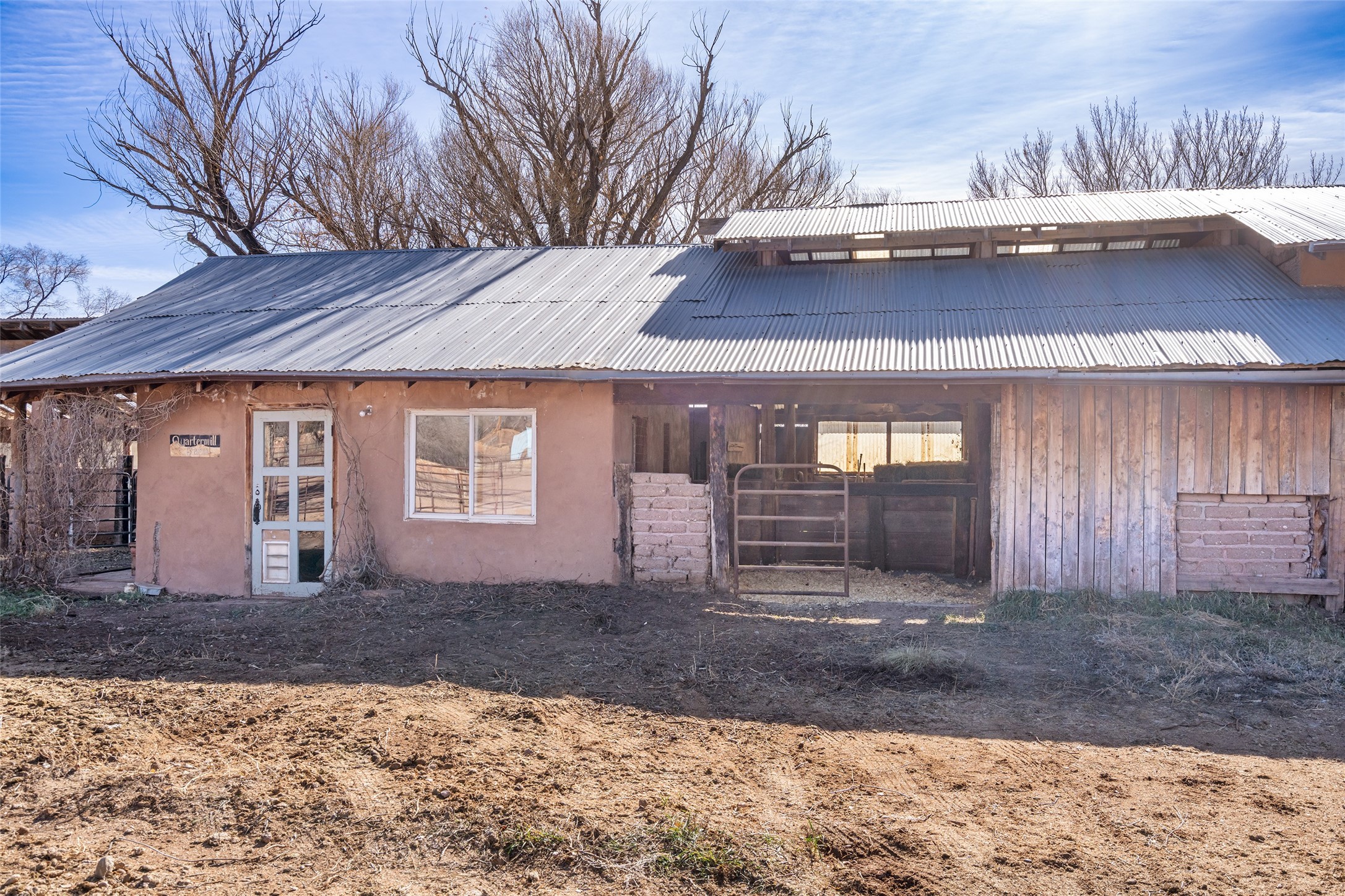 This historic Galisteo Hacienda presents a rare opportunity to restore an iconic adobe estate set on 3.8 acres within the village of Galisteo, one of the largest landholdings under Traditional Community zoning, which supports residential, live/work, and art gallery uses. Dating to the 1800s, the property once served as the headquarters of Don Jos Ortiz y Pino's sheep empire and later as the iconic Quartermill Farm - home, studio, and gallery of acclaimed artist Priscilla Hoback--making it uniquely suited to continue as a creative live/work estate. Located in the heart of Galisteo Village, the property includes a former gallery along a central village road and a substantial adobe main house privately set behind it.The hacienda features two residential wings with four bedrooms and three baths, a large library, grand living and dining rooms, multiple fireplaces, and authentic architectural details. A generous inner courtyard with mature trees, portals, and a koi pond creates a serene, campus-like setting ideal for both living and creative pursuits, complemented by fruit trees, gardens, and expansive village acreage.Equestrian facilities include a large handcrafted stone and adobe barn with spacious stalls and turnouts, wash rack, hay loft, tack room with bath, and an oversized arena, supported by a private well dedicated to the barn. Additional structures include an art studio with sink and loft, and a one-bedroom guest house--formerly the historic town bar--offering flexibility for guests, staff, or extended work use.The property is in need of renovation and restoration, presenting an exceptional opportunity for a discerning buyer to reimagine a historically significant live/work estate, blending residential life, creative enterprise, and community engagement in one of Galisteo's most storied village settings.