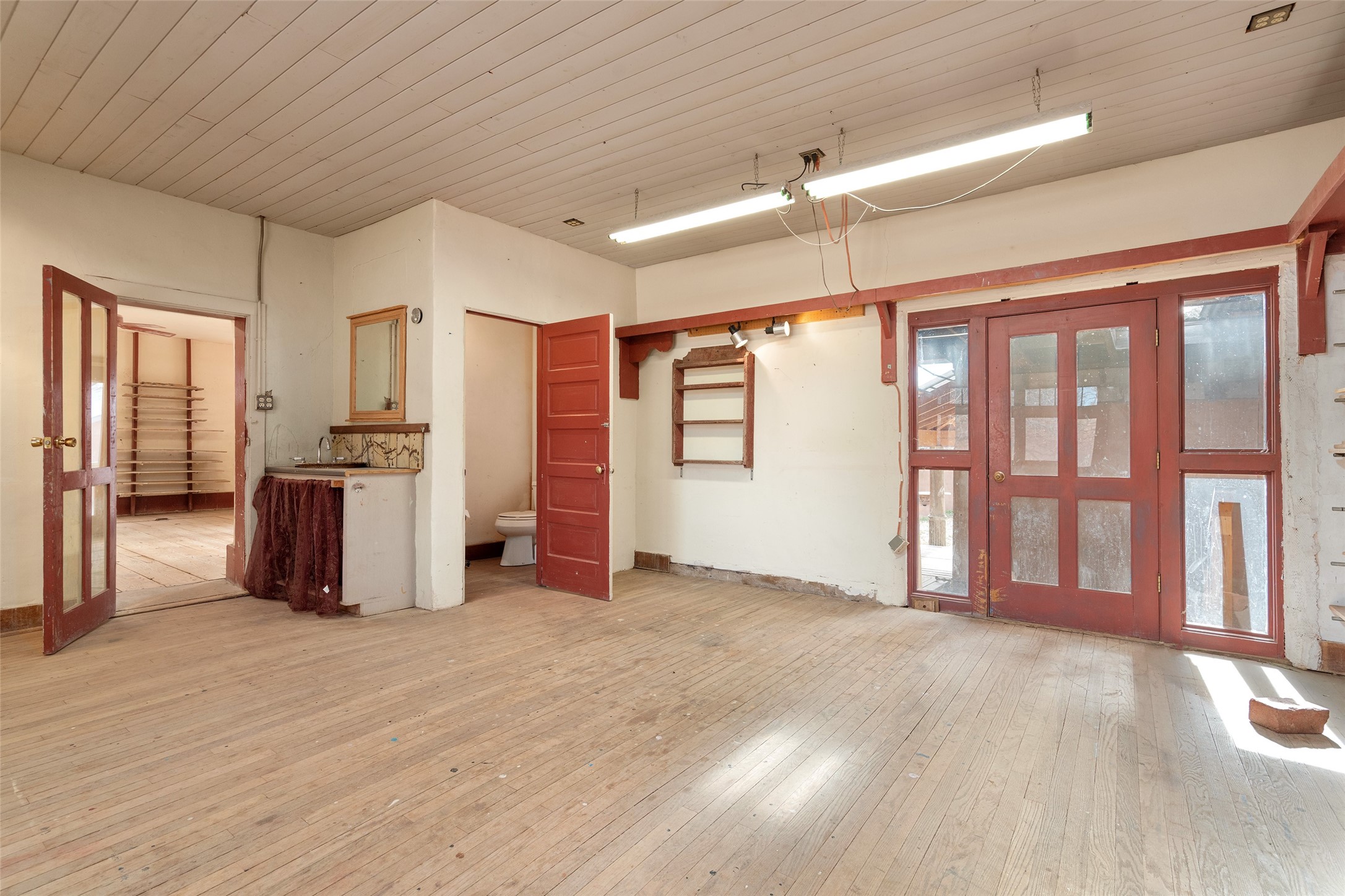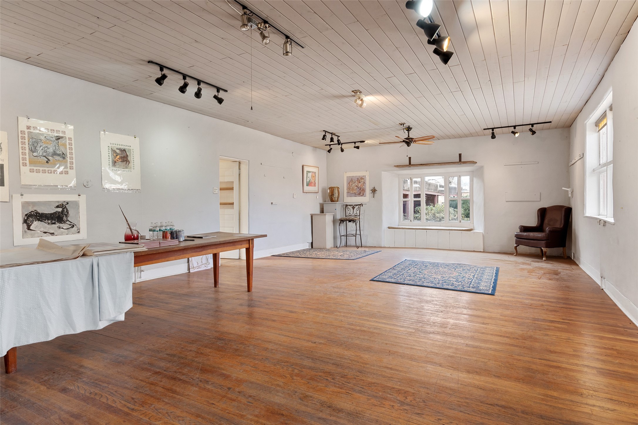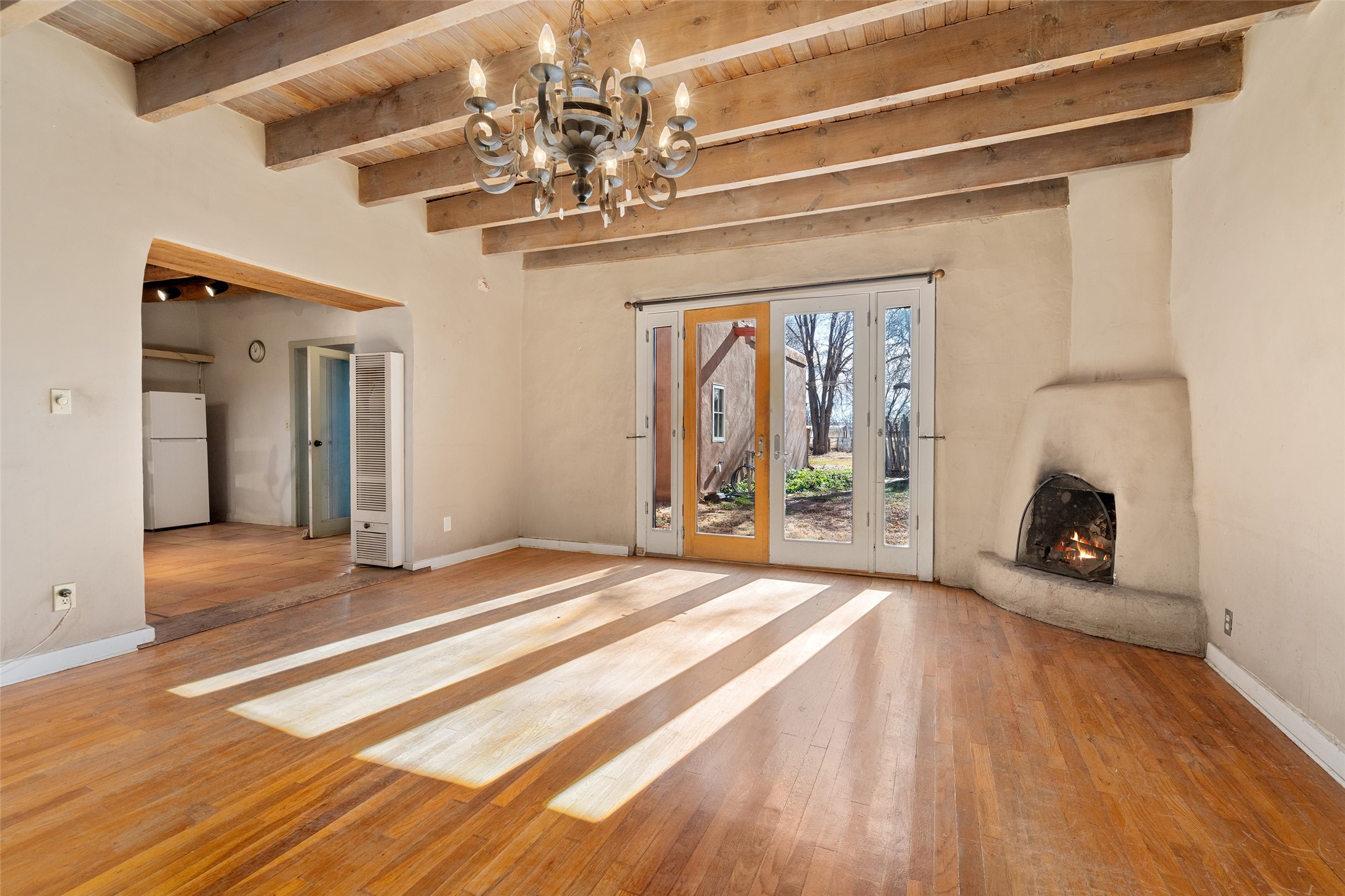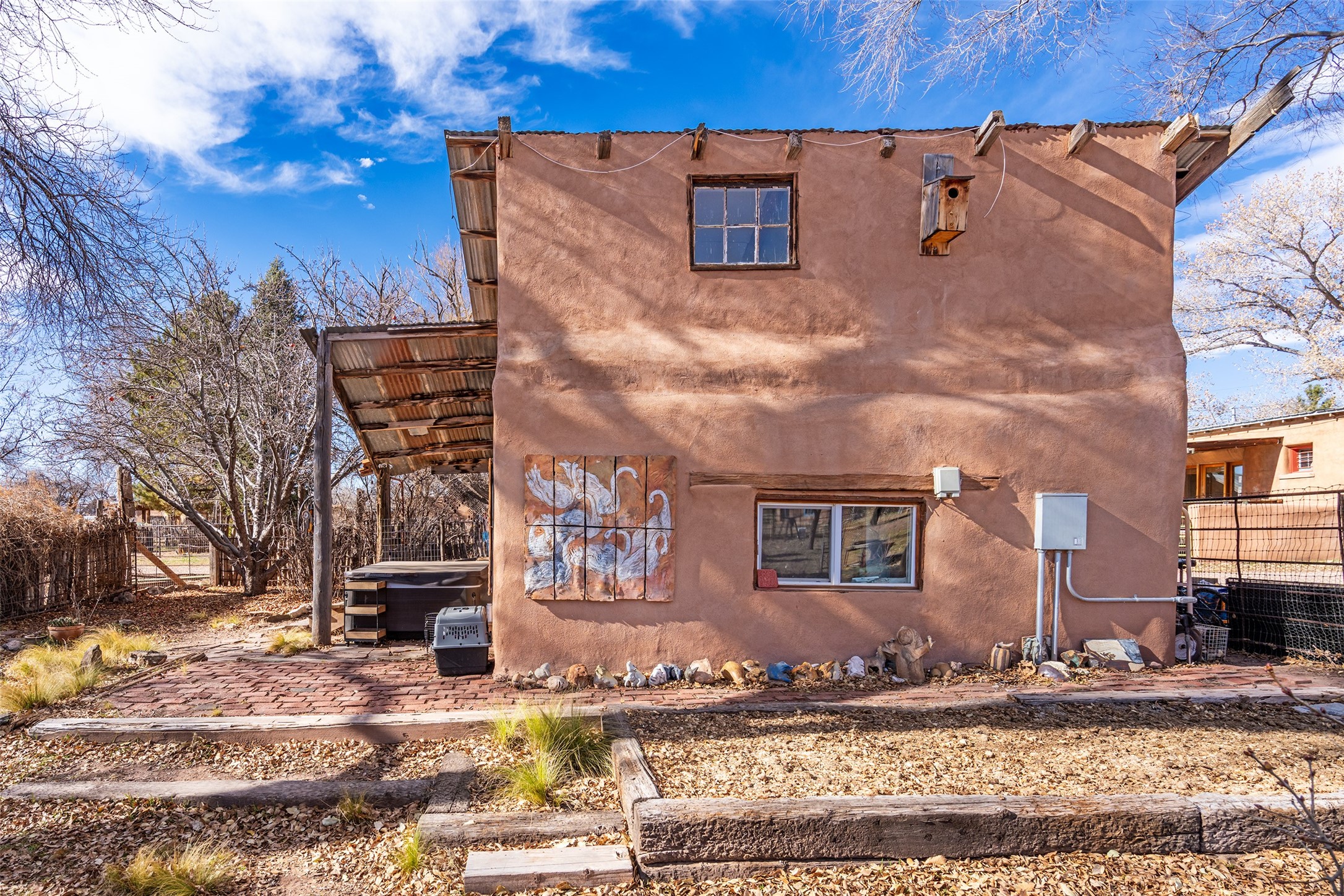 This historic Galisteo Hacienda presents a rare opportunity to restore an iconic adobe estate set on 3.8 acres within the village of Galisteo, one of the largest landholdings under Traditional Community zoning, which supports residential, live/work, and art gallery uses. Dating to the 1800s, the property once served as the headquarters of Don Jos Ortiz y Pino's sheep empire and later as the iconic Quartermill Farm - home, studio, and gallery of acclaimed artist Priscilla Hoback--making it uniquely suited to continue as a creative live/work estate. Located in the heart of Galisteo Village, the property includes a former gallery along a central village road and a substantial adobe main house privately set behind it.The hacienda features two residential wings with four bedrooms and three baths, a large library, grand living and dining rooms, multiple fireplaces, and authentic architectural details. A generous inner courtyard with mature trees, portals, and a koi pond creates a serene, campus-like setting ideal for both living and creative pursuits, complemented by fruit trees, gardens, and expansive village acreage.Equestrian facilities include a large handcrafted stone and adobe barn with spacious stalls and turnouts, wash rack, hay loft, tack room with bath, and an oversized arena, supported by a private well dedicated to the barn. Additional structures include an art studio with sink and loft, and a one-bedroom guest house--formerly the historic town bar--offering flexibility for guests, staff, or extended work use.The property is in need of renovation and restoration, presenting an exceptional opportunity for a discerning buyer to reimagine a historically significant live/work estate, blending residential life, creative enterprise, and community engagement in one of Galisteo's most storied village settings.