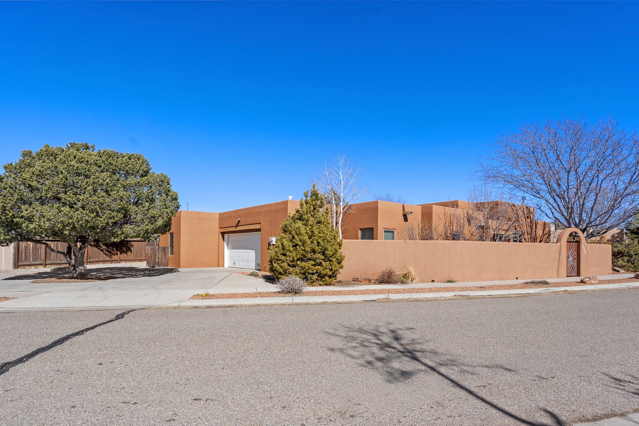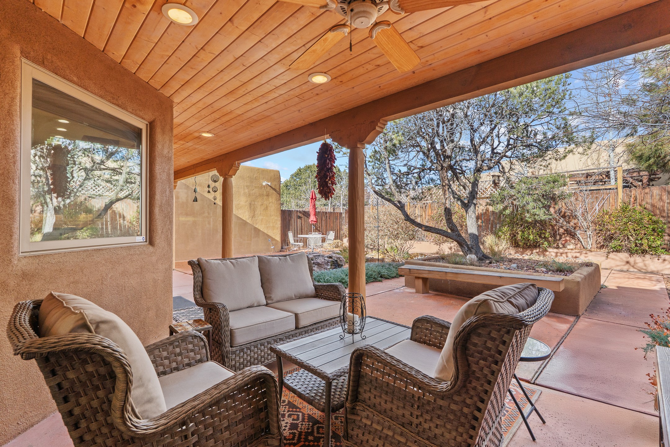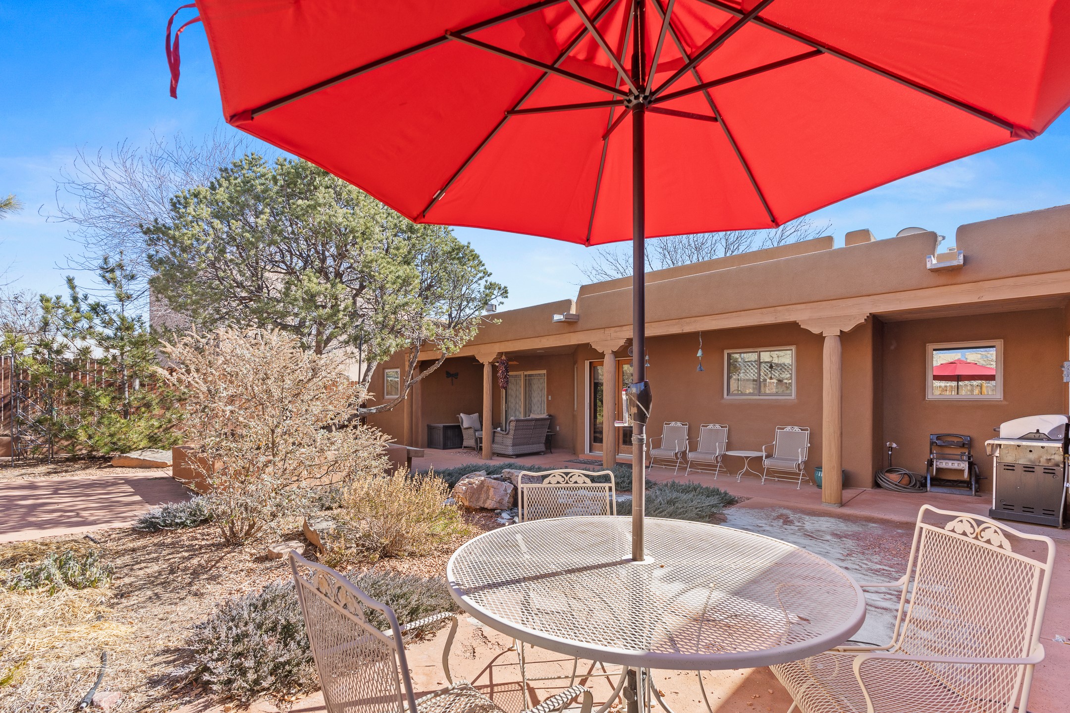 Tucked into the coveted Pueblos Del Sol neighborhood, this custom home with a guest house is a rare find--offering privacy, thoughtful design, and flexible living. The main house and guest house are connected by a two-car garage, yet are completely separate and private, and are enclosed within a stucco wall that creates a private, cohesive compound. The 1,892 sq. ft. single-level main residence features 3 bedrooms and 2 bathrooms with a light-filled open-concept living, kitchen, and dining area. The generous South-facing living room offers high tongue-and-groove ceilings with beams, warm wood flooring, and a corner gas fireplace for added ambience. The recently renovated kitchen--designed by Sven Grell of Santa Fe Kitchen Design--is the centerpiece of the home. It features beautiful granite countertops, custom Alder wood cabinetry, stainless steel appliances, and a functional U-shaped layout with bar seating--creating a seamless space for cooking and conversation. The adjacent dining area is enhanced by a custom, lighted built-in buffet--perfect for displaying pottery, glassware, or treasured dishware. The private, landscaped backyard is accessible from both the dining room and the primary suite. The primary bedroom includes a gas fireplace and a generous sitting area--ideal for a home office or reading nook. The 533 sq. ft. 1-bedroom, 1-bathroom guest house enjoys its own entrance and private courtyard, and has been a successful rental for the current owners. Additional bonuses: In-floor radiant heat, mini-split and evaporative cooling, ample off street parking and a wonderful South-facing front courtyard for sunny, winter morning coffee hour. This is a rare opportunity to own both a beautifully crafted home and a private guest house in one of Santa Fe's desirable midtown neighborhoods--complete with access to nearby trails, privacy, and timeless Santa Fe charm.