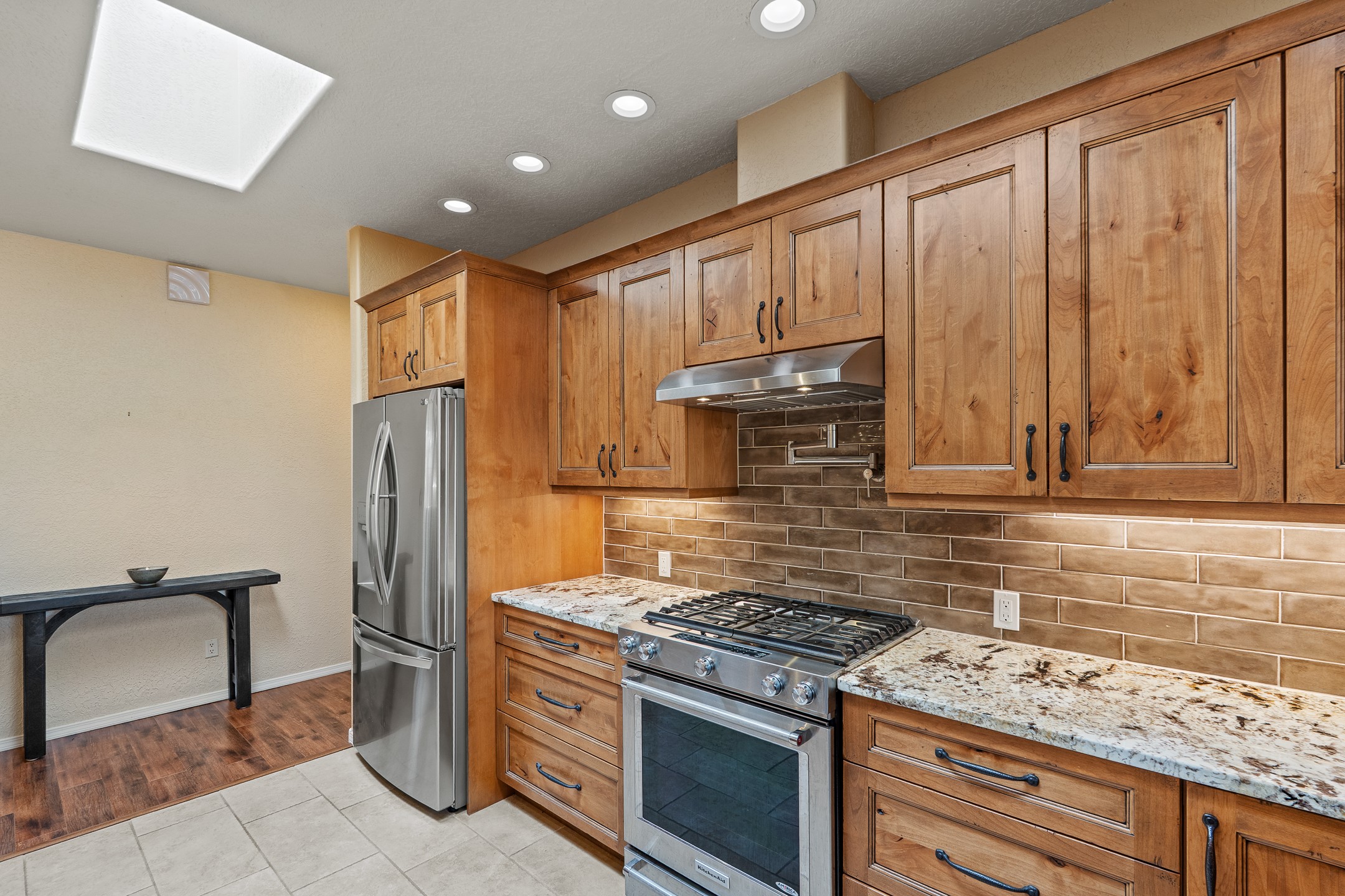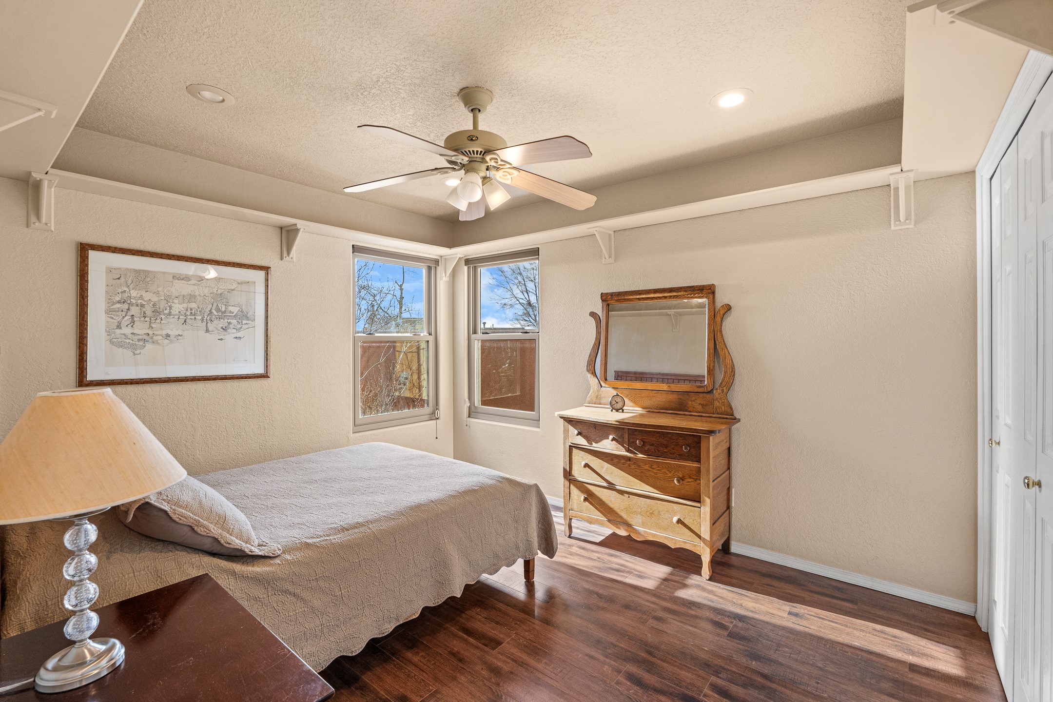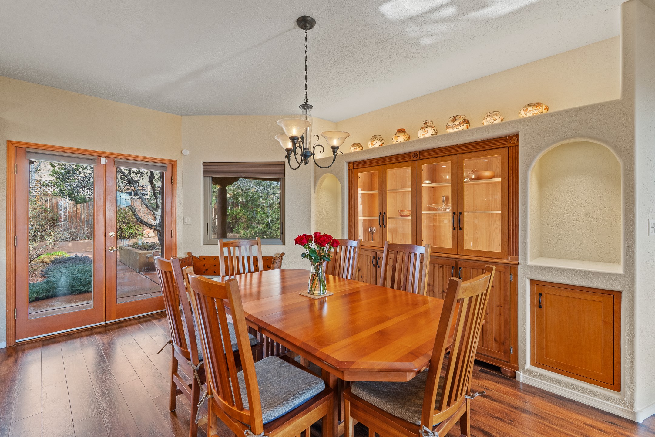 Tucked into the coveted Pueblos Del Sol neighborhood, this custom home with a guest house is a rare find--offering privacy, thoughtful design, and flexible living. The main house and guest house are connected by a two-car garage, yet are completely separate and private, and are enclosed within a stucco wall that creates a private, cohesive compound. The 1,892 sq. ft. single-level main residence features 3 bedrooms and 2 bathrooms with a light-filled open-concept living, kitchen, and dining area. The generous South-facing living room offers high tongue-and-groove ceilings with beams, warm wood flooring, and a corner gas fireplace for added ambience. The recently renovated kitchen--designed by Sven Grell of Santa Fe Kitchen Design--is the centerpiece of the home. It features beautiful granite countertops, custom Alder wood cabinetry, stainless steel appliances, and a functional U-shaped layout with bar seating--creating a seamless space for cooking and conversation. The adjacent dining area is enhanced by a custom, lighted built-in buffet--perfect for displaying pottery, glassware, or treasured dishware. The private, landscaped backyard is accessible from both the dining room and the primary suite. The primary bedroom includes a gas fireplace and a generous sitting area--ideal for a home office or reading nook. The 533 sq. ft. 1-bedroom, 1-bathroom guest house enjoys its own entrance and private courtyard, and has been a successful rental for the current owners. Additional bonuses: In-floor radiant heat, mini-split and evaporative cooling, ample off street parking and a wonderful South-facing front courtyard for sunny, winter morning coffee hour. This is a rare opportunity to own both a beautifully crafted home and a private guest house in one of Santa Fe's desirable midtown neighborhoods--complete with access to nearby trails, privacy, and timeless Santa Fe charm.