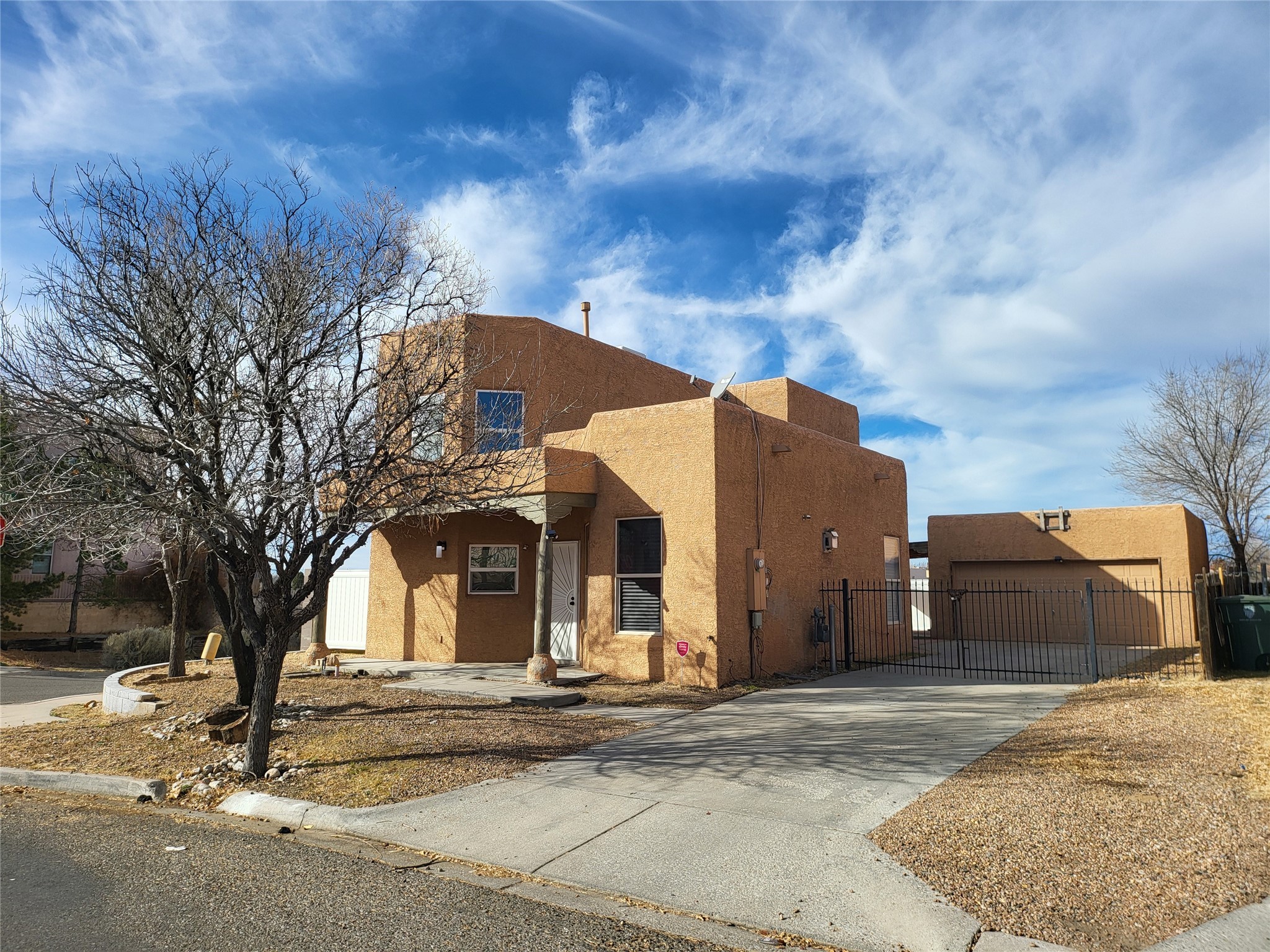 Fantastic location, 4 bedroom, 2.5 baths two story home in the Tierra Contenta neighborhood. Large corner lot and spacious floor plan. Main bedroom is on the ground level with full bath and walk-in closet. Upstairs are three bedrooms and a full bath. High ceilings in the living room, corner gas Kiva fireplace, 2 car garage and extra parking behind the gated drive. Fully fenced private yard with newer white vinyl fencing topped with solar lights. Covered patio area off the garage and shed for extra storage. Additional open space behind fence line, see aerial view for full lot size. No HOA fees, easy access to 599, I-25, Presbyterian Hospital, trails, schools, library, shopping, and restaurants.