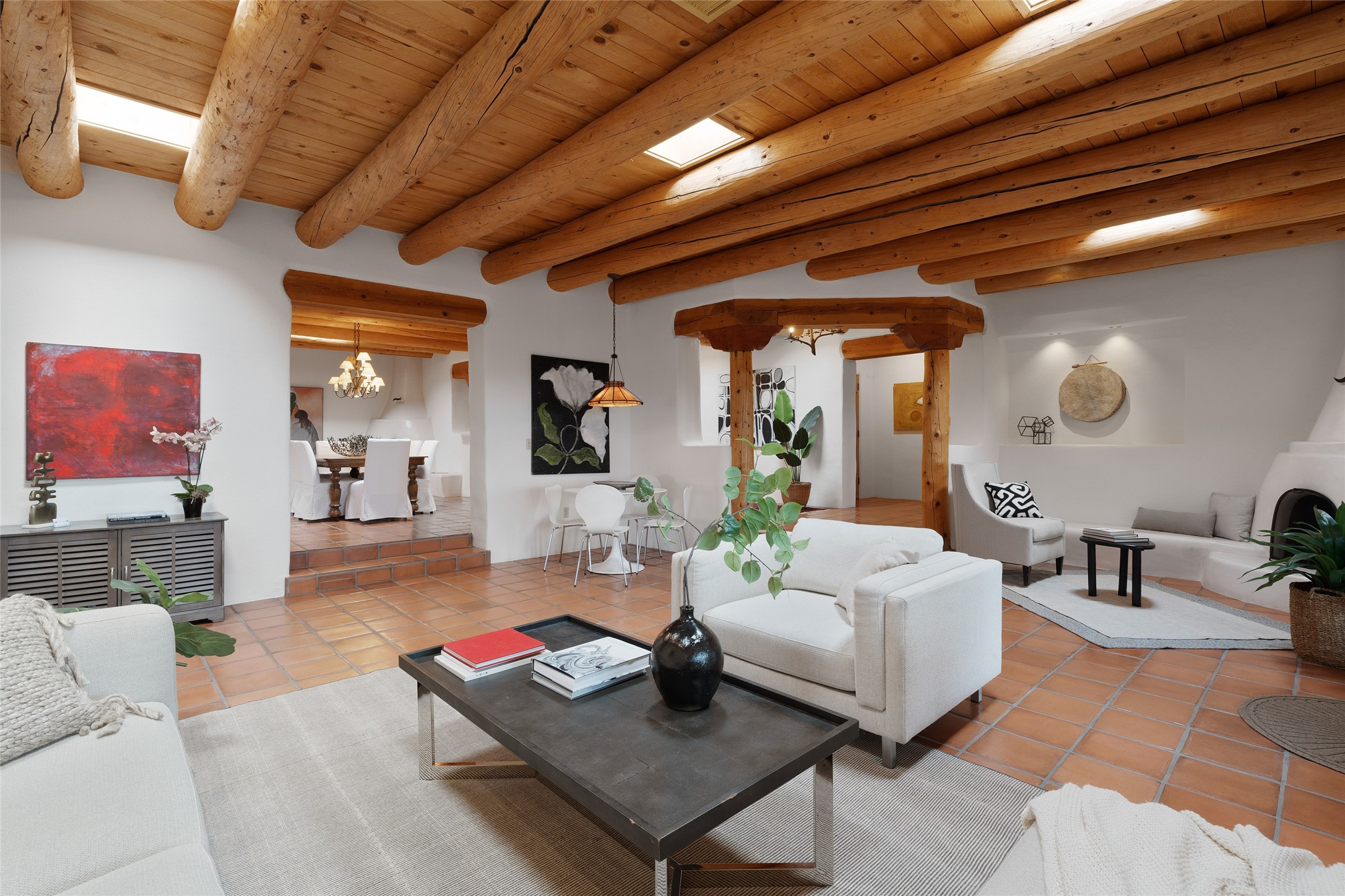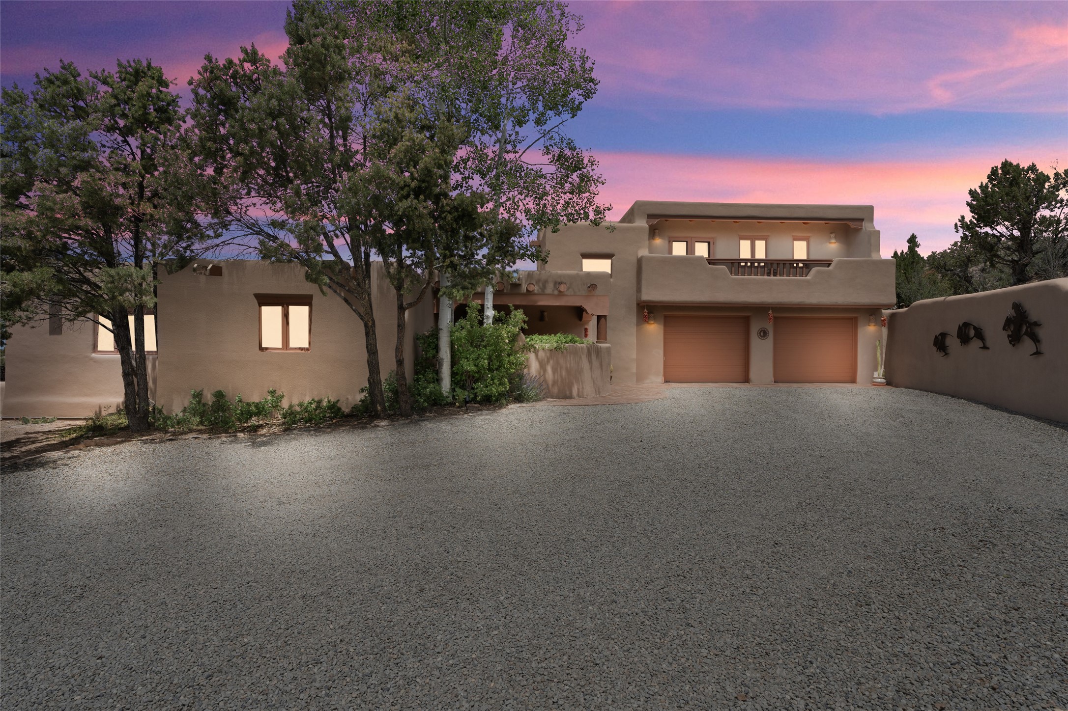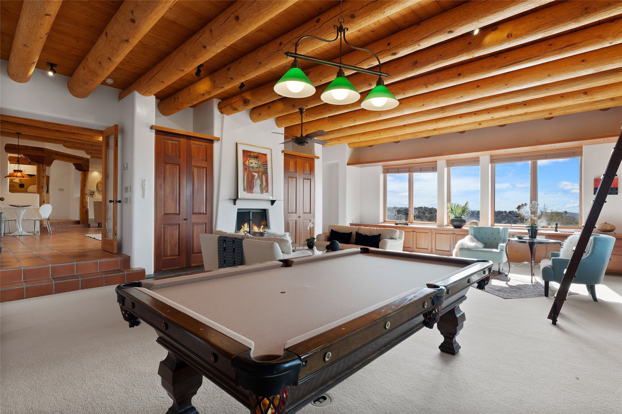 Here's a rare chance to own a very special property in gorgeous, exclusive Los Caminitos, and wouldn't you like to live on Love Street- Camino Amor! A classic Santa Fe Style Hacienda sits atop a glorious ridgeline on 27 lush, private acres in the luxurious green hills of private Los Caminitos with views that go on forever and ever, overlooking vistas far and wide for miles! This is easy living, with easy entertaining flowing through spacious rooms with high finished ceilings and all of the Santa Fe touches; vigas, corbels, lintels, nichos and bancos that enhance this happy ambience. 5 bedrooms and 6 baths with a nice separation of spaces comfortably accommodate all your family and friends! It is silent out here...You can hear the cicadas and the bluebirds, and see millions of stars at night in the big, deep, dark sky. You can be alone with the universe here. This impeccably maintained home is move-in ready now as it is, or you could take it to the next level and create a publishable showplace. As an owner in the lovely gated community of Los Caminitos, whose website you may visit for further information, you will be a member of the private Los Caminitos Clubouse with pool, tennis, pickleball, barbecue facilities and private party house for members use. A stones throw to elegant Encantado, and about 12 minutes to the plaza, you are sure to come back home to peace, serenity, and love here on Camino Amor.
