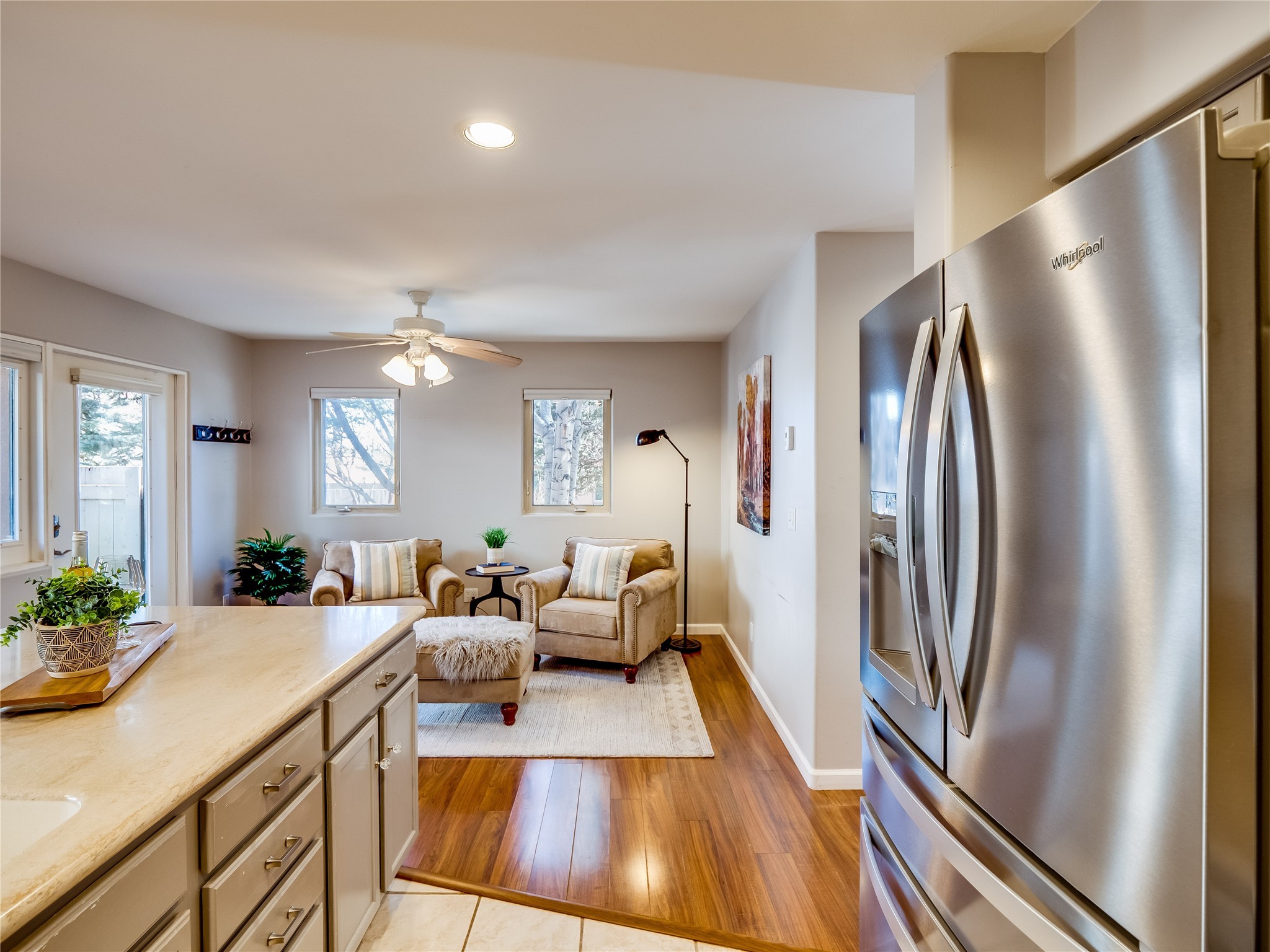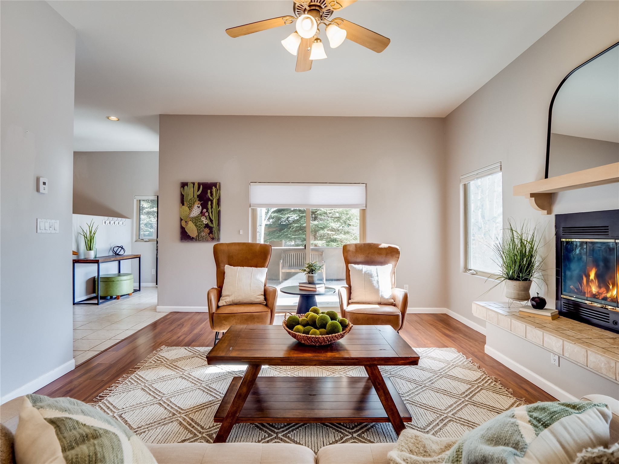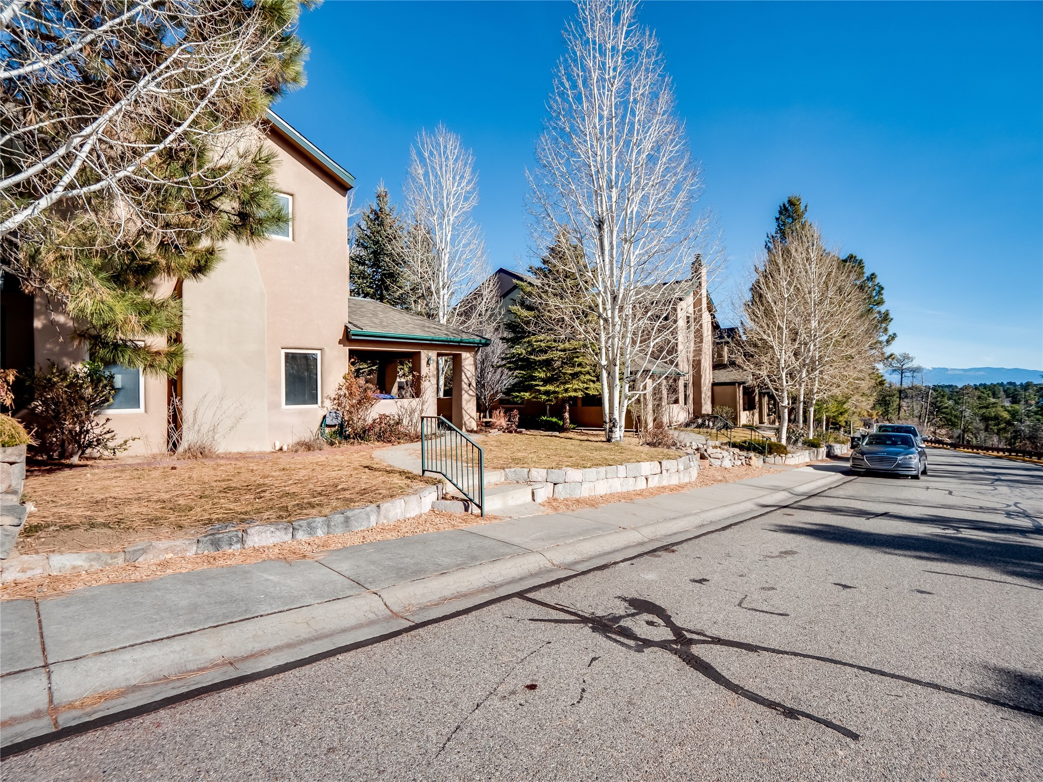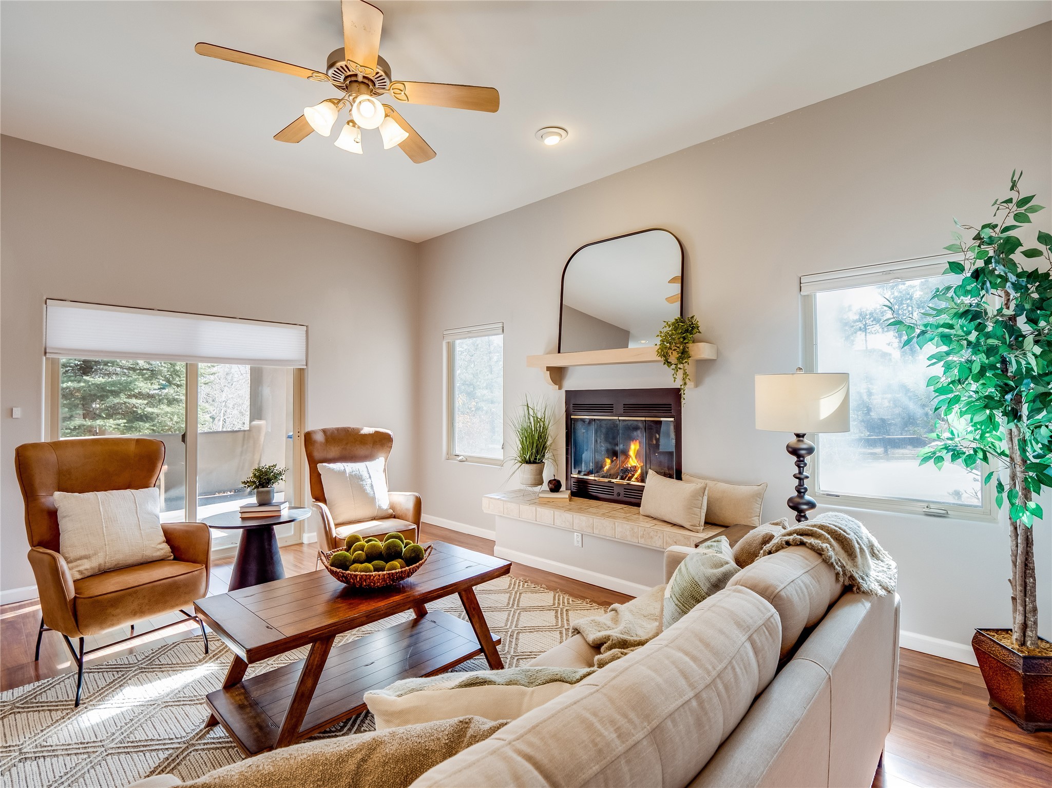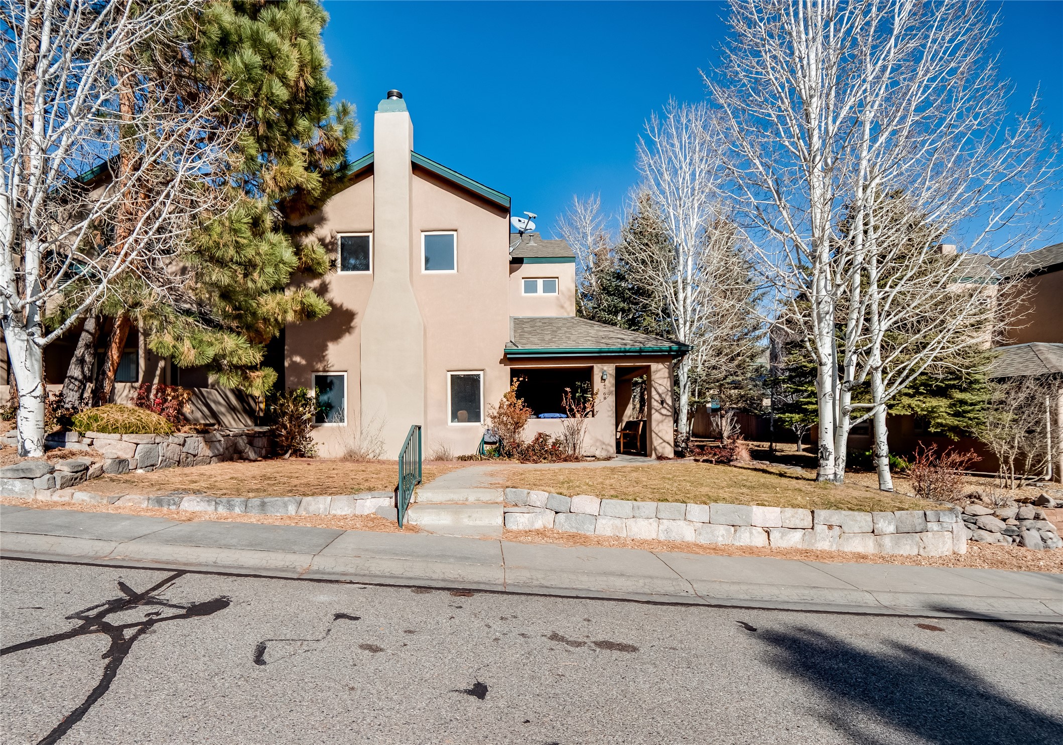 Set in the desirable Quemazon community, this modern two-story townhome offers canyon-edge living surrounded by natural beauty. The mature front yard welcomes you with tall aspens, soft landscaping, and a covered patio leading to the main entrance. Step inside to a large foyer that opens into a bright, living room featuring rich laminate flooring throughout the main living areas. A wood-burning fireplace anchors the living room, framed by windows that capture views of the surrounding forested terrain. Sliding glass doors extend the space onto the front patio for seamless indoor-outdoor living. Just a short set of stairs up, the dining room awaits, complete with a spacious walk-in pantry and storage closet, plus a convenient powder room on the same level. Toward the back of the home, the kitchen blends modern style and function with granite countertops, painted gray cabinetry, and durable tile flooring. Stainless steel appliances, a peninsula island with bar seating, and flexible layout options, including room for a sit-down dining table or casual breakfast area. Step out to the private back courtyard patio, finished with pavers, planter beds, and space for outdoor dining or gardening. Stairs lead directly to the attached two-car garage for everyday convenience. Upstairs, two well-sized guest bedrooms include carpet flooring, walk-in closets, and generous natural light. A full guest bathroom features a double-sink vanity and tiled shower and tub surround. The hallway also includes a dedicated laundry closet for easy access. The primary en-suite offers a peaceful retreat with vaulted ceilings, plush carpet flooring, a large walk-in closet, and a spa-inspired bathroom. Relax in the separate tiled soaking tub or unwind in the oversized walk-in tiled shower. A double-sink vanity completes the space with elevated style and functionality. Move-in ready and thoughtfully designed, this home enjoys an exceptional location close to trails, and parks. Book your showing today!