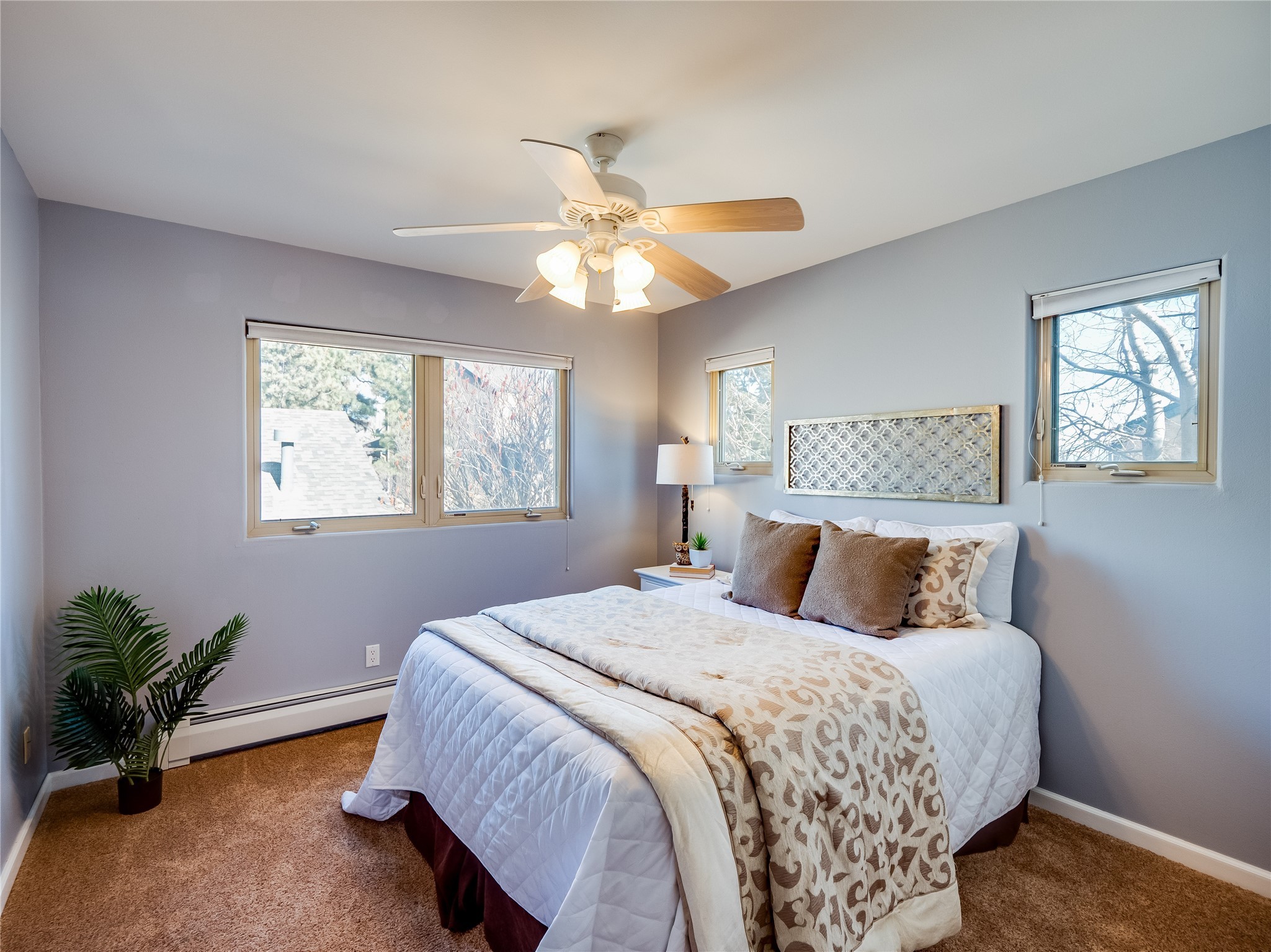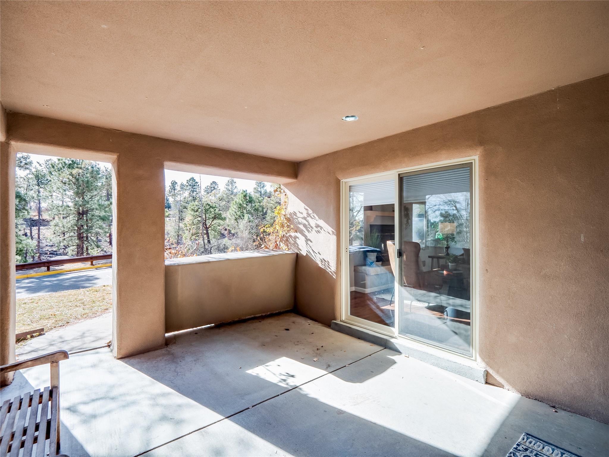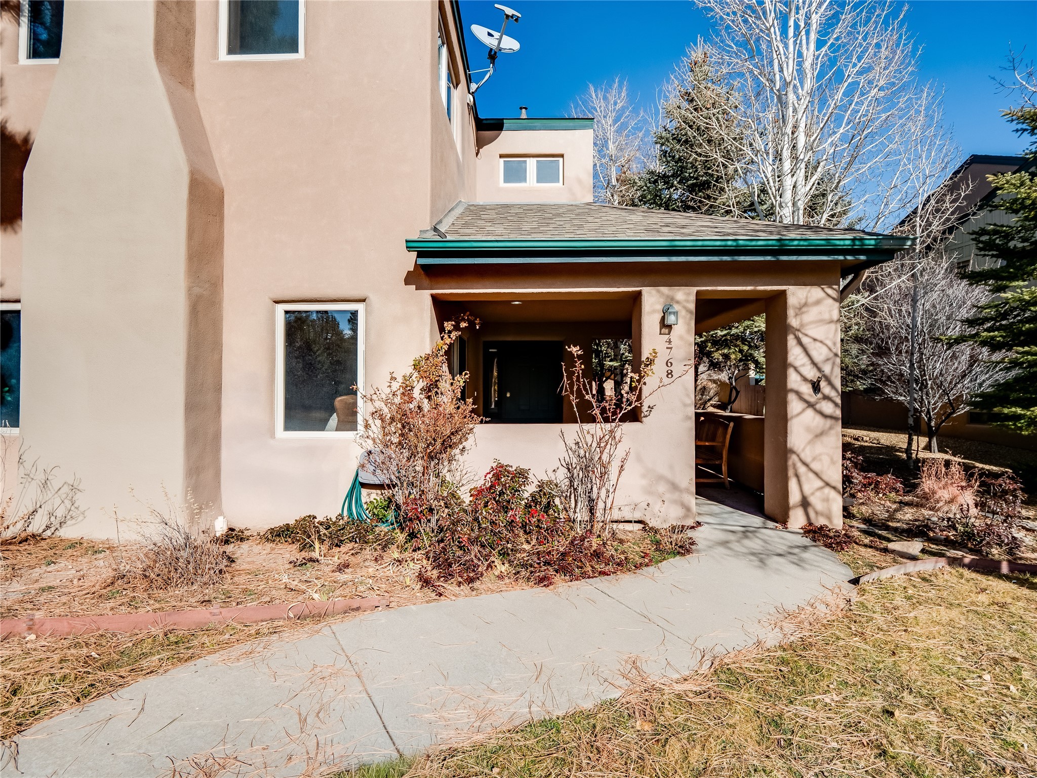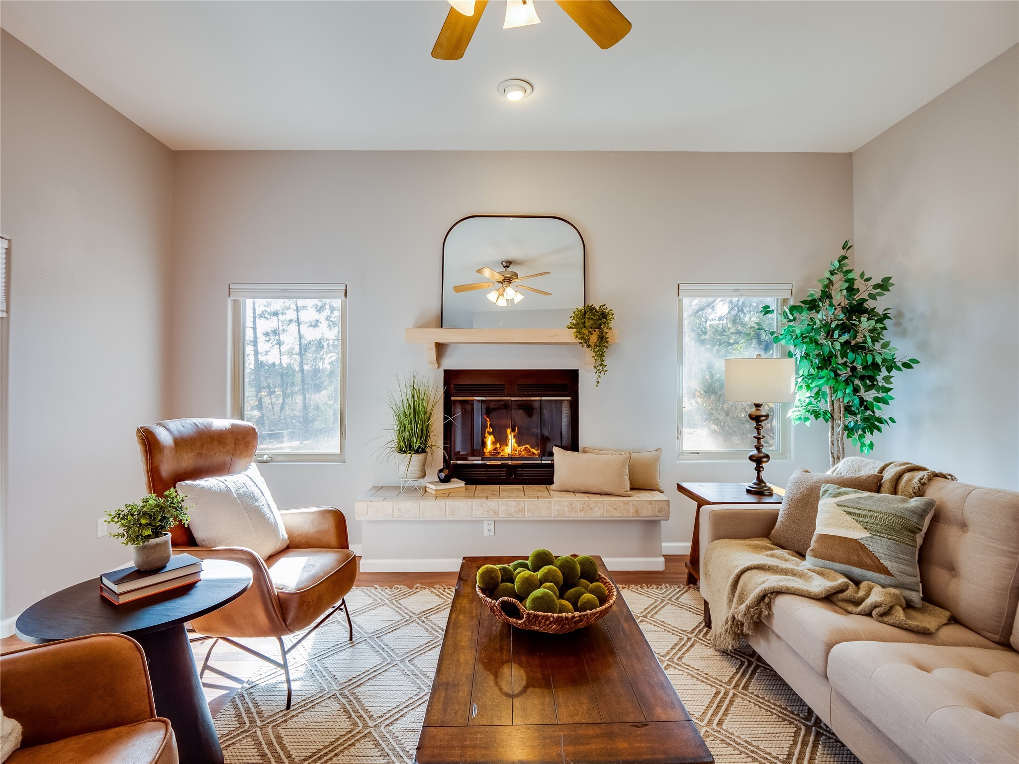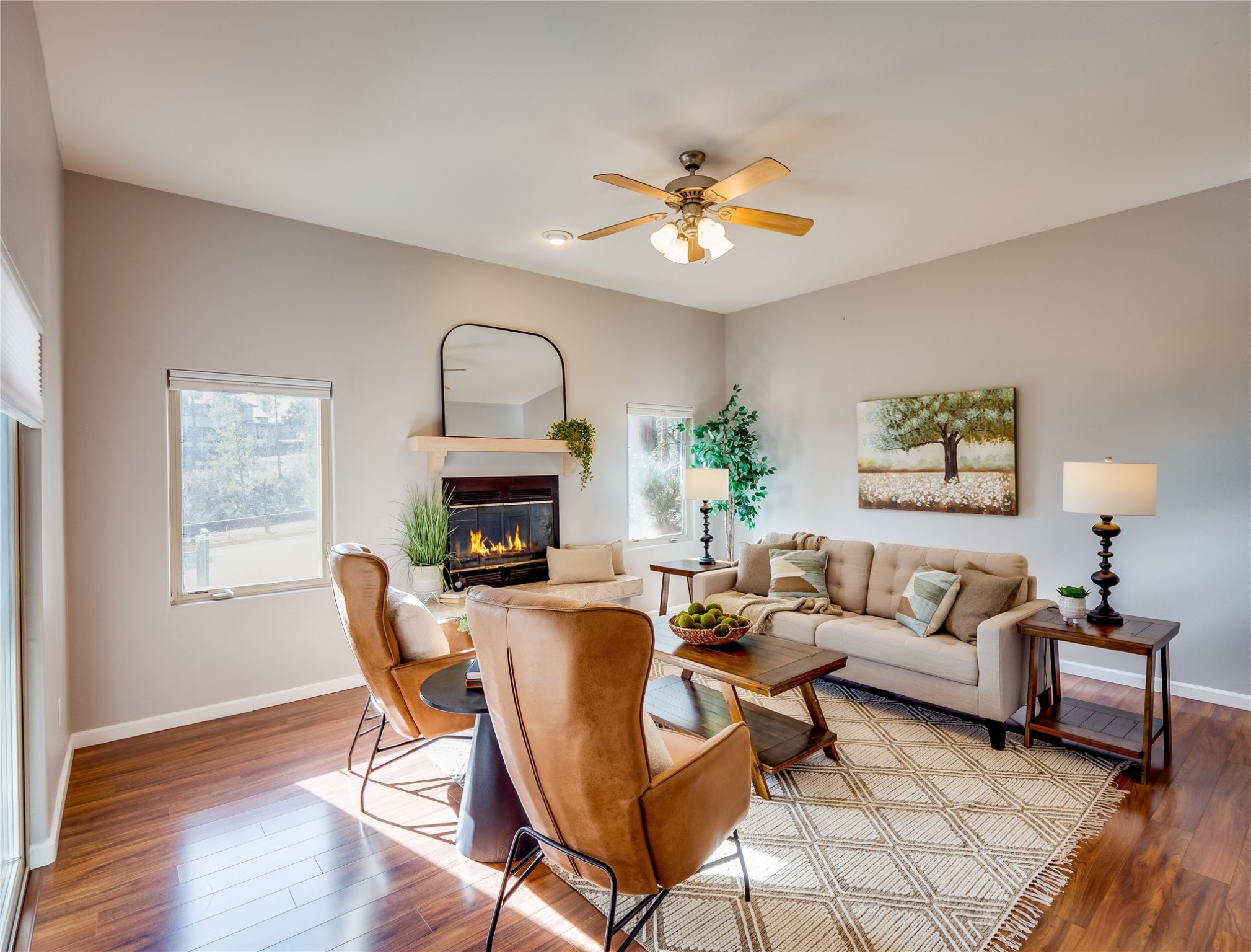 Set in the desirable Quemazon community, this modern two-story townhome offers canyon-edge living surrounded by natural beauty. The mature front yard welcomes you with tall aspens, soft landscaping, and a covered patio leading to the main entrance. Step inside to a large foyer that opens into a bright, living room featuring rich laminate flooring throughout the main living areas. A wood-burning fireplace anchors the living room, framed by windows that capture views of the surrounding forested terrain. Sliding glass doors extend the space onto the front patio for seamless indoor-outdoor living. Just a short set of stairs up, the dining room awaits, complete with a spacious walk-in pantry and storage closet, plus a convenient powder room on the same level. Toward the back of the home, the kitchen blends modern style and function with granite countertops, painted gray cabinetry, and durable tile flooring. Stainless steel appliances, a peninsula island with bar seating, and flexible layout options, including room for a sit-down dining table or casual breakfast area. Step out to the private back courtyard patio, finished with pavers, planter beds, and space for outdoor dining or gardening. Stairs lead directly to the attached two-car garage for everyday convenience. Upstairs, two well-sized guest bedrooms include carpet flooring, walk-in closets, and generous natural light. A full guest bathroom features a double-sink vanity and tiled shower and tub surround. The hallway also includes a dedicated laundry closet for easy access. The primary en-suite offers a peaceful retreat with vaulted ceilings, plush carpet flooring, a large walk-in closet, and a spa-inspired bathroom. Relax in the separate tiled soaking tub or unwind in the oversized walk-in tiled shower. A double-sink vanity completes the space with elevated style and functionality. Move-in ready and thoughtfully designed, this home enjoys an exceptional location close to trails, and parks. Book your showing today!