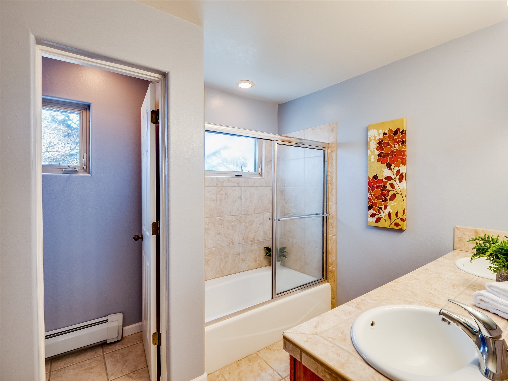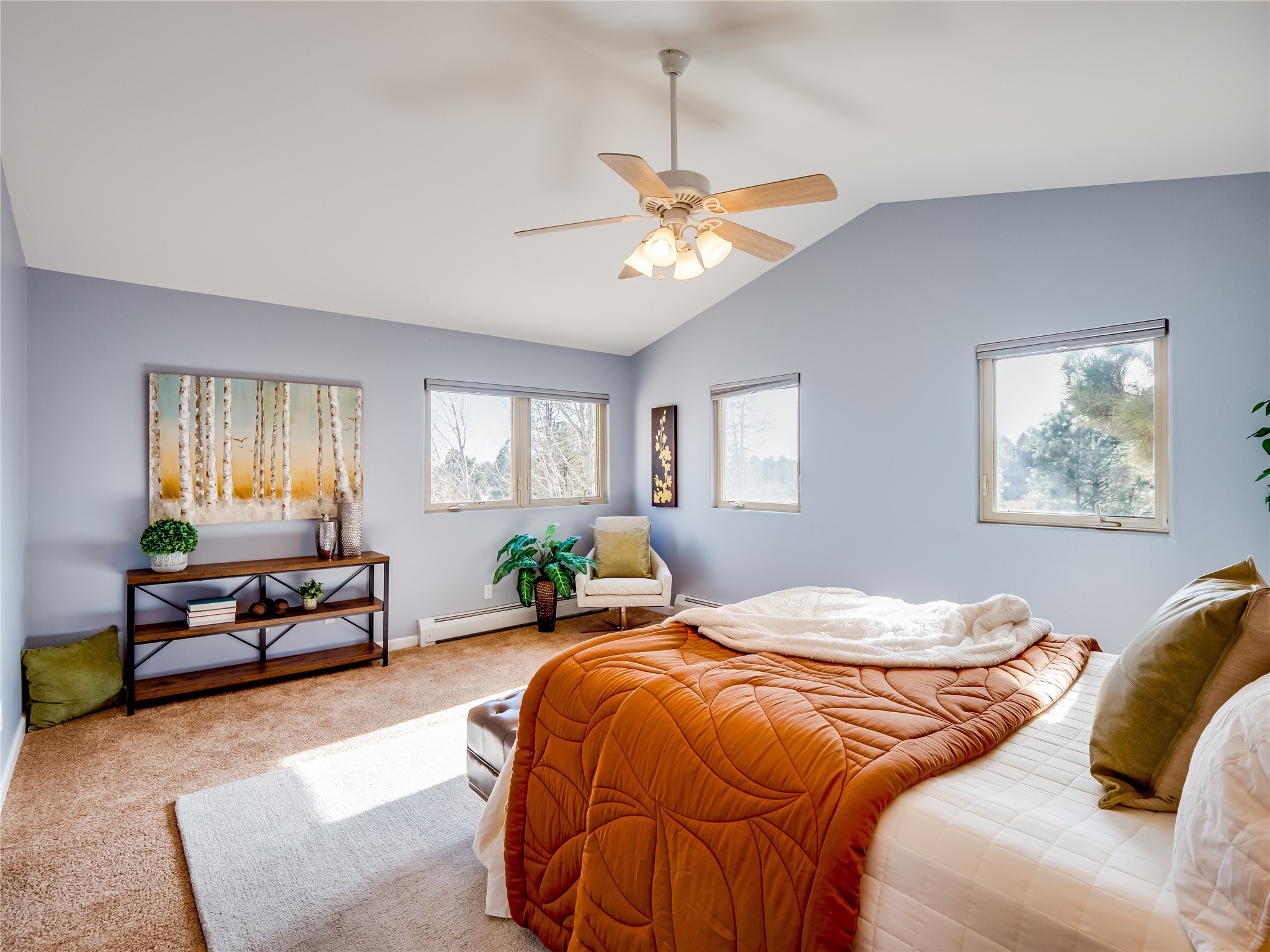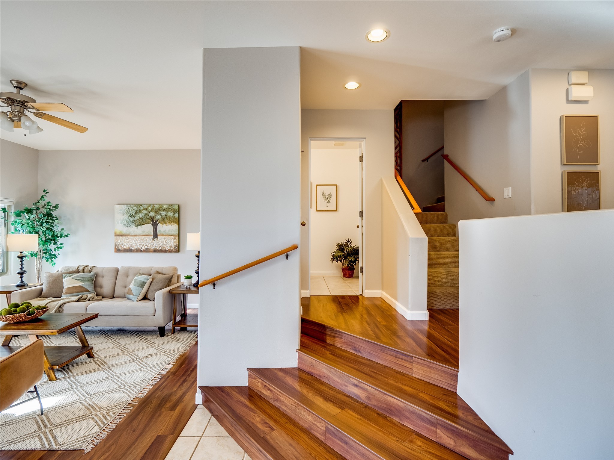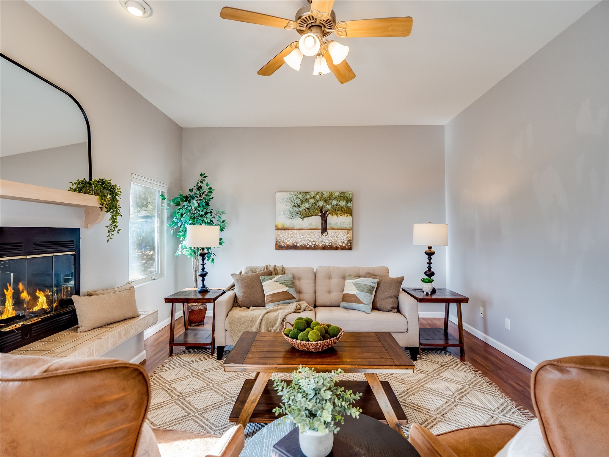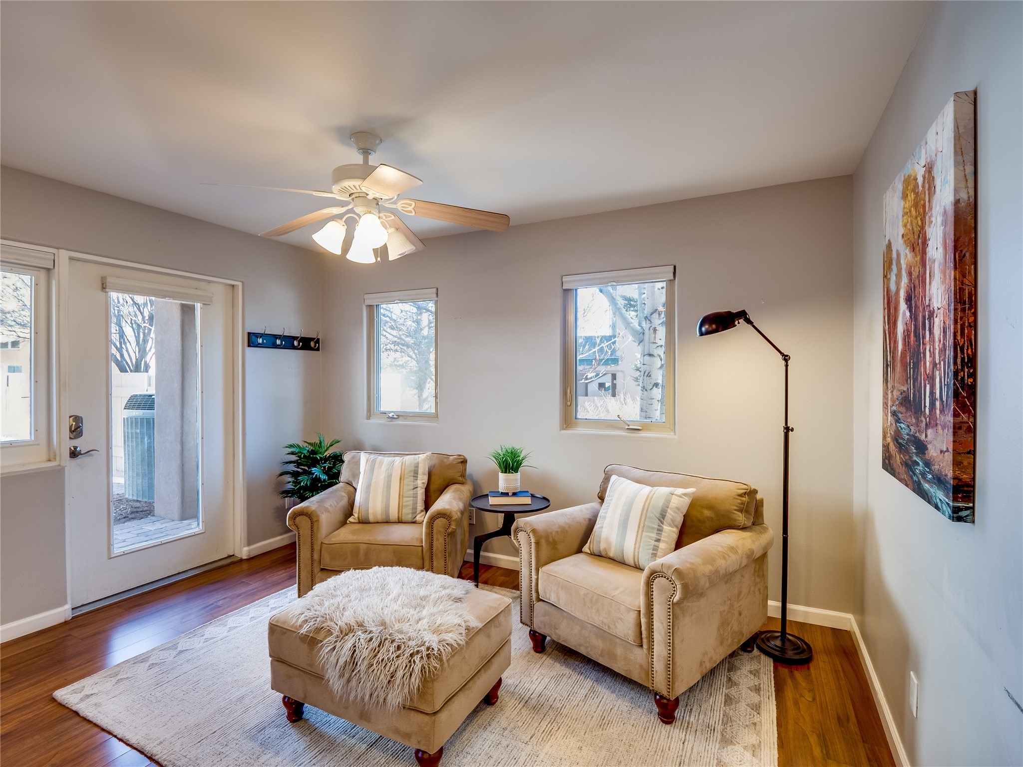 Set in the desirable Quemazon community, this modern two-story townhome offers canyon-edge living surrounded by natural beauty. The mature front yard welcomes you with tall aspens, soft landscaping, and a covered patio leading to the main entrance. Step inside to a large foyer that opens into a bright, living room featuring rich laminate flooring throughout the main living areas. A wood-burning fireplace anchors the living room, framed by windows that capture views of the surrounding forested terrain. Sliding glass doors extend the space onto the front patio for seamless indoor-outdoor living. Just a short set of stairs up, the dining room awaits, complete with a spacious walk-in pantry and storage closet, plus a convenient powder room on the same level. Toward the back of the home, the kitchen blends modern style and function with granite countertops, painted gray cabinetry, and durable tile flooring. Stainless steel appliances, a peninsula island with bar seating, and flexible layout options, including room for a sit-down dining table or casual breakfast area. Step out to the private back courtyard patio, finished with pavers, planter beds, and space for outdoor dining or gardening. Stairs lead directly to the attached two-car garage for everyday convenience. Upstairs, two well-sized guest bedrooms include carpet flooring, walk-in closets, and generous natural light. A full guest bathroom features a double-sink vanity and tiled shower and tub surround. The hallway also includes a dedicated laundry closet for easy access. The primary en-suite offers a peaceful retreat with vaulted ceilings, plush carpet flooring, a large walk-in closet, and a spa-inspired bathroom. Relax in the separate tiled soaking tub or unwind in the oversized walk-in tiled shower. A double-sink vanity completes the space with elevated style and functionality. Move-in ready and thoughtfully designed, this home enjoys an exceptional location close to trails, and parks. Book your showing today!