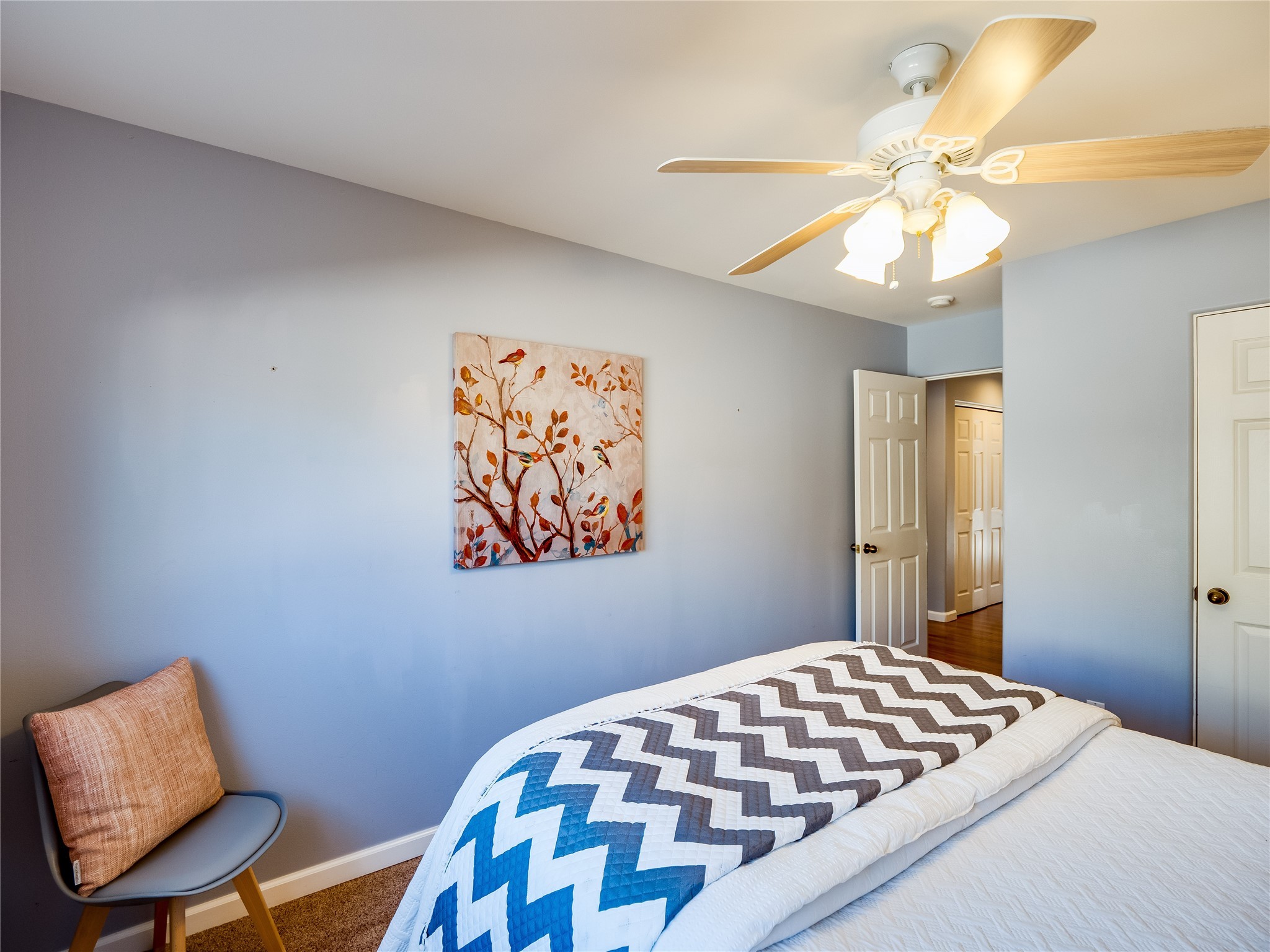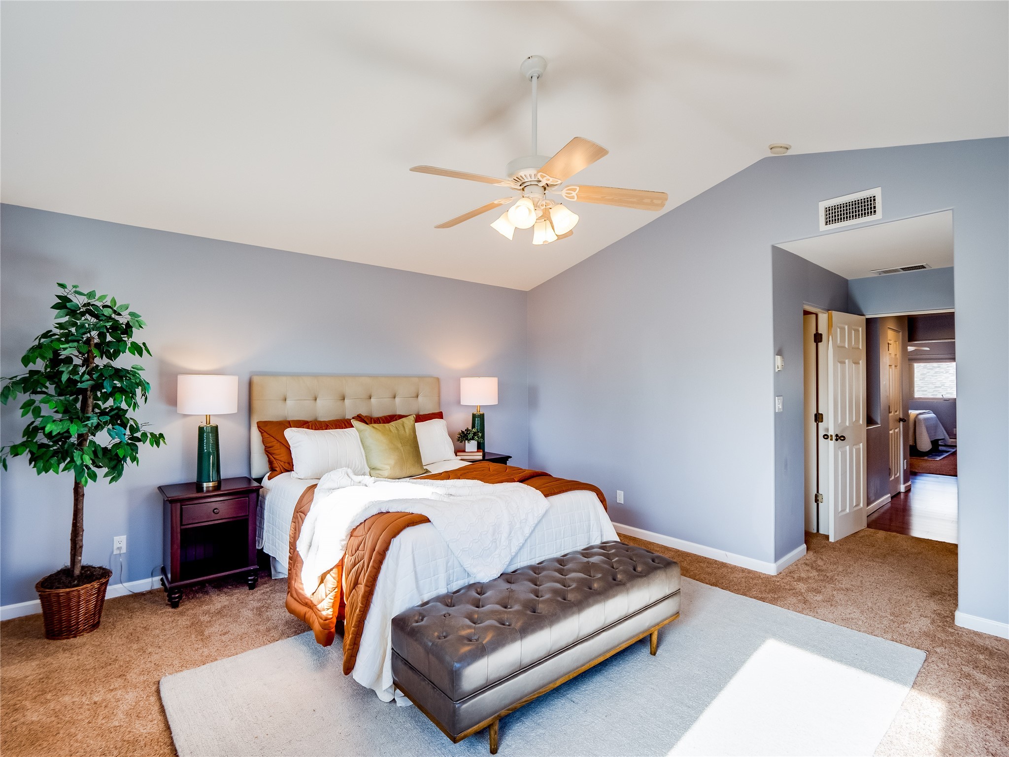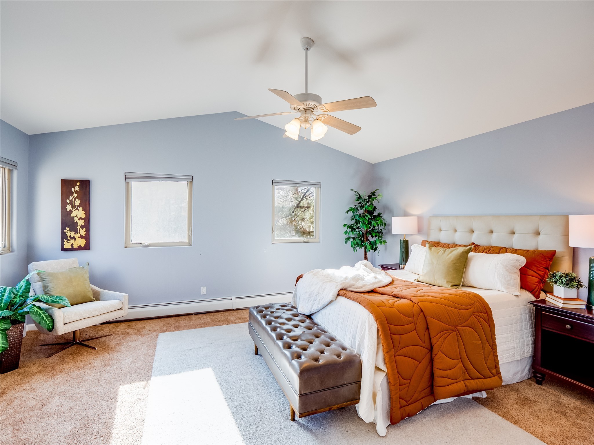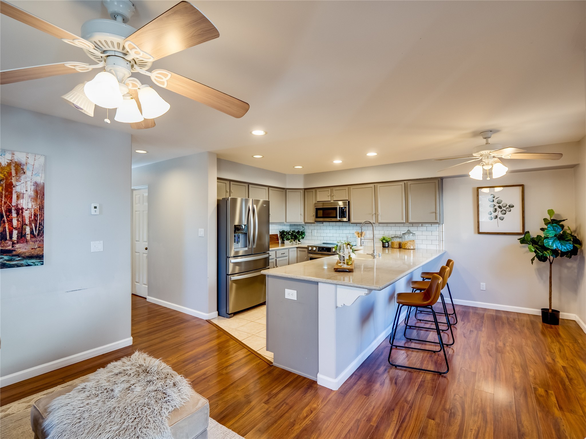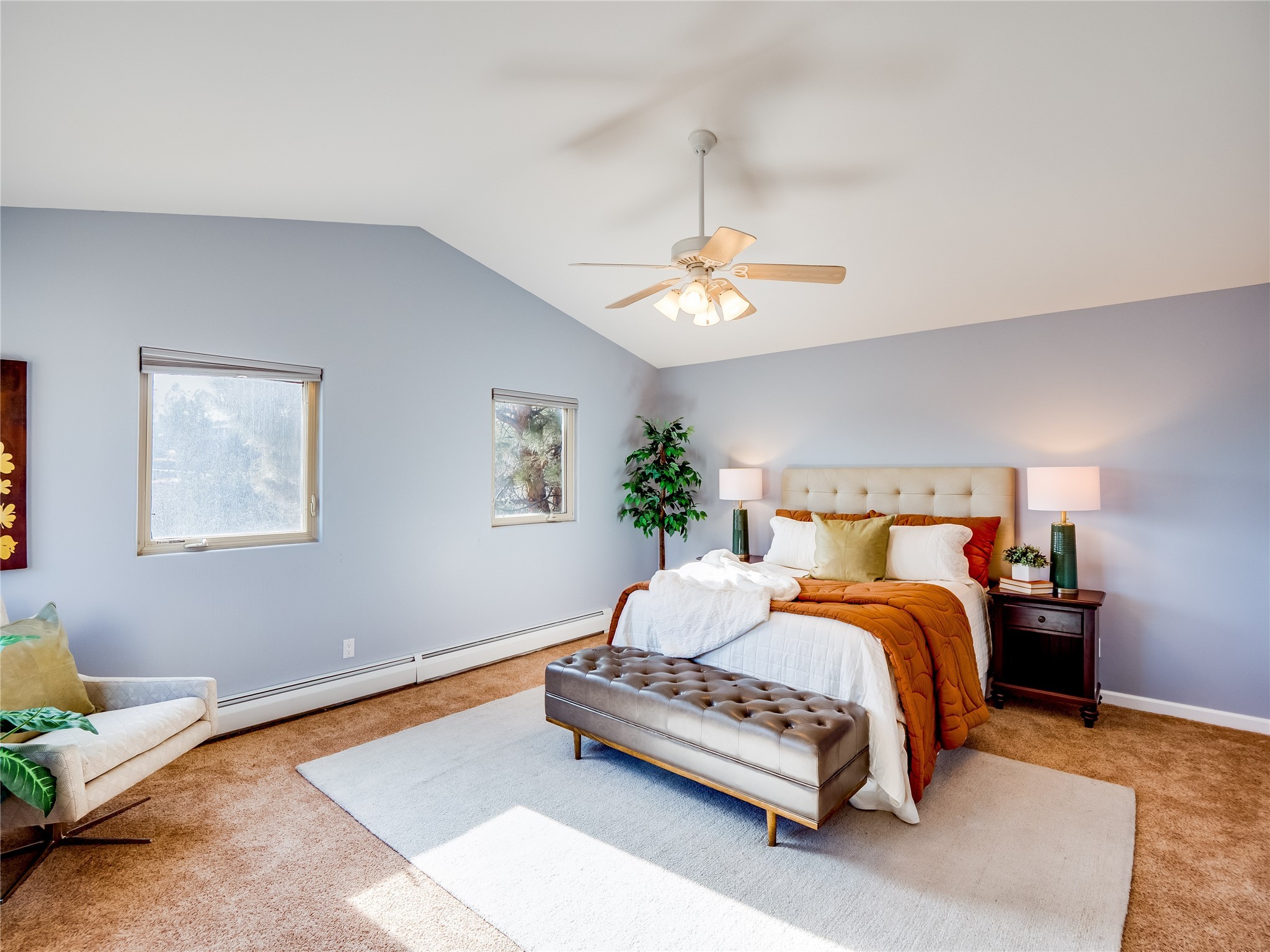 Set in the desirable Quemazon community, this modern two-story townhome offers canyon-edge living surrounded by natural beauty. The mature front yard welcomes you with tall aspens, soft landscaping, and a covered patio leading to the main entrance. Step inside to a large foyer that opens into a bright, living room featuring rich laminate flooring throughout the main living areas. A wood-burning fireplace anchors the living room, framed by windows that capture views of the surrounding forested terrain. Sliding glass doors extend the space onto the front patio for seamless indoor-outdoor living. Just a short set of stairs up, the dining room awaits, complete with a spacious walk-in pantry and storage closet, plus a convenient powder room on the same level. Toward the back of the home, the kitchen blends modern style and function with granite countertops, painted gray cabinetry, and durable tile flooring. Stainless steel appliances, a peninsula island with bar seating, and flexible layout options, including room for a sit-down dining table or casual breakfast area. Step out to the private back courtyard patio, finished with pavers, planter beds, and space for outdoor dining or gardening. Stairs lead directly to the attached two-car garage for everyday convenience. Upstairs, two well-sized guest bedrooms include carpet flooring, walk-in closets, and generous natural light. A full guest bathroom features a double-sink vanity and tiled shower and tub surround. The hallway also includes a dedicated laundry closet for easy access. The primary en-suite offers a peaceful retreat with vaulted ceilings, plush carpet flooring, a large walk-in closet, and a spa-inspired bathroom. Relax in the separate tiled soaking tub or unwind in the oversized walk-in tiled shower. A double-sink vanity completes the space with elevated style and functionality. Move-in ready and thoughtfully designed, this home enjoys an exceptional location close to trails, and parks. Book your showing today!