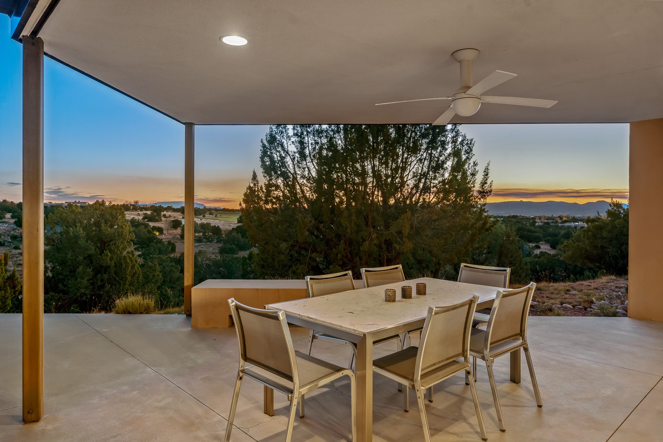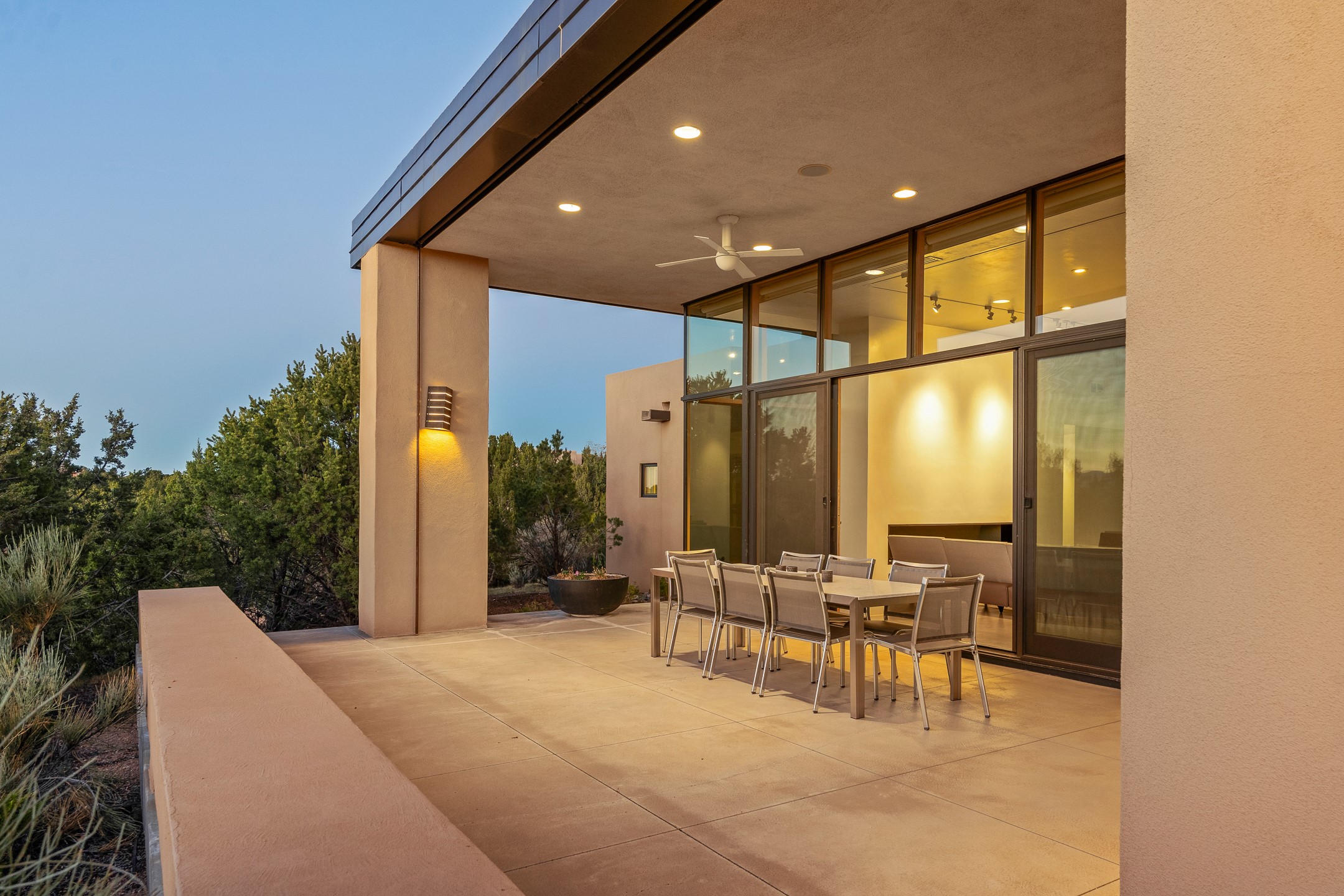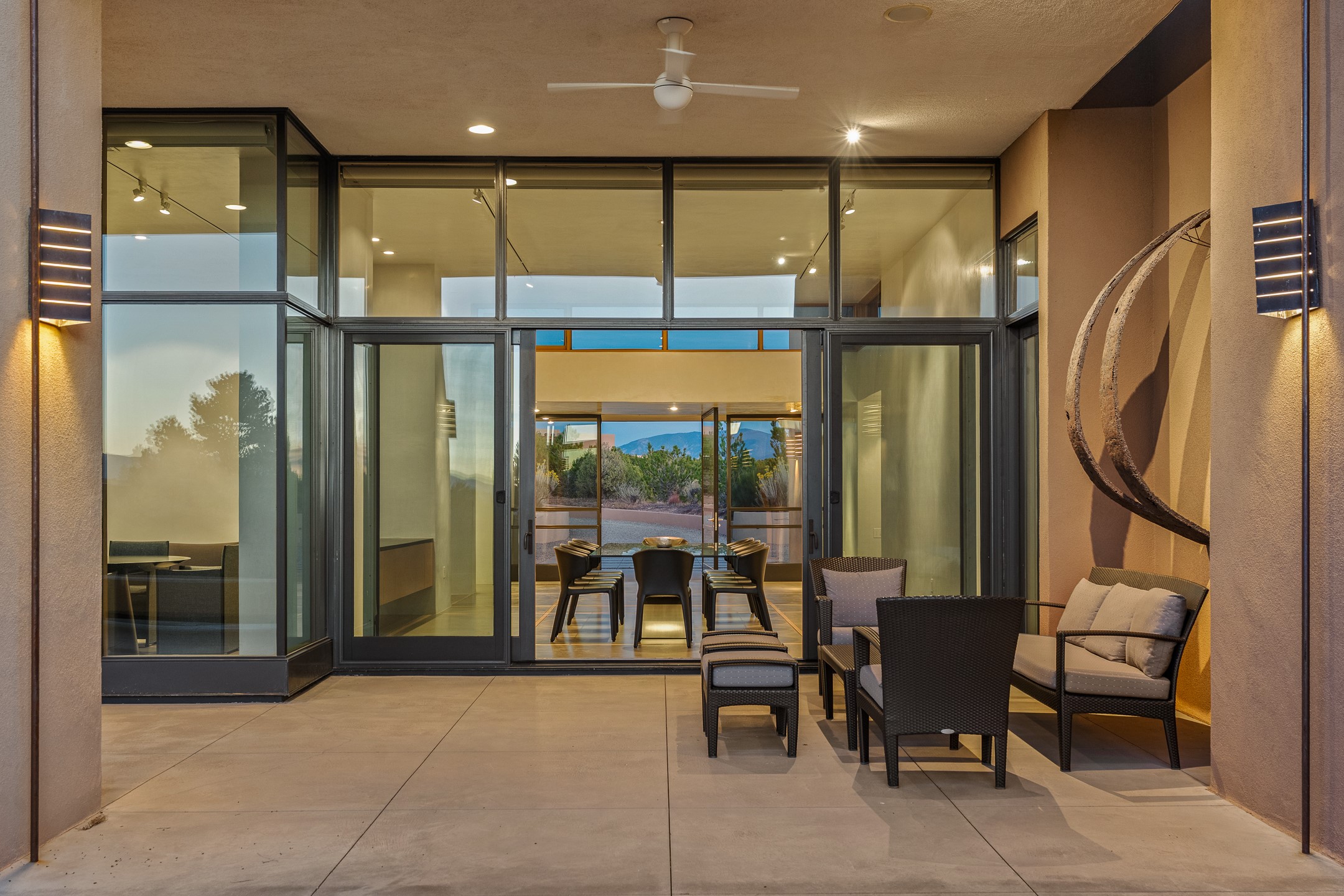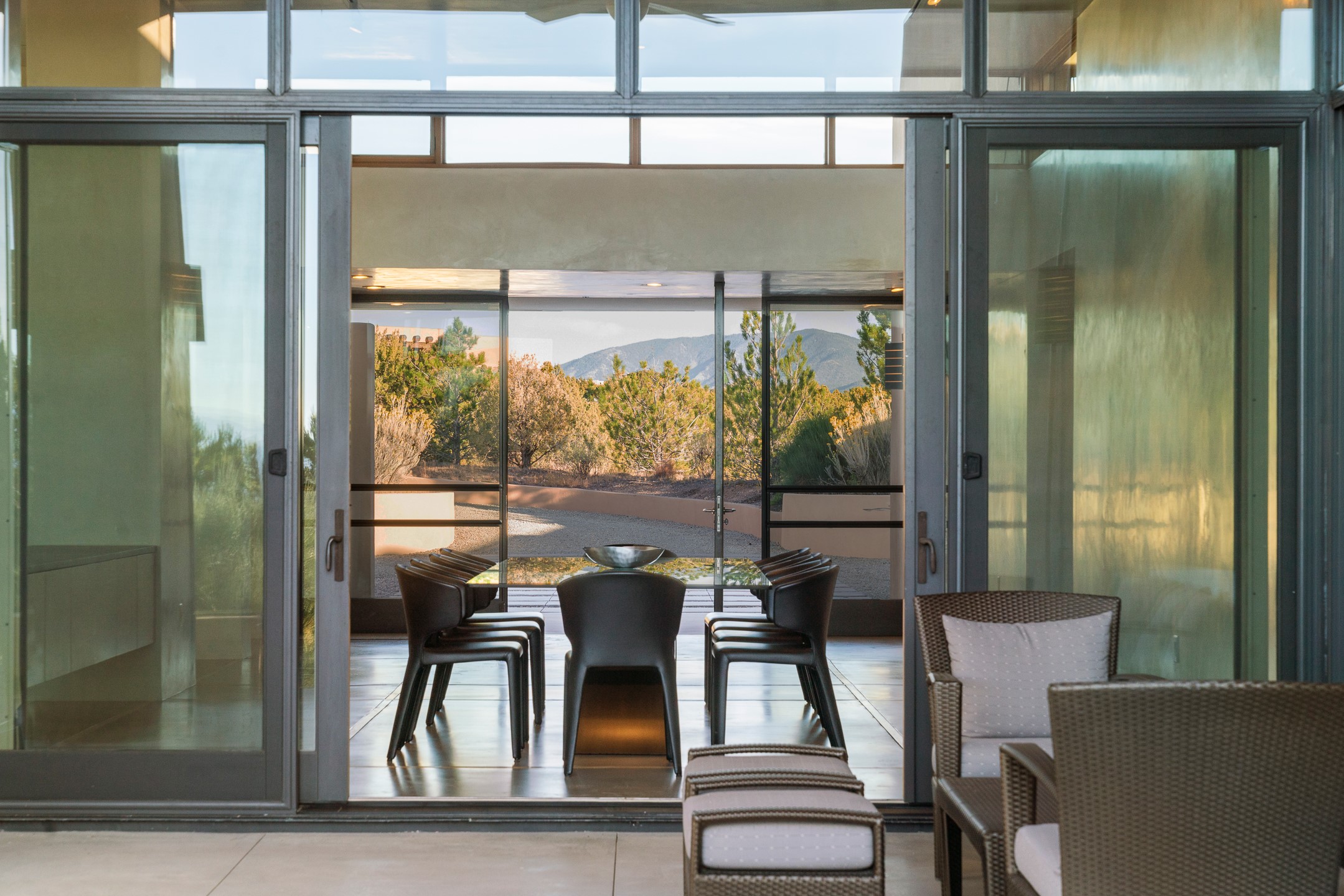 Striking modern architecture in Las Campanas! 26 Bishop's Dome was designed by Craig Hoopes and built by Chuck Apple to capture light, views, and refined Santa Fe living. The home offers 5 bedrooms and 7 bathrooms, including two powder rooms, with a thoughtfully designed floor plan featuring two living rooms and two portals, ideal for both elegant entertaining and relaxed daily living. Walls of glass frame extraordinary east-facing views of the snow-capped Sangre de Cristo Mountains and west-facing Jemez Mountain vistas, delivering exquisite sunset views. The portals extend the living spaces outdoors, creating seamless indoor-outdoor living for gatherings or quiet enjoyment of the surrounding landscape.Private bedroom suites provide comfort and flexibility, while a generous 3-car garage adds convenience and functionality. A rare opportunity to own a true architectural home where modern design, exceptional construction, and breathtaking mountain views converge.
