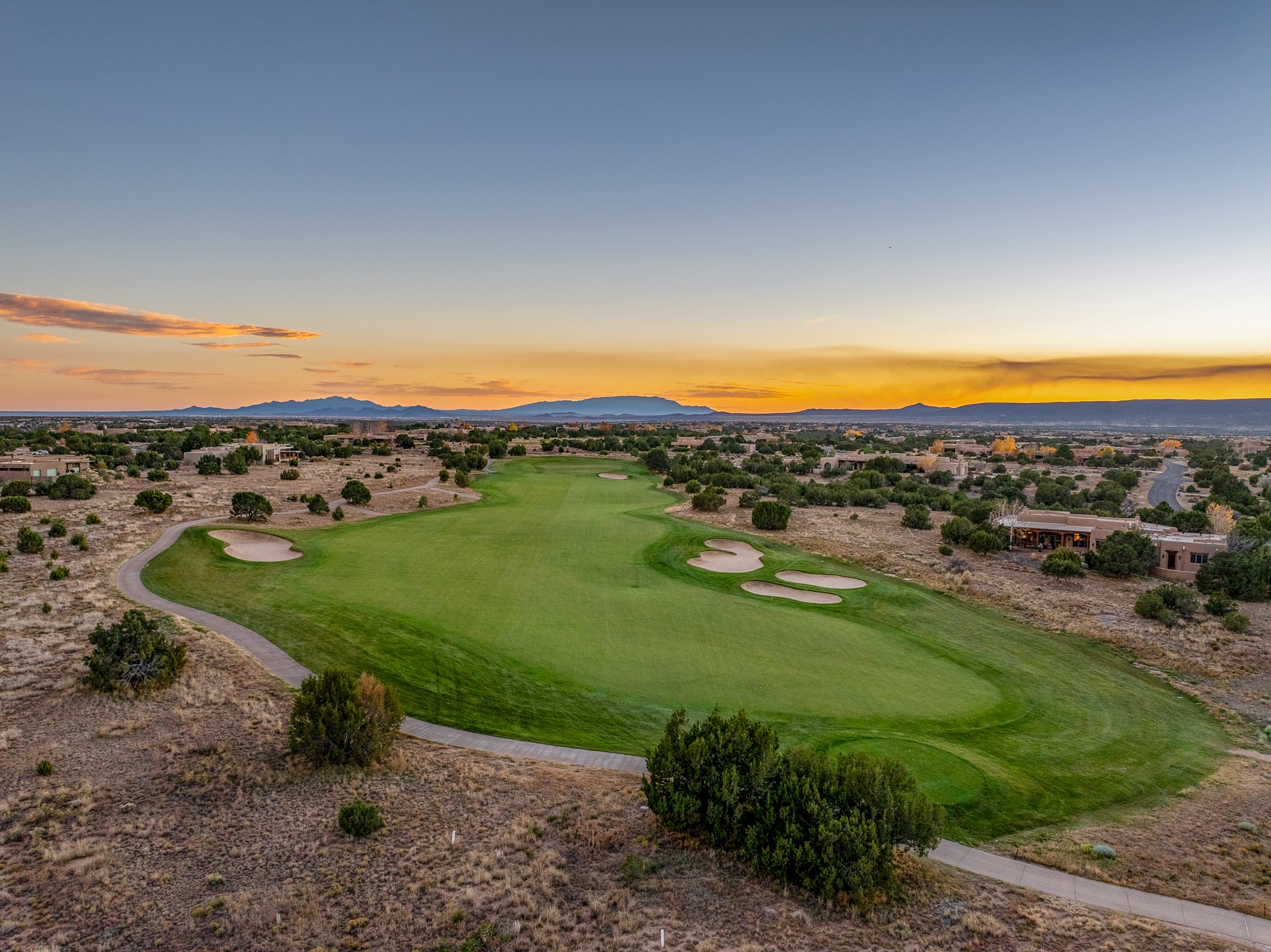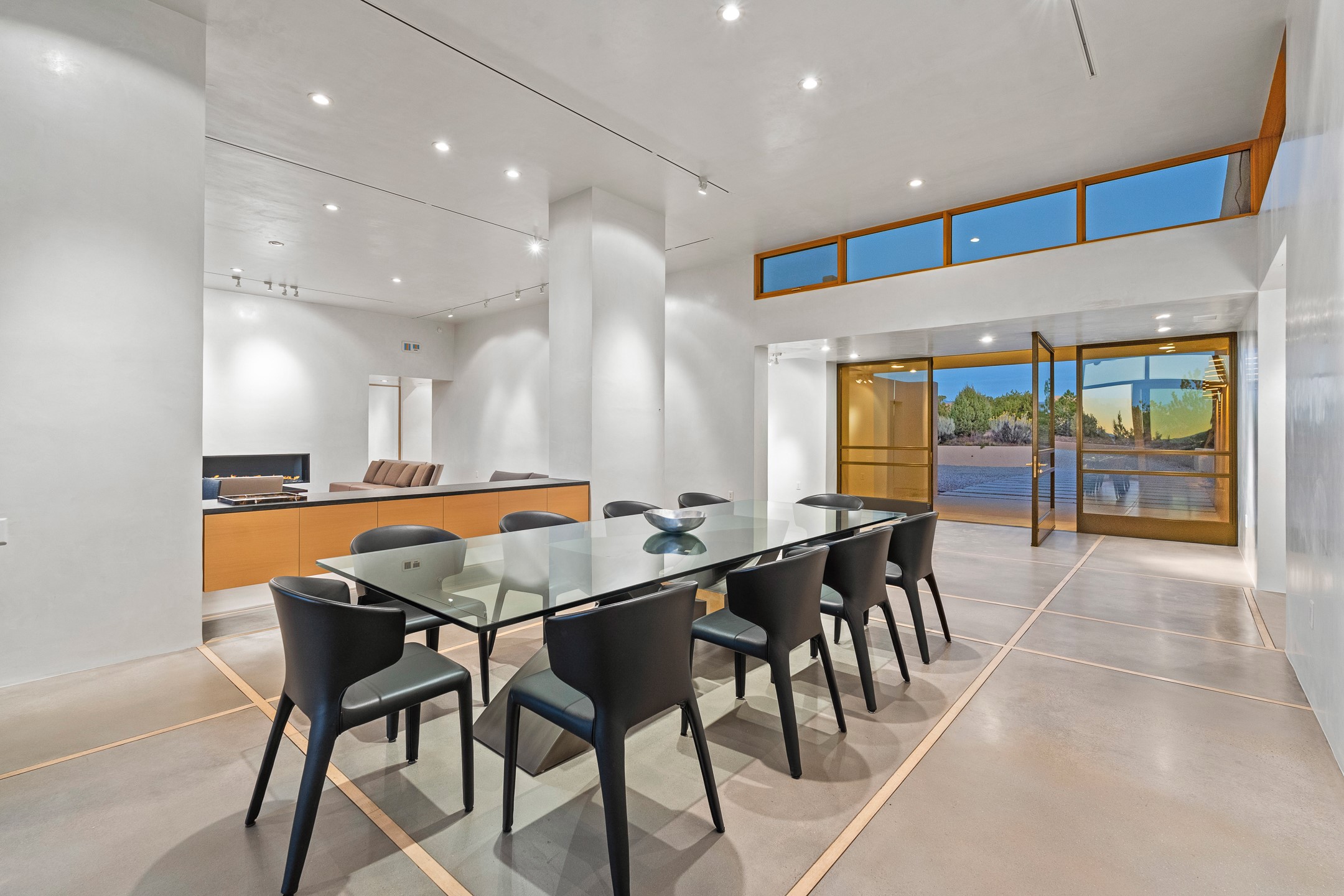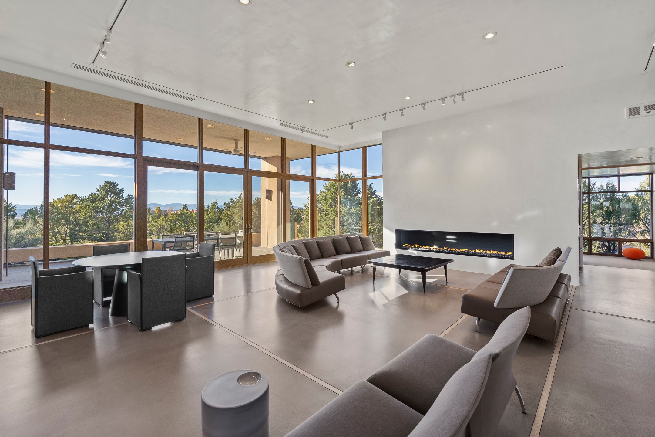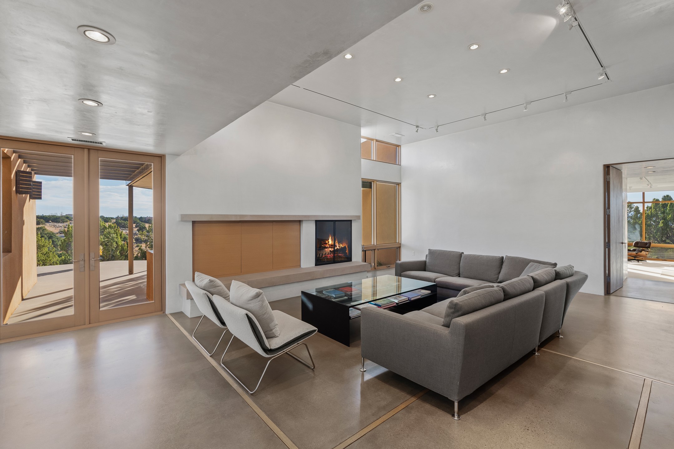 Striking modern architecture in Las Campanas! 26 Bishop's Dome was designed by Craig Hoopes and built by Chuck Apple to capture light, views, and refined Santa Fe living. The home offers 5 bedrooms and 7 bathrooms, including two powder rooms, with a thoughtfully designed floor plan featuring two living rooms and two portals, ideal for both elegant entertaining and relaxed daily living. Walls of glass frame extraordinary east-facing views of the snow-capped Sangre de Cristo Mountains and west-facing Jemez Mountain vistas, delivering exquisite sunset views. The portals extend the living spaces outdoors, creating seamless indoor-outdoor living for gatherings or quiet enjoyment of the surrounding landscape.Private bedroom suites provide comfort and flexibility, while a generous 3-car garage adds convenience and functionality. A rare opportunity to own a true architectural home where modern design, exceptional construction, and breathtaking mountain views converge.