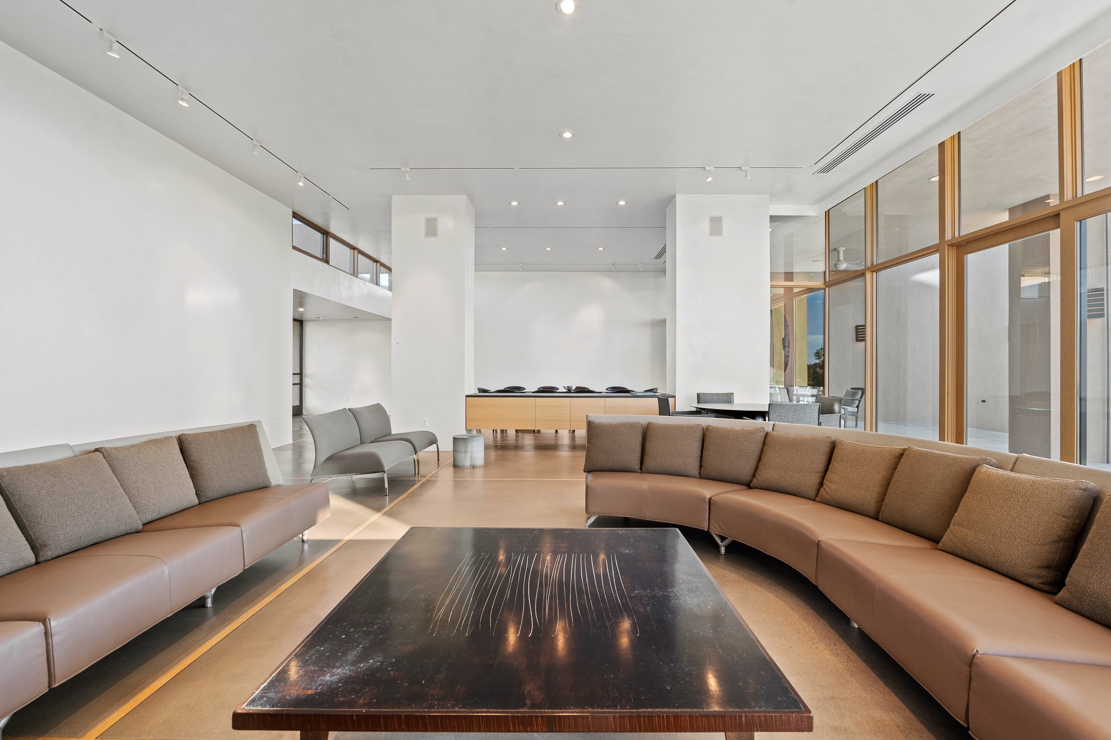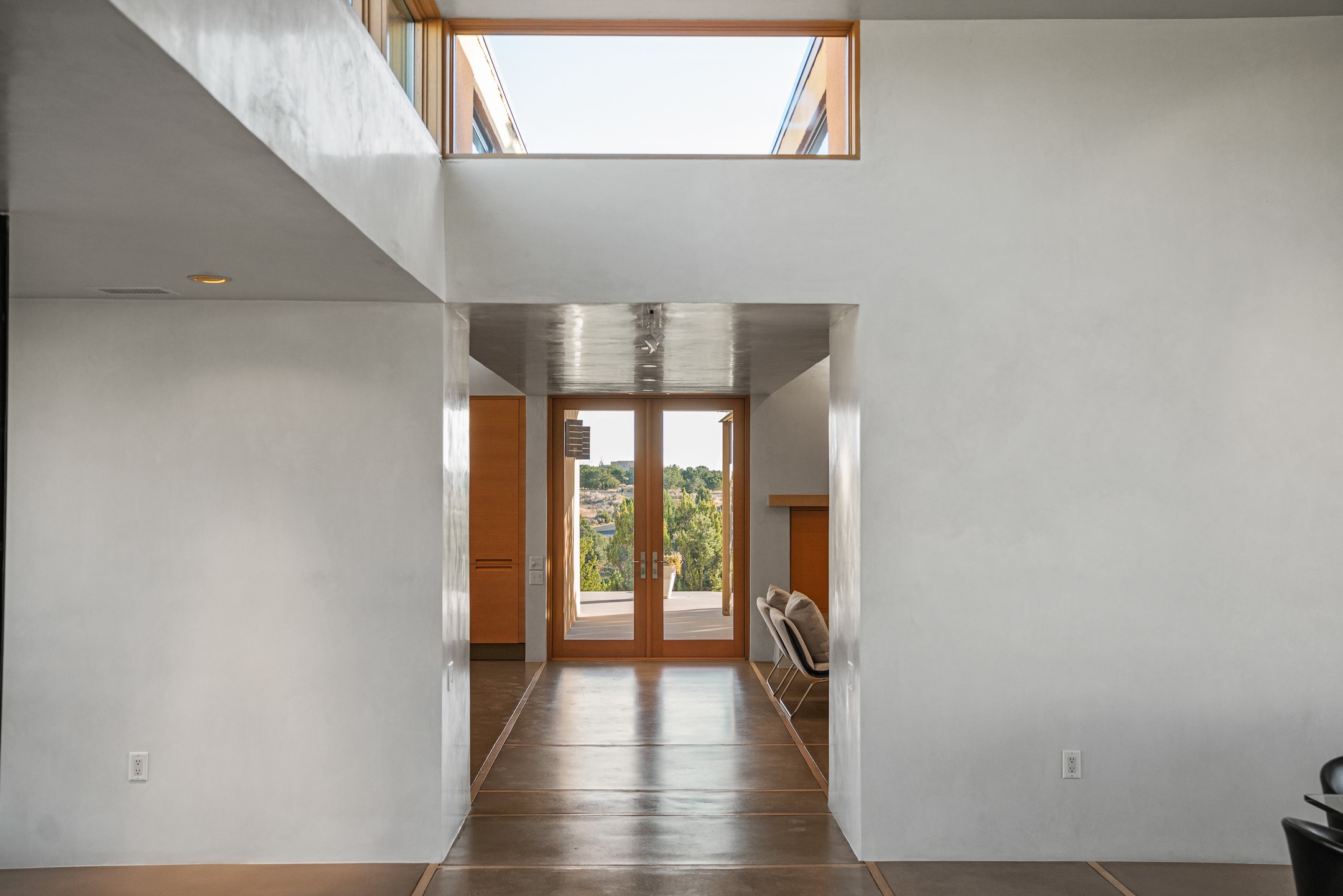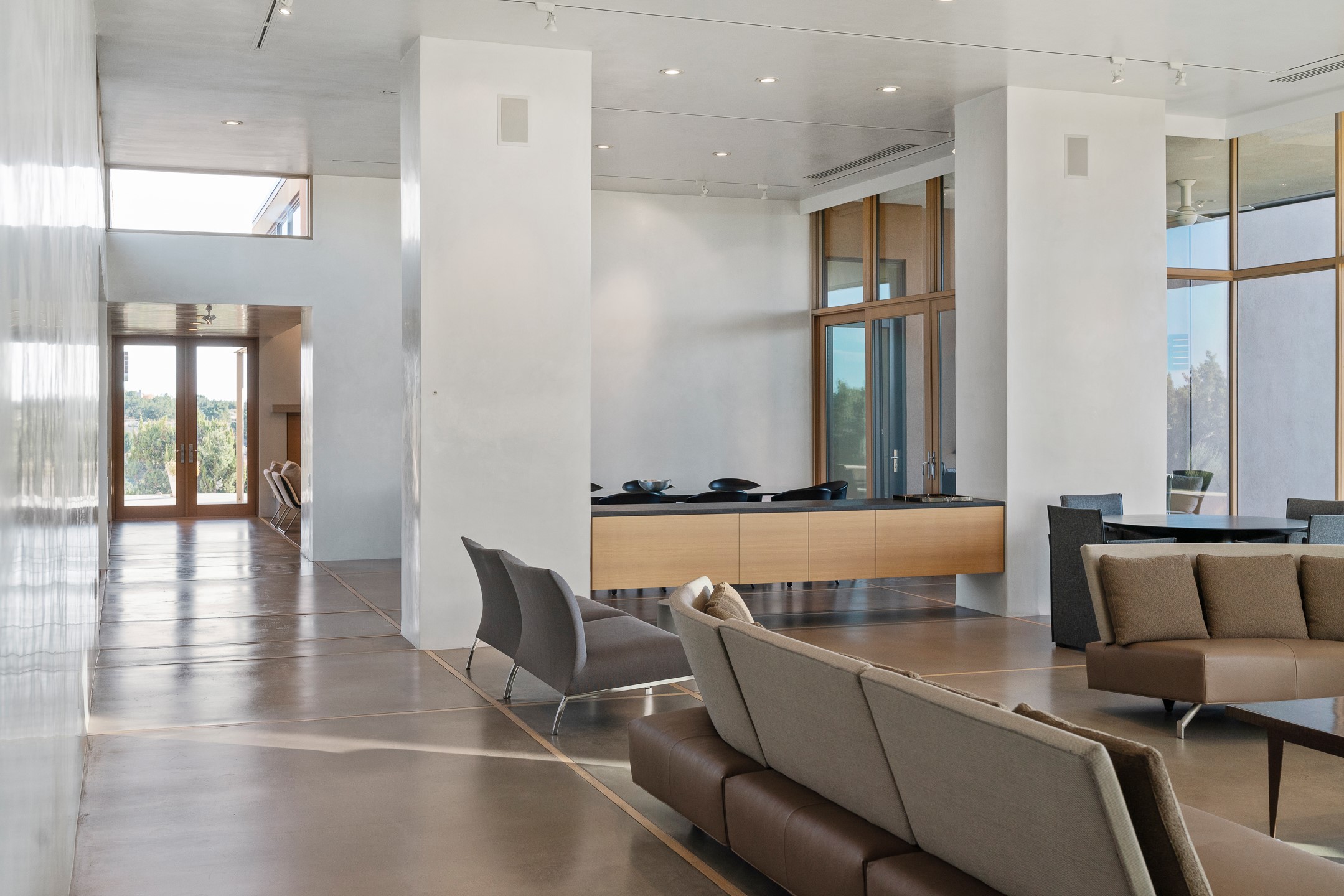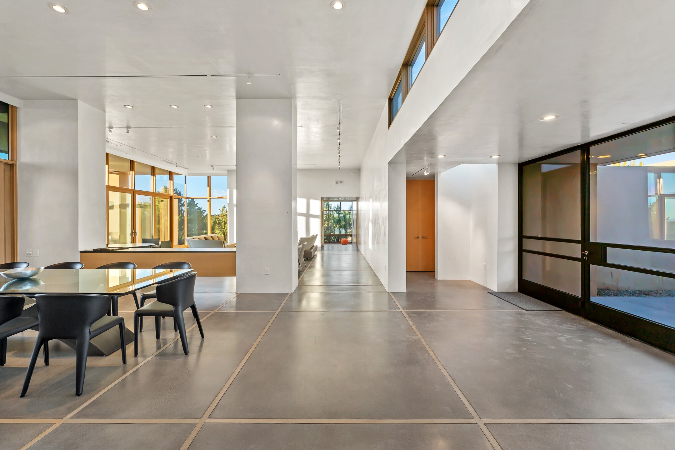 Striking modern architecture in Las Campanas! 26 Bishop's Dome was designed by Craig Hoopes and built by Chuck Apple to capture light, views, and refined Santa Fe living. The home offers 5 bedrooms and 7 bathrooms, including two powder rooms, with a thoughtfully designed floor plan featuring two living rooms and two portals, ideal for both elegant entertaining and relaxed daily living. Walls of glass frame extraordinary east-facing views of the snow-capped Sangre de Cristo Mountains and west-facing Jemez Mountain vistas, delivering exquisite sunset views. The portals extend the living spaces outdoors, creating seamless indoor-outdoor living for gatherings or quiet enjoyment of the surrounding landscape.Private bedroom suites provide comfort and flexibility, while a generous 3-car garage adds convenience and functionality. A rare opportunity to own a true architectural home where modern design, exceptional construction, and breathtaking mountain views converge.