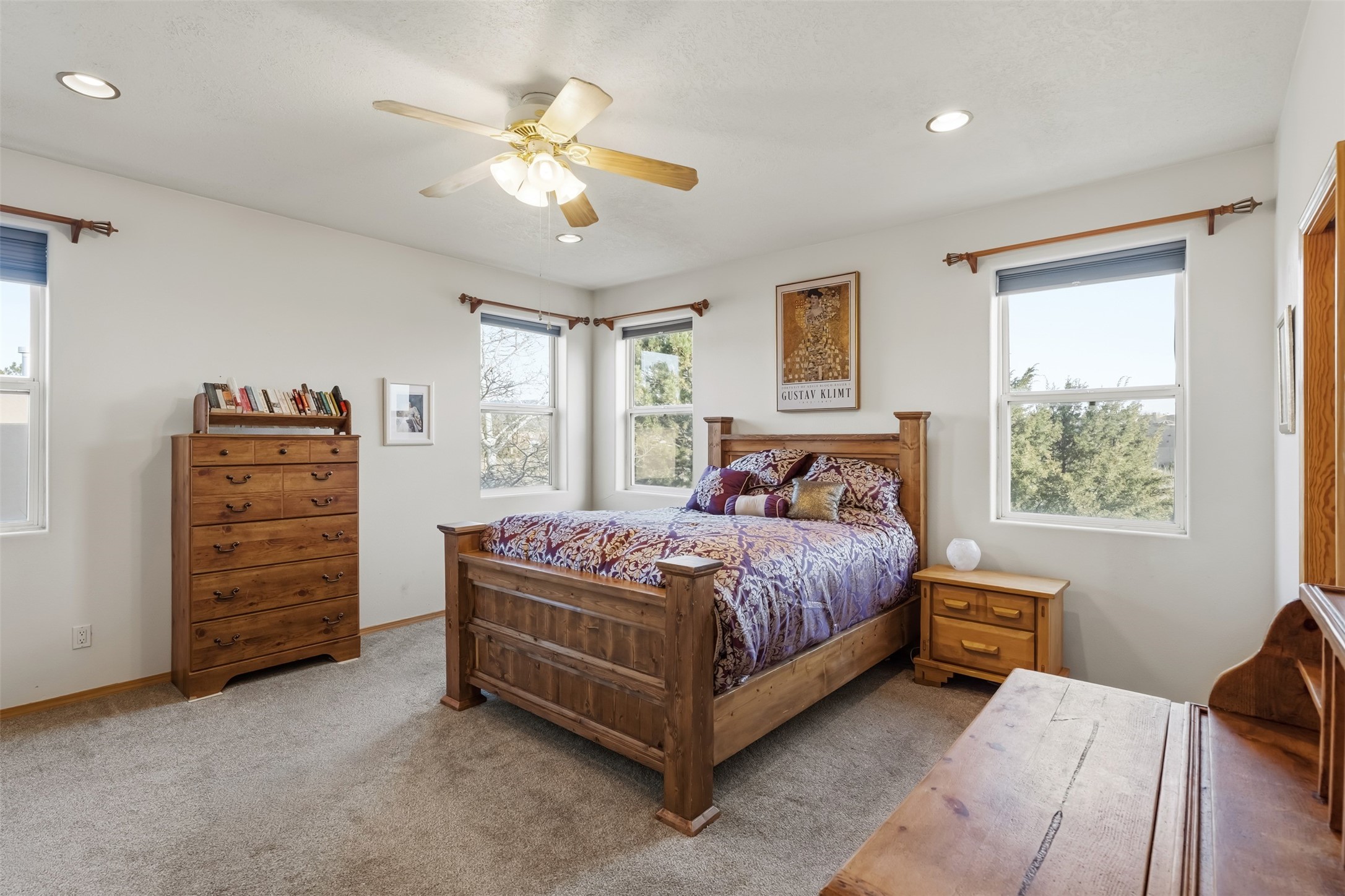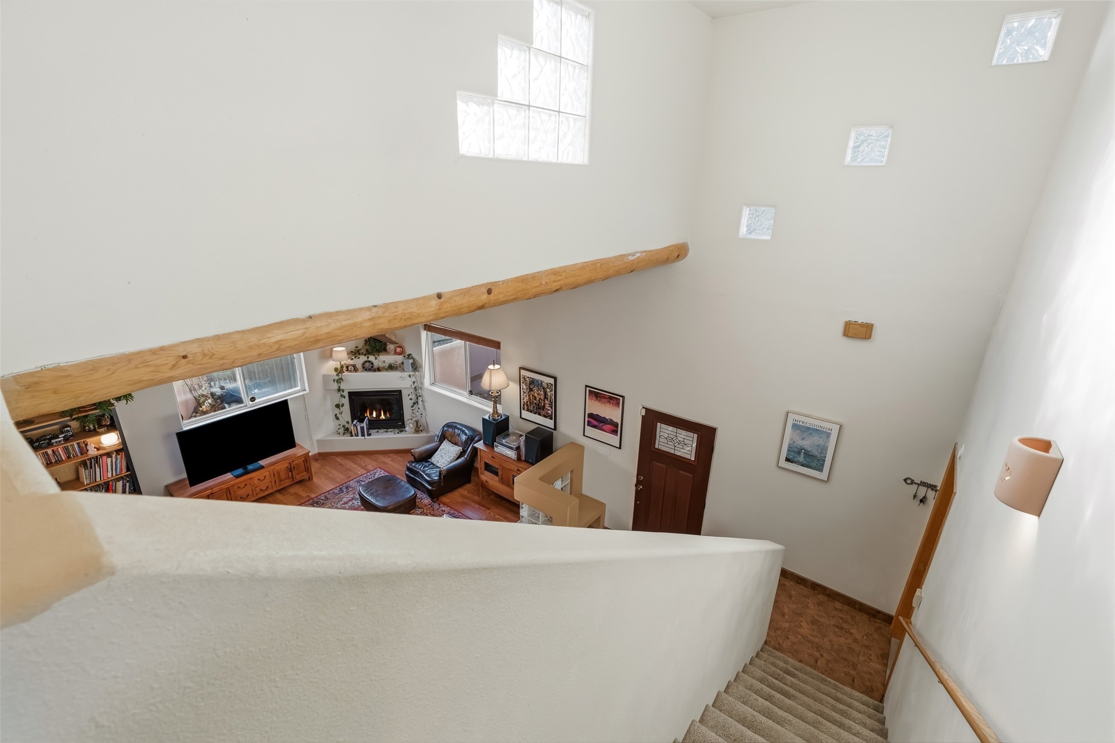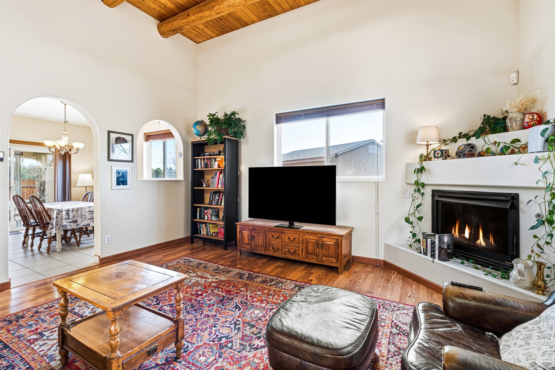 Discover your Santa Fe sanctuary at the peaceful end of a quiet cul-de-sac in the highly desirable Pueblos Del Sol neighborhood. This lovingly maintained home invites you into a sun-drenched expansive living room where authentic wooden vigas and beams soar across high ceilings, while a cozy gas fireplace creates an inviting focal point. The thoughtful main floor layout flows effortlessly from the living room to a large, open dine-in kitchen and back patio, additionally complemented by two spacious bedrooms, a full bathroom and laundry room.The second floor reveals a private retreat--an enormous primary suite featuring a spa-like ensuite bathroom and generous walk-in closet. A versatile fourth bonus room adapts perfectly as a home office, while the covered porch and expansive viewing deck showcase breathtaking sunsets and mountain vistas.Recent updates and quality features make this home truly move-in ready. The roof was re-sealed in 2023, the stucco remains in excellent condition, and radiant in-floor heating provides efficient, comfortable warmth throughout. Practical amenities include a two-car garage and a gated side driveway with ample space for a van or camper trailer. The backyard's fully finished, insulated shed with electricity transforms easily into a creative studio, yoga space, or private retreat.The neighborhood delivers exceptional convenience--top-rated schools, scenic walking trails, and nearby shopping and groceries--all while maintaining the serenity of this central, easily commutable location.Picture yourself enjoying lazy summer evenings on the covered back patio as children or pets roam the fully fenced yard, or greeting each morning from your second-floor deck with coffee and mountain views. This home strikes that rare balance between connection and seclusion, offering both the warmth of community and the peace of your own private haven. More than a house, this is where your family's story unfolds.