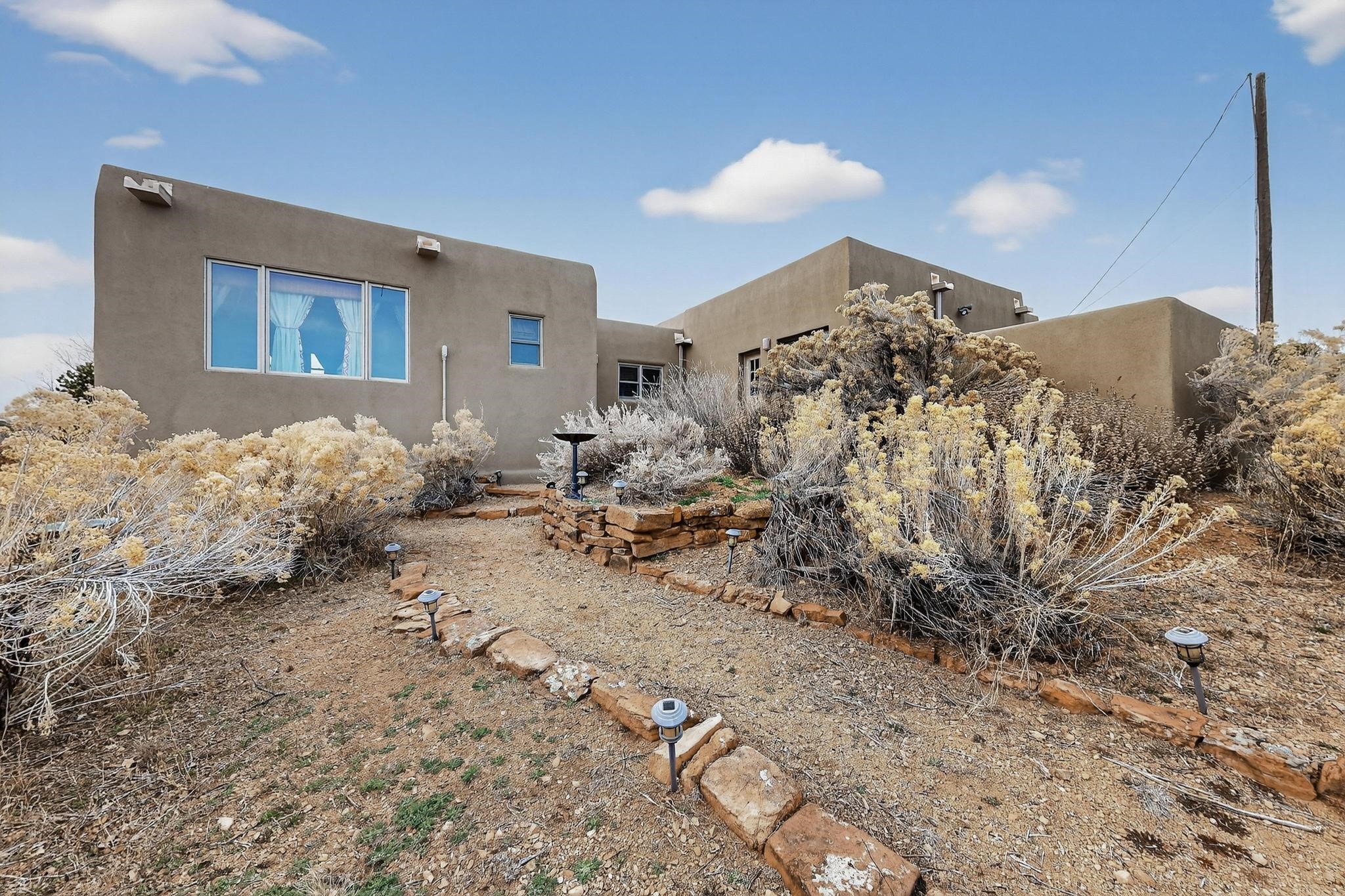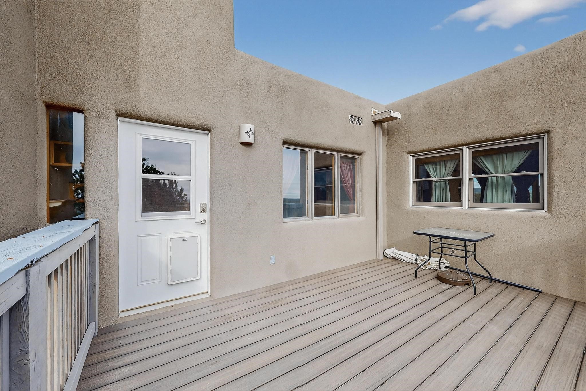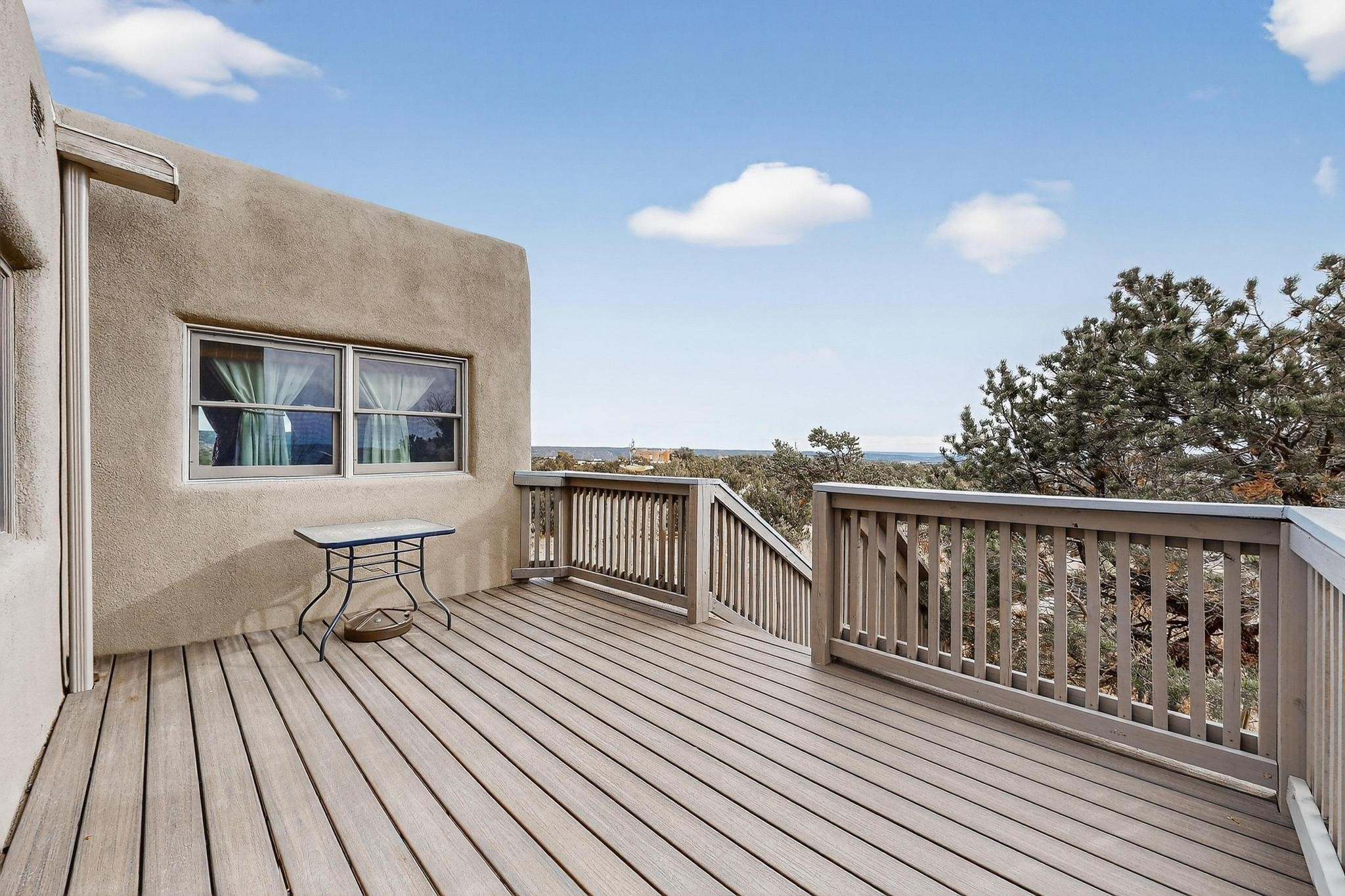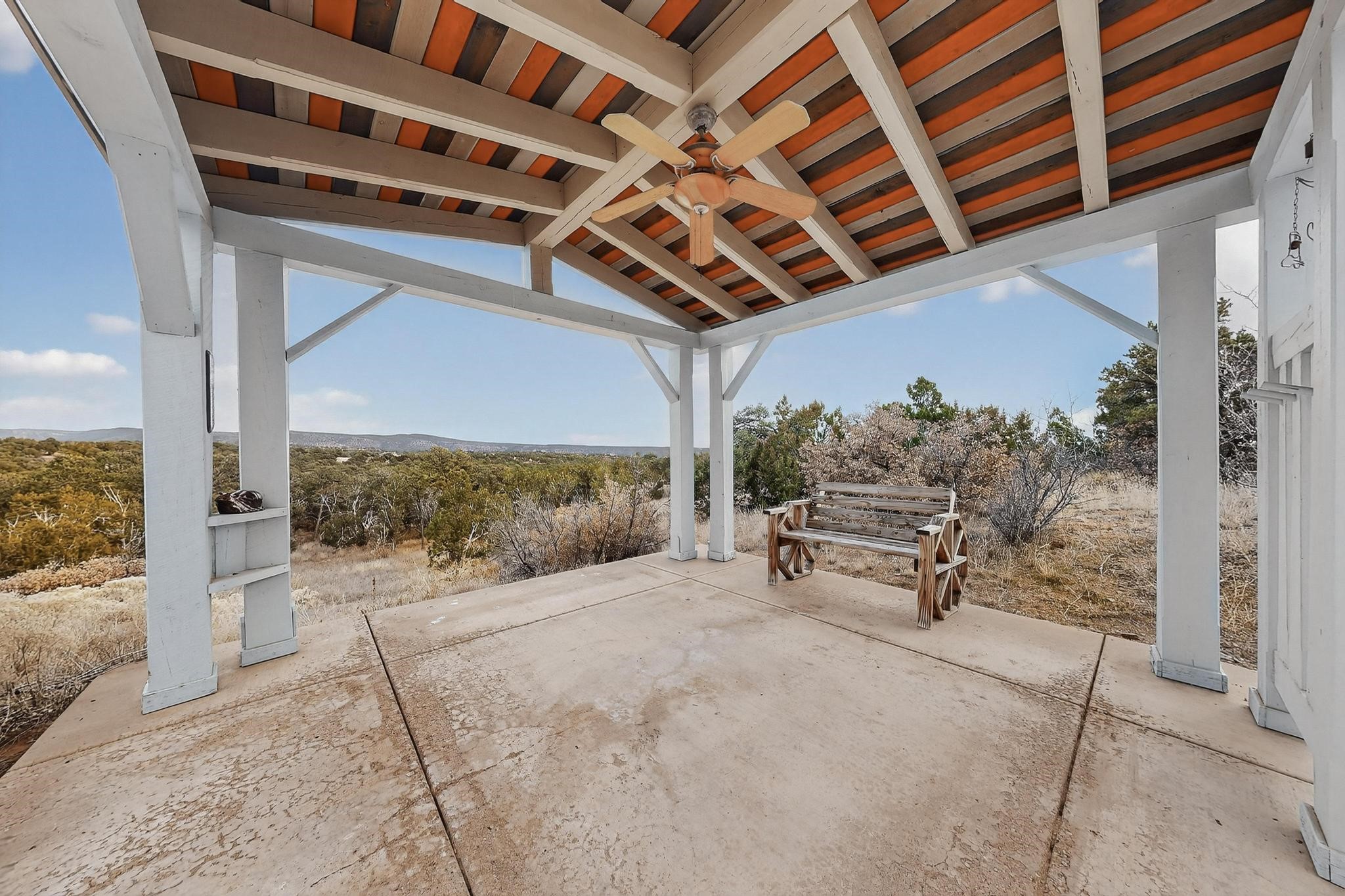 Move in Ready! Priced to Sell. Wonderful passive solar trilevel design nestled on a hilltop with decks and a romantic lighted gazebo to enjoy the sweeping Sangre's and Pecos mountain views. A flexible floorpan with the owners suite, kitchen, dining and living areas on the main level. A TV / family room, and an office upstairs with a view deck. A walk out lower level includes 2 guest bedrooms, a full bath and laundry. The 36' x 29' finished garage also has a workshop and storage room. In 2023 the stucco and roof were replaced, 3 Bosch mini splits added, a brand new tankless hot water heater, plus new windows and storm doors, 2 trex/wood decks, rain downspouts and the kitchen appliances. In 2024 the well pump was replaced, and there is a 1500 gallon underground cistern. The underground 500 gallon propane tank is owned, the hot tub is ready with fabulous views. All this on 5 acres, No HOA, horses and chickens welcome, only minutes to Eldorado area local shopping and services, or into historic Santa Fe.
