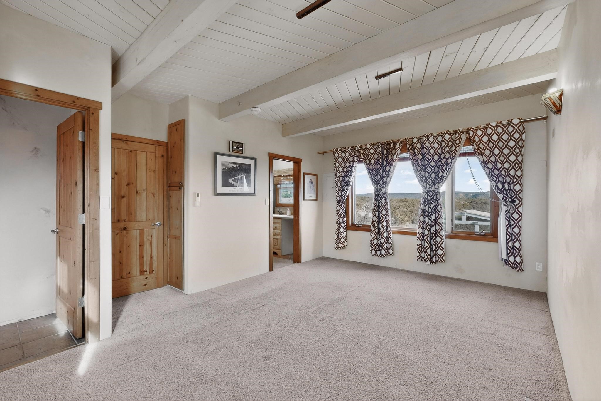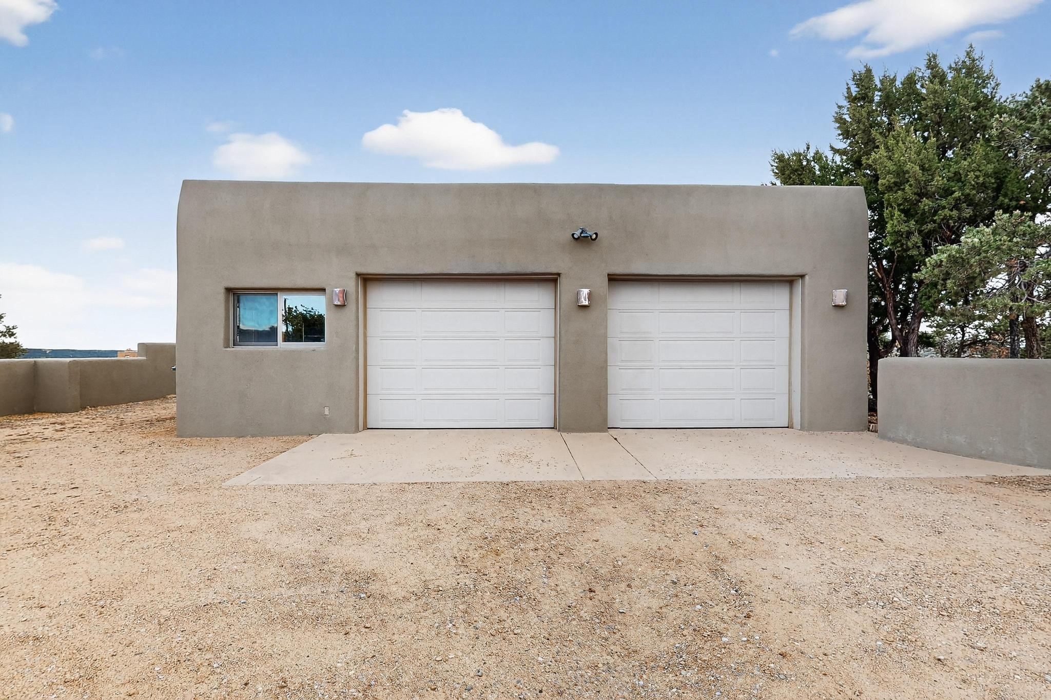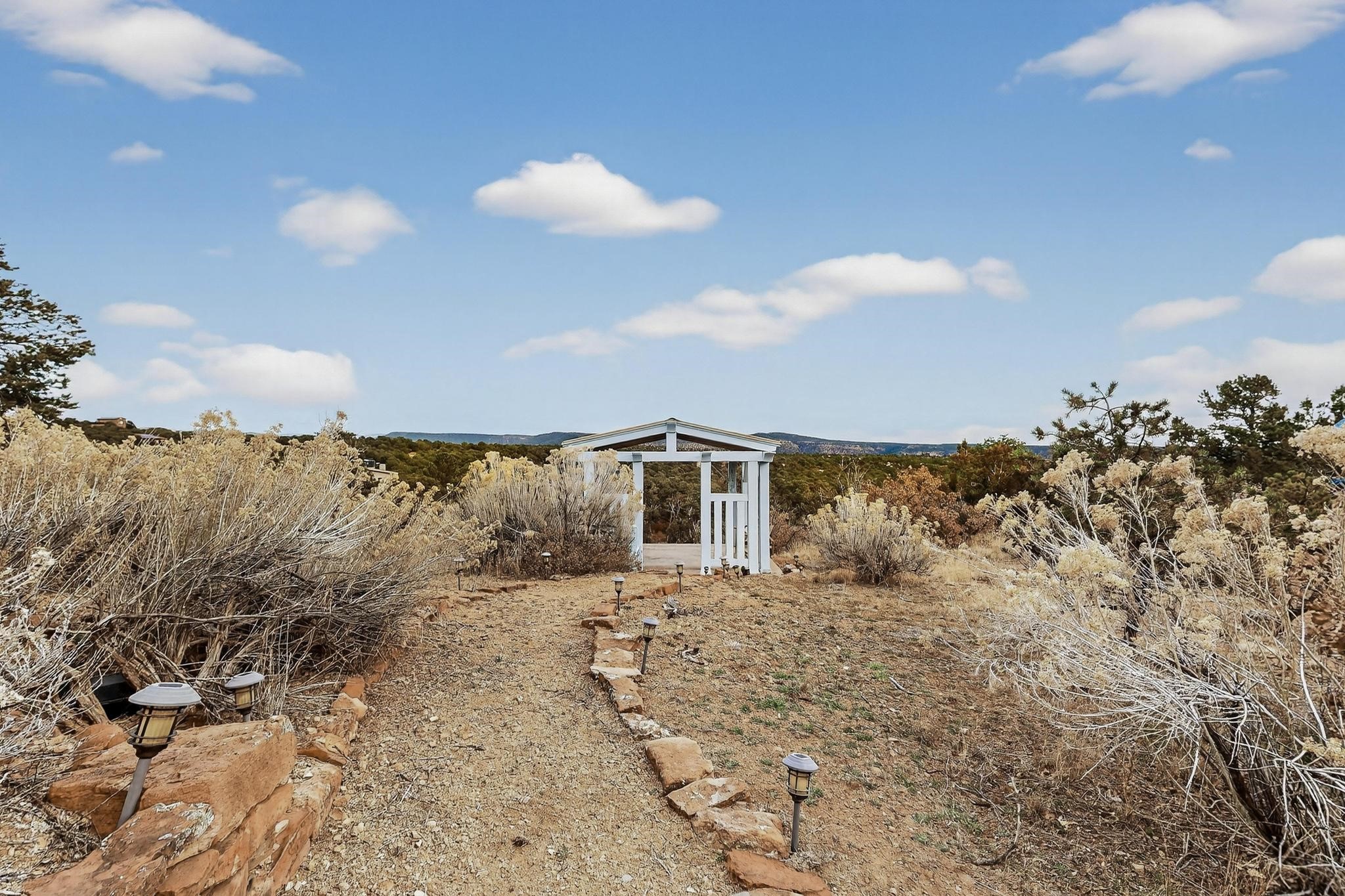 Move in Ready! Priced to Sell. Wonderful passive solar trilevel design nestled on a hilltop with decks and a romantic lighted gazebo to enjoy the sweeping Sangre's and Pecos mountain views. A flexible floorpan with the owners suite, kitchen, dining and living areas on the main level. A TV / family room, and an office upstairs with a view deck. A walk out lower level includes 2 guest bedrooms, a full bath and laundry. The 36' x 29' finished garage also has a workshop and storage room. In 2023 the stucco and roof were replaced, 3 Bosch mini splits added, a brand new tankless hot water heater, plus new windows and storm doors, 2 trex/wood decks, rain downspouts and the kitchen appliances. In 2024 the well pump was replaced, and there is a 1500 gallon underground cistern. The underground 500 gallon propane tank is owned, the hot tub is ready with fabulous views. All this on 5 acres, No HOA, horses and chickens welcome, only minutes to Eldorado area local shopping and services, or into historic Santa Fe.