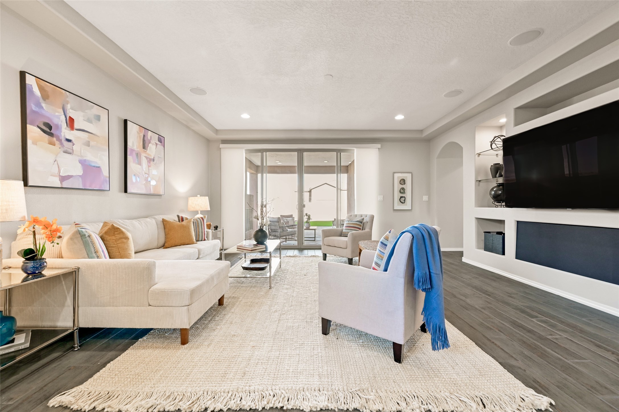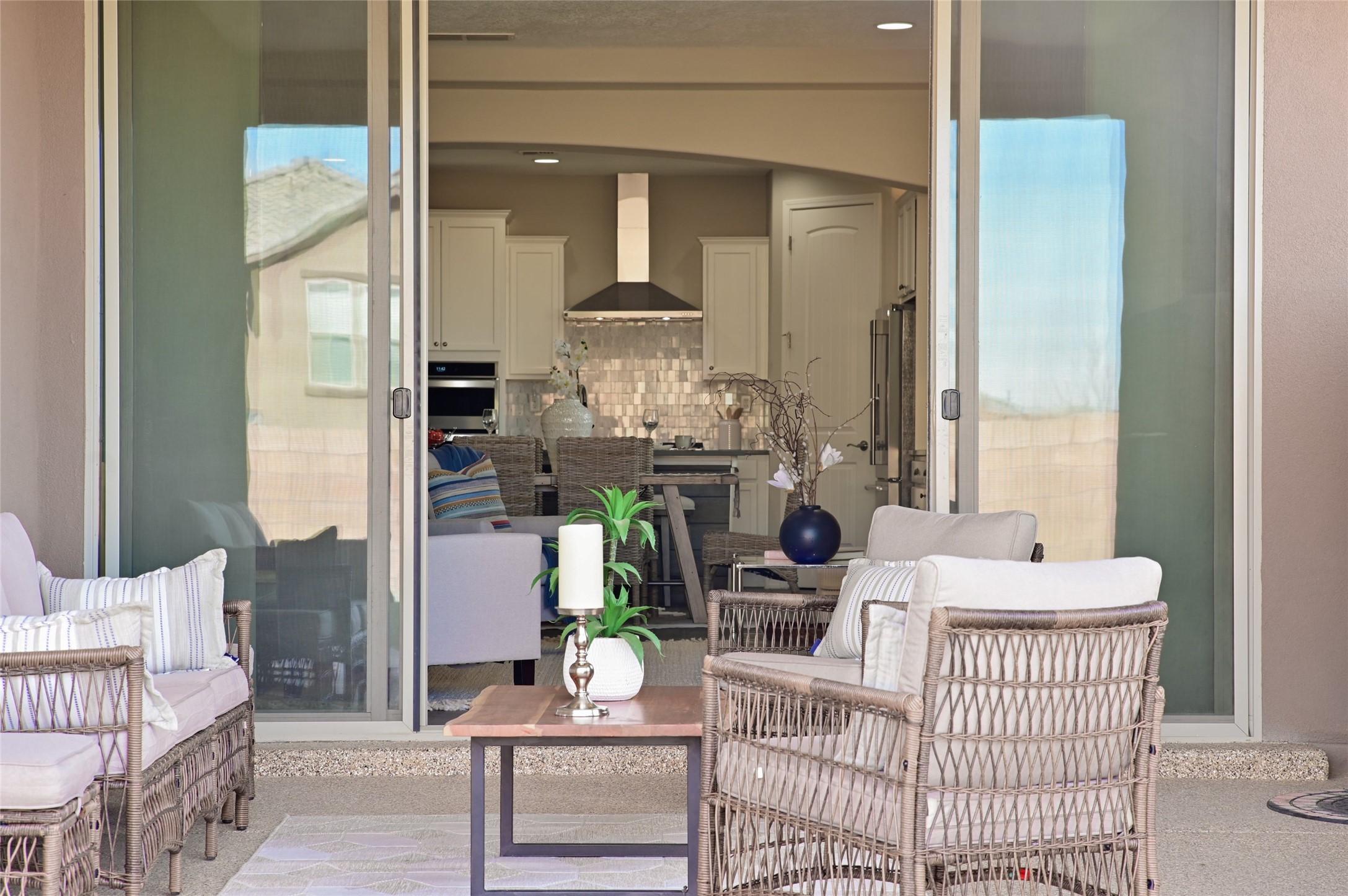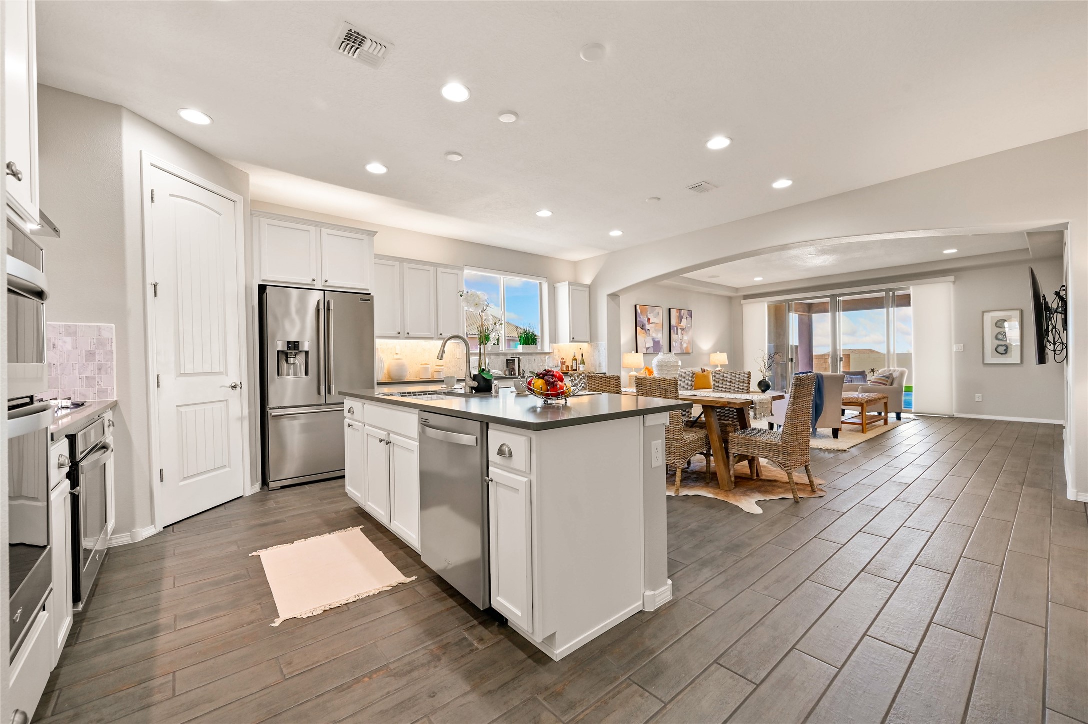 SELLER IS OFFERING A $10,000 CREDIT TOWARD AN INTEREST RATE BUY-DOWN - AN EXCEPTIONAL OPPORTUNITY TO REDUCE YOUR MONTHLY MORTGAGE COSTS! Built by Pulte in 2019, this beautifully maintained single-level 2,184 sq. ft. 3 bedroom/2 bathroom home is sited on a premium 0.20-acre lot, offering both privacy and captivating sunset views. Thoughtfully designed for comfortable living, the open-concept floor plan creates seamless flow between the kitchen, living, and dining areas. An elegant archway defines the living/kitchen/dining areas while framing a view of Santa Fe's expansive skies from the kitchen--a touch that brings both beauty and warmth to everyday living. The kitchen is a true standout, featuring extensive quartz counter space, abundant cabinetry, and stainless steel appliances. At its heart is a generous island with a sink and seating for four, perfect for a social gathering and sunset viewing. The generous primary suite has a large walk-in shower, double vanities and a substantial walk-in closet. The primary suite also has views of the private back yard. The large back portal has a beautiful gas fireplace and the back courtyard comes with green turf that never needs to be mowed! An attached 2-car garage and a mudroom/laundry room with a sink and a side-by-side washer and dryer complete this wonderful home. This beautiful home is newer in age and timeless. The premium lot and views definitely make it a stand out!
