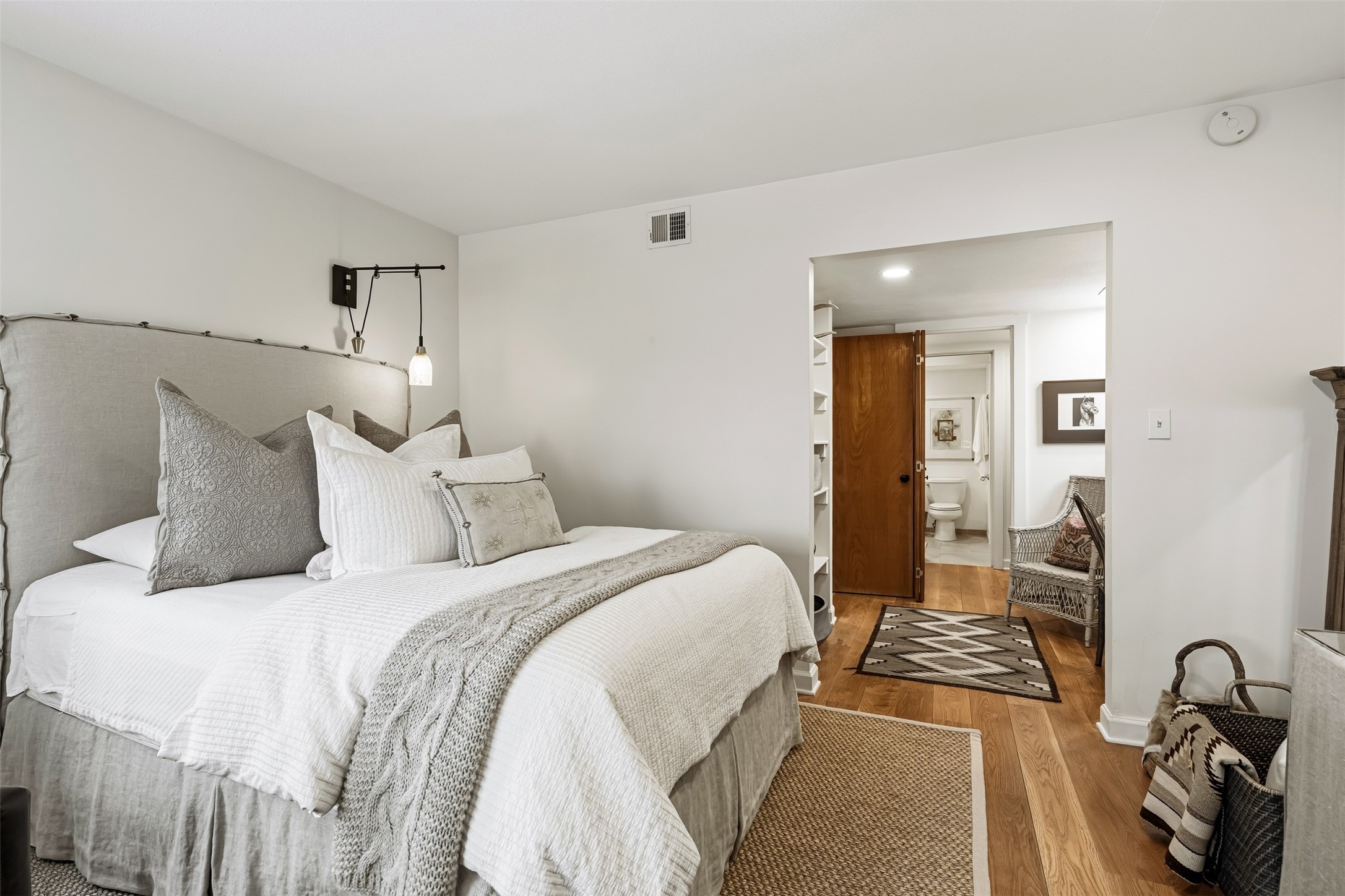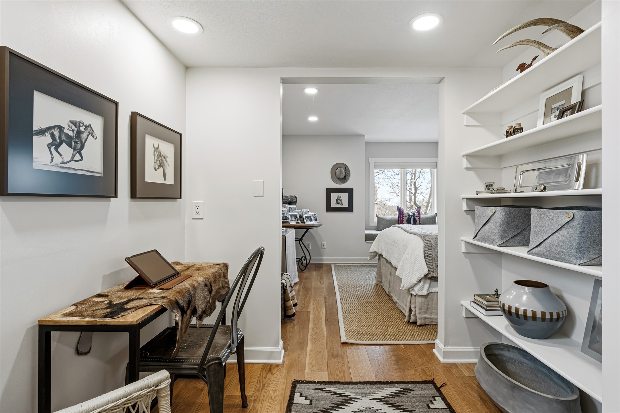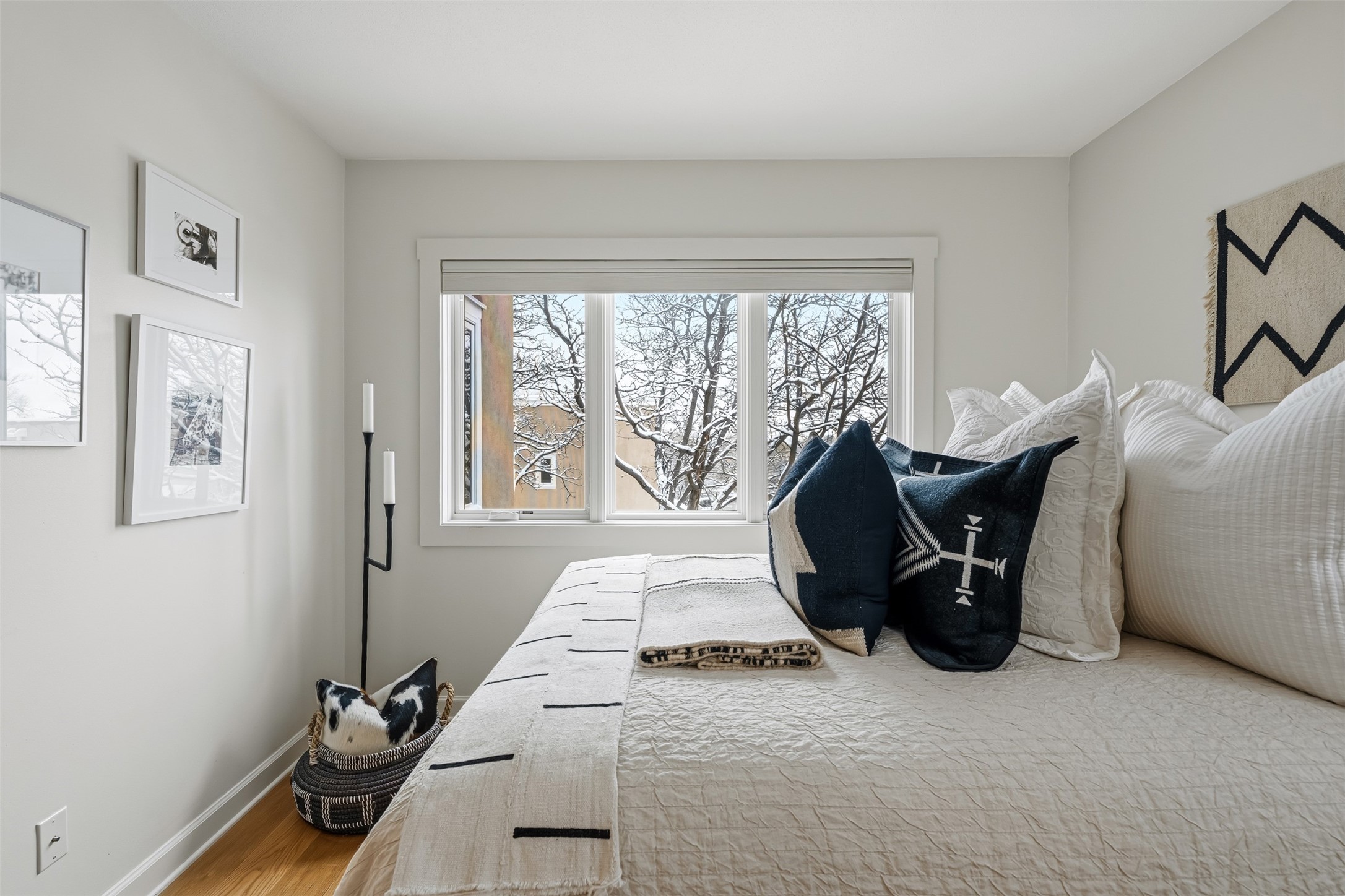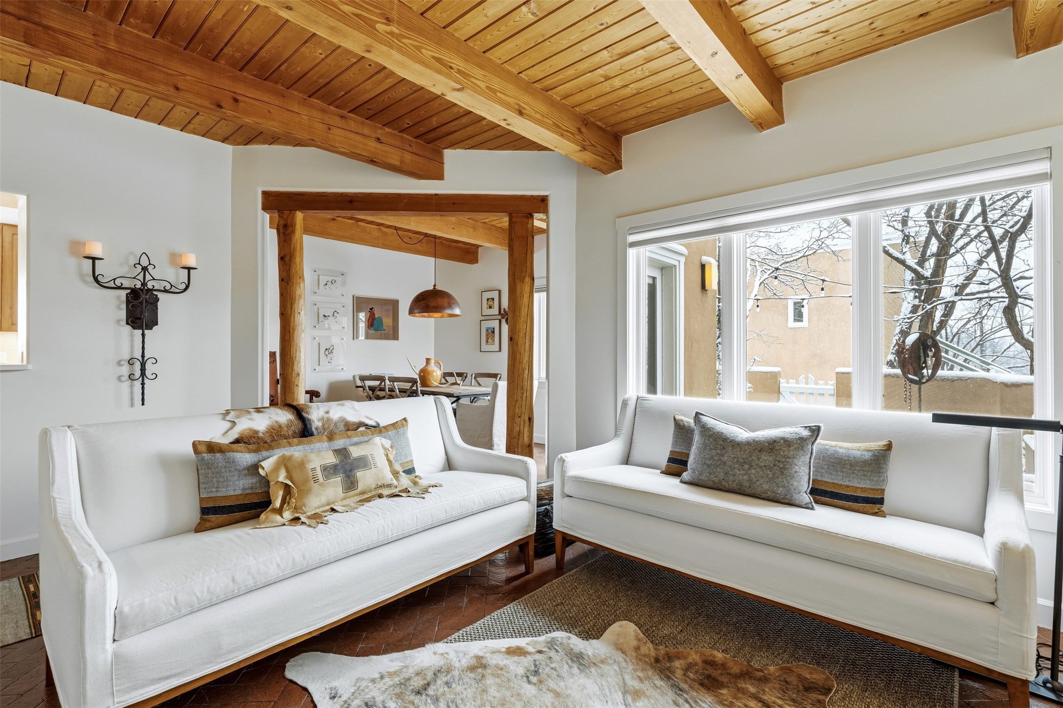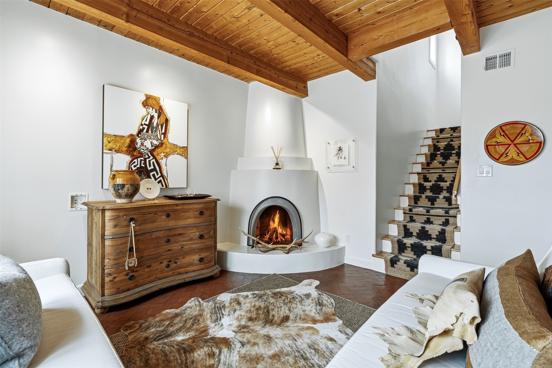 AWESOME NORTH SIDE LOCATION! This stylish and updated 2-bed, 2-bath, two-story condo with a 1-car garage offers easy access to nearby shopping and the Santa Fe Plaza! The main floor features a cozy living area, dining space, updated kitchen done by D. Maahs Construction & Design, guest bath, and a private patio. Upstairs, you'll find a bright and airy primary bedroom, a spacious bathroom, laundry closet, and a guest bedroom. Step outside and enjoy beautifully landscaped front and back patios with picket fences, drip irrigation, and a flagstone patio--perfect for entertaining! The sleek, updated kitchen boasts modern cabinetry, Bosch appliances, quartz countertops, and artisan tile. Both bathrooms have been refreshed with Kohler fixtures, quartz counters, tile, and contemporary vanities. Santa Fe charm is everywhere, from the board-and-beam ceiling and brick flooring to the cozy wood-burning kiva fireplace. Recent upgrades include recently replaced windows throughout the home with custom Levolor window treatments, a 2021 HVAC unit equipped with a digital smart thermostat, and a reverse osmosis water purification system. Exterior maintenance is done by the HOA. Whether you're looking for a full-time home or a getaway, this fantastic find provides you quick access to the Plaza's best dining, shopping, and culture!