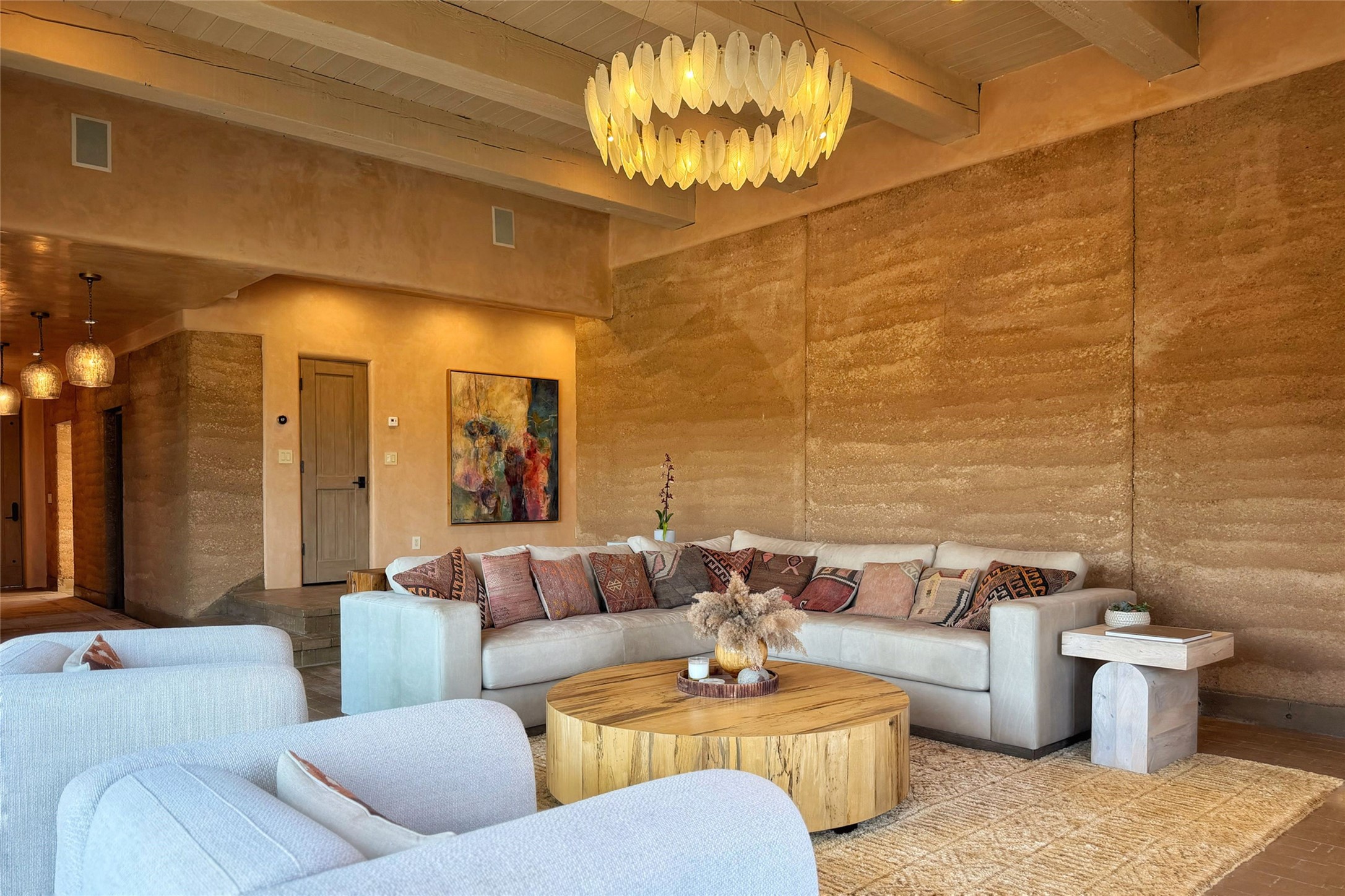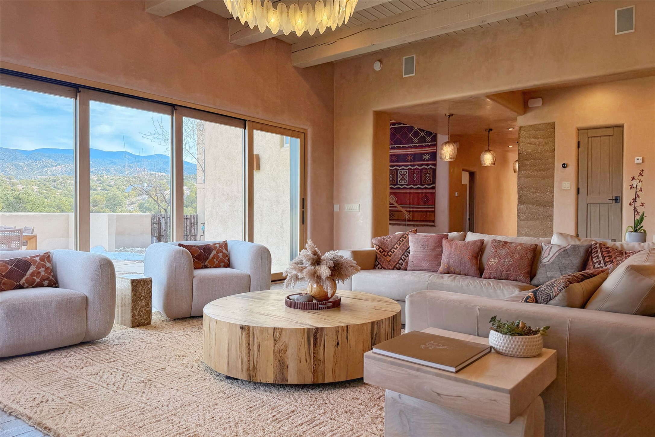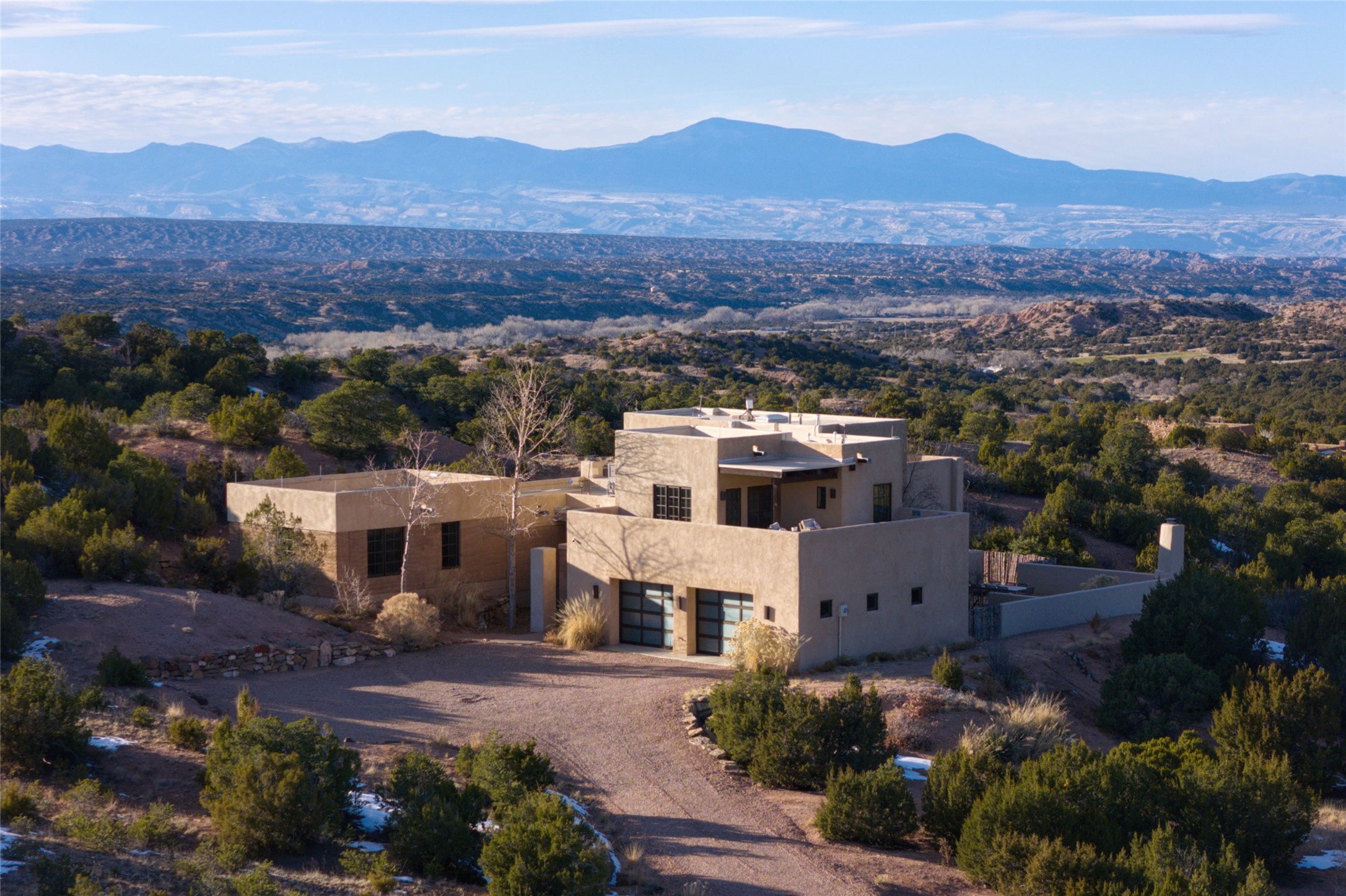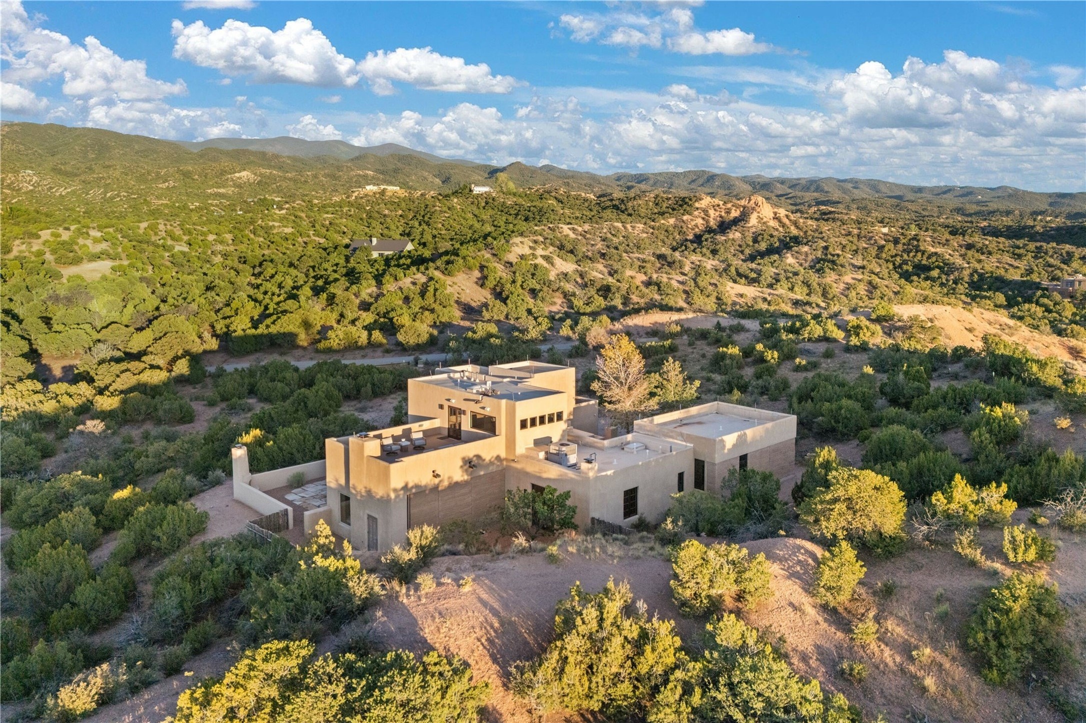 Tranquility, seclusion, and refined living define this beautifully reimagined 6.4 acre dual-residence estate tucked into the Sangre de Cristo foothills. Although located just minutes from the Santa Fe Plaza, SF Opera, Four Seasons Resort, and the village of Tesuque, the property feels wonderfully removed from the world. Adore multiple panoramas of the Sangre de Cristos, the Jemez, and expansive northern badlands. Set beside conservation land, offering long-term privacy, this award-winning design by architect Efthimios Maniatis reflects an organic modern aesthetic, blending clean architectural lines with warm textures, exposed beams, and earthy materials. Mornings begin with sunlight spilling over the ski basin. Evenings invite quiet reflection on the north deck as the Jemez Mountains glow. Open the expansive glass doors in the living area for seamless indoor-outdoor dining beside the patio fireplace, or retreat to a primary suite with a media room and sweeping views. A distinctive feature of both homes is the use of rammed earth accent walls, an ancient construction technique prized for its natural beauty, acoustic calm, and thermal efficiency, making this estate one of a select few in Santa Fe to showcase this coveted architectural element. Both homes were professionally styled in 2024, and furnishings are available separately for a turnkey transition. Completely renovated in 2024, the property offers the confidence of modern systems throughout, including new roofs, kitchens, bathrooms, closets, boilers, whole-house water purification, and integrated smart-home technology with security, audio, high-speed internet, and climate controls. The 2/bed 2/bath, guest house is currently licensed for short term rentals and has generated over $100,000 annually, with existing reservations transferable to the new owner. This exceptional estate combines natural beauty, modern luxury, and investment opportunity in one unforgettable offering.