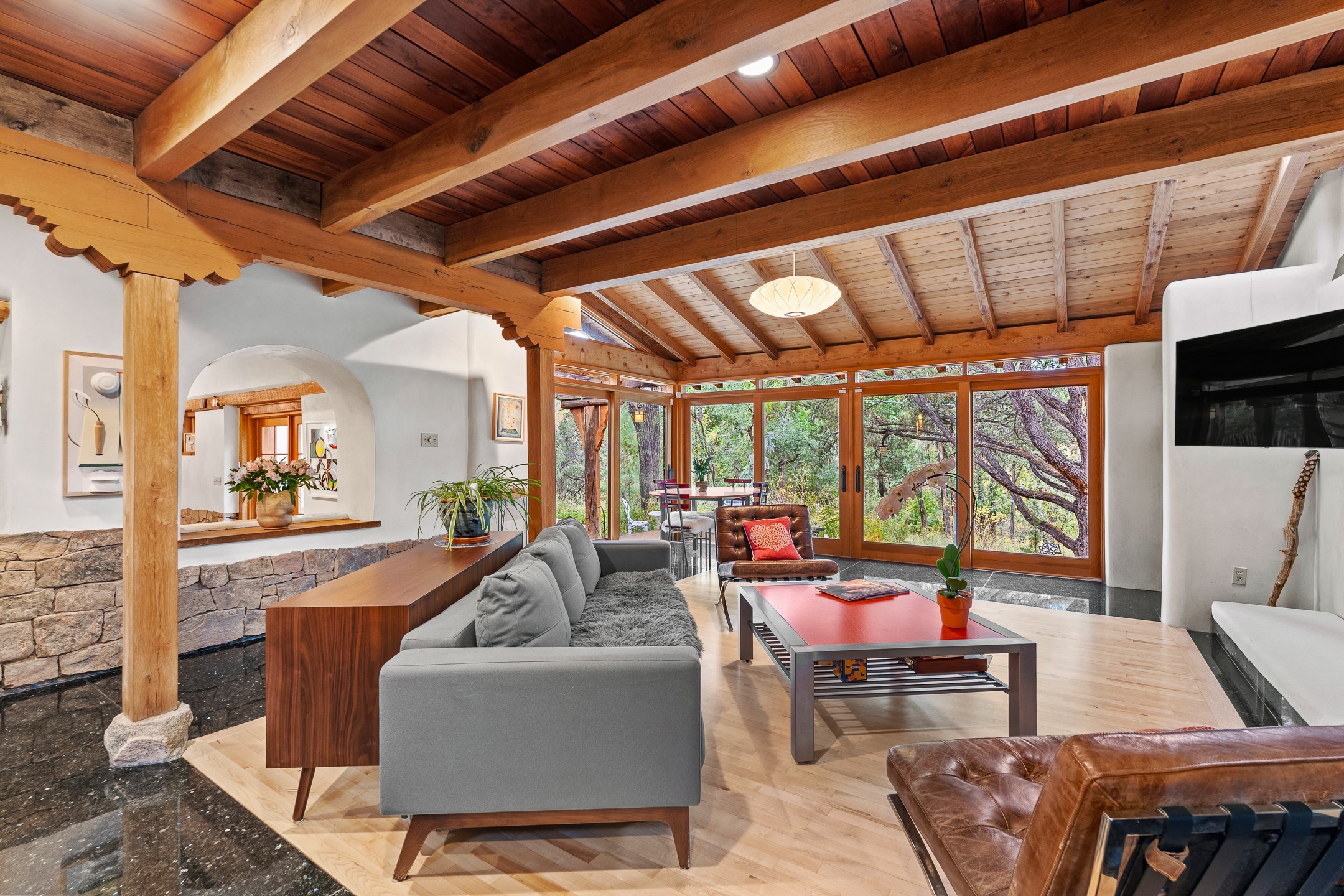 Location, Location--and Priced Below Appraisal - Featured in The Santa Fe New Mexican's December Real Estate Guide, this 3,366 sq. ft. adobe sanctuary in Tesuque is a rare fusion of artistry, nature, and architectural integrity. Just 8 minutes from the Plaza and nestled on 0.77 lush acres beside the seasonal Tesuque Creek, the property offers serenity, soul, and sustainability. The land has been gently restored through regenerative landscaping--reintroducing native wildflowers, birds, and wildlife pathways that honor the land's natural rhythms. Built by master Santa Fe artisans, the 3BD/3.5BA home celebrates timeless design with flagstone floors, vigas, split cedar ceilings, and walls that shift organically from adobe to stone. At the heart is the open kitchen and dining area, renovated with natural stone counters and designed for entertaining. French doors open to a covered portal with a natural gas firepit for gathering under the stars or summer monsoons. Two unique living rooms offer distinct experiences:- One, originally crafted for Japanese tea ceremony, features a pitched ceiling and a glass wall that frames the forested garden.- The second centers around a dramatic fireplace and leads to a ground-level primary suite with cedar-lined closet and fenced garden with fruit trees and pollinator plants.Upstairs are two guest suites, each with en suite baths; one includes a private deck and infrared sauna--an elevated retreat in the treetops.Extras include an automatic gate, a contemplative labyrinth, a private well with 3-acre feet of water rights, EV charger, handcrafted workshop, and arroyo access to nearby hiking and the Lower Windsor Trailhead.1330 Bishops Lodge is a soulful, artful expression of intentional living.