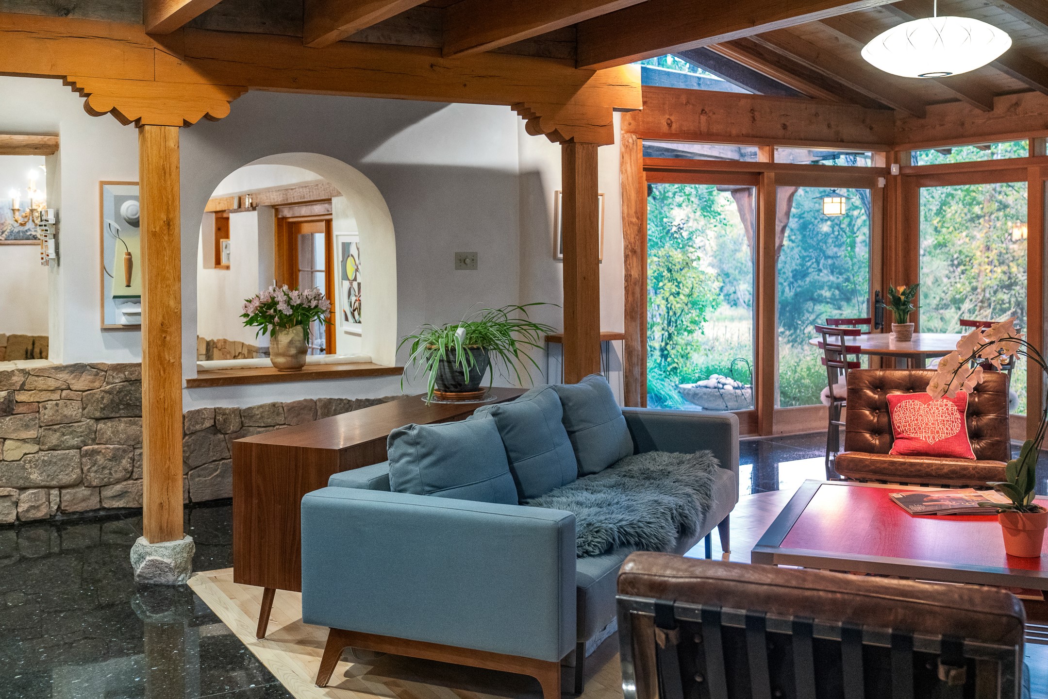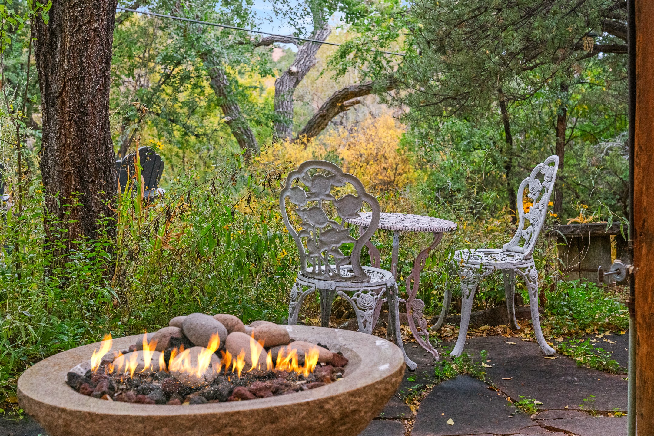 Location, Location--and Priced Below Appraisal - Featured in The Santa Fe New Mexican's December Real Estate Guide, this 3,366 sq. ft. adobe sanctuary in Tesuque is a rare fusion of artistry, nature, and architectural integrity. Just 8 minutes from the Plaza and nestled on 0.77 lush acres beside the seasonal Tesuque Creek, the property offers serenity, soul, and sustainability. The land has been gently restored through regenerative landscaping--reintroducing native wildflowers, birds, and wildlife pathways that honor the land's natural rhythms. Built by master Santa Fe artisans, the 3BD/3.5BA home celebrates timeless design with flagstone floors, vigas, split cedar ceilings, and walls that shift organically from adobe to stone. At the heart is the open kitchen and dining area, renovated with natural stone counters and designed for entertaining. French doors open to a covered portal with a natural gas firepit for gathering under the stars or summer monsoons. Two unique living rooms offer distinct experiences:- One, originally crafted for Japanese tea ceremony, features a pitched ceiling and a glass wall that frames the forested garden.- The second centers around a dramatic fireplace and leads to a ground-level primary suite with cedar-lined closet and fenced garden with fruit trees and pollinator plants.Upstairs are two guest suites, each with en suite baths; one includes a private deck and infrared sauna--an elevated retreat in the treetops.Extras include an automatic gate, a contemplative labyrinth, a private well with 3-acre feet of water rights, EV charger, handcrafted workshop, and arroyo access to nearby hiking and the Lower Windsor Trailhead.1330 Bishops Lodge is a soulful, artful expression of intentional living.